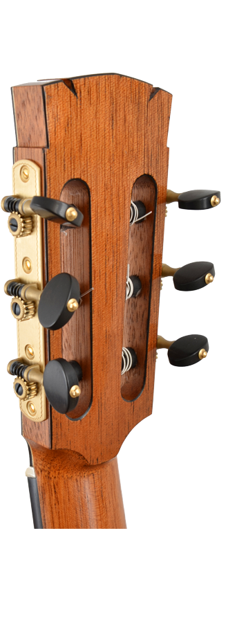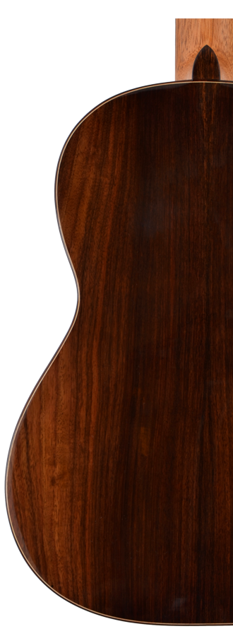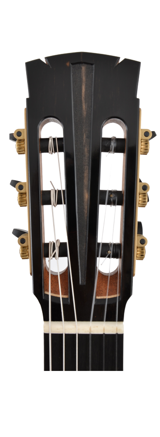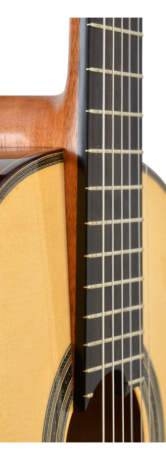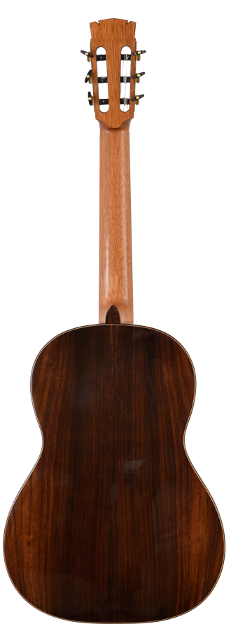 This model of a concert guitar, which is inspired by Francisco Simplicio, secured Heinzelmann the first place in the contest of lutherie in Luby/CZ in June 2012. Many of Adrian’s own ideas are included in this model, like for example the bridge consisting of a three-piece bone inlay. The top is made of fine-grained spruce with an embedded and magnificently decorated rosette. The purflings of the guitar’s top are fine mosaics. Back and ribs are made of East Indian rosewood. The fingerboard is raised above the top. Neck and head are made of cedro. The guitar is refined with shellac polish.