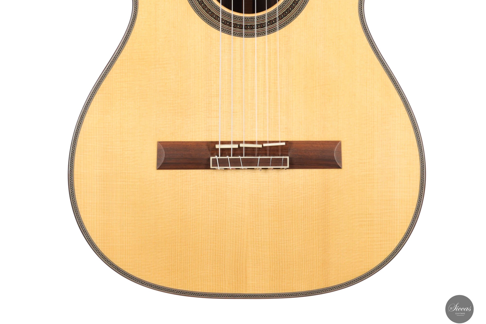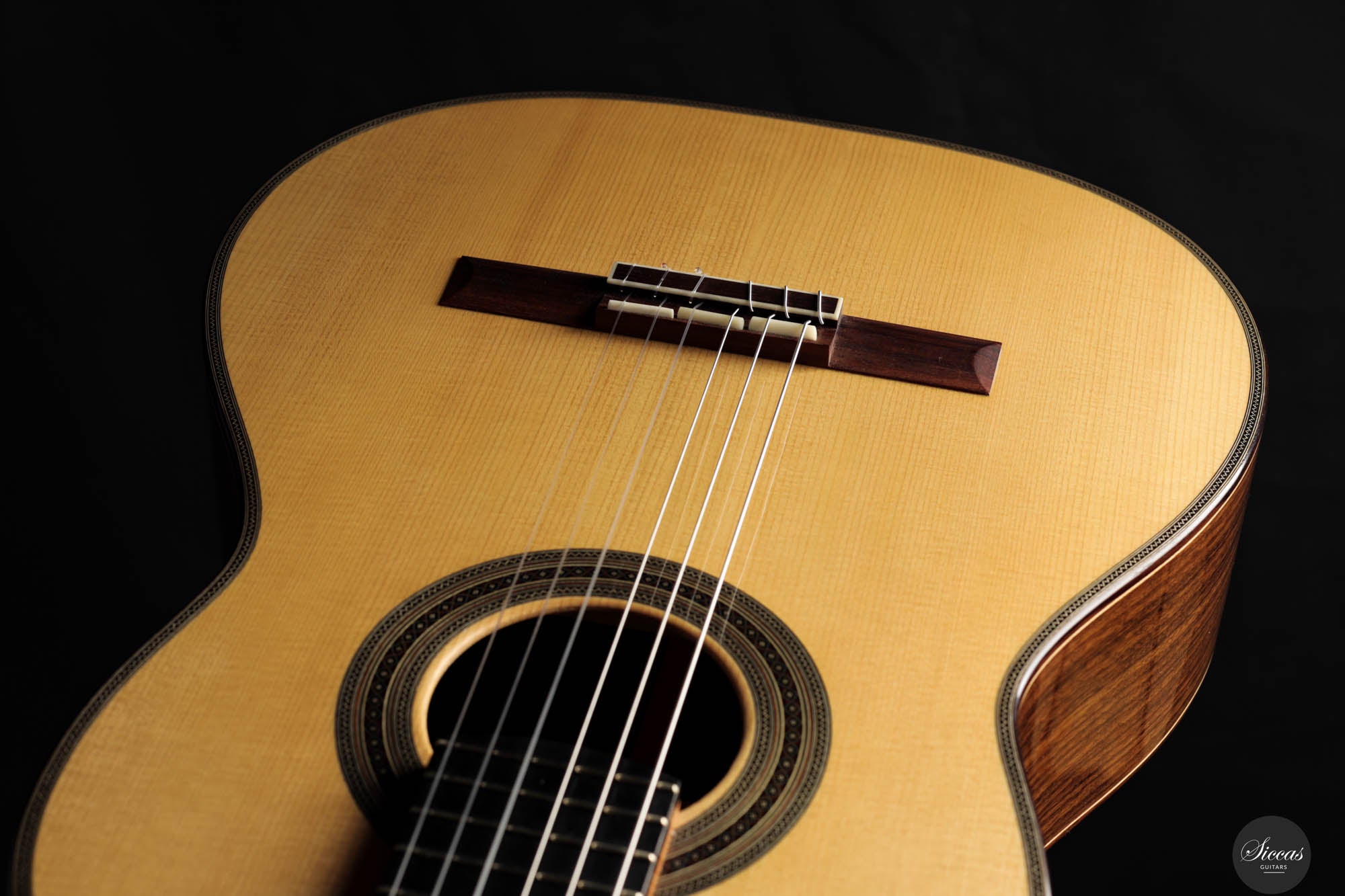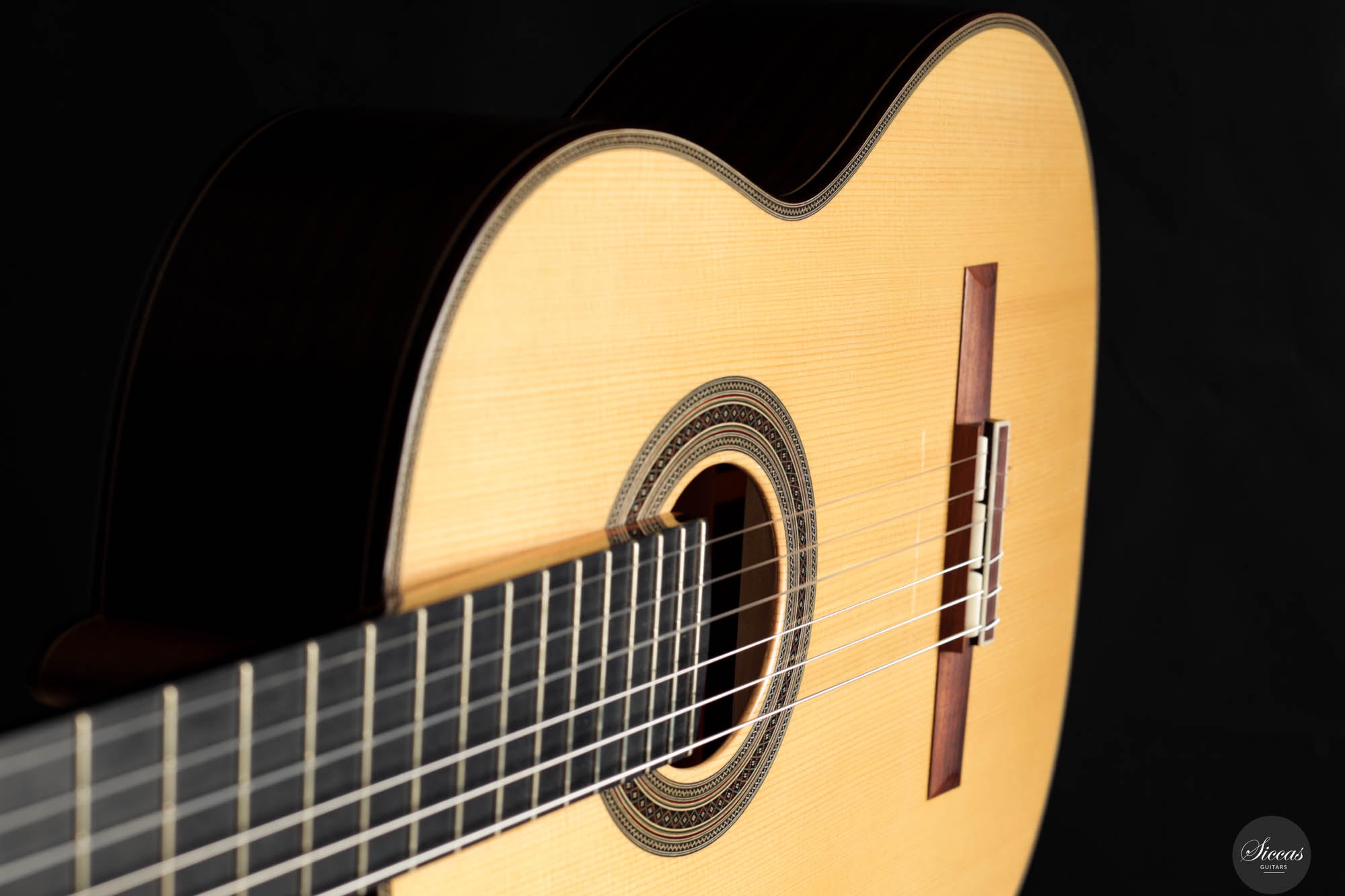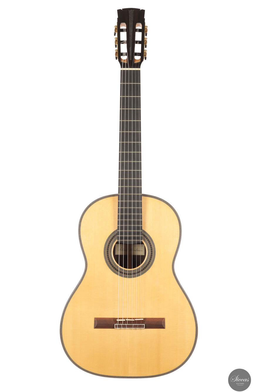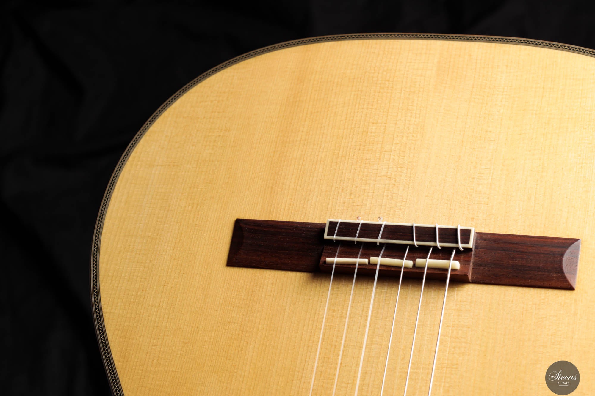 This guitar epitomizes the fusion of traditional craftsmanship with modern design elements, making it a standout in the realm of modern classical guitars. This instrument offers a sophisticated blend of clear voice separation, prolonged sustain, and balanced polyphony, resulting in a complex tonal character that is both bold and nuanced. Its design features a comfortably rounded neck, and a slightly elevated fretboard to ease access to the upper register. Additionally, this guitar is noted for its exceptional volume, which allows it to perform admirably in a variety of concert settings without compromising on tonal richness. The impressive projection is finely balanced with its sonic appeal, a tribute to Heinzelmann’s meticulous attention to detail in its craftsmanship.