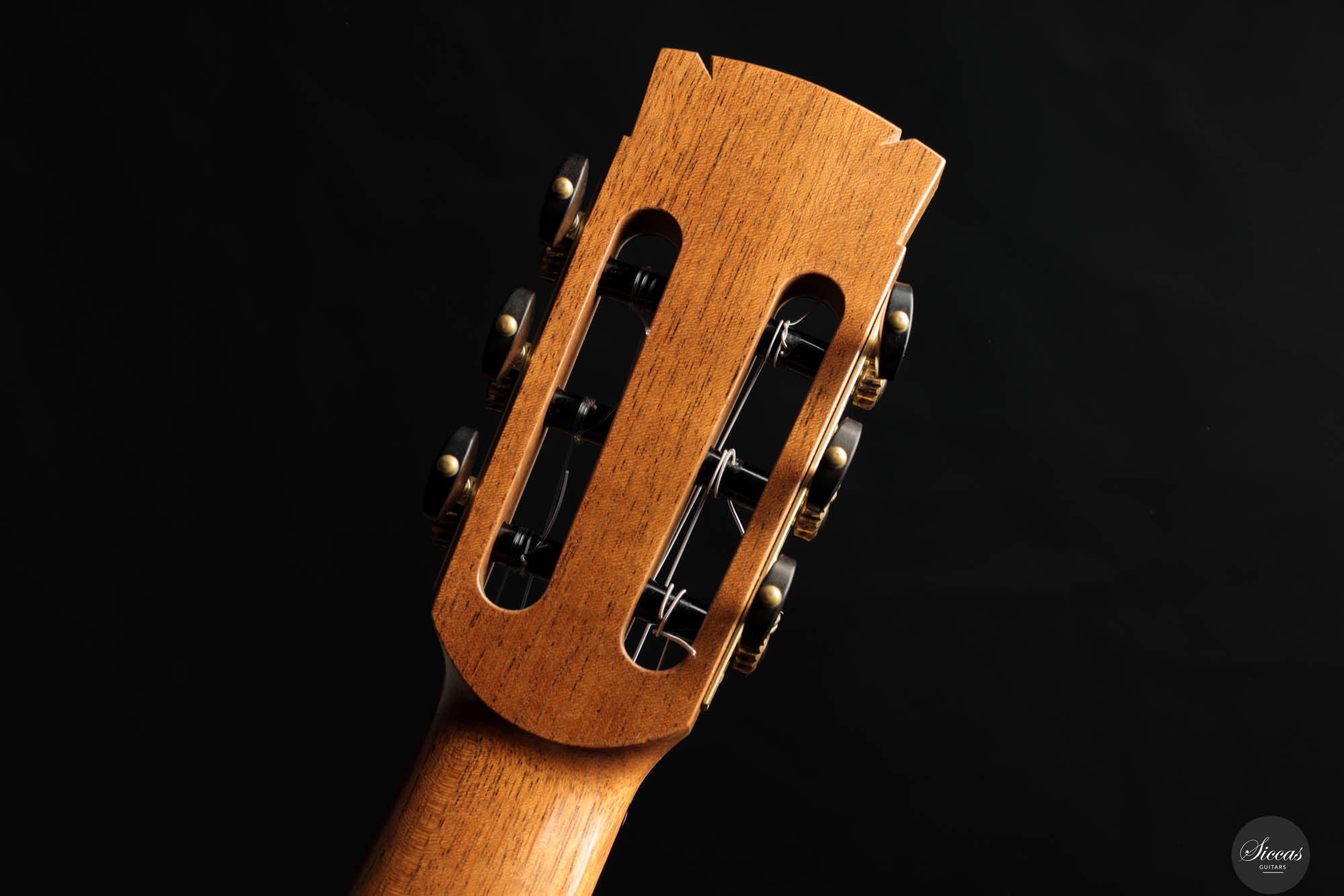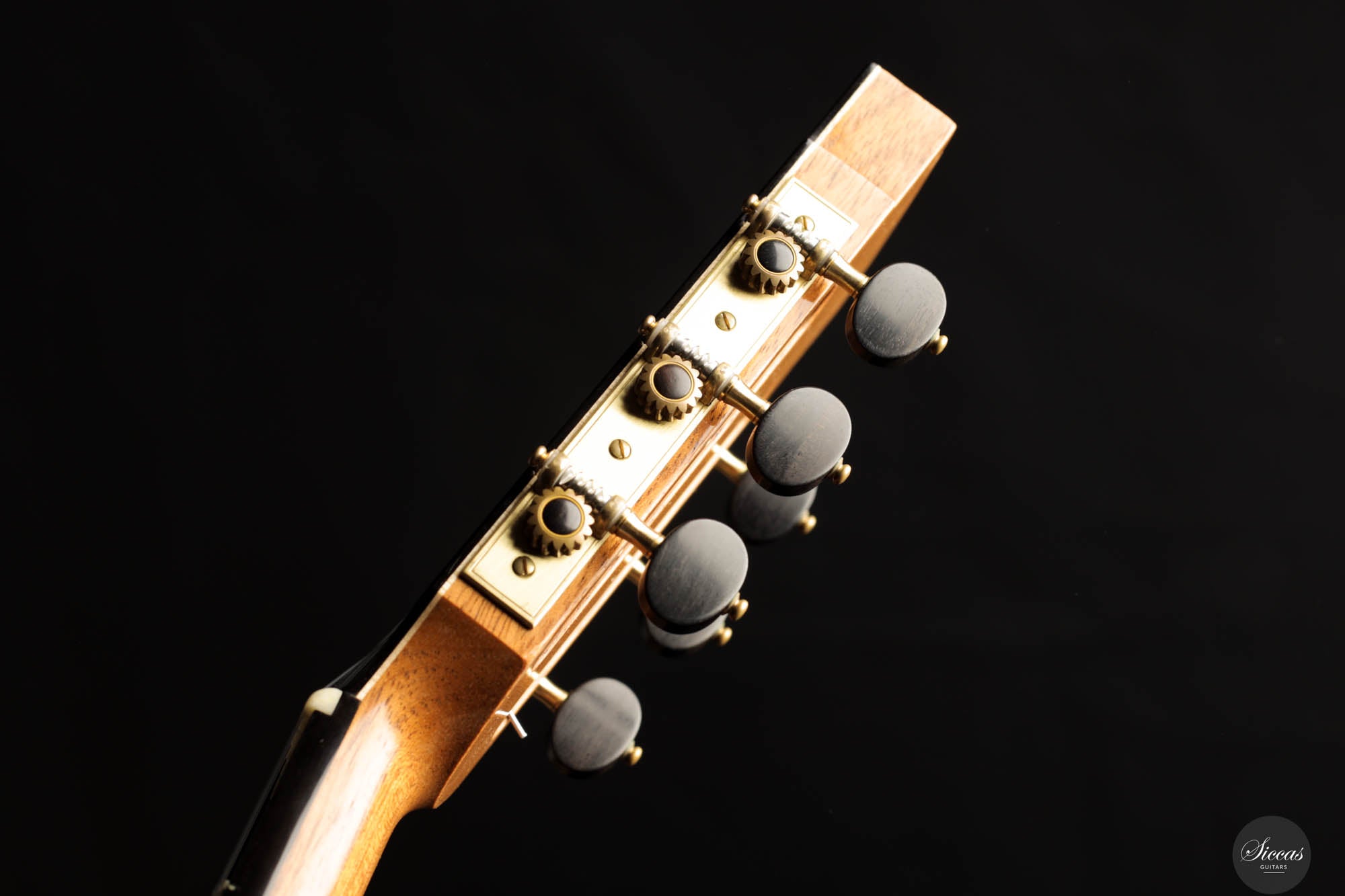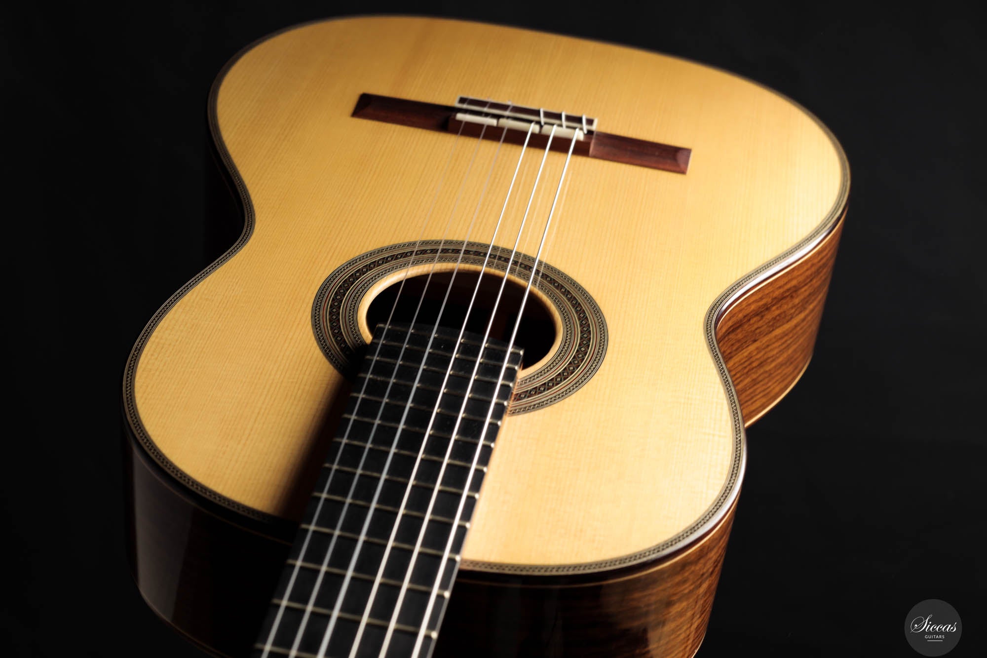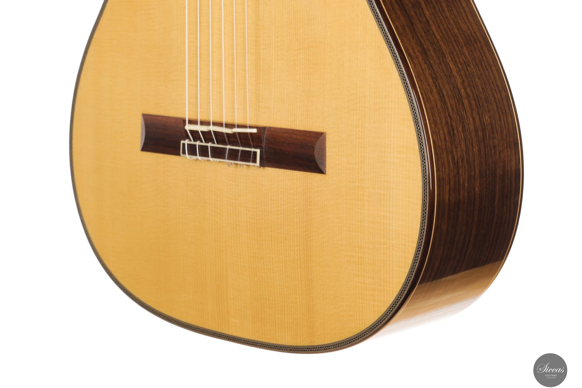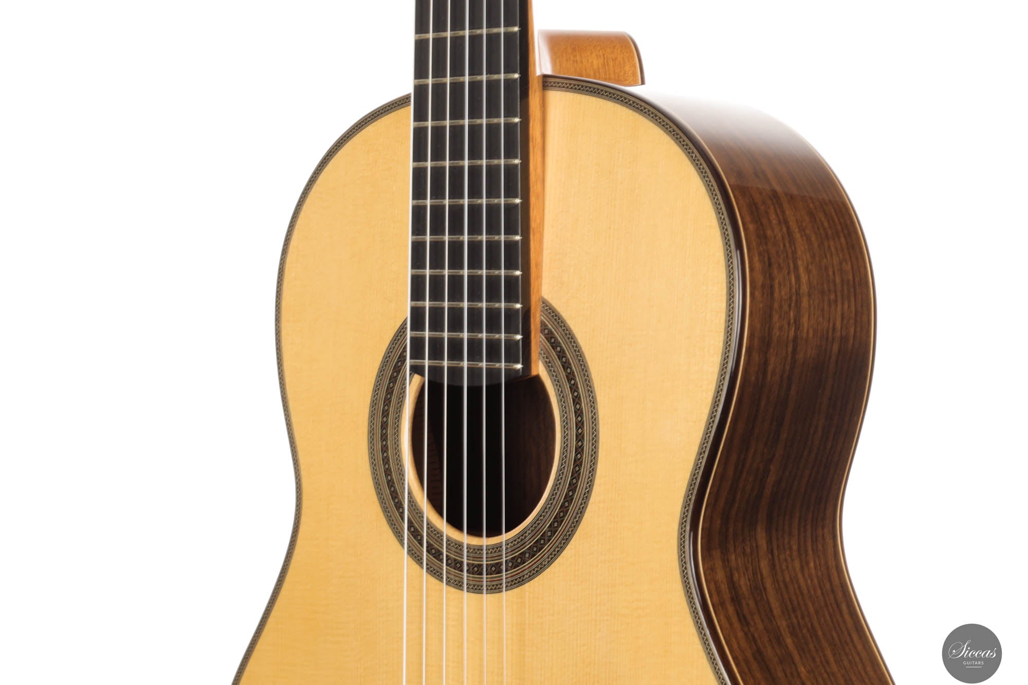 This guitar epitomizes the fusion of traditional craftsmanship with modern design elements, making it a standout in the realm of modern classical guitars. This instrument offers a sophisticated blend of clear voice separation, prolonged sustain, and balanced polyphony, resulting in a complex tonal character that is both bold and nuanced. Its design features a comfortably rounded neck, and a slightly elevated fretboard to ease access to the upper register. Additionally, this guitar is noted for its exceptional volume, which allows it to perform admirably in a variety of concert settings without compromising on tonal richness. The impressive projection is finely balanced with its sonic appeal, a tribute to Heinzelmann’s meticulous attention to detail in its craftsmanship.