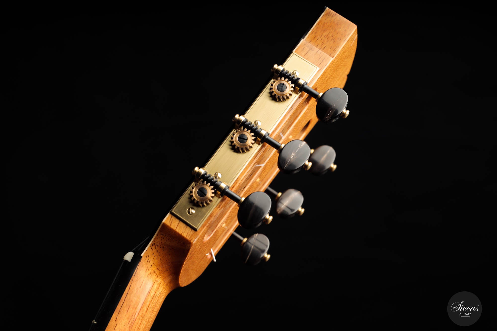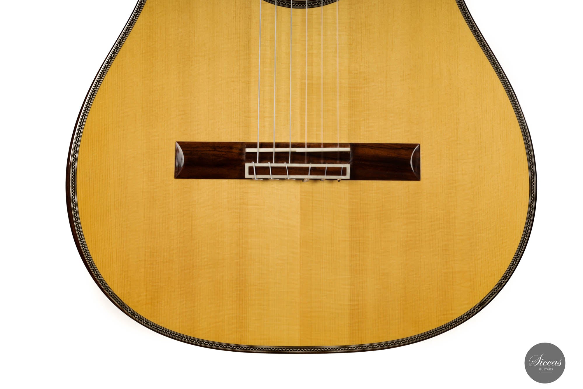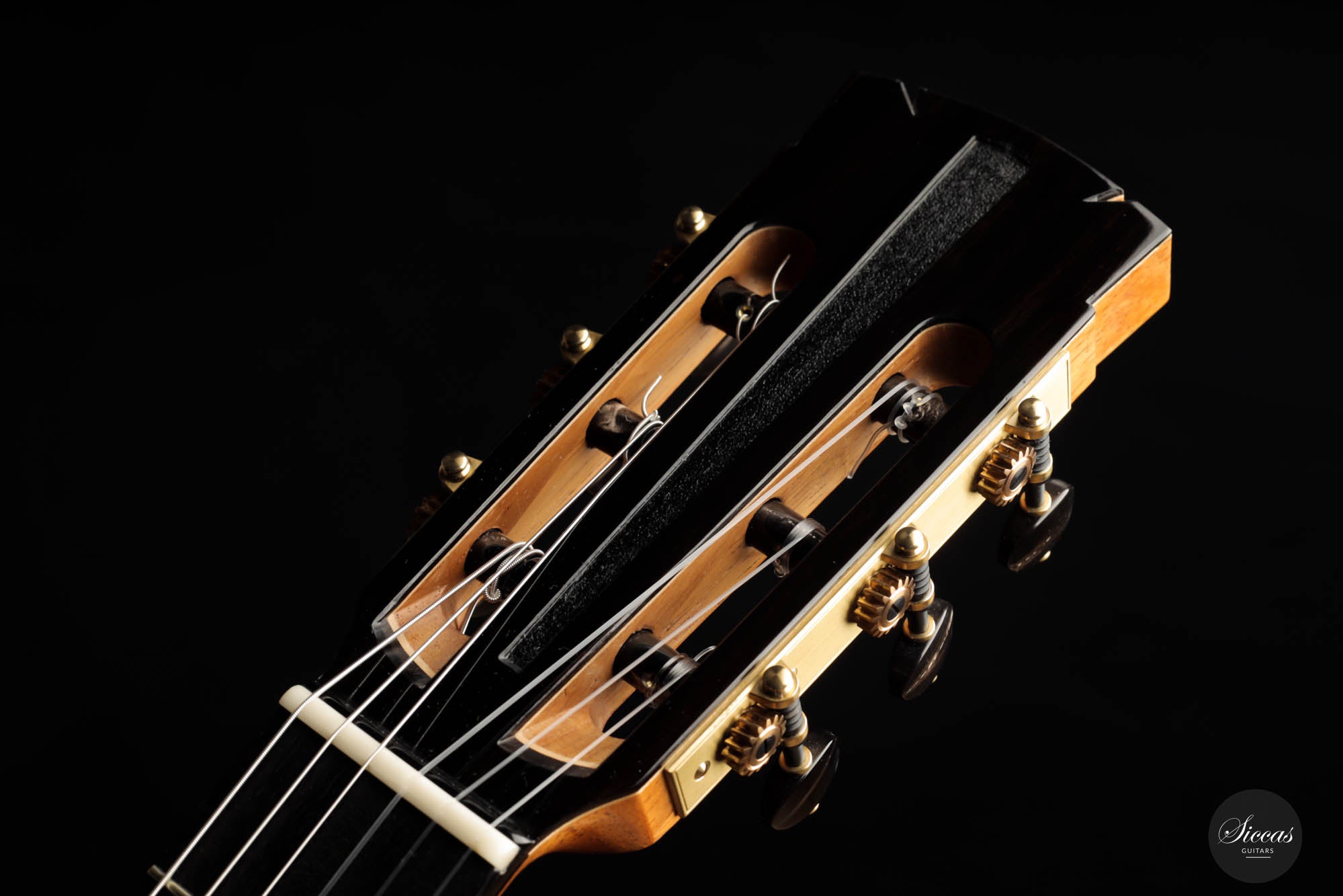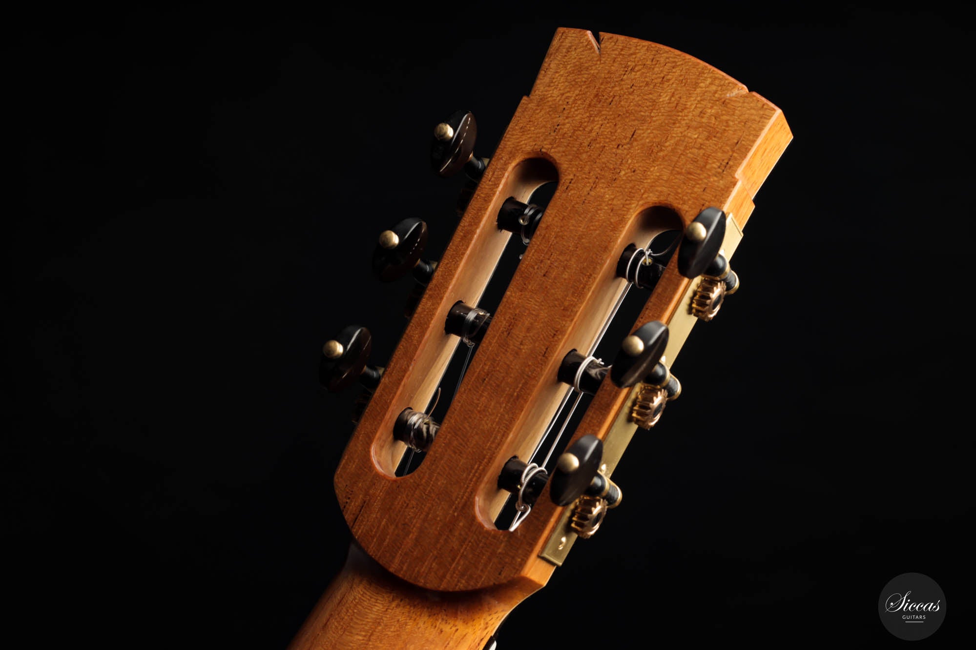 His craftsmanship and the way Adrian Heinzelmann designs his soundboards are unique. Many narrow parallel trenches are carved inside of the cedar soundboard to optimize its weight and flexibility. This technique, combined with lightweight lattice bracing, gives an instrument of great sensitivity and impressive volume. Playing Adrian Heinzelmann’s guitar gives a feeling of confidence and pushes the guitarist to go beyond his limits.