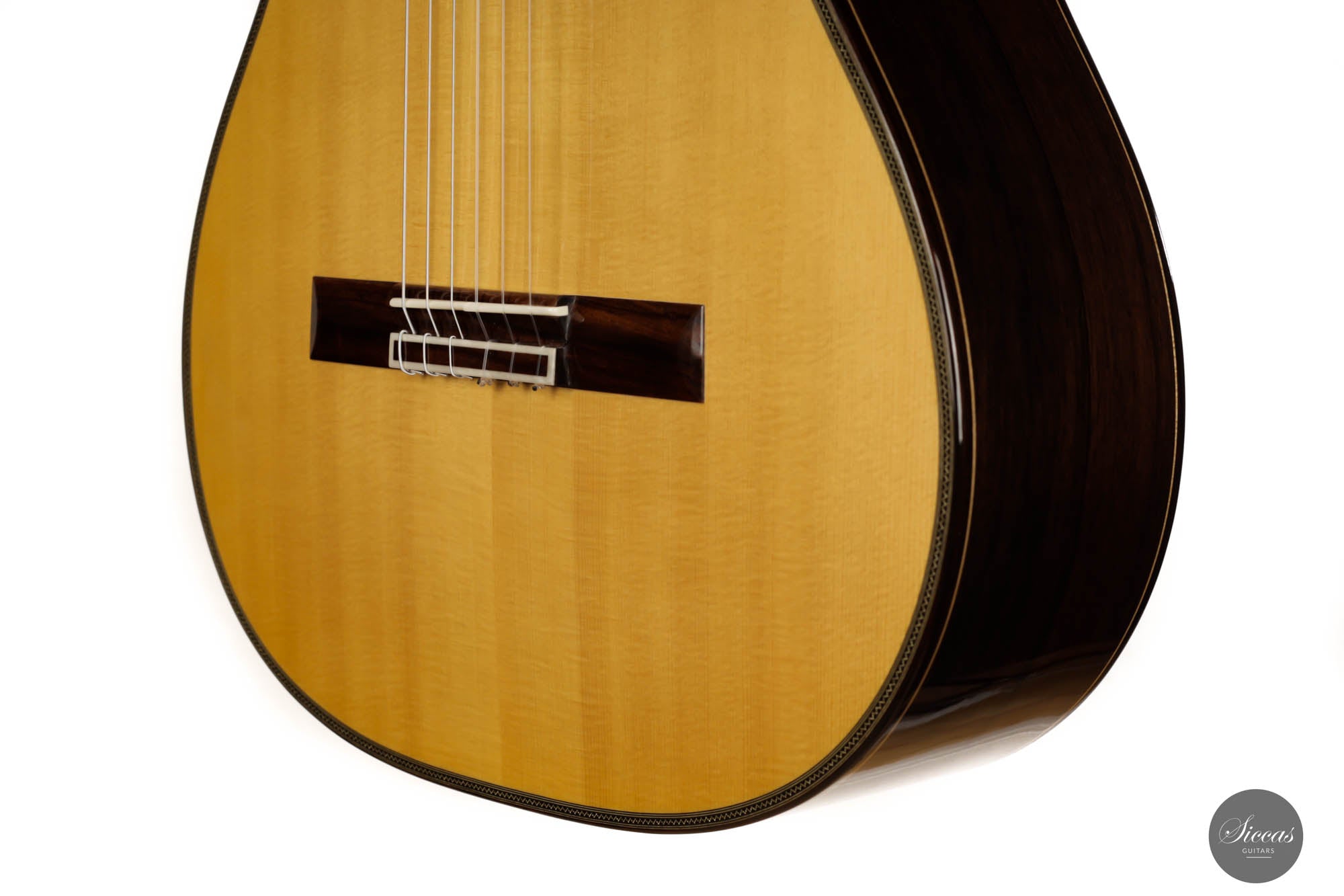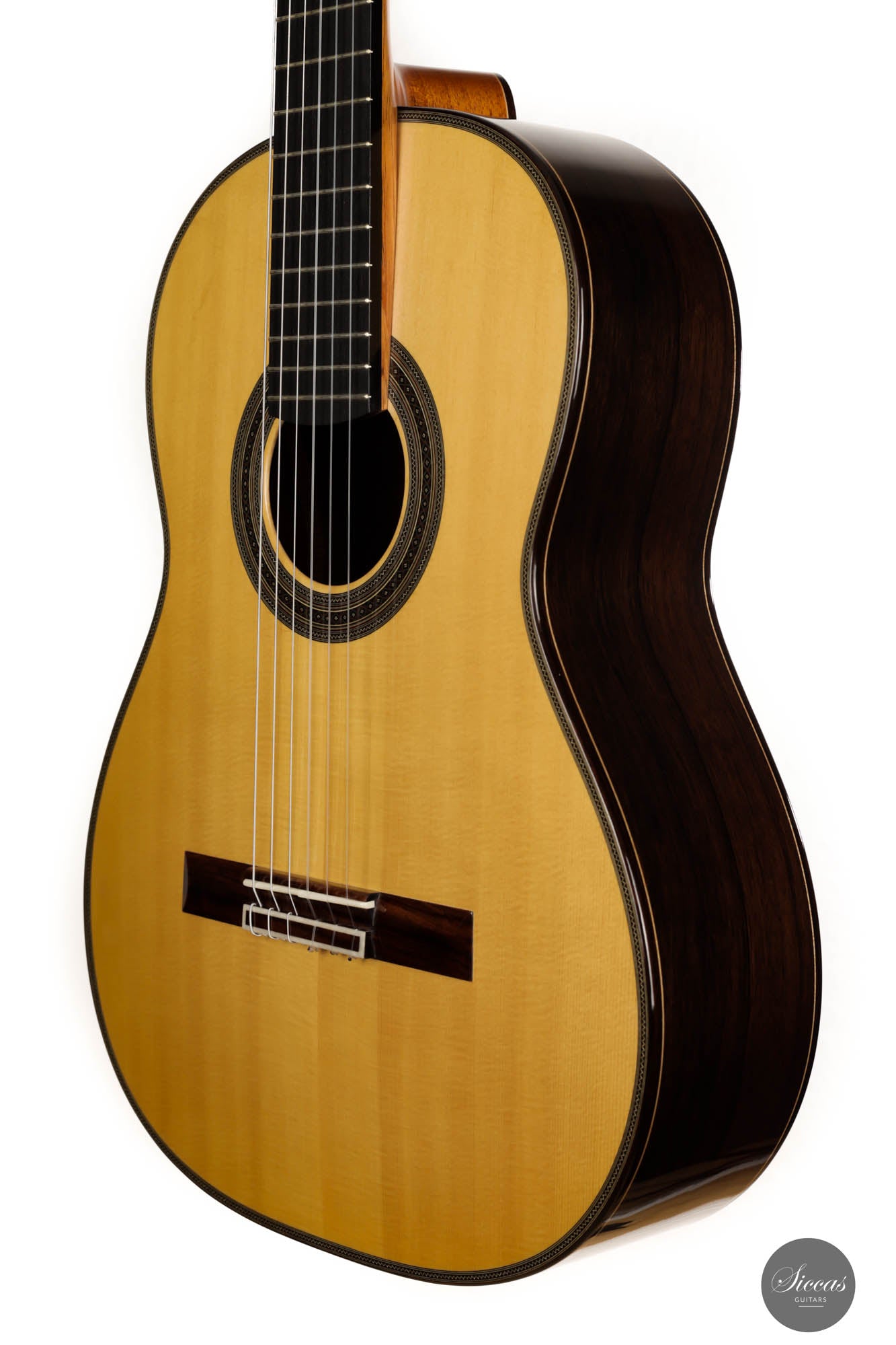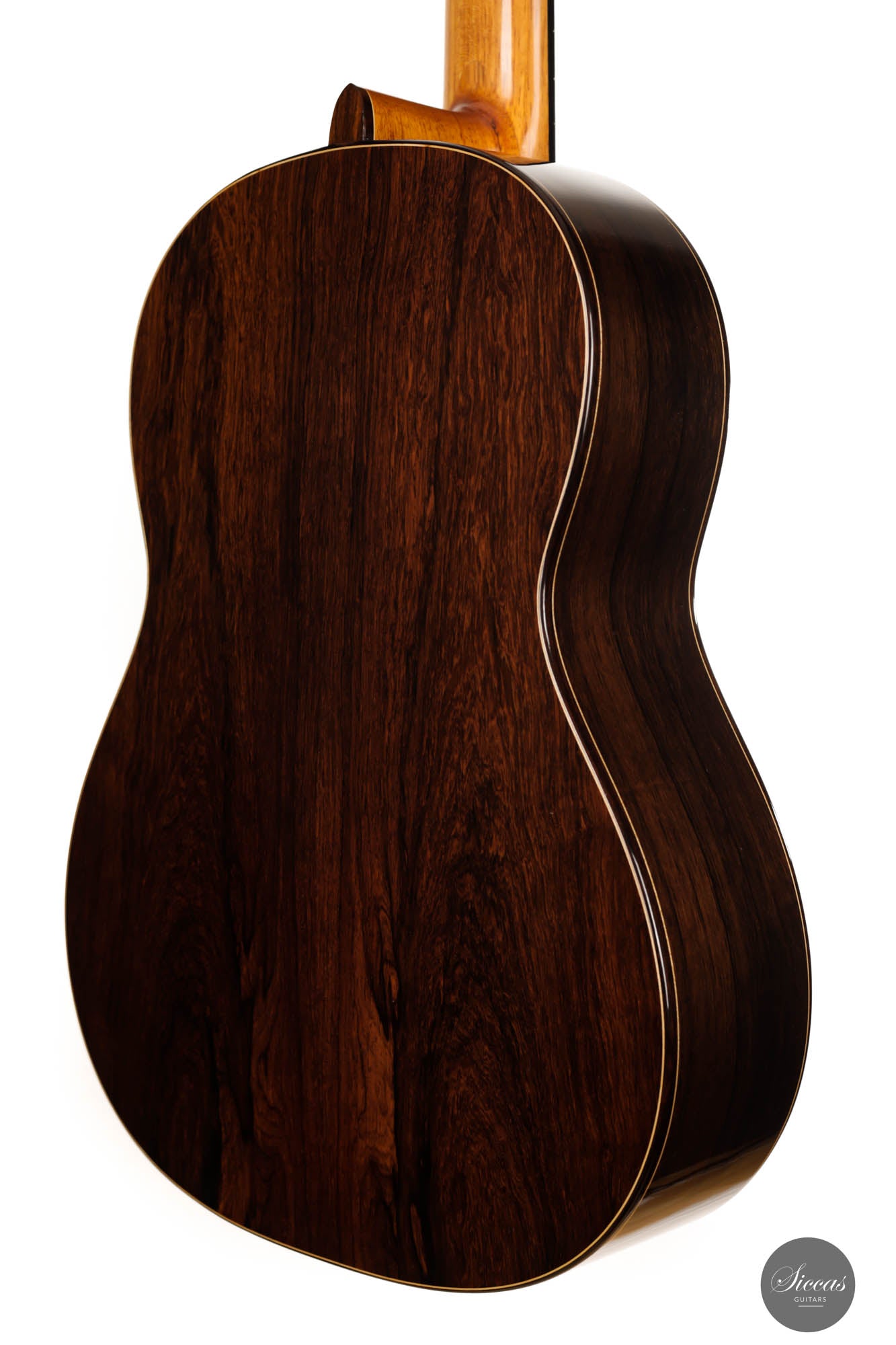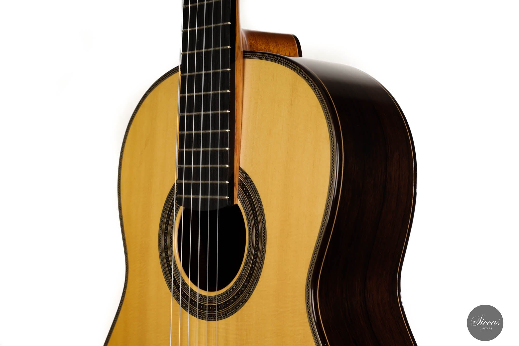 Adrian’s guitar is very a versatile concert instrument of the highest grade. Every aspect of this guitar is simply impressive, both tonally and aesthetically. Great care was taken in the selection of the spruce top, as well as the choice of stunning Madagascar rosewood back and sides. Its craftsmanship perfectly reflects the luthier’s outstanding skills as a craftsman. This guitar has an excellent price-performance ratio and will also meet the needs of guitarists of any level. As a pre-loved instrument, it is in excellent condition with only superficial playing wear. Furthermore, this Heinzelmann offers excellent playability due to its great neck shape. As a result, it is a very comfortable instrument for a long practice session or concert program.