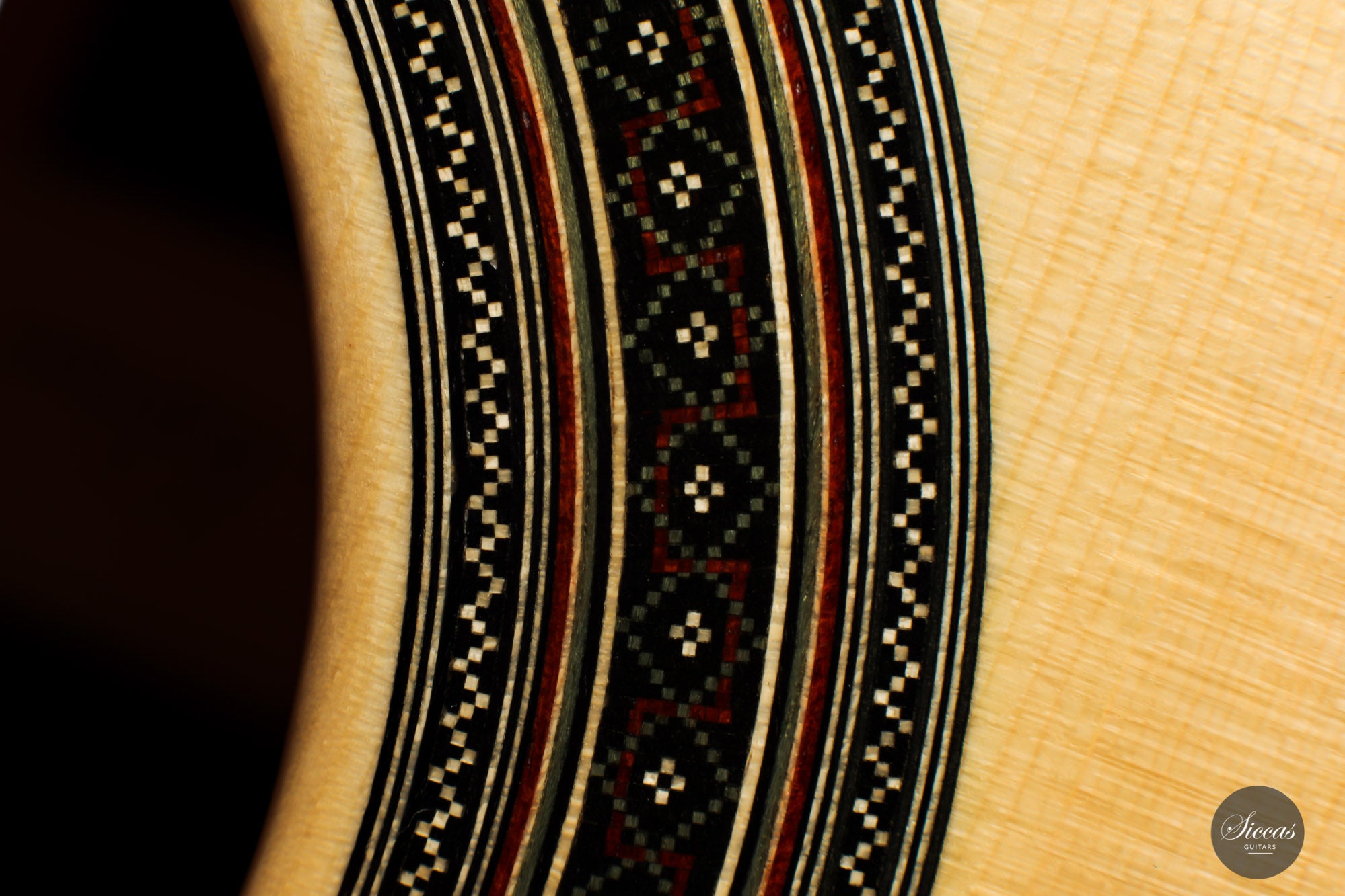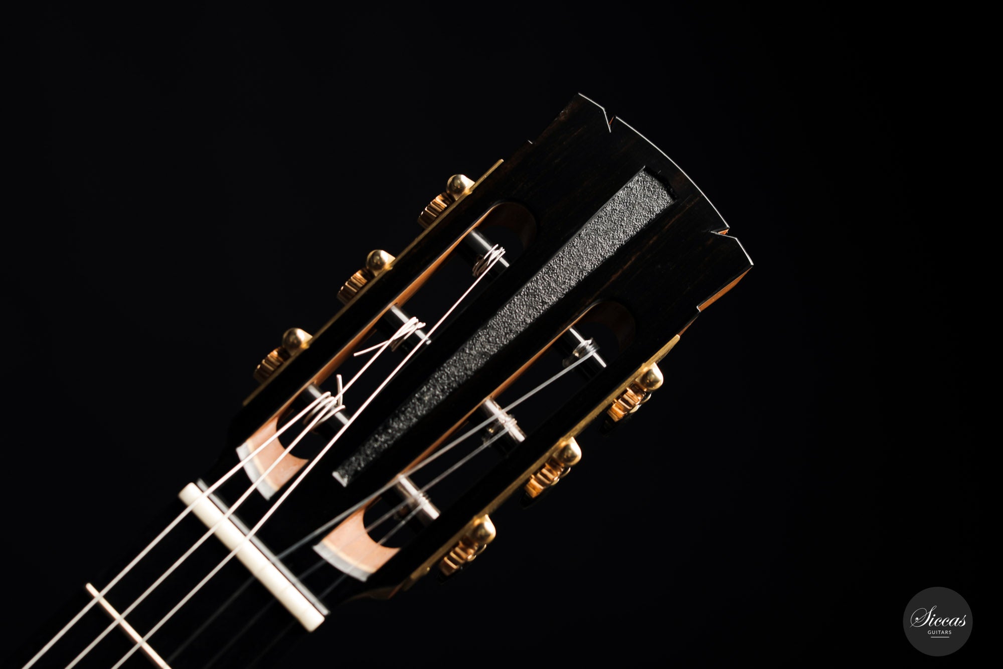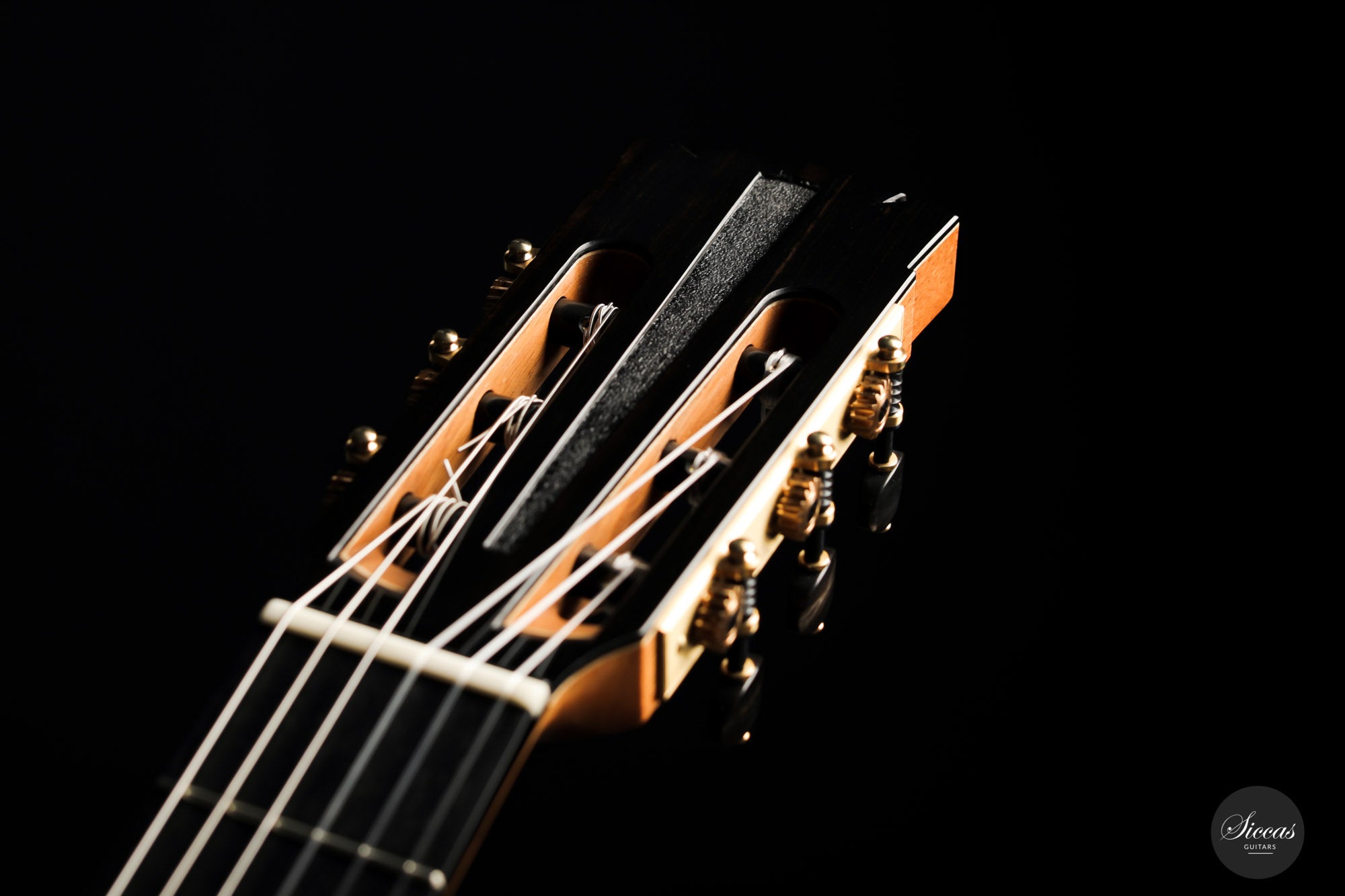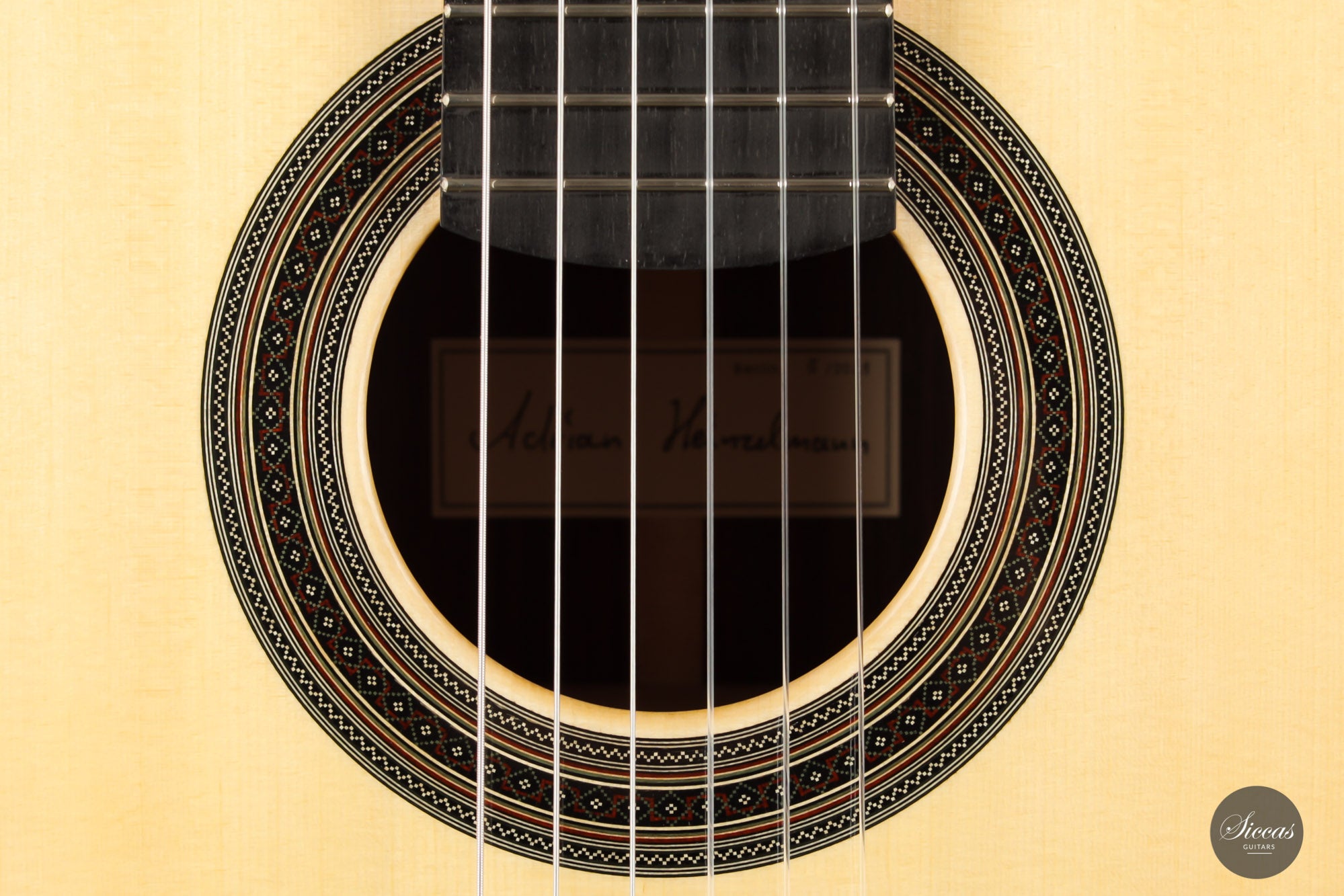 His craftsmanship and the way Adrian Heinzelmann designs his soundboards are unique. Many narrow parallel trenches are carved in the inside of the cedar soundboard to optimize its weight and flexibility. This technique, combined with a lightweight lattice bracing, gives an instrument of great sensitivity and impressive volume. Playing Adrian Heinzelmann’s guitar gives a feeling of confidence and pushes the guitarist to go beyond his limits.