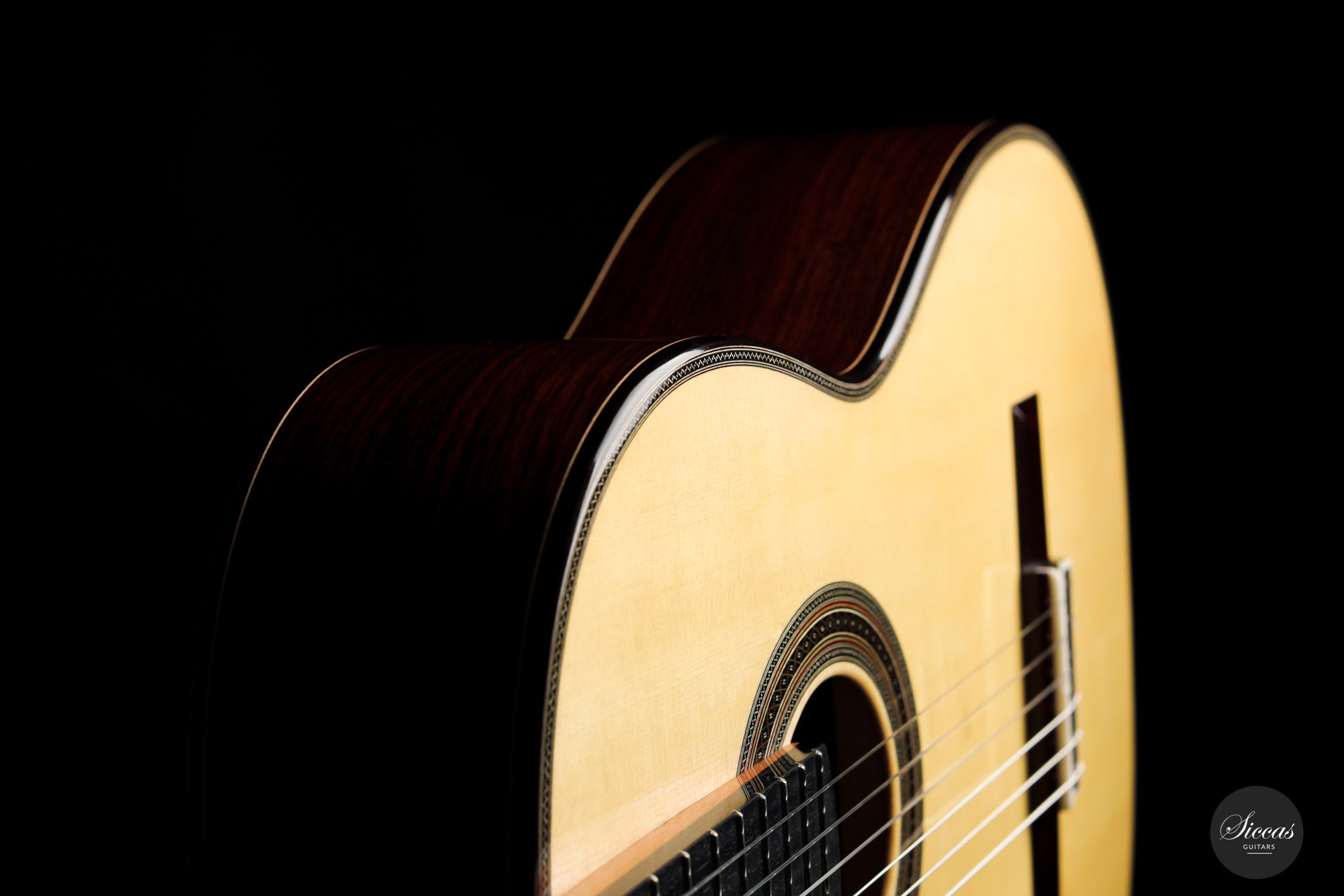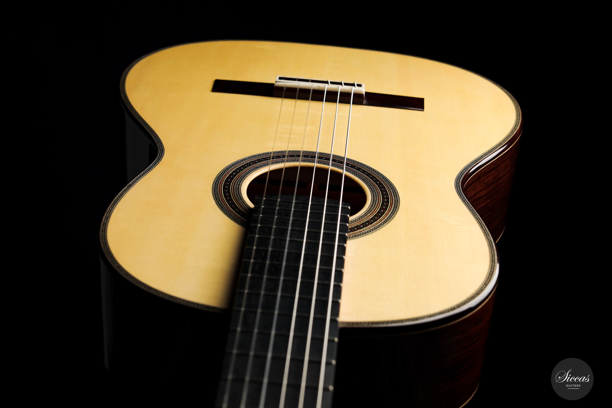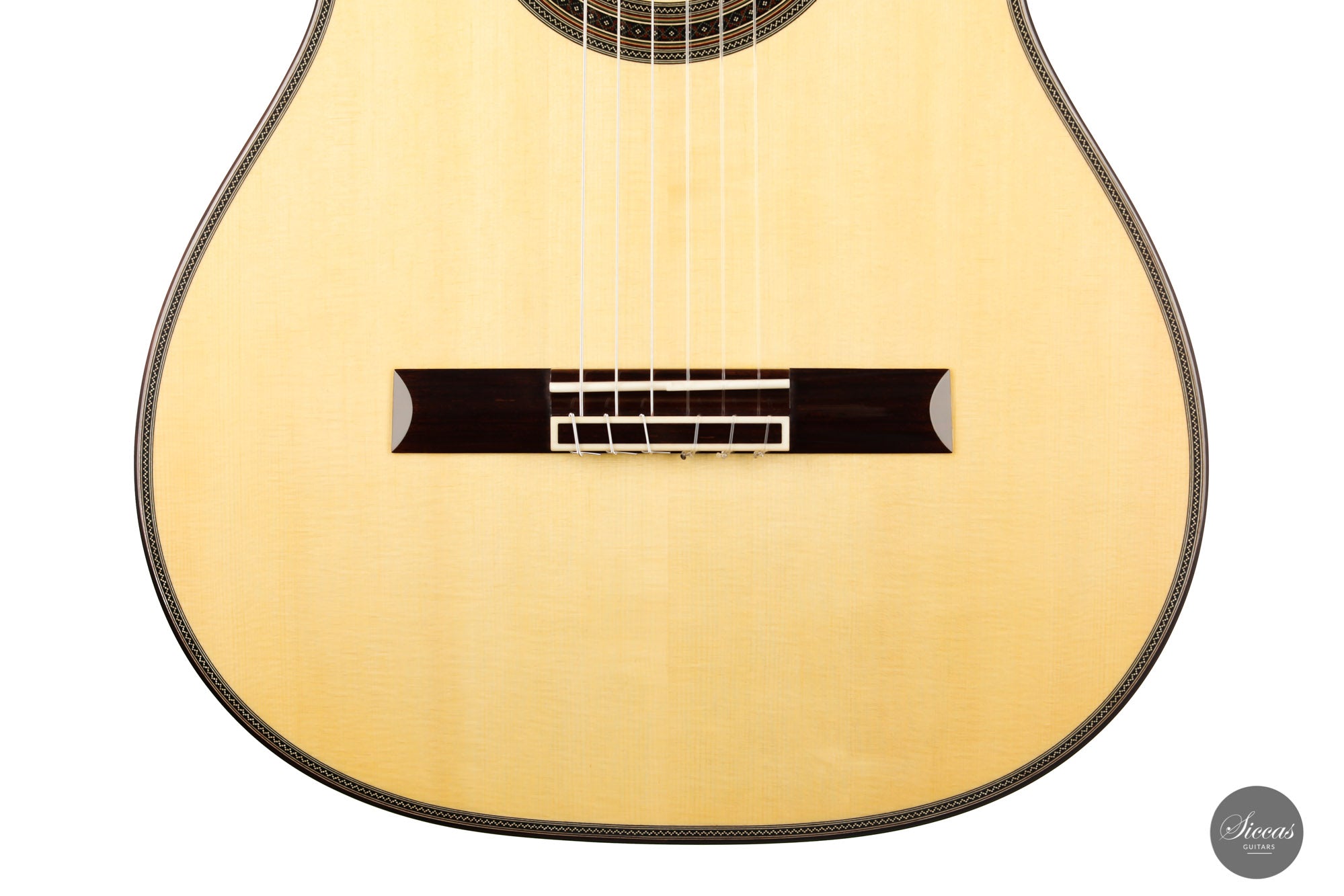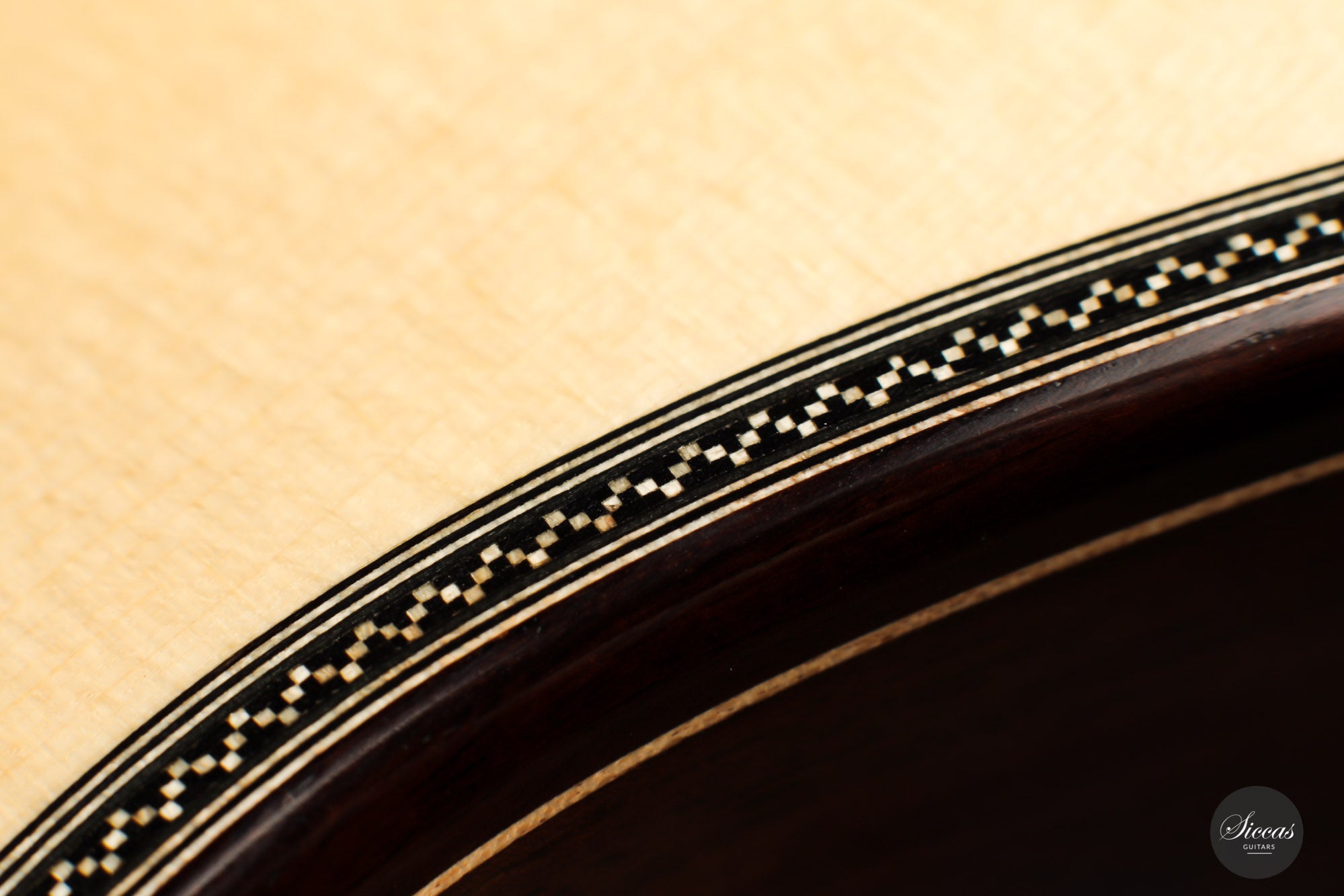 His craftsmanship and the way Adrian Heinzelmann designs his soundboards are unique. Many narrow parallel trenches are carved in the inside of the cedar soundboard to optimize its weight and flexibility. This technique, combined with a lightweight lattice bracing, gives an instrument of great sensitivity and impressive volume. Playing Adrian Heinzelmann’s guitar gives a feeling of confidence and pushes the guitarist to go beyond his limits.