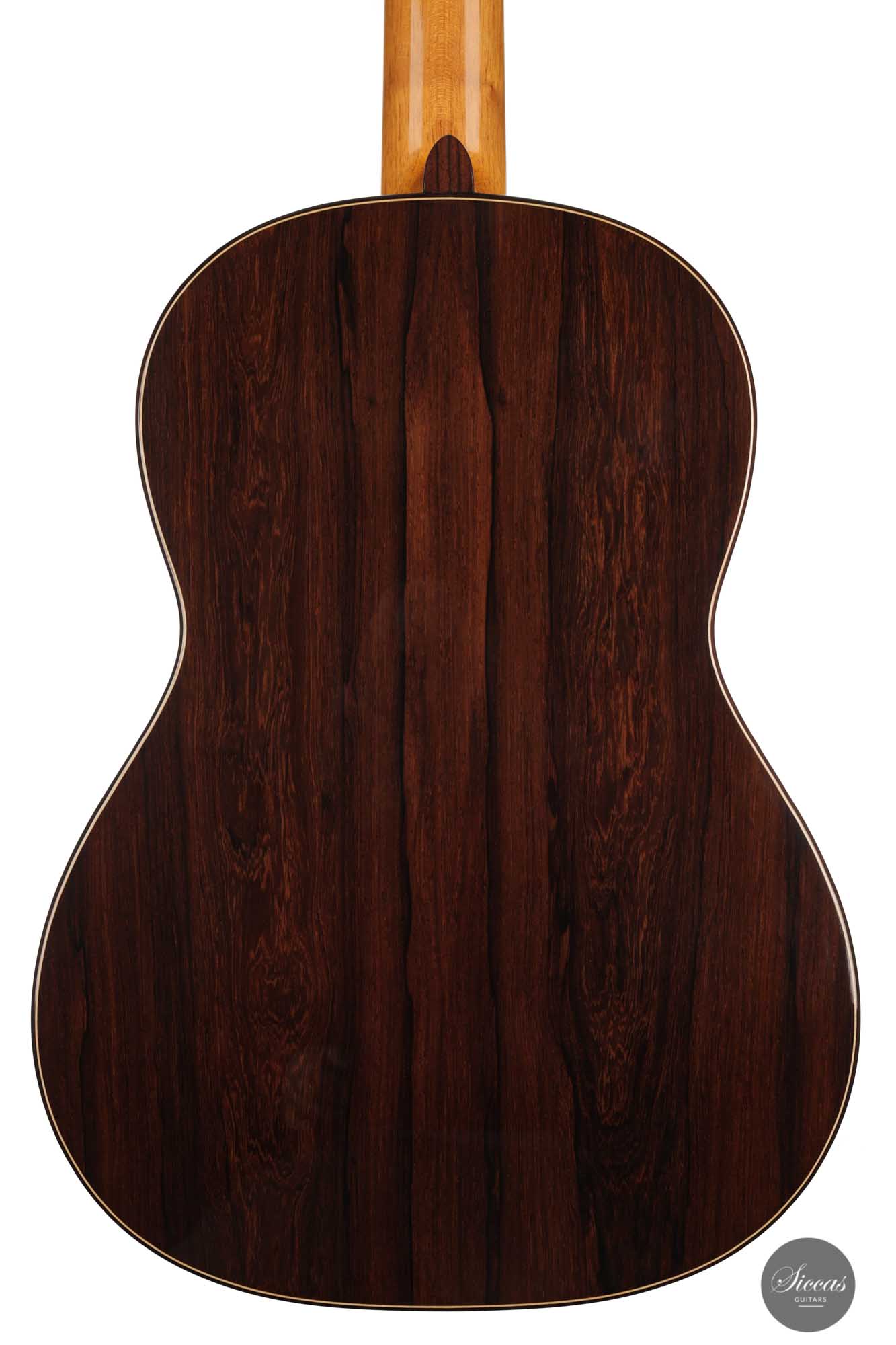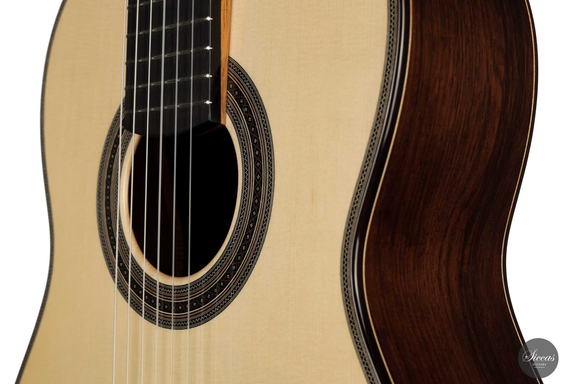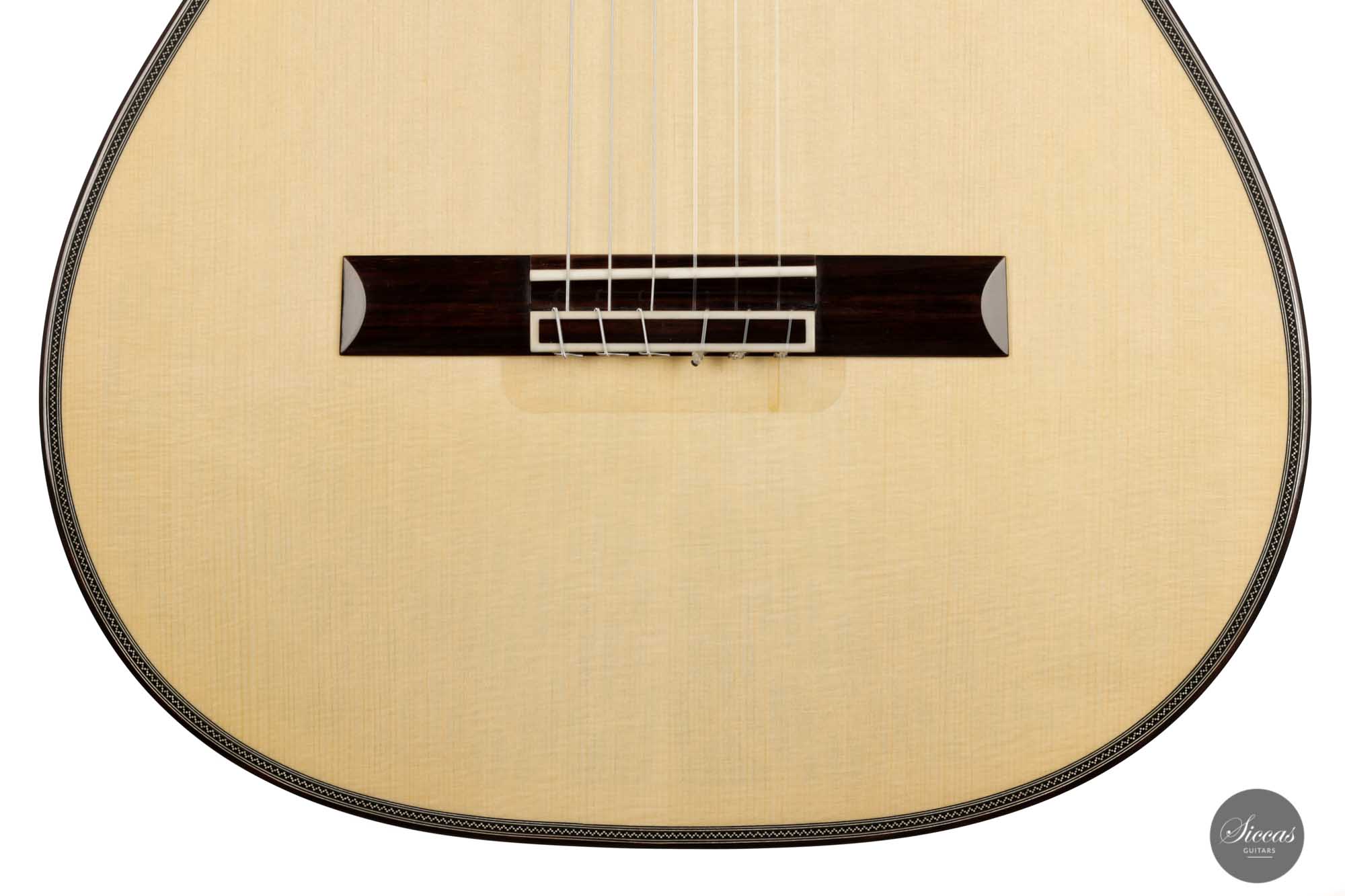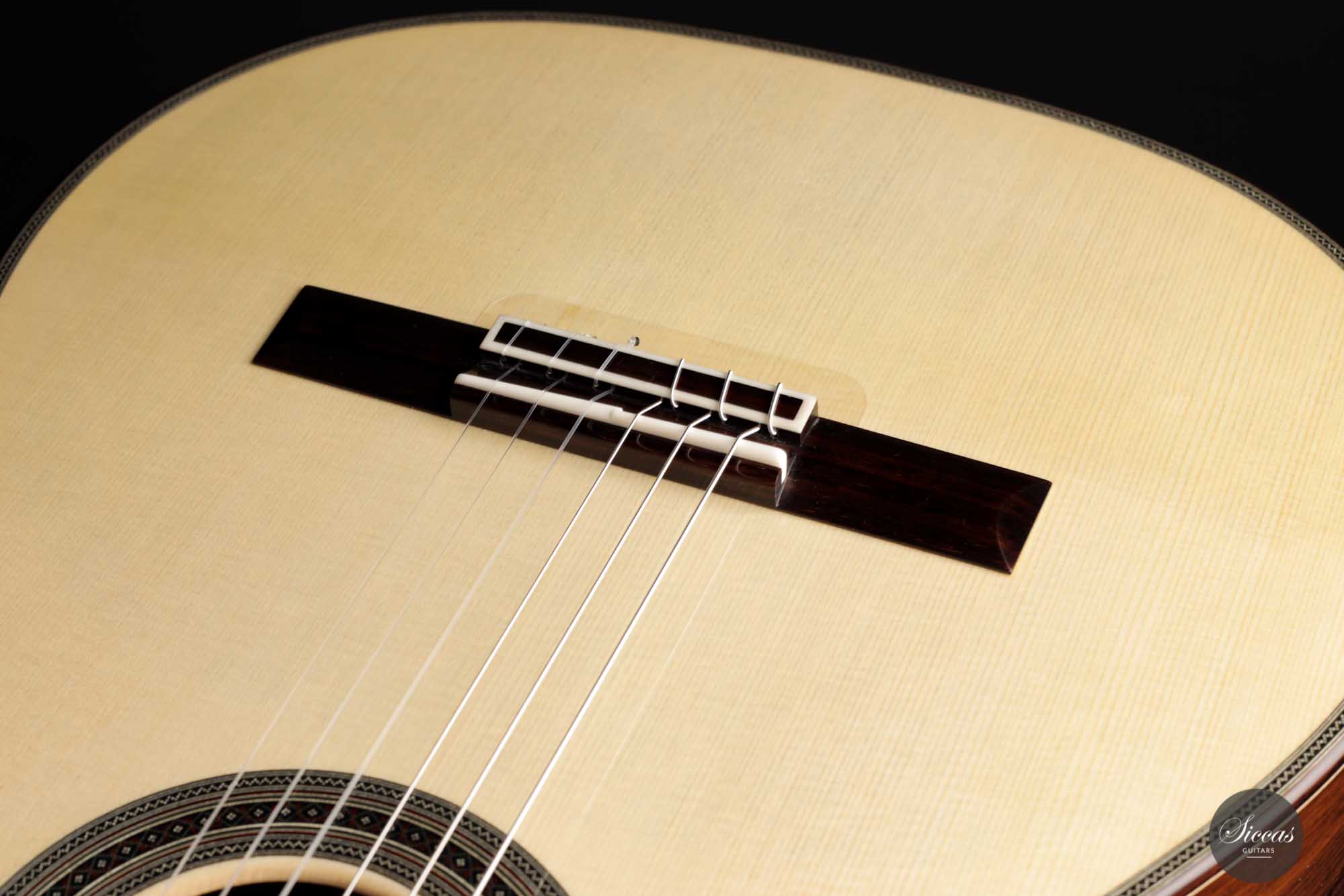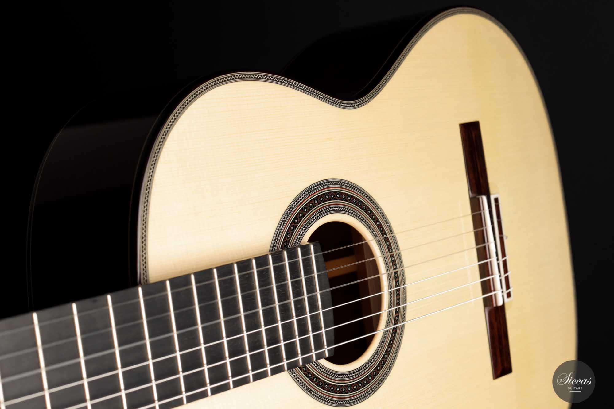 Diese edel aussehende Gitarre mit modernem Charakter bietet alle Eigenschaften, die eine erstklassige Konzertgitarre auszeichnen. Dazu gehören ein rundum ausgewogener Klang bei polyphoner Musik, eine erstklassige Klangtrennung und ein gutes Sustain. Darüber hinaus überzeugt sie mit einem bemerkenswerten Klang, der zugleich lieblich und kraftvoll ausfällt. Der angenehm runde Hals, das erhöhte Griffbrett und die reaktionsfreudige Decke verleihen der Gitarre ein großartiges Spielgefühl und bringen das Beste hervor, was ein Konzertgitarrist von einer Meistergitarre erwartet. Aufgrund einer gerissenen Saite wurde bei dieser nagelneuen Gitarre eine kleine Reparatur unter dem Steg durchgeführt, die im Preis berücksichtigt wurde.
