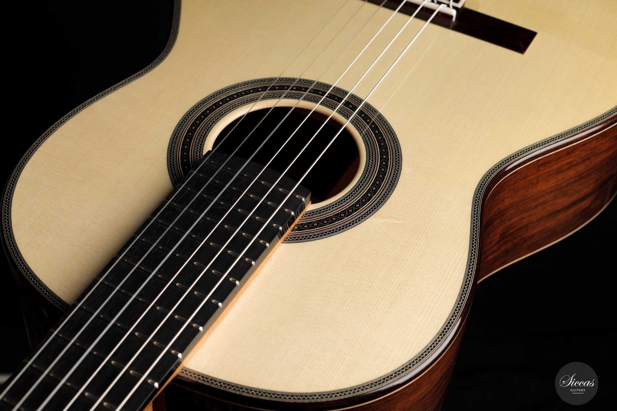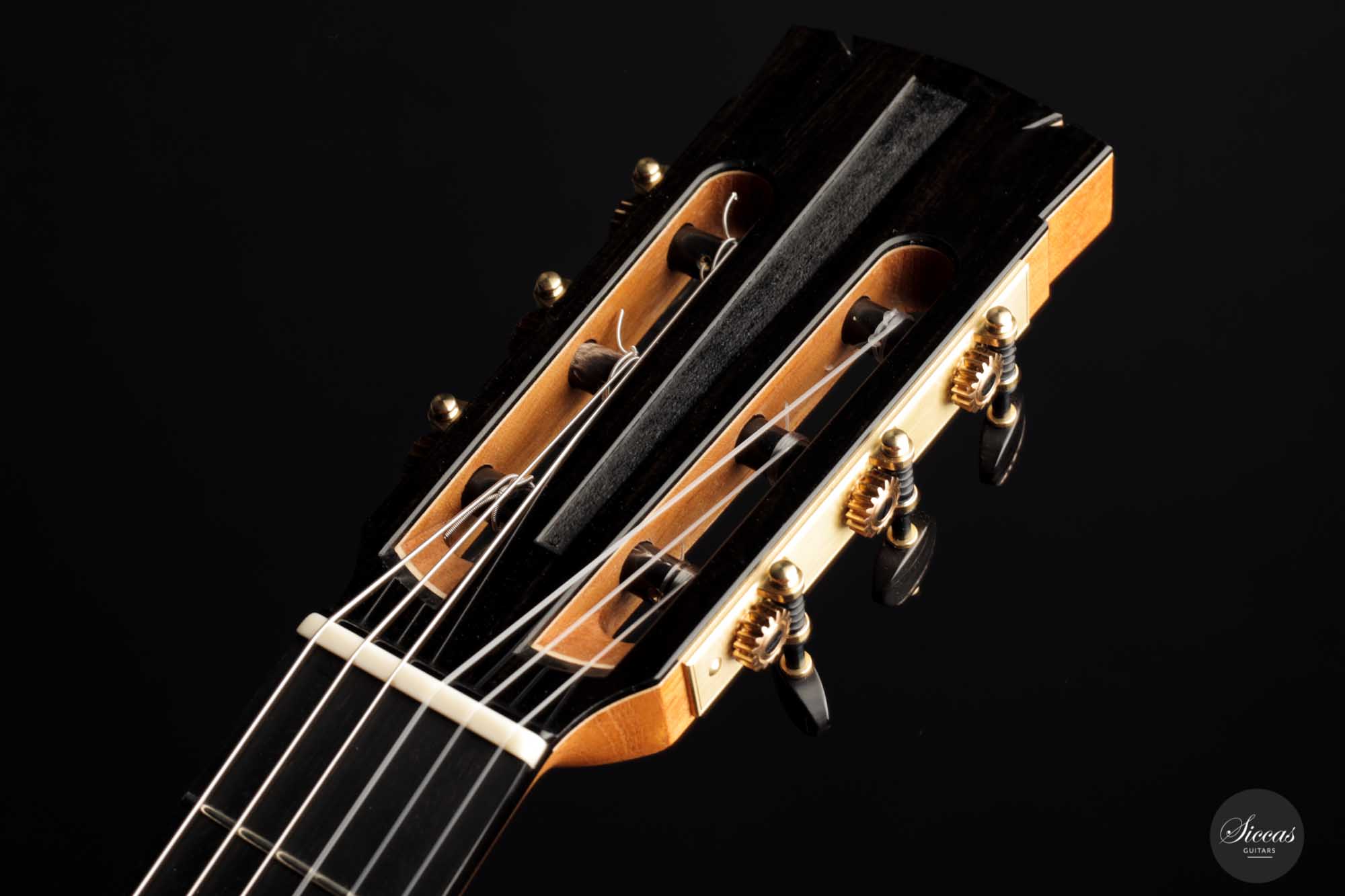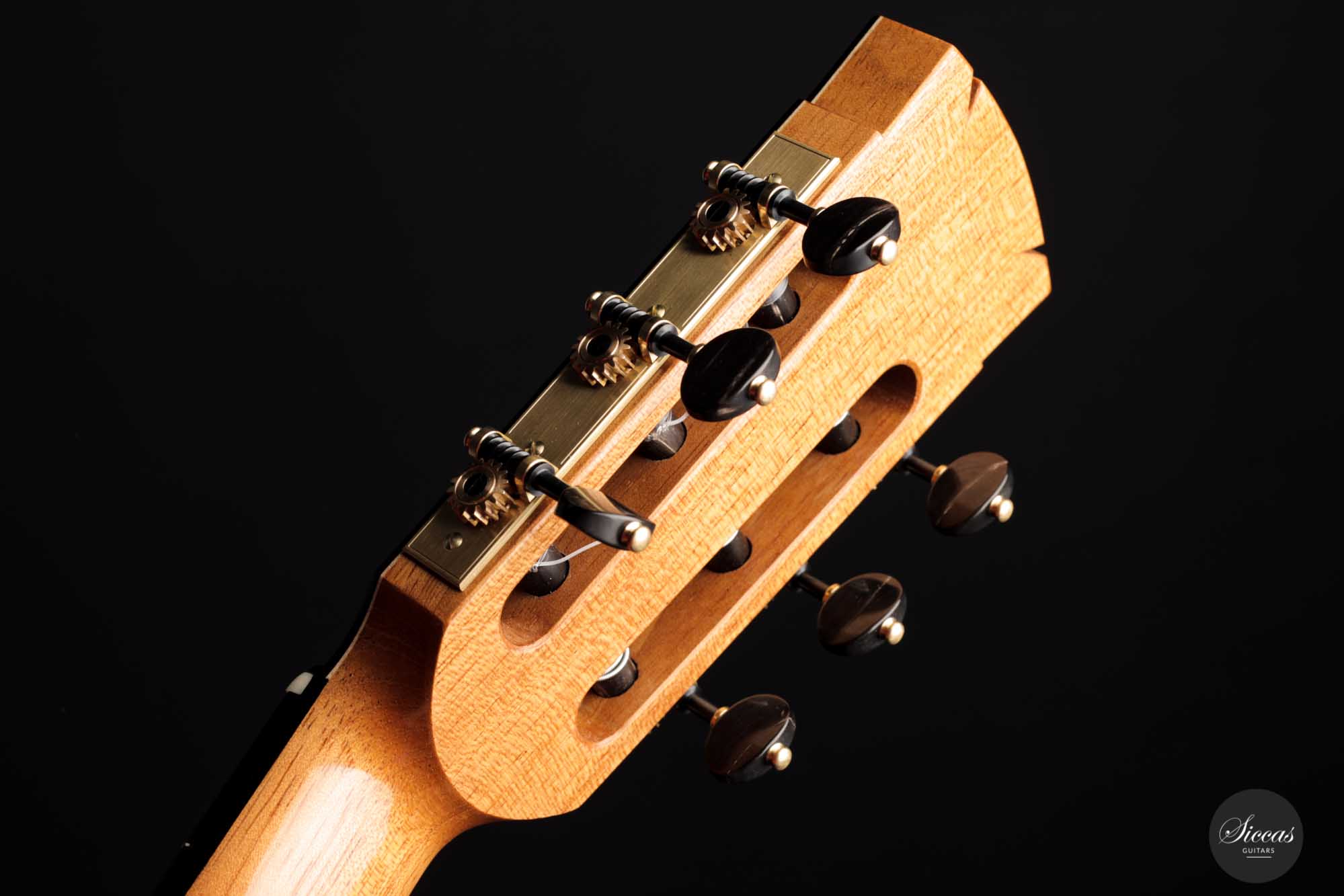 Seine Kunstfertigkeit und die Art wie Adrian Heinzelmann seine Klangdecken konzipiert sind einzigartig. Das Holz wird von innen gefräst, um die Flexibilität und das Gewicht zu optimieren. Diese Technik, kombiniert mit einer Gitter-Beleistung, ergibt ein Instrument von großer Flexibilität und beeindruckendem Volumen. Es sind leicht zu spielende Gitarren, die dem Gitarristen großes Selbstvertrauen geben und es ihm ermöglichen, die Grenzen seines Spiels zu erweitern.