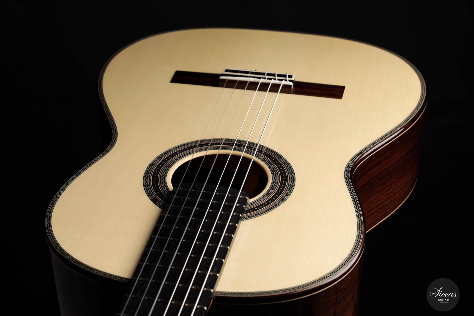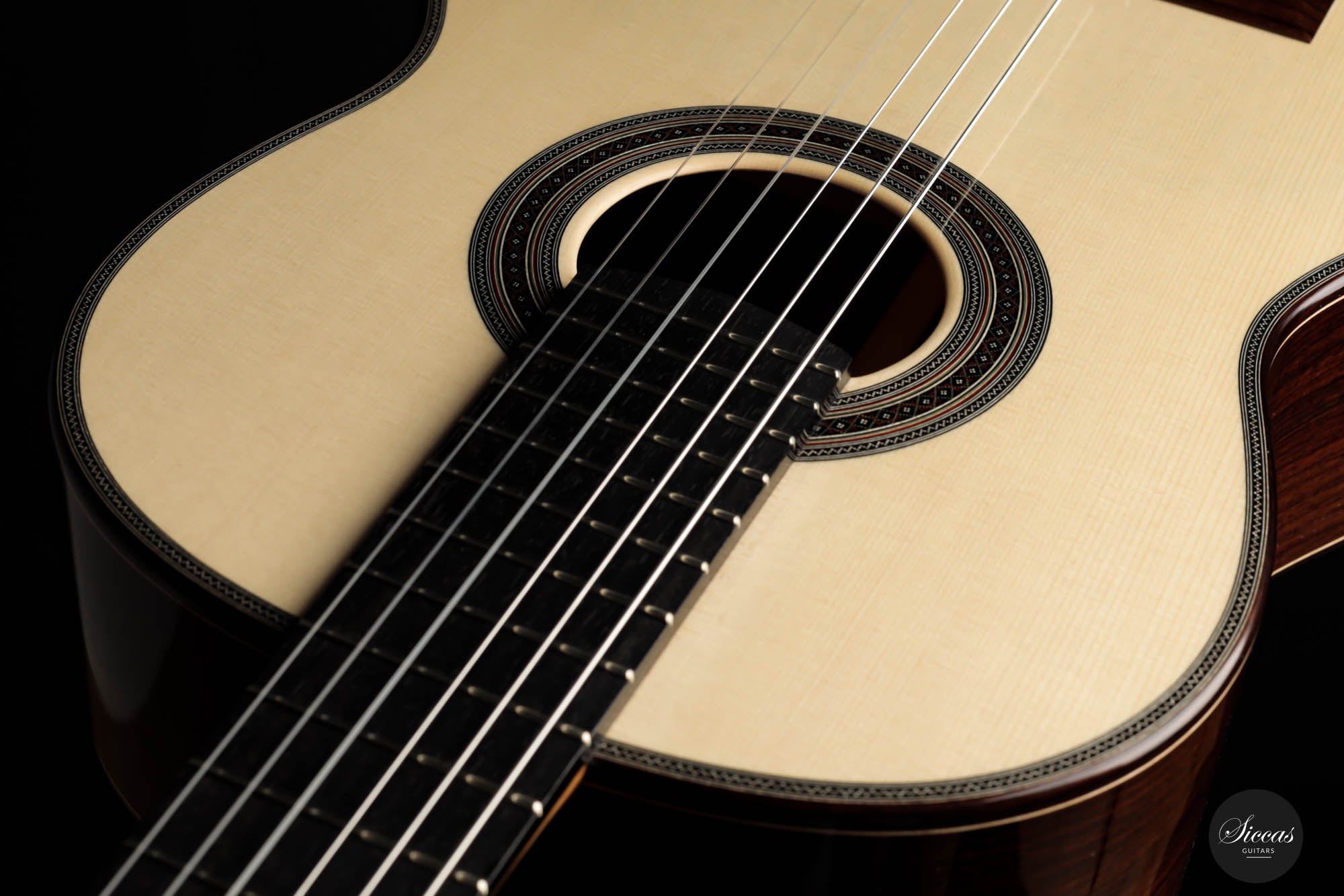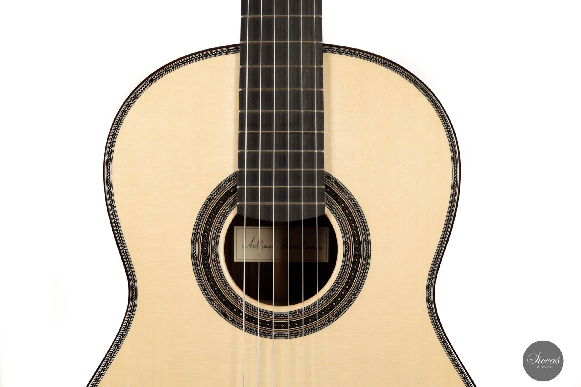 His craftsmanship and the way Adrian Heinzelmann designs his soundboards are unique. Many narrow parallel trenches are carved inside the cedar soundboard to optimize its weight and flexibility. This technique, combined with lightweight lattice bracing, gives an instrument great sensitivity and impressive volume. Playing Adrian Heinzelmann's guitar gives confidence and pushes the guitarist beyond his limits.