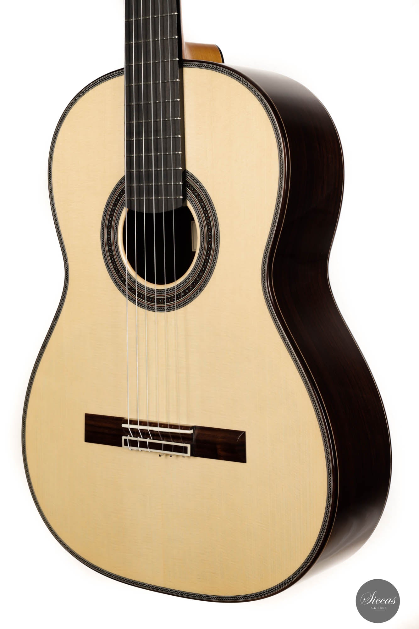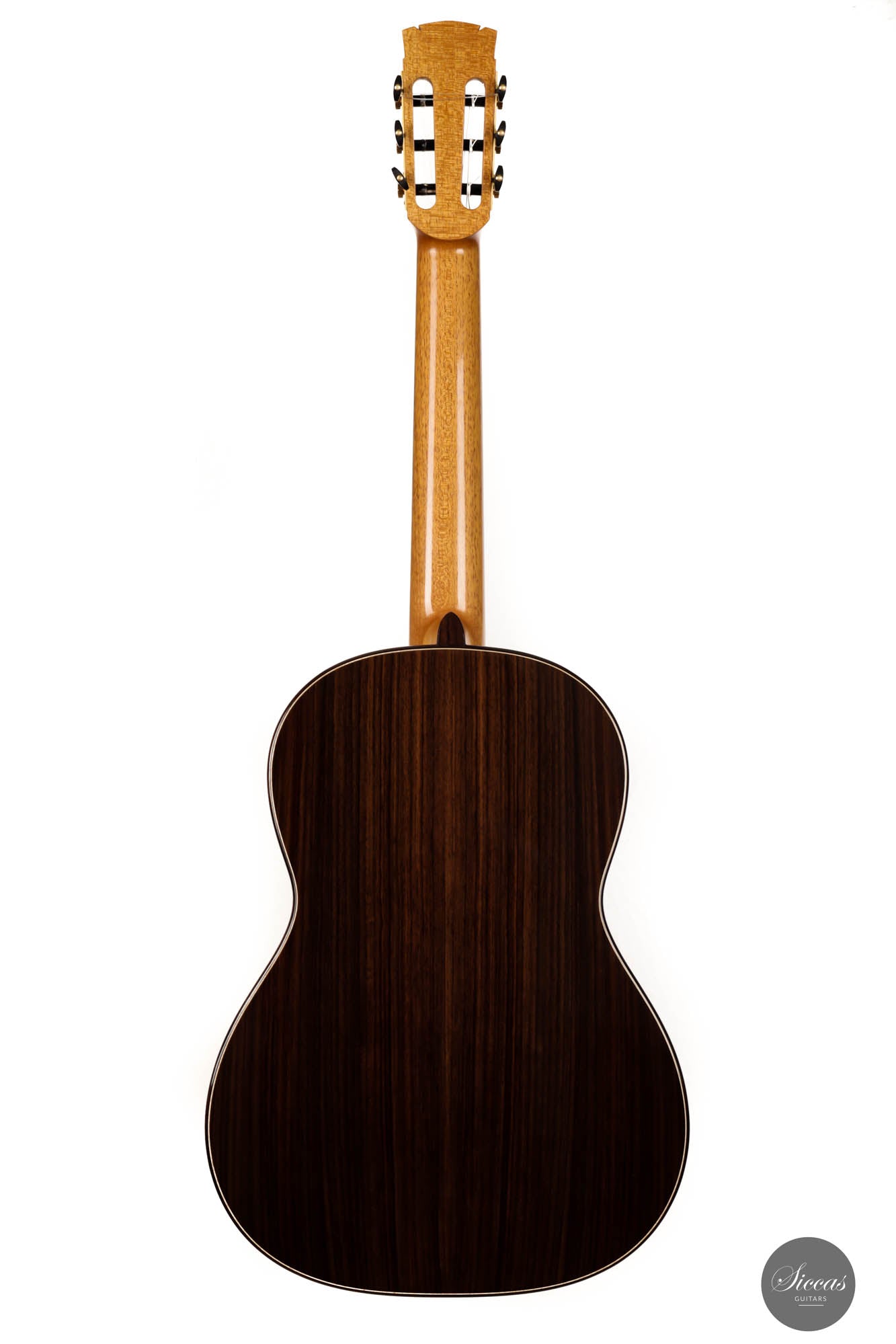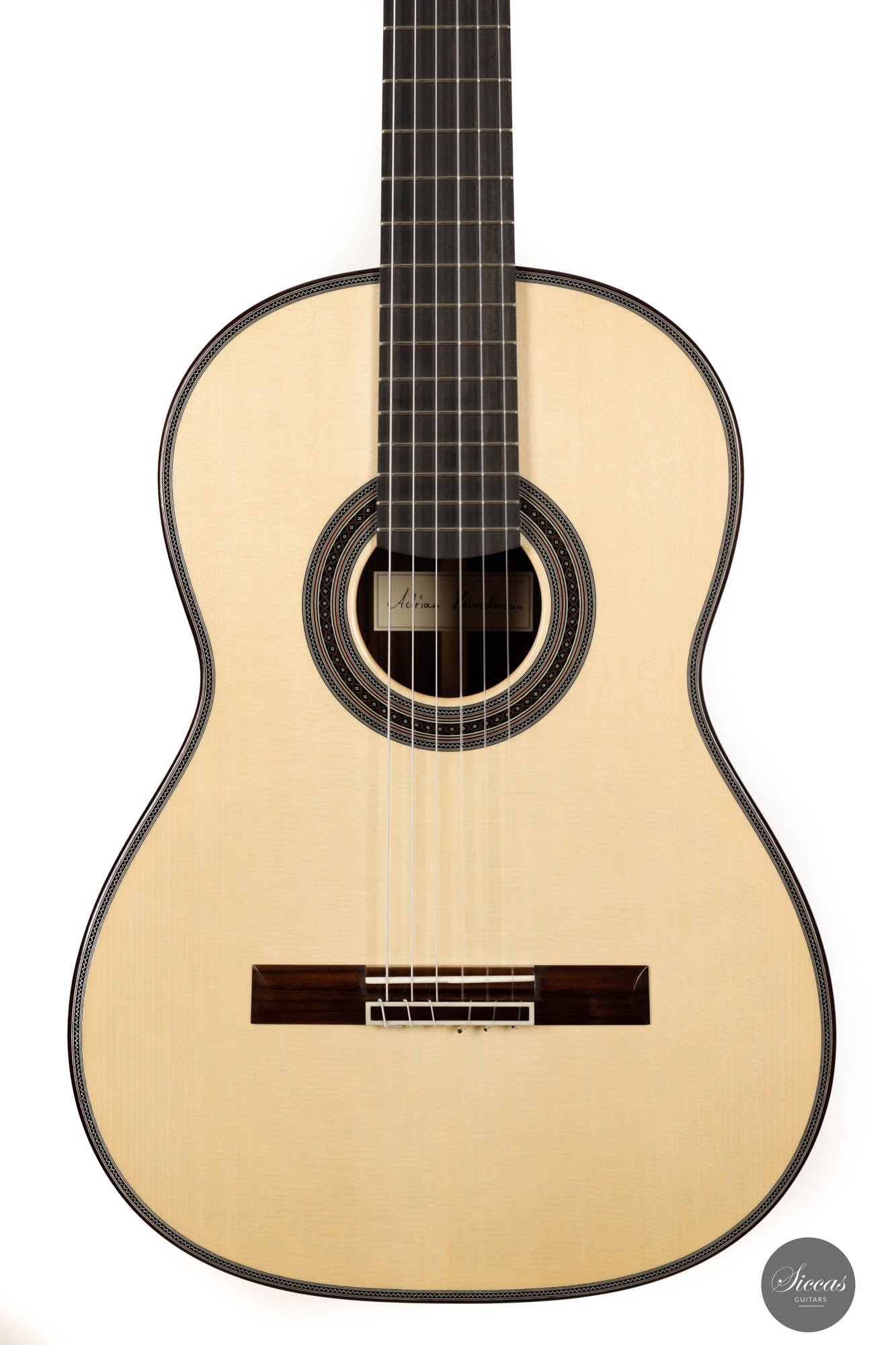 Adrian's guitar is a very versatile concert instrument of the highest grade. Every aspect of this guitar is simply impressive, both tonally and aesthetically. Great care was taken in the selection of the spruce top, as well as the choice of stunning Indian rosewood back and sides. Its craftsmanship perfectly reflects the luthier's outstanding skills as a craftsman. This fine instrument has direct voicings and exceptional balance throughout its voicings. Furthermore, it offers superb playability due to its excellent neck shape and quick response. As a result, it is a very comfortable instrument for a long practice session or demanding concert program.