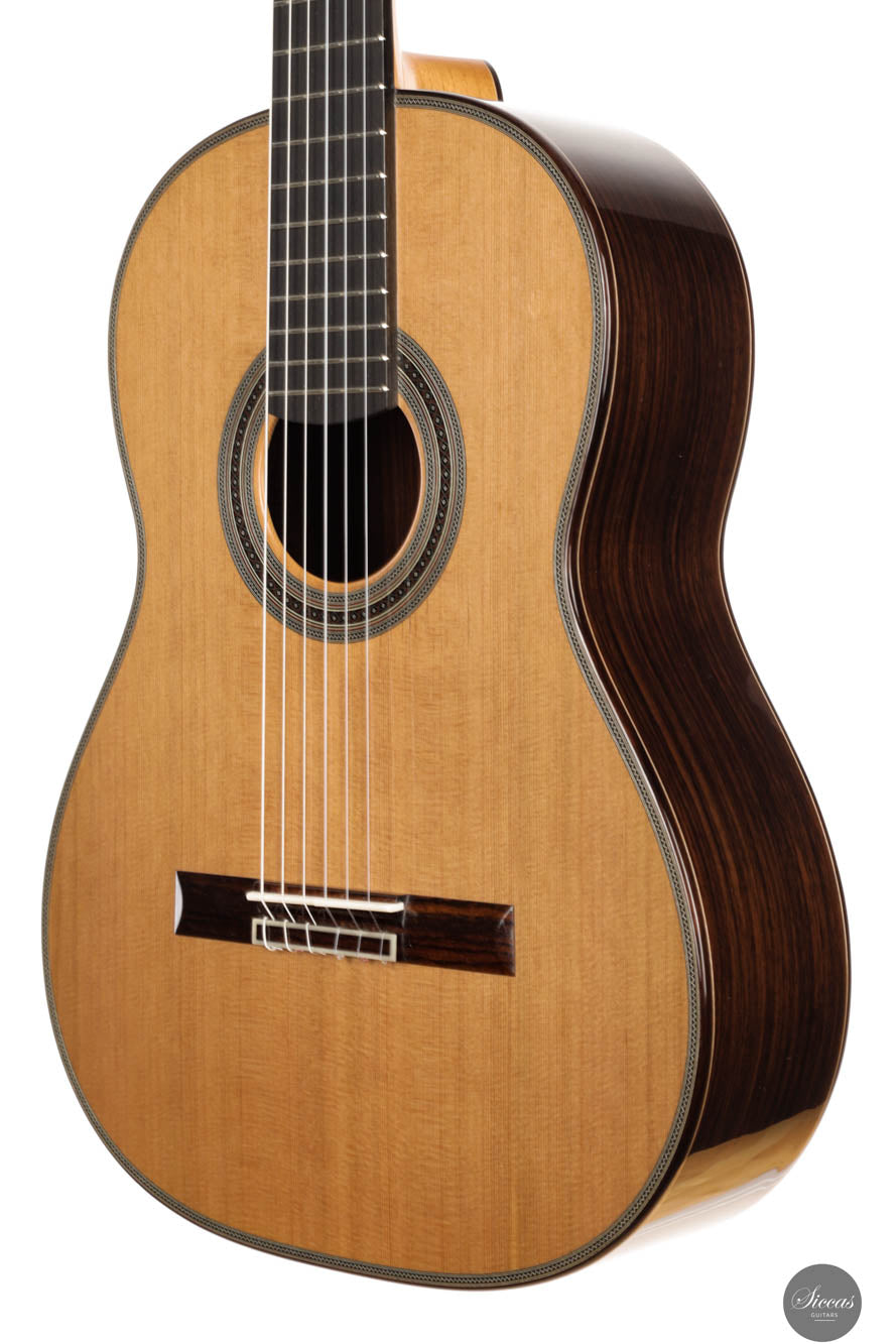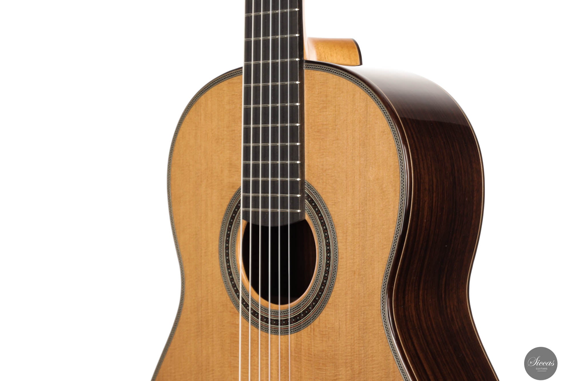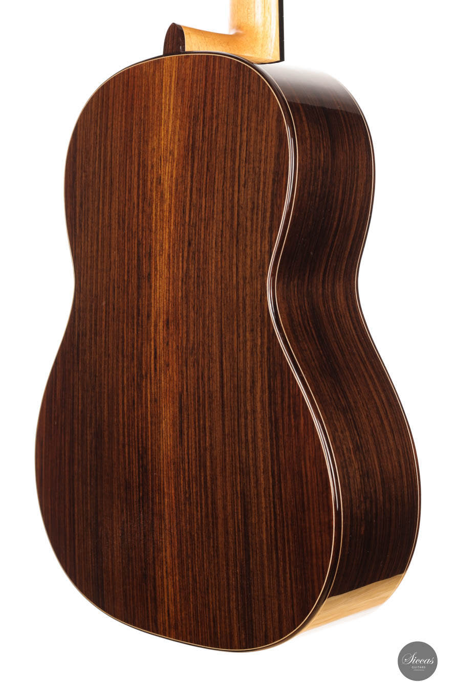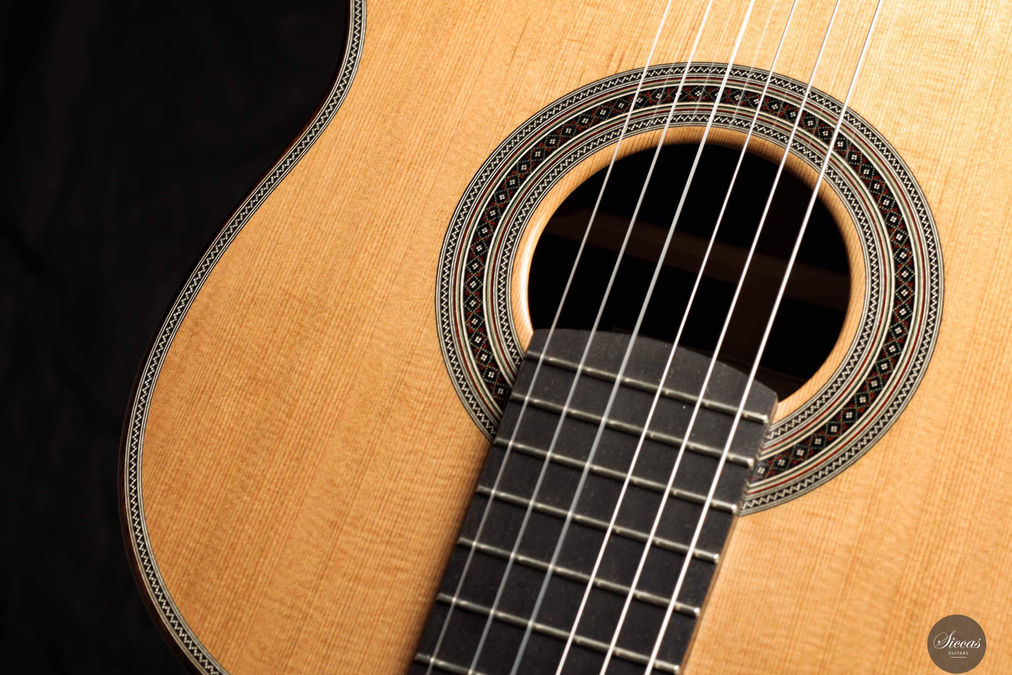 Adrian Heinzelmann is one of his generation’s most talented German luthiers. His guitars are of great finesse with an aesthetic that combines the Spanish tradition and the modernity for which German luthiers are universally recognized. His guitars are played by many brilliant teachers, soloists, and students and have already proven themselves in major European concert halls. His craftsmanship and the way Adrian Heinzelmann designs his soundboards are unique. Many narrow parallel trenches are carved inside the cedar soundboard to optimize its weight and flexibility. Combined with lightweight lattice bracing, this technique gives an instrument of great sensitivity and impressive volume. Playing Adrian Heinzelmann’s guitar gives confidence and pushes the guitarist beyond his limits.