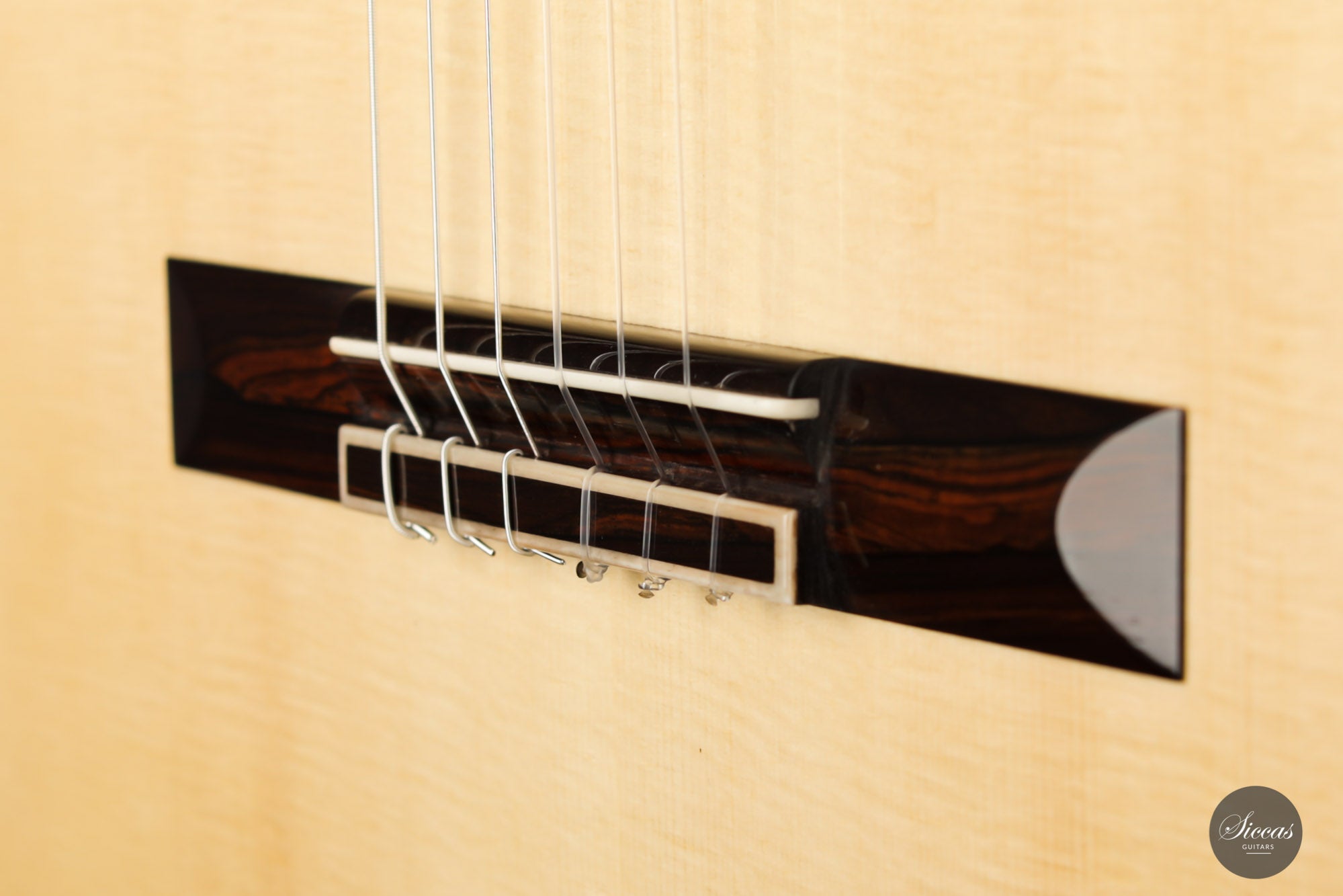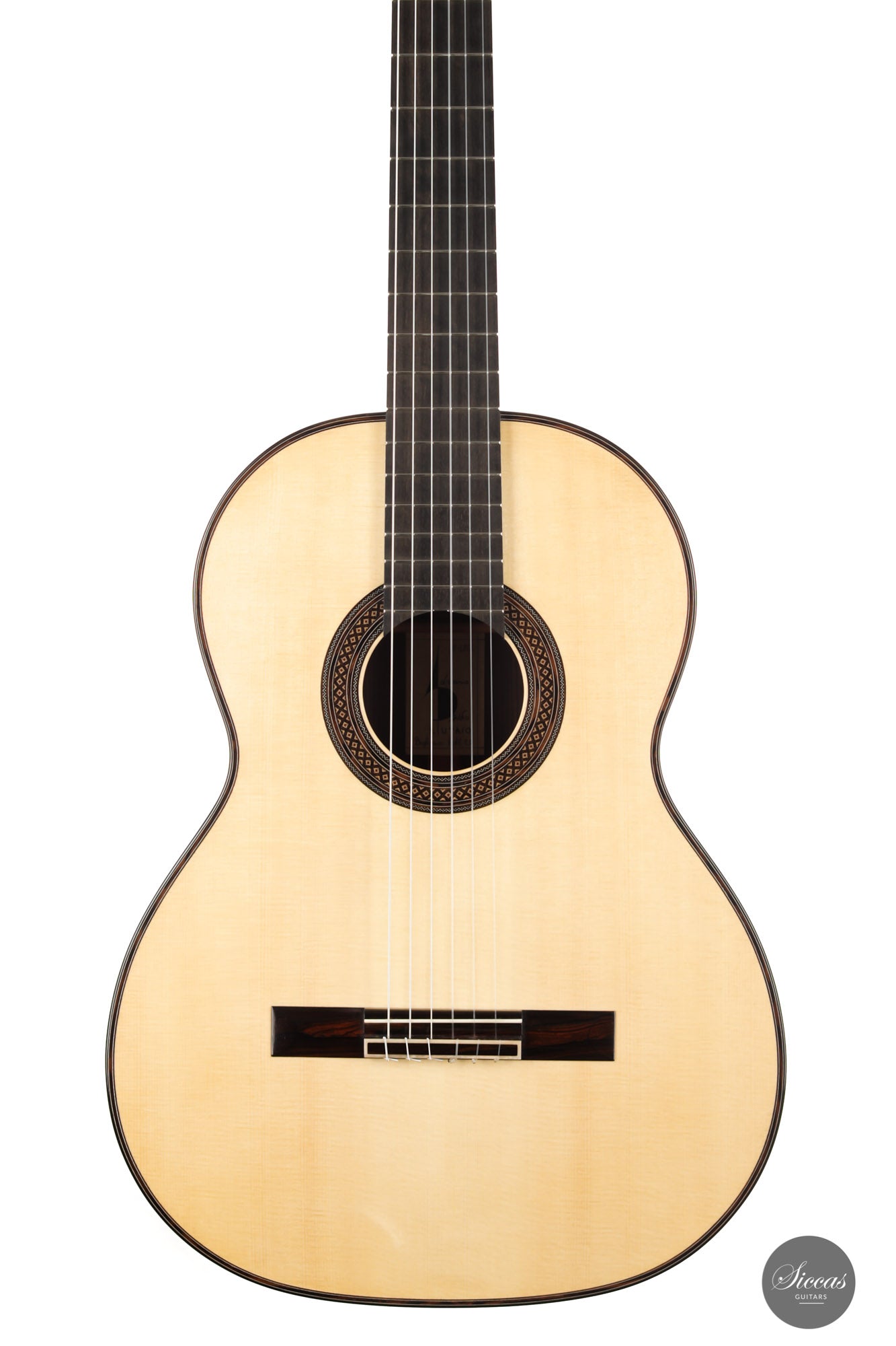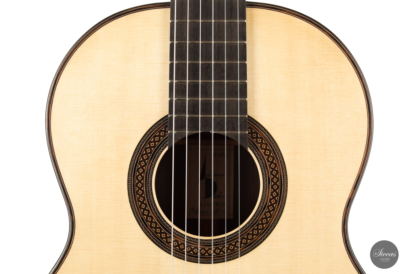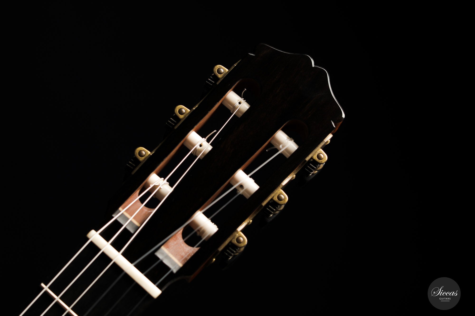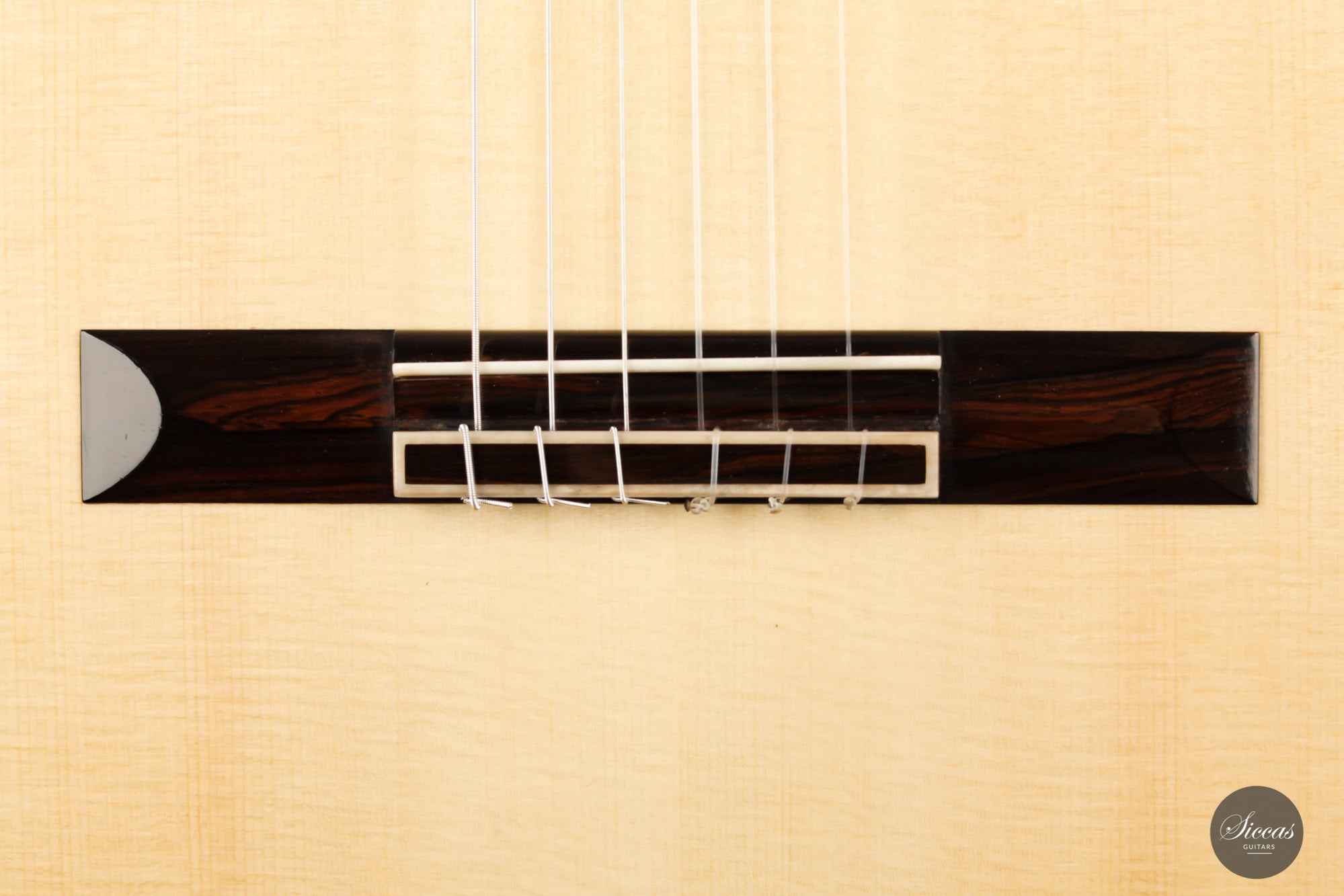 This guitar has qualities that are highly desirable in a quality classical guitar. The trebles are pristine with a glassy sound that projects with a full richness. Smooth, airy basses perfectly complement the singing trebles. When played, one senses a responsive, lightweight guitar that reacts quickly to the guitarist's touch. The beautifully carved headstock is obviously inspired by Santos Hernandez and also from a tonal point of view, this elegant Italian guitar shows parallels to instruments made by Santos Hernandez . This brand new guitar has a certain airiness that can also be found in earlier Spanish master guitars.