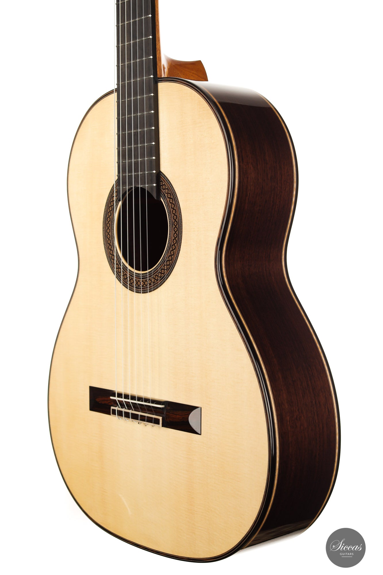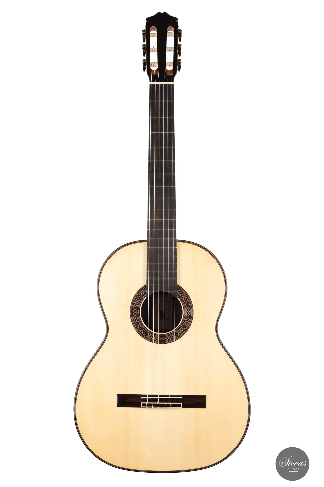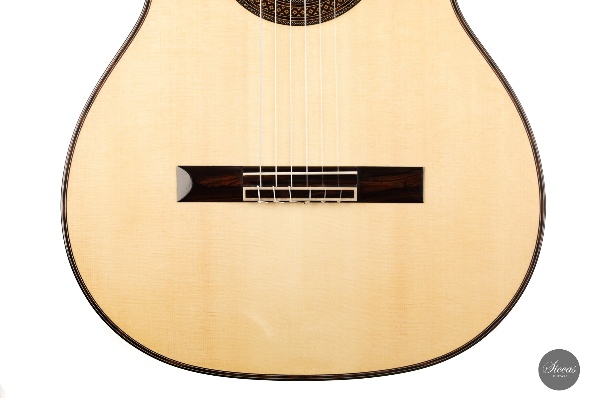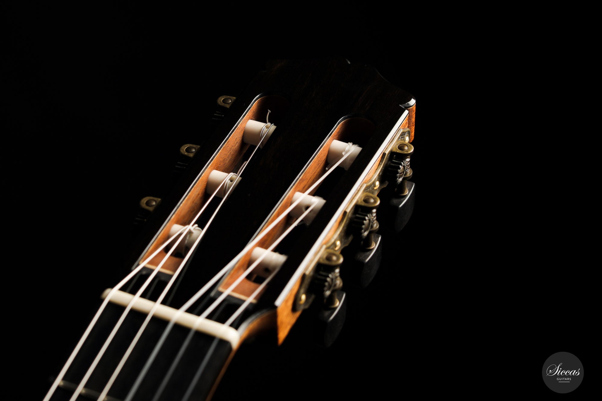 This guitar has qualities that are highly desirable in a quality classical guitar. The trebles are pristine with a glassy sound that projects with a full richness. Smooth, airy basses perfectly complement the singing trebles. When played, one senses a responsive, lightweight guitar that reacts quickly to the guitarist's touch. The beautifully carved headstock is obviously inspired by Santos Hernandez and also from a tonal point of view, this elegant Italian guitar shows parallels to instruments made by Santos Hernandez . This brand new guitar has a certain airiness that can also be found in earlier Spanish master guitars.