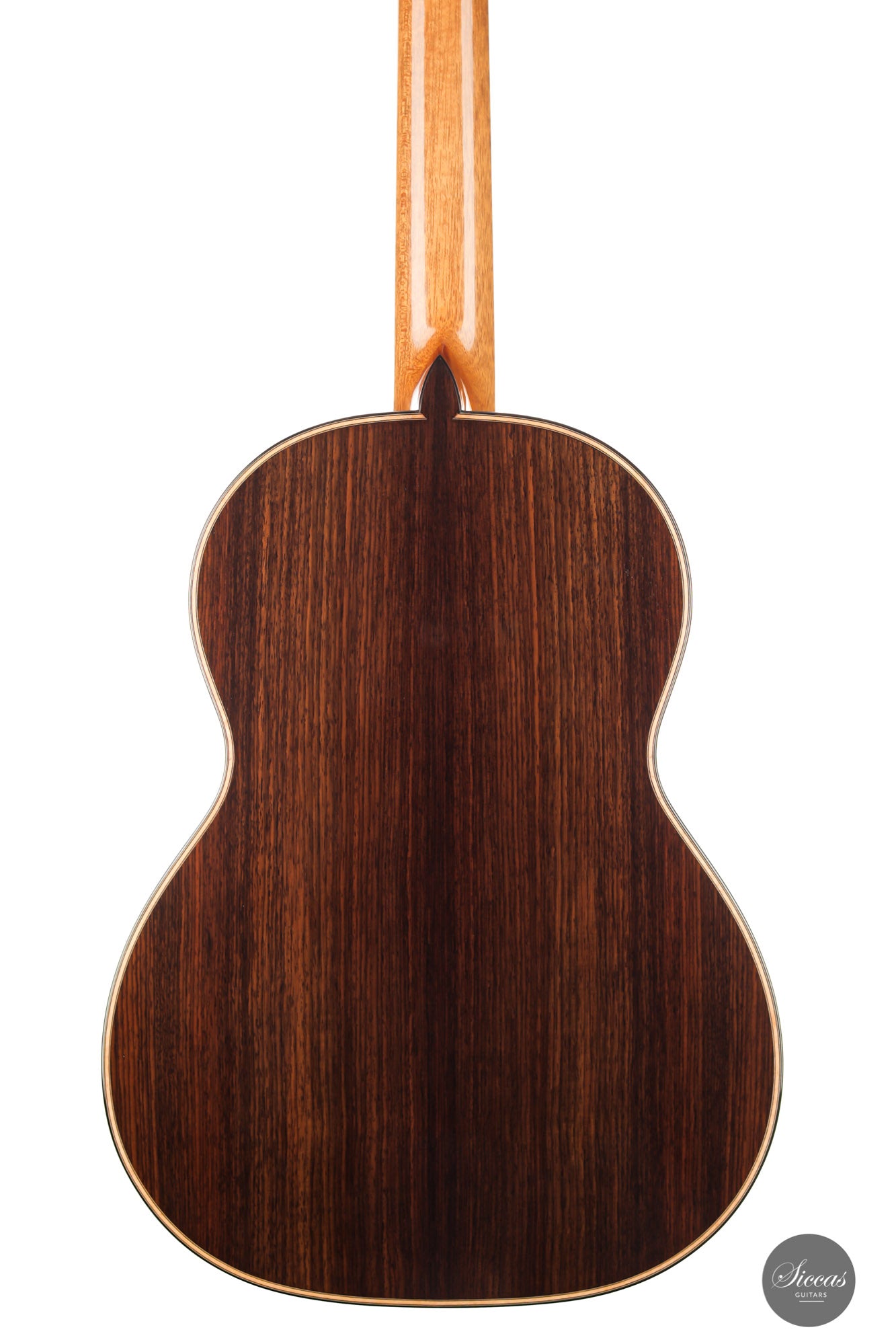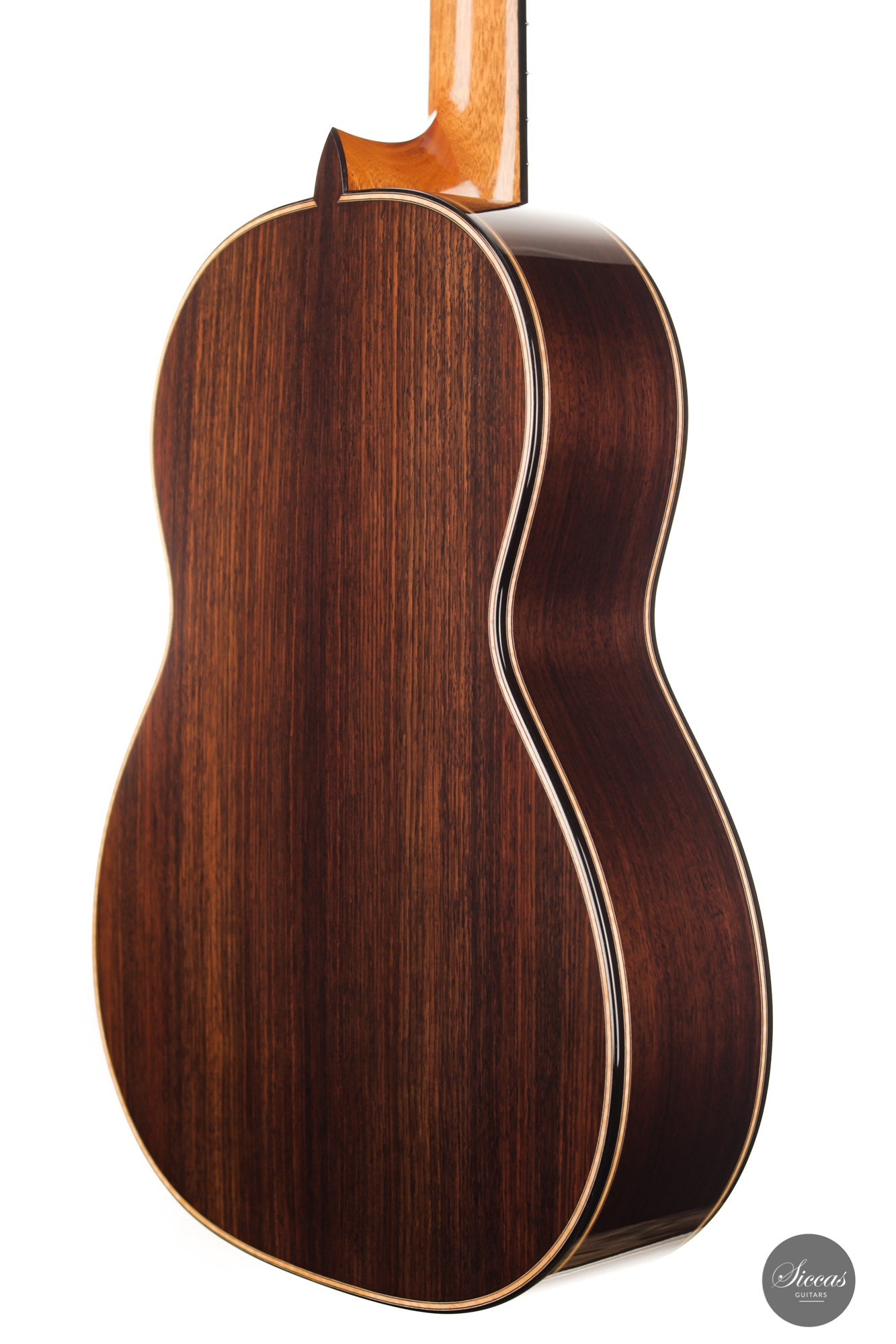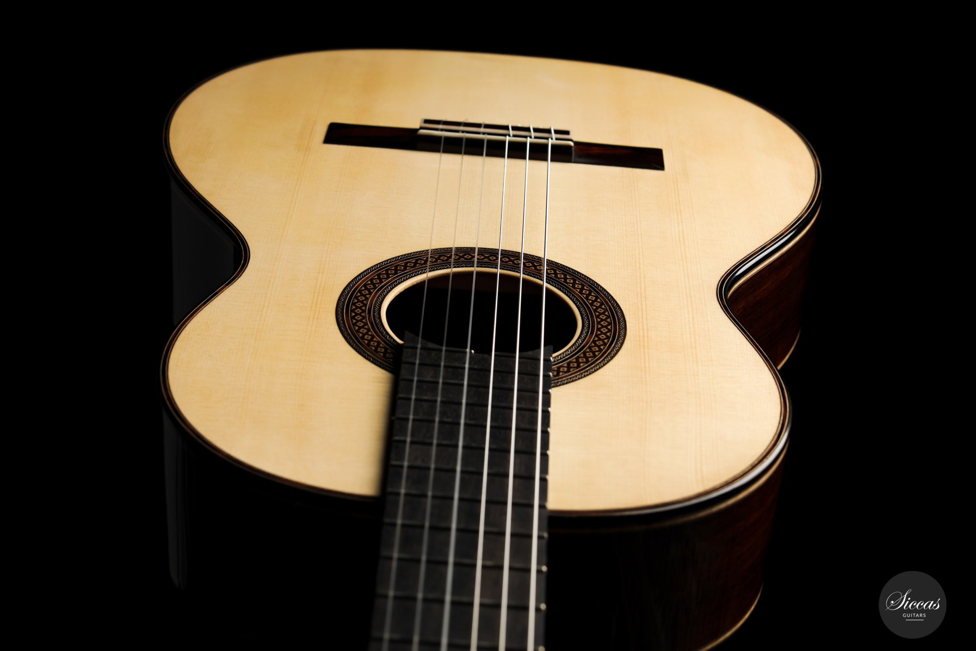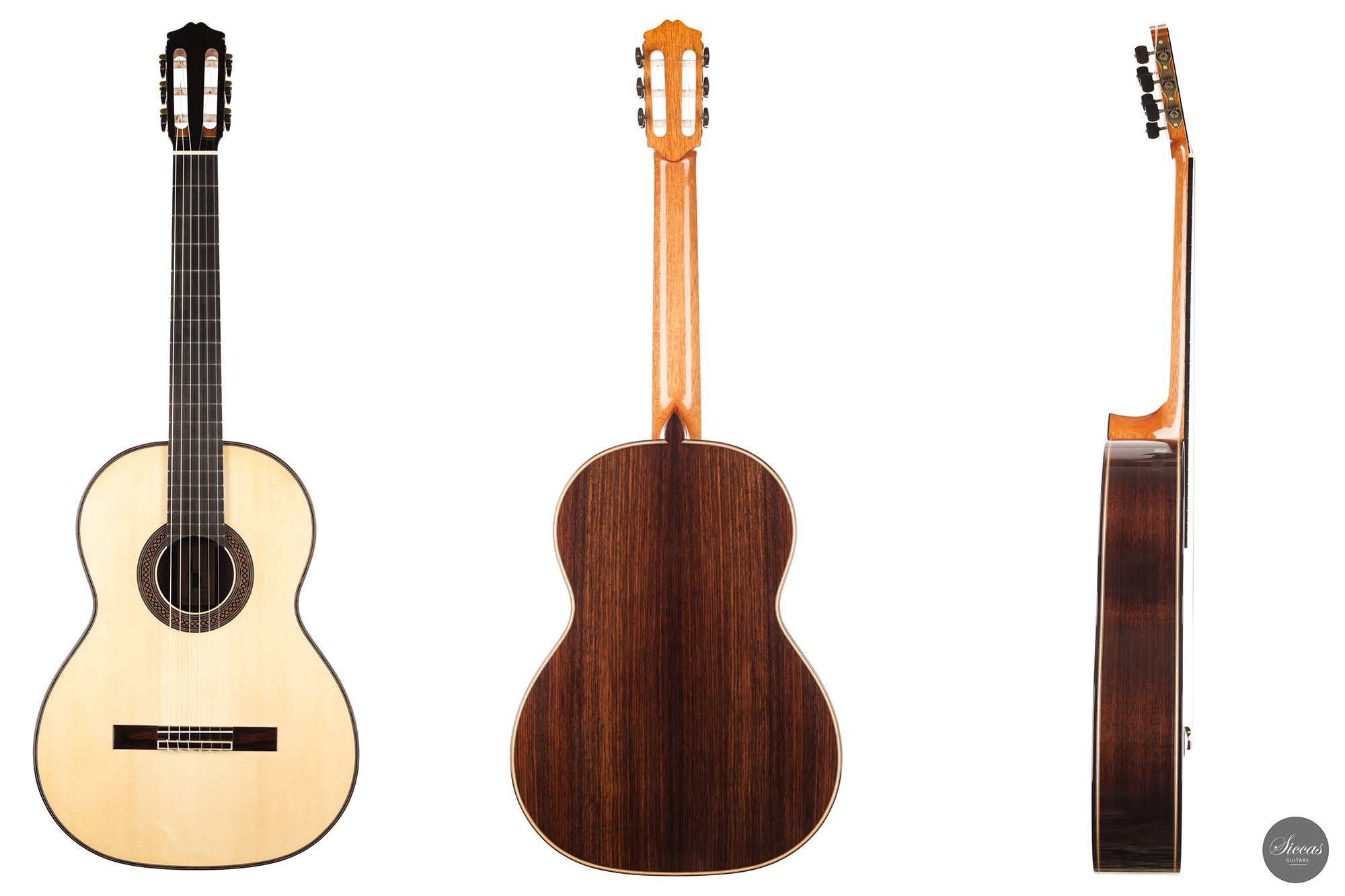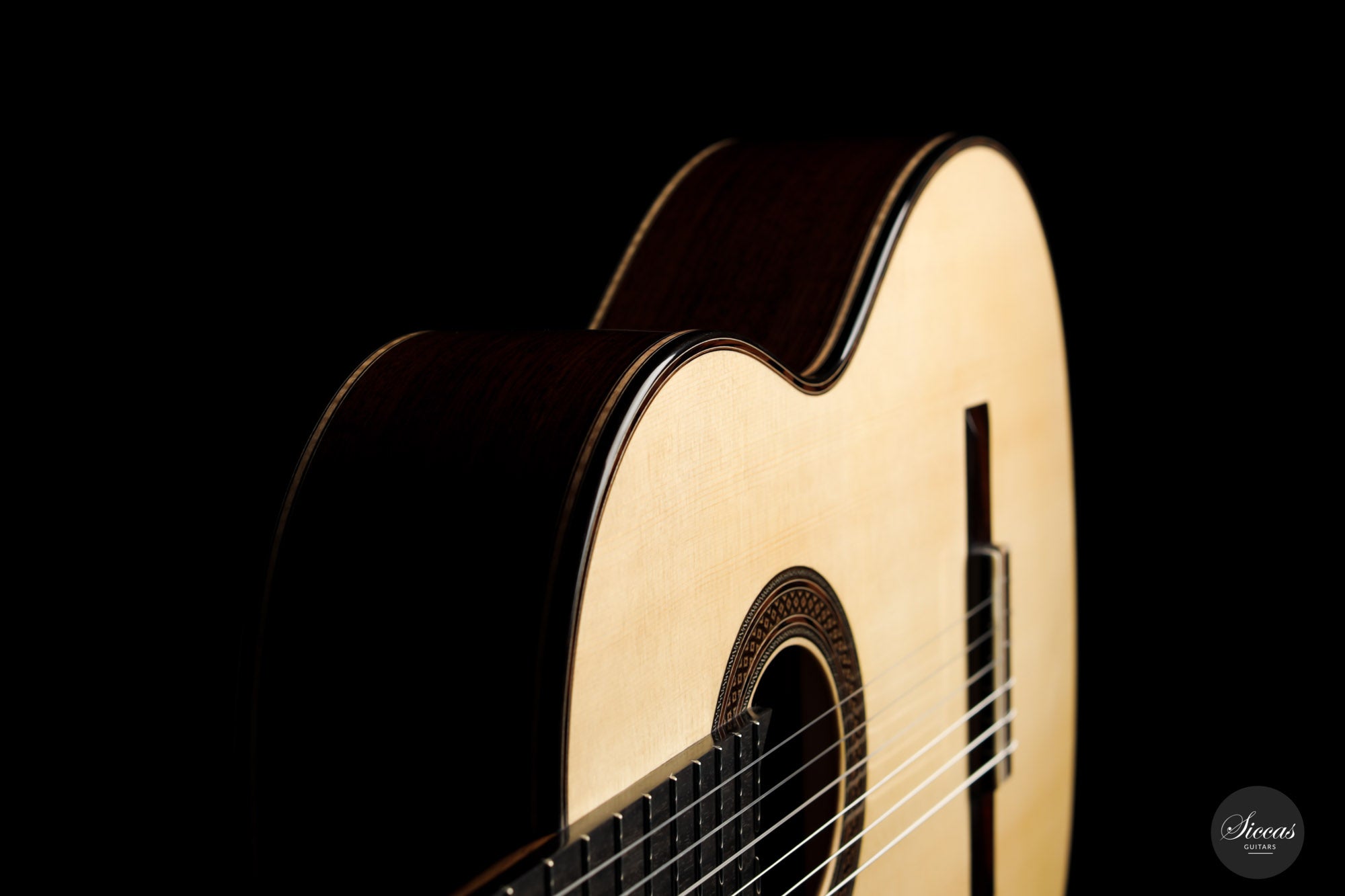 This guitar has qualities that are highly desirable in a quality classical guitar. The trebles are pristine with a glassy sound that projects with a full richness. Smooth, airy basses perfectly complement the singing trebles. When played, one senses a responsive, lightweight guitar that reacts quickly to the guitarist's touch. The beautifully carved headstock is obviously inspired by Santos Hernandez and also from a tonal point of view, this elegant Italian guitar shows parallels to instruments made by Santos Hernandez . This brand new guitar has a certain airiness that can also be found in earlier Spanish master guitars.