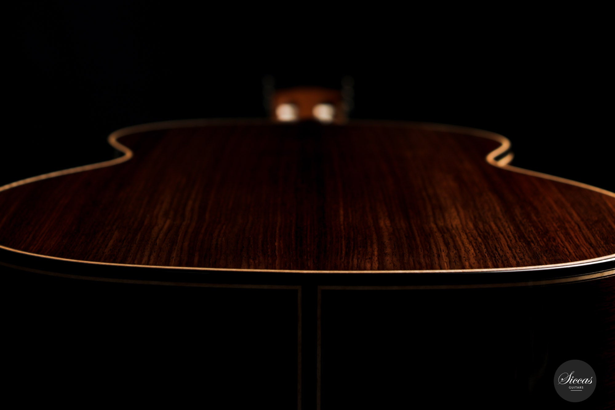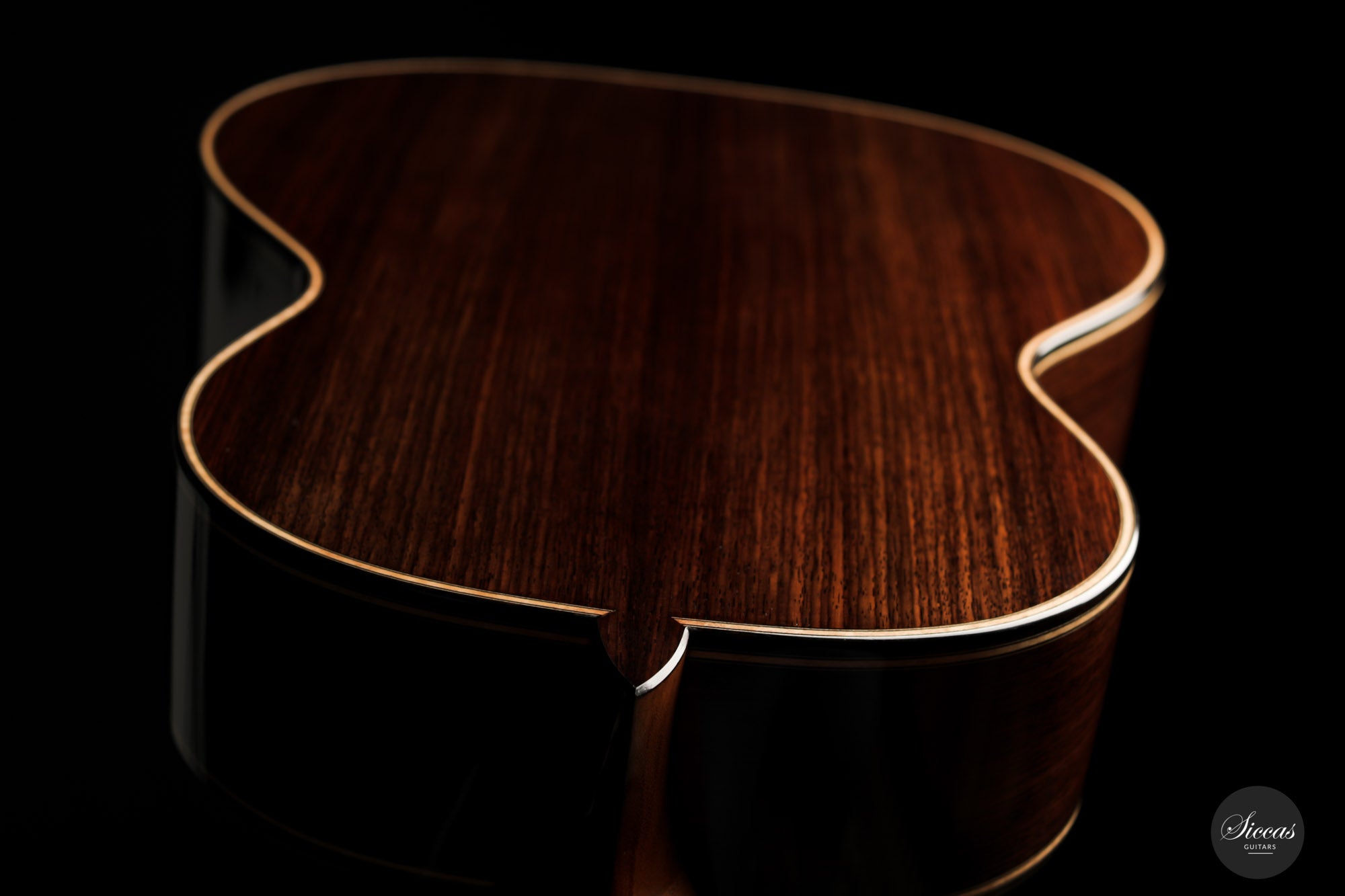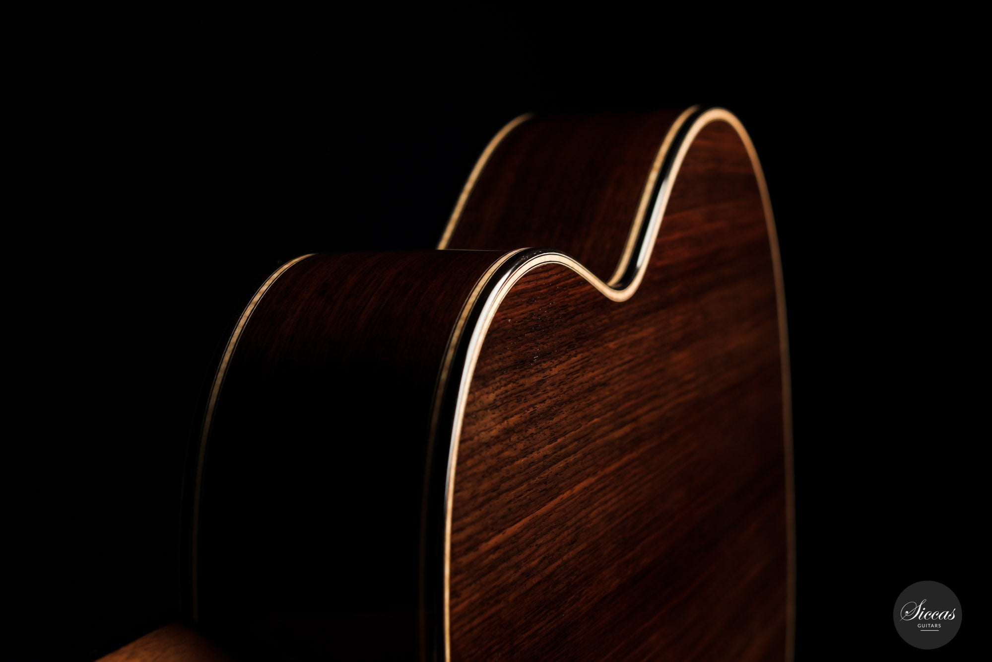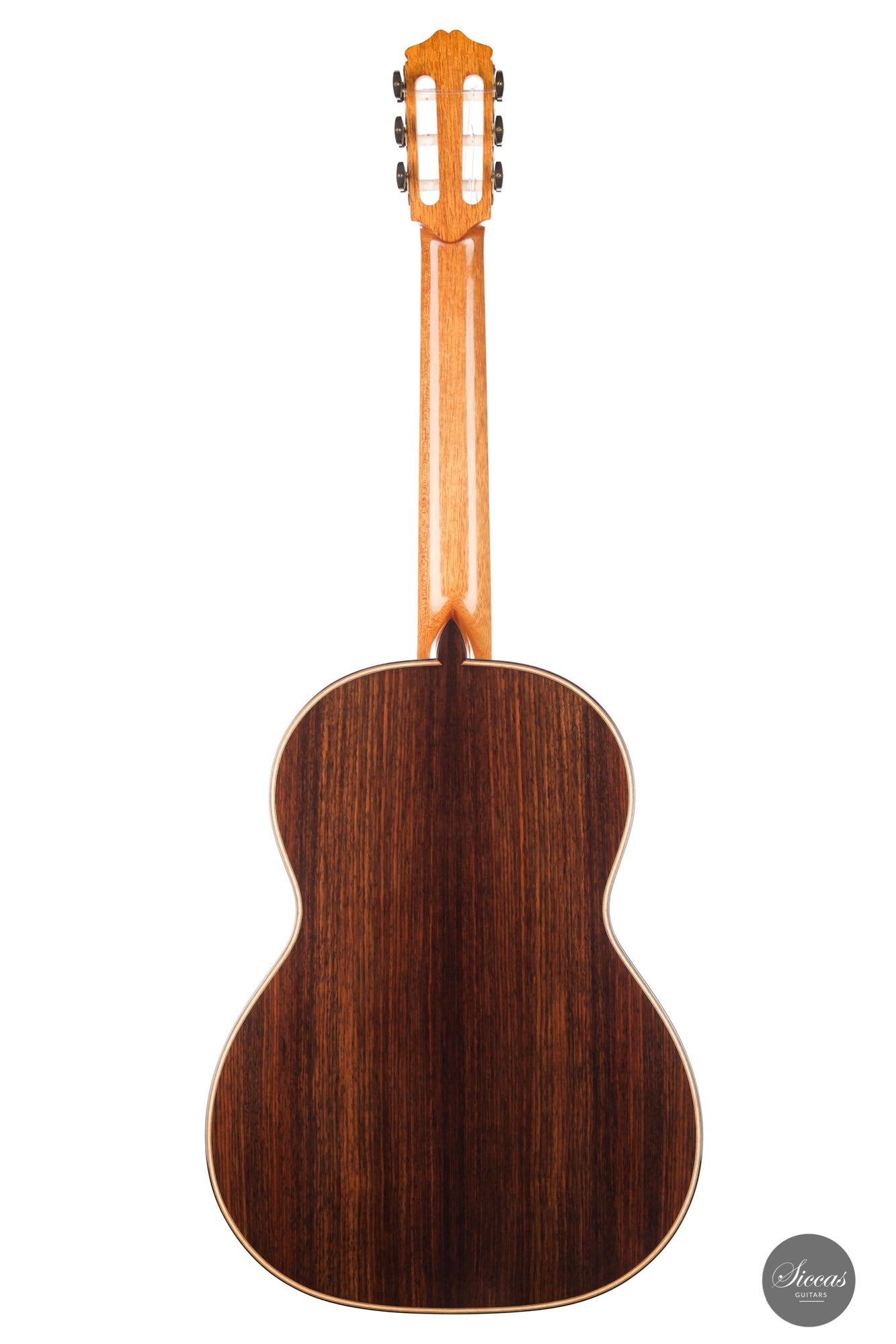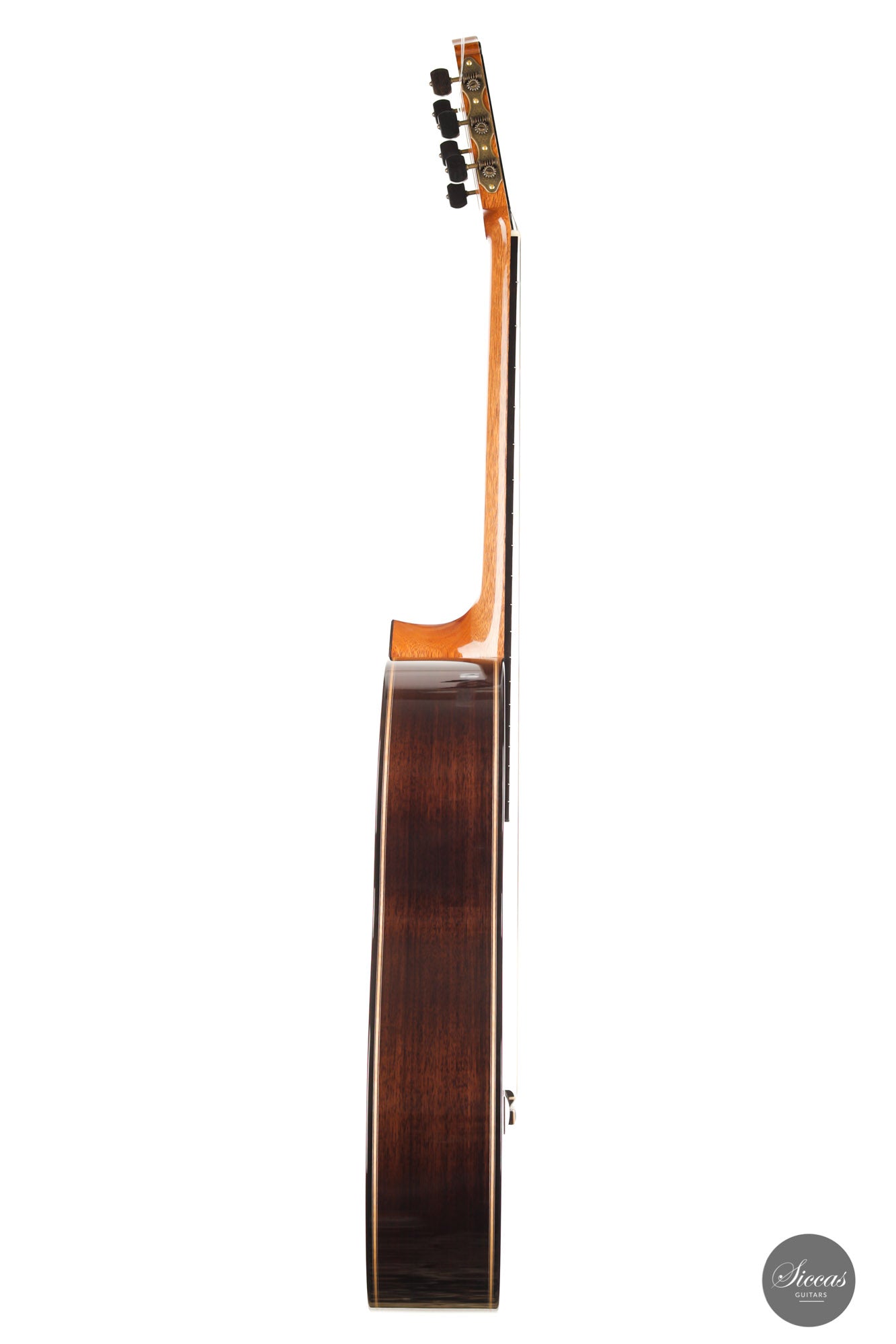 This guitar has qualities that are highly desirable in a quality classical guitar. The trebles are pristine with a glassy sound that projects with a full richness. Smooth, airy basses perfectly complement the singing trebles. When played, one senses a responsive, lightweight guitar that reacts quickly to the guitarist's touch. The beautifully carved headstock is obviously inspired by Santos Hernandez and also from a tonal point of view, this elegant Italian guitar shows parallels to instruments made by Santos Hernandez . This brand new guitar has a certain airiness that can also be found in earlier Spanish master guitars.