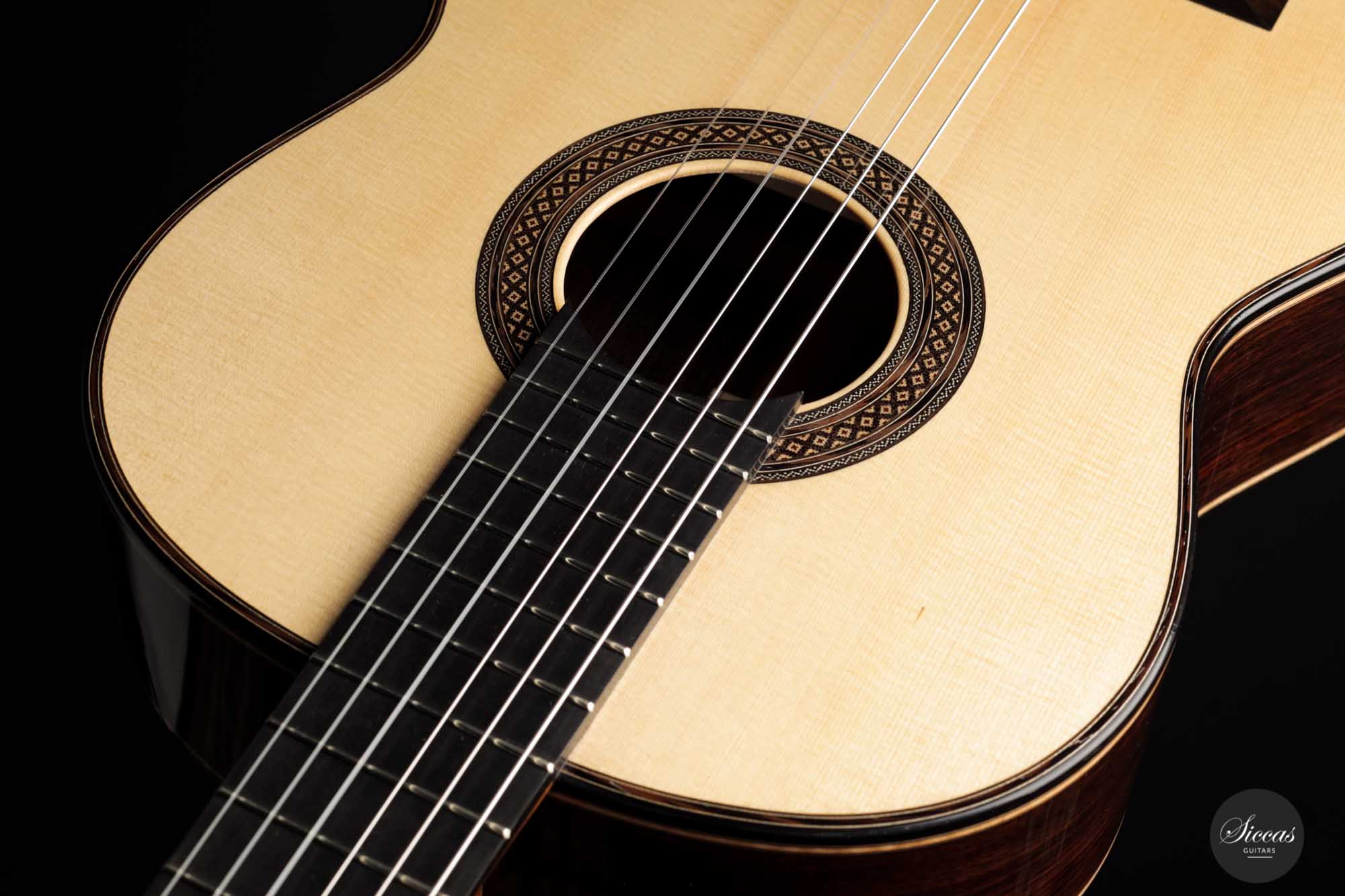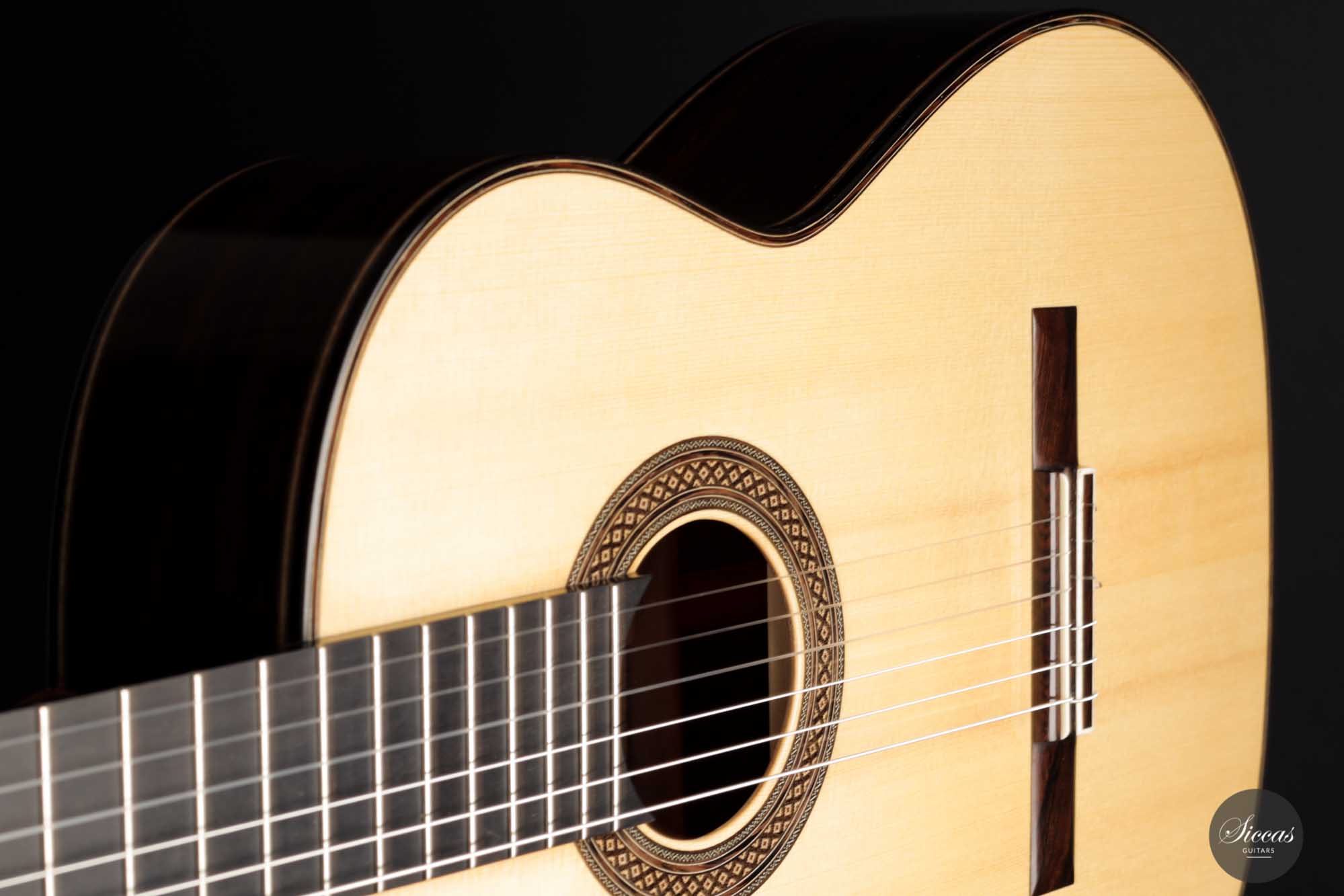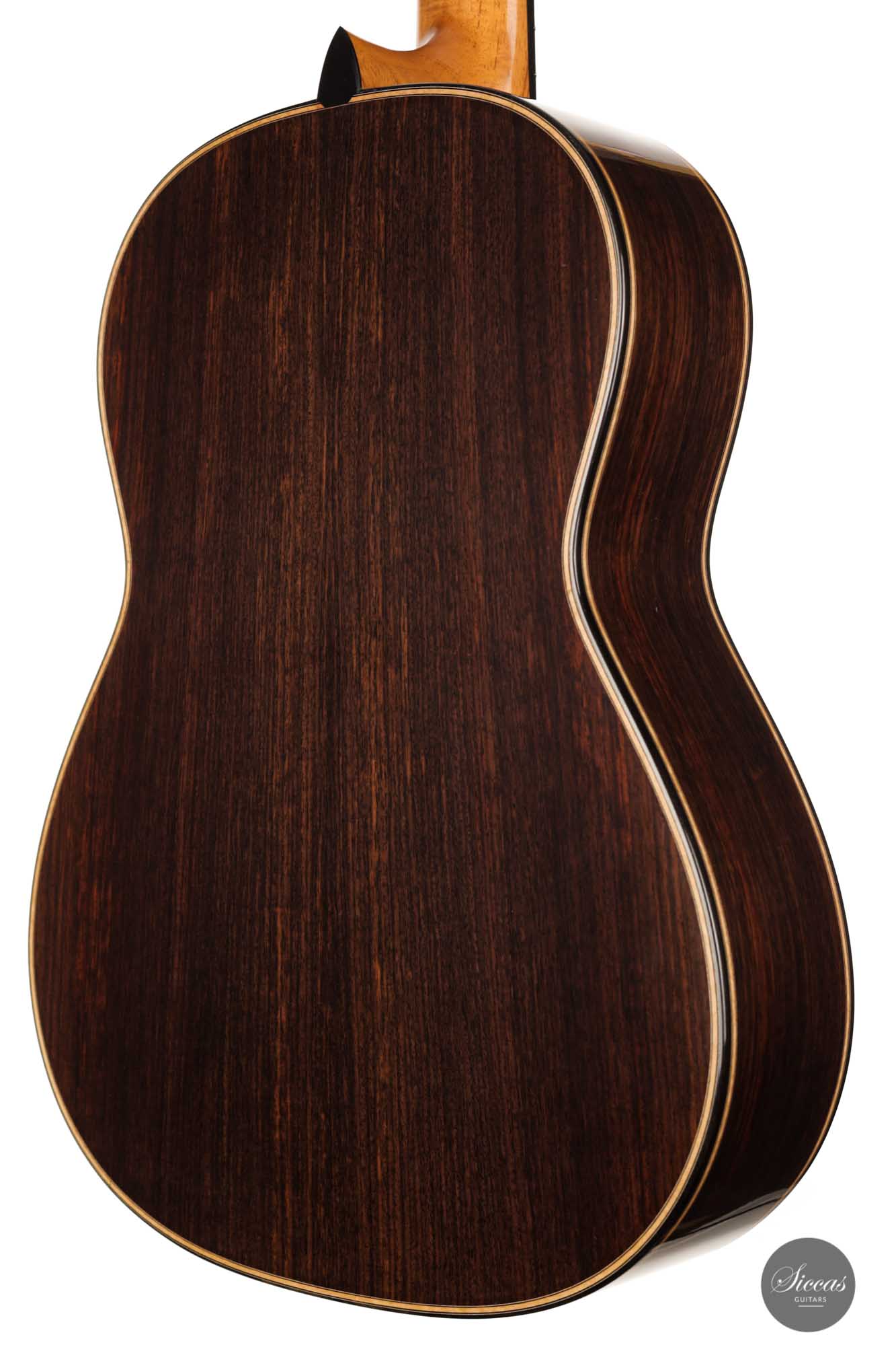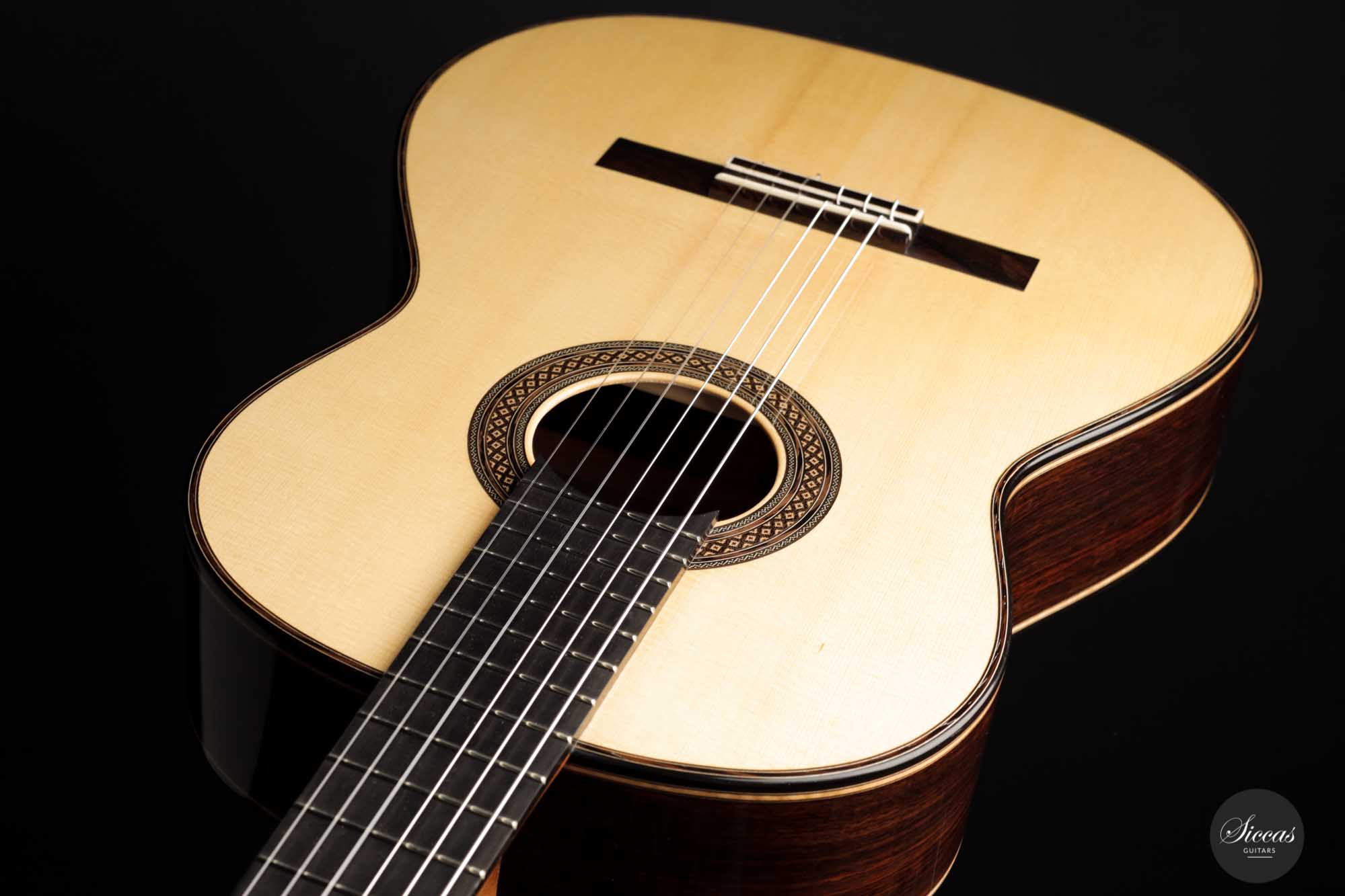 It has immaculate trebles with a glassy sound that projects with a full richness. Smooth, airy basses perfectly complement the singing trebles. When played, one senses a responsive, lightweight guitar that reacts quickly to the guitarist's touch. The beautifully carved headstock is obviously inspired by Santos Hernandez, and also, from a tonal point of view, this elegant Italian guitar shows parallels to instruments made by Santos Hernandez.