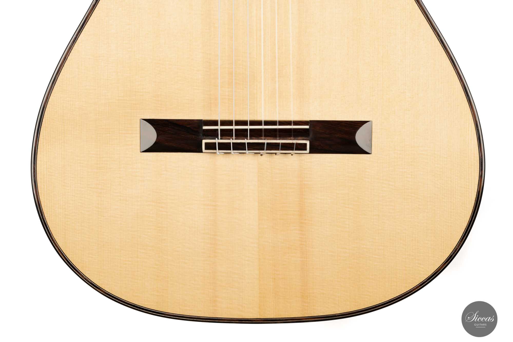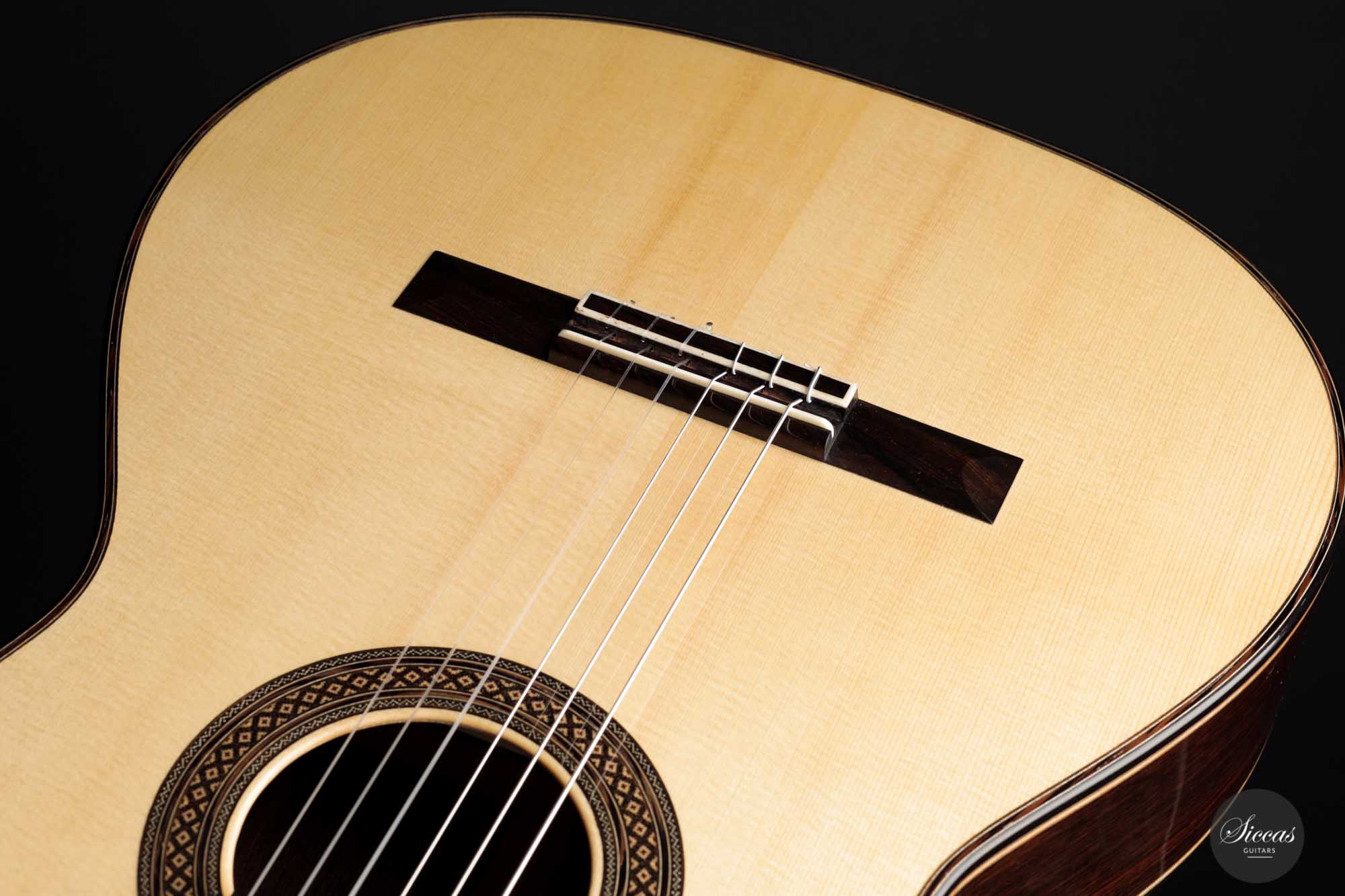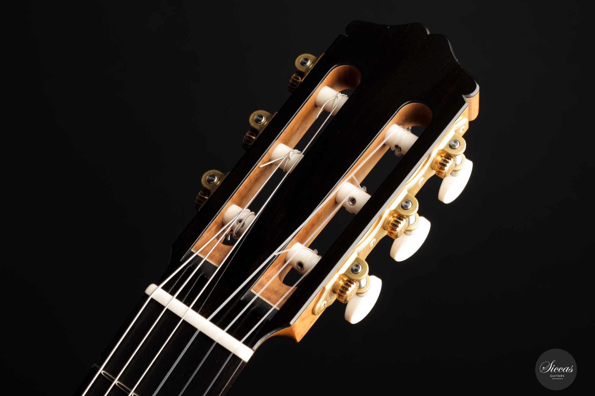 It has immaculate trebles with a glassy sound that projects with a full richness. Smooth, airy basses perfectly complement the singing trebles. When played, one senses a responsive, lightweight guitar that reacts quickly to the guitarist's touch. The beautifully carved headstock is obviously inspired by Santos Hernandez, and also, from a tonal point of view, this elegant Italian guitar shows parallels to instruments made by Santos Hernandez.