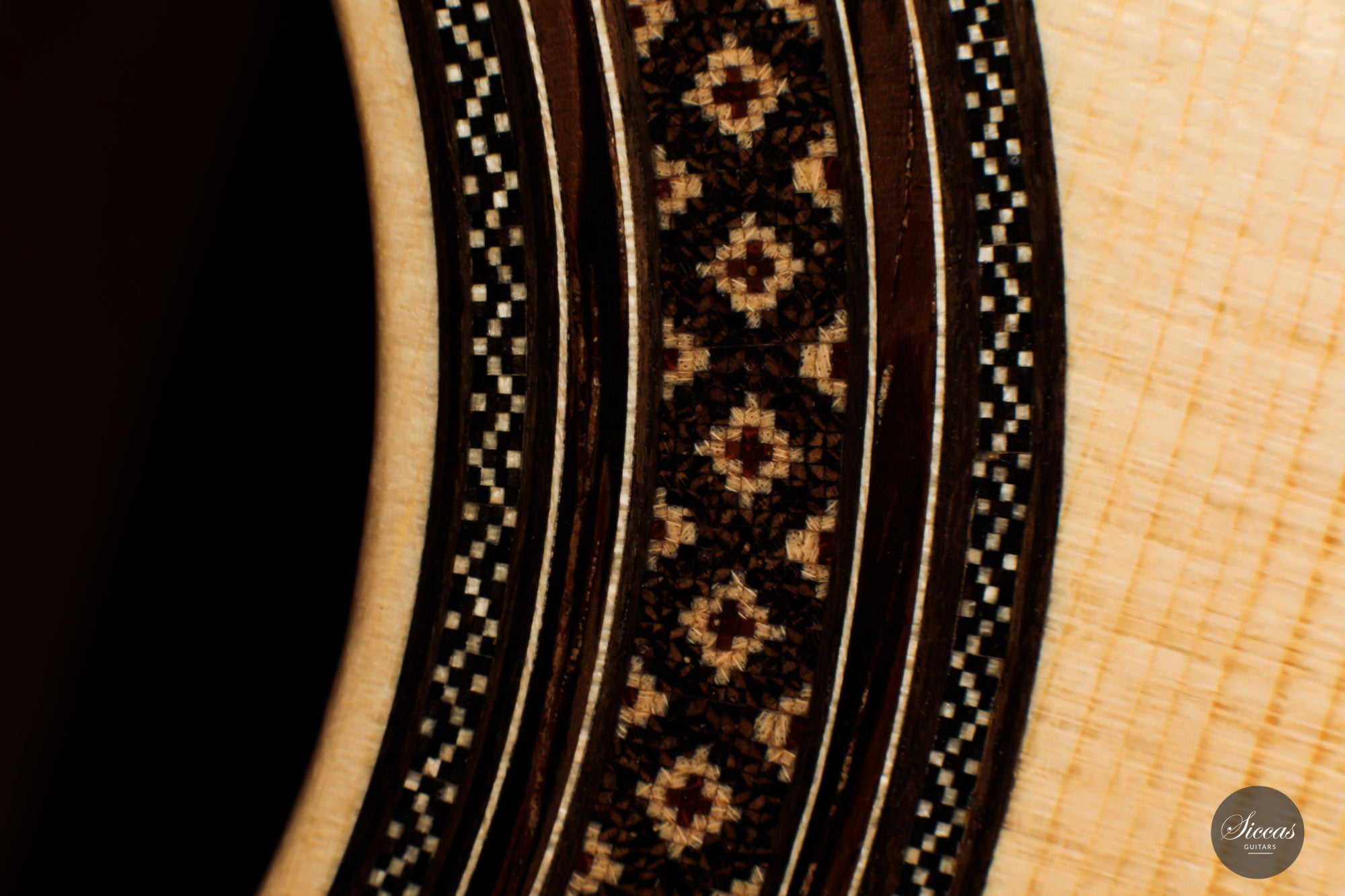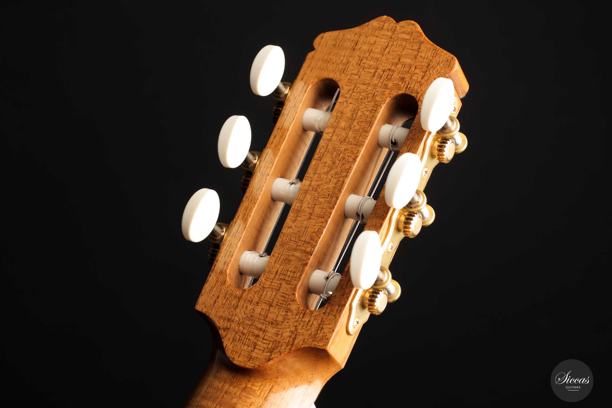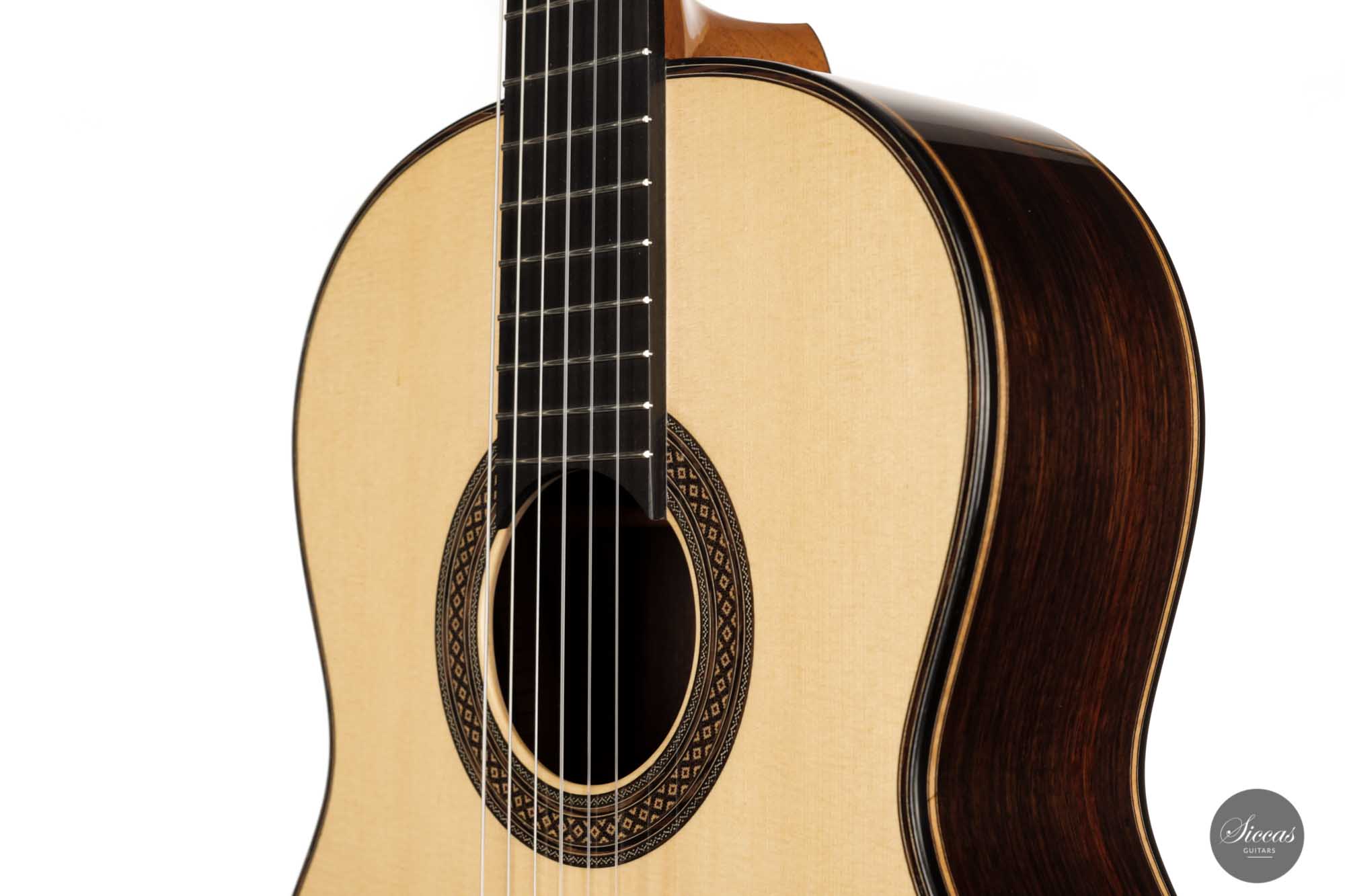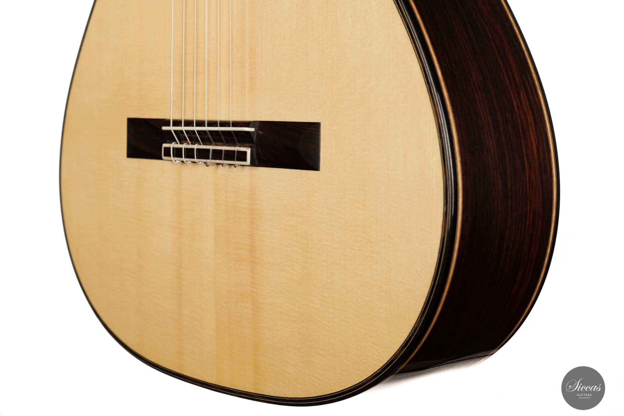 It has immaculate trebles with a glassy sound that projects with a full richness. Smooth, airy basses perfectly complement the singing trebles. When played, one senses a responsive, lightweight guitar that reacts quickly to the guitarist's touch. The beautifully carved headstock is obviously inspired by Santos Hernandez, and also, from a tonal point of view, this elegant Italian guitar shows parallels to instruments made by Santos Hernandez.