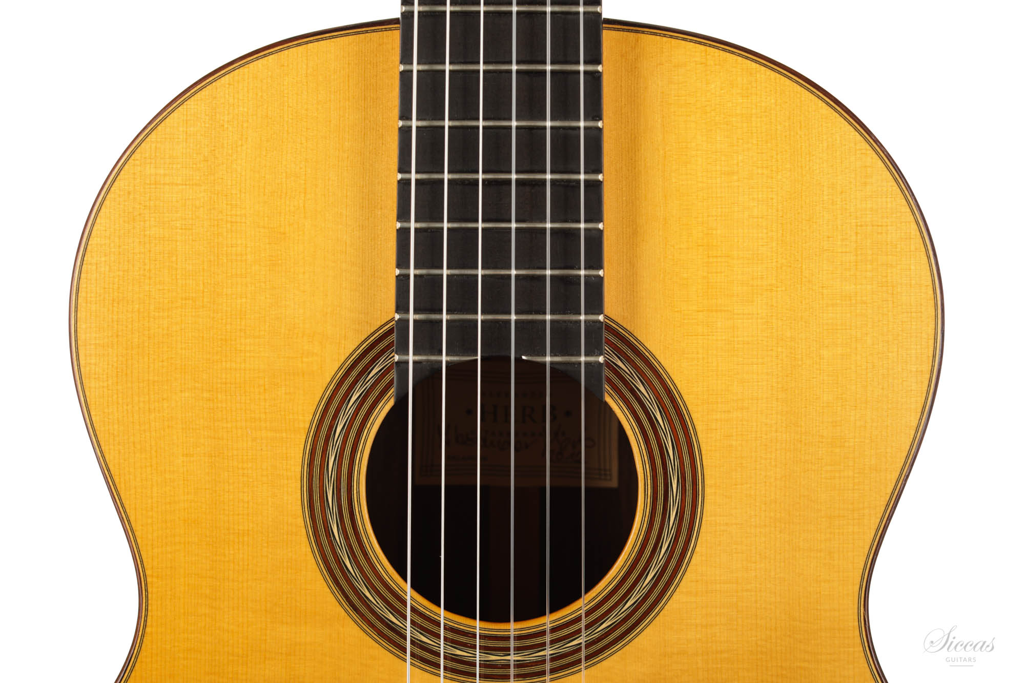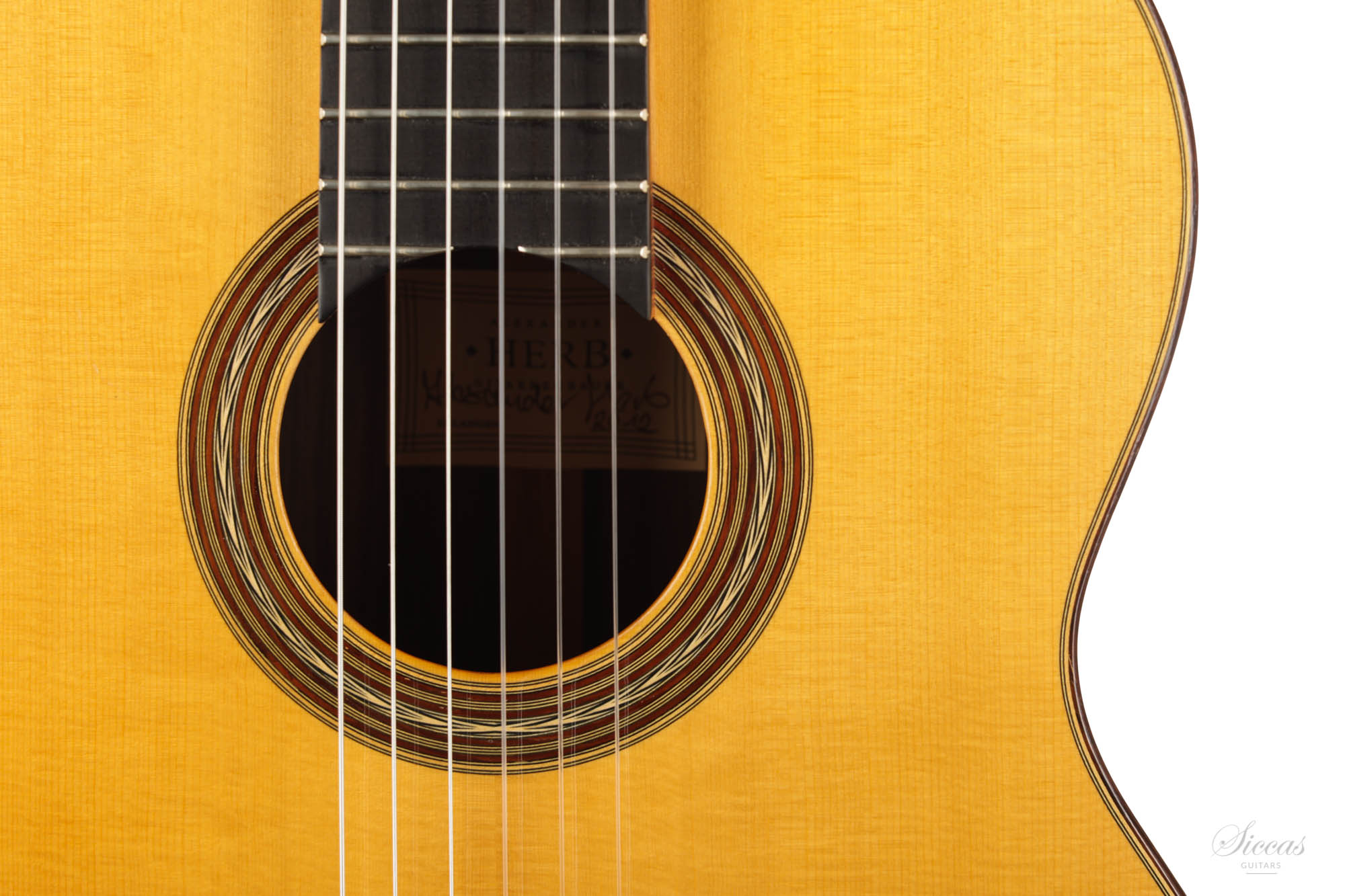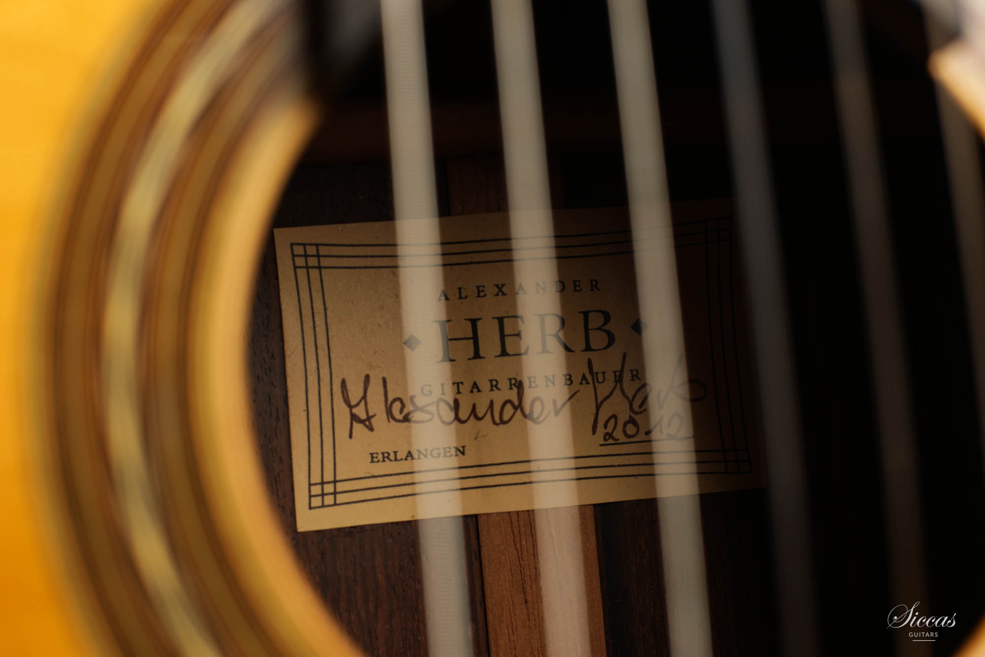 This instrument made by Alexander Herb is a great concert guitar with a powerful voice, the core of the tone is very profound. Clear and vibrant trebles paired with excellent bass response makes for an inspiring guitar to play on. It is very easy to play and you get the feeling that you do not need to work hard to produce a beautiful sound. During further investigation the guitar has one repaired crack under the bridge that is repaired professionally and it is perfectly stable.