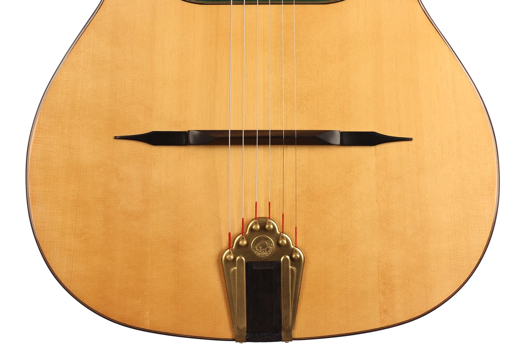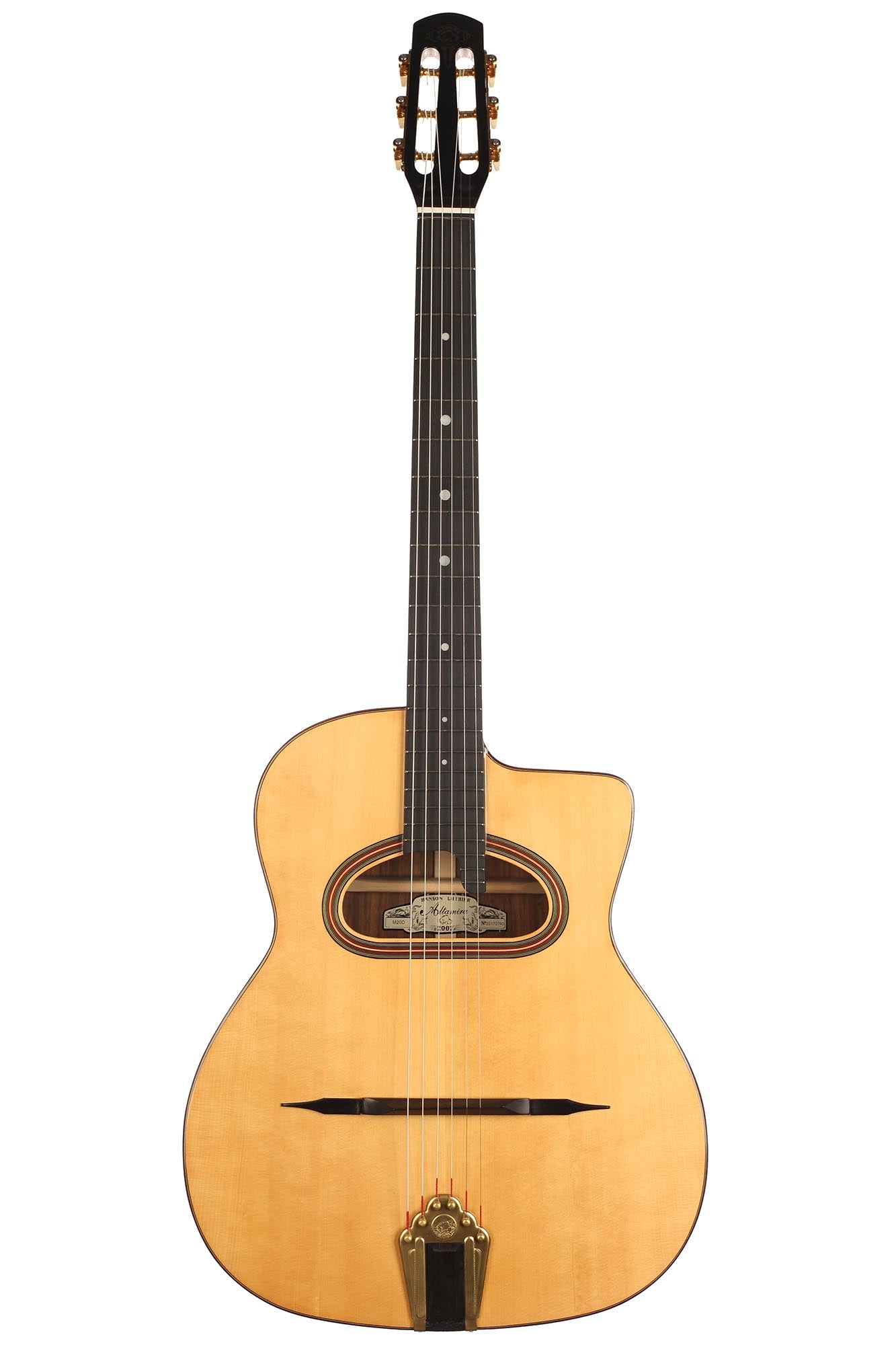 The "M" stands for the initials of the legendary guitar maker Mario Maccaferri, who developed this type of guitar and built it in collaboration with the French manufacturer Selmer from 1932 to about 1952. Although Maccaferri's collaboration with Selmer ended in 1934, the company continued to produce several models of this guitar until 1952. It was Django Reinhard who made the Selmer Maccaferri guitars popular and his playing style. Thus, the Selmer Maccaferri model with its relatively large body and either oval "Petite Bouche" or D-shaped "Grande Bouche" sound hole is an indispensable element for any guitarist who wants to explore the inspiring and fascinating repertoire of Gypsy Jazz.