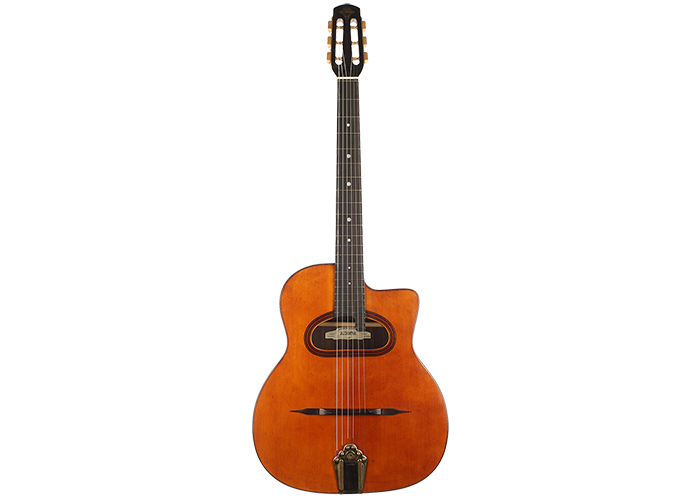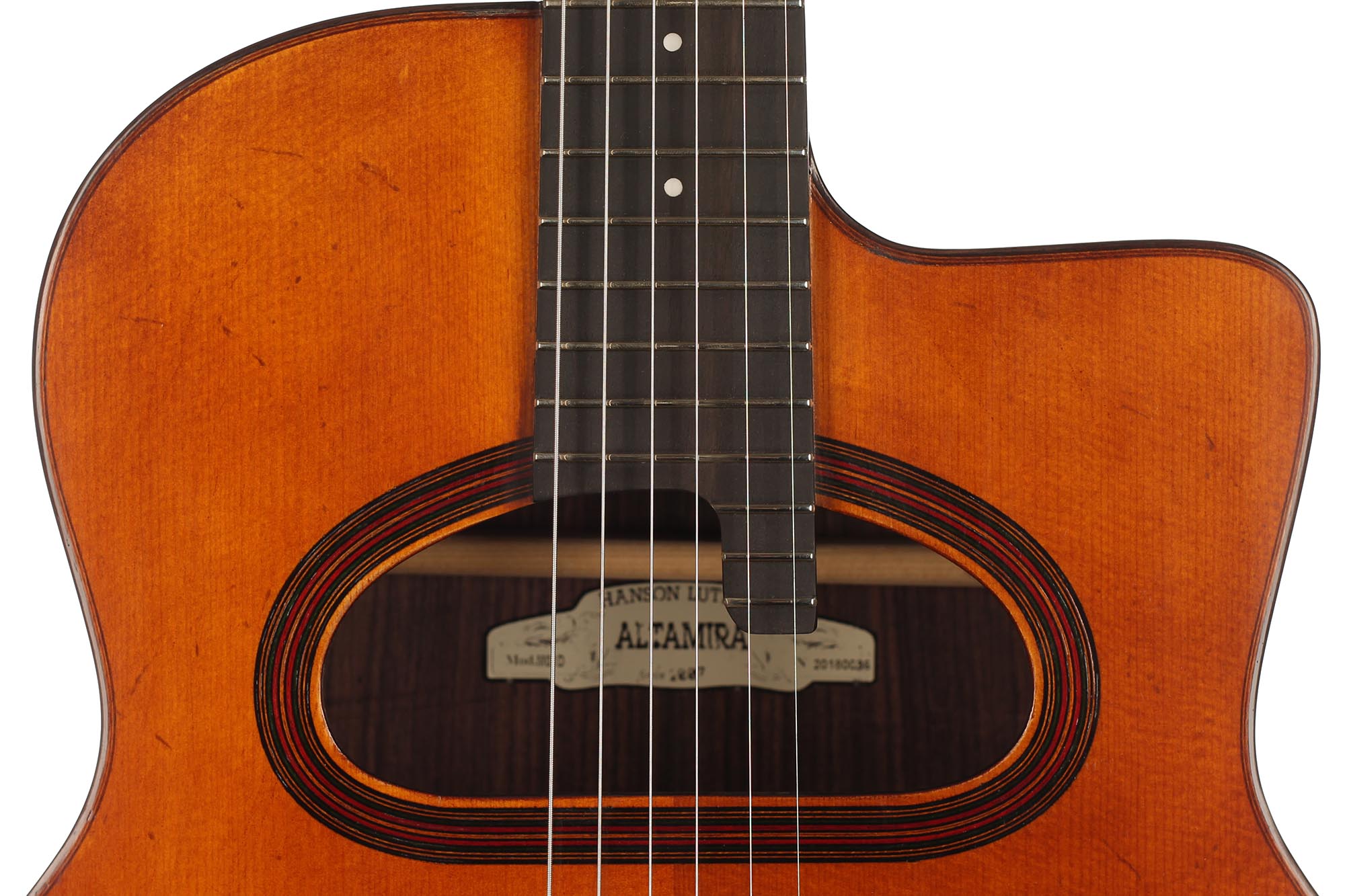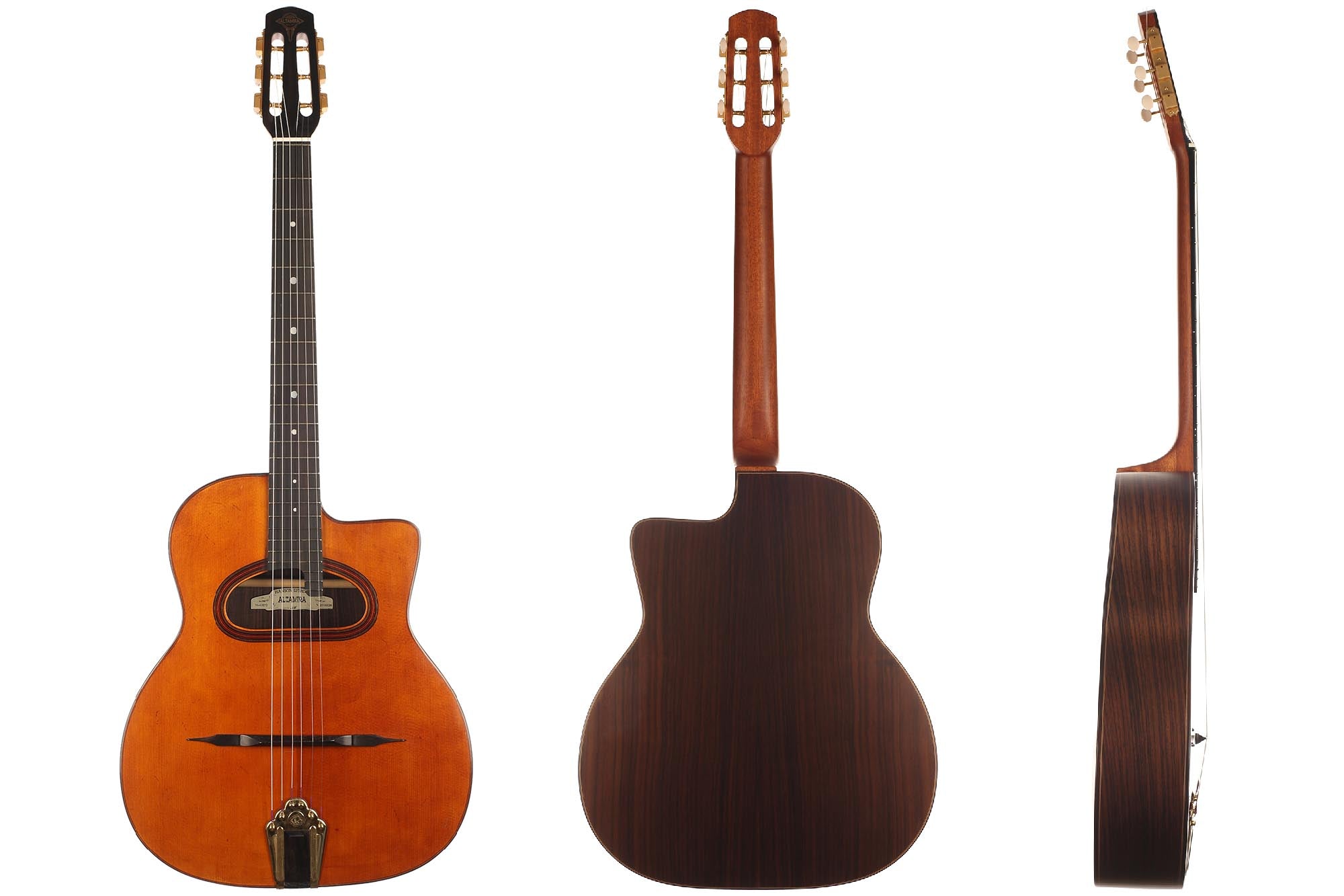 This M01D Antique Maccaferri style D-hole gypsy jazz guitar built by Altamira has a solid spruce top with an antique finish. It is very fine guitar that sounds outstandingly good, with a nice old fashionned look and a great value for money. Beautiful woods were choosen to make this guitar: the finest German Spruce top and very fine laminated Indian rosewood back and sides. Hardshell case is included.