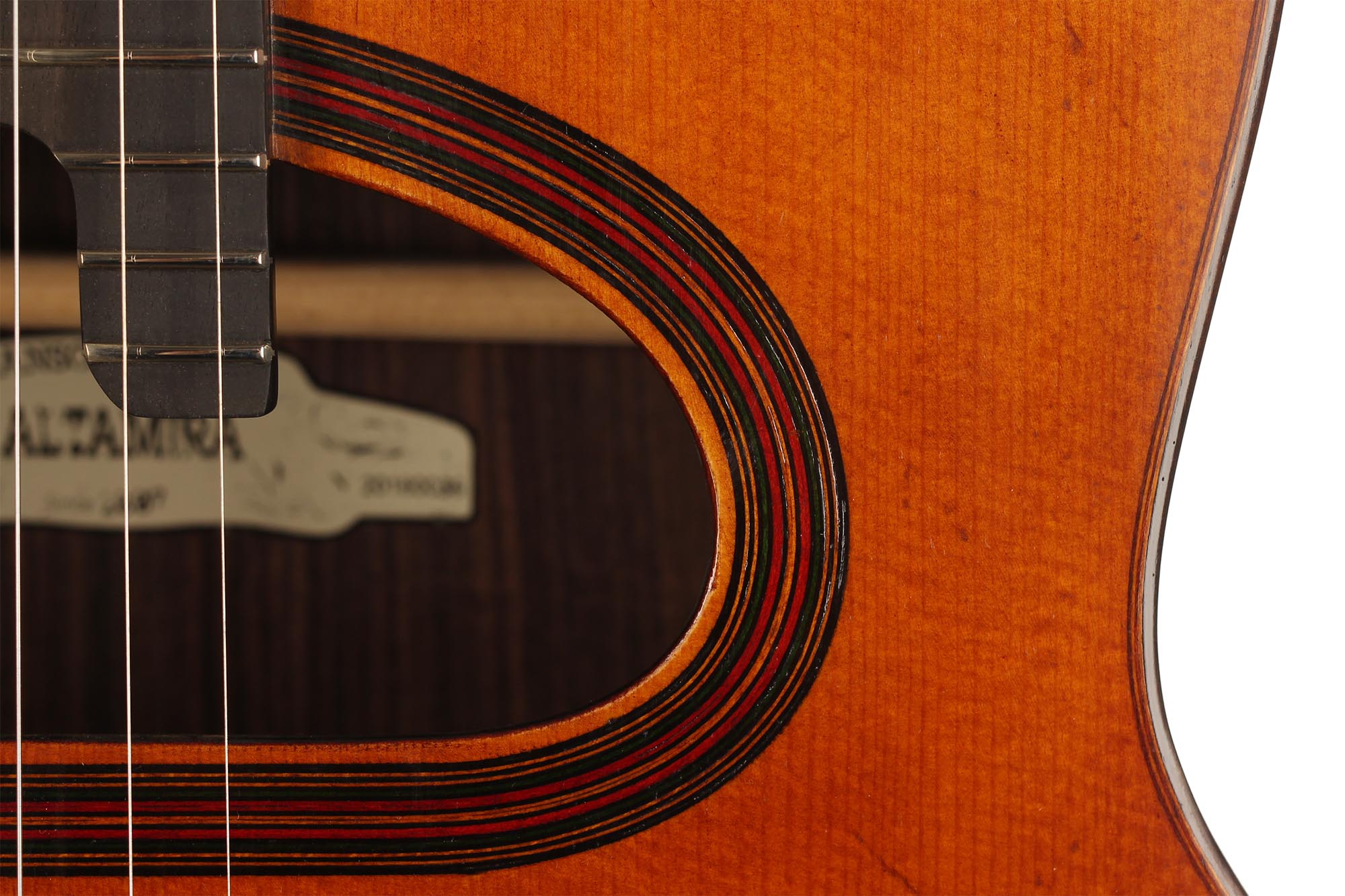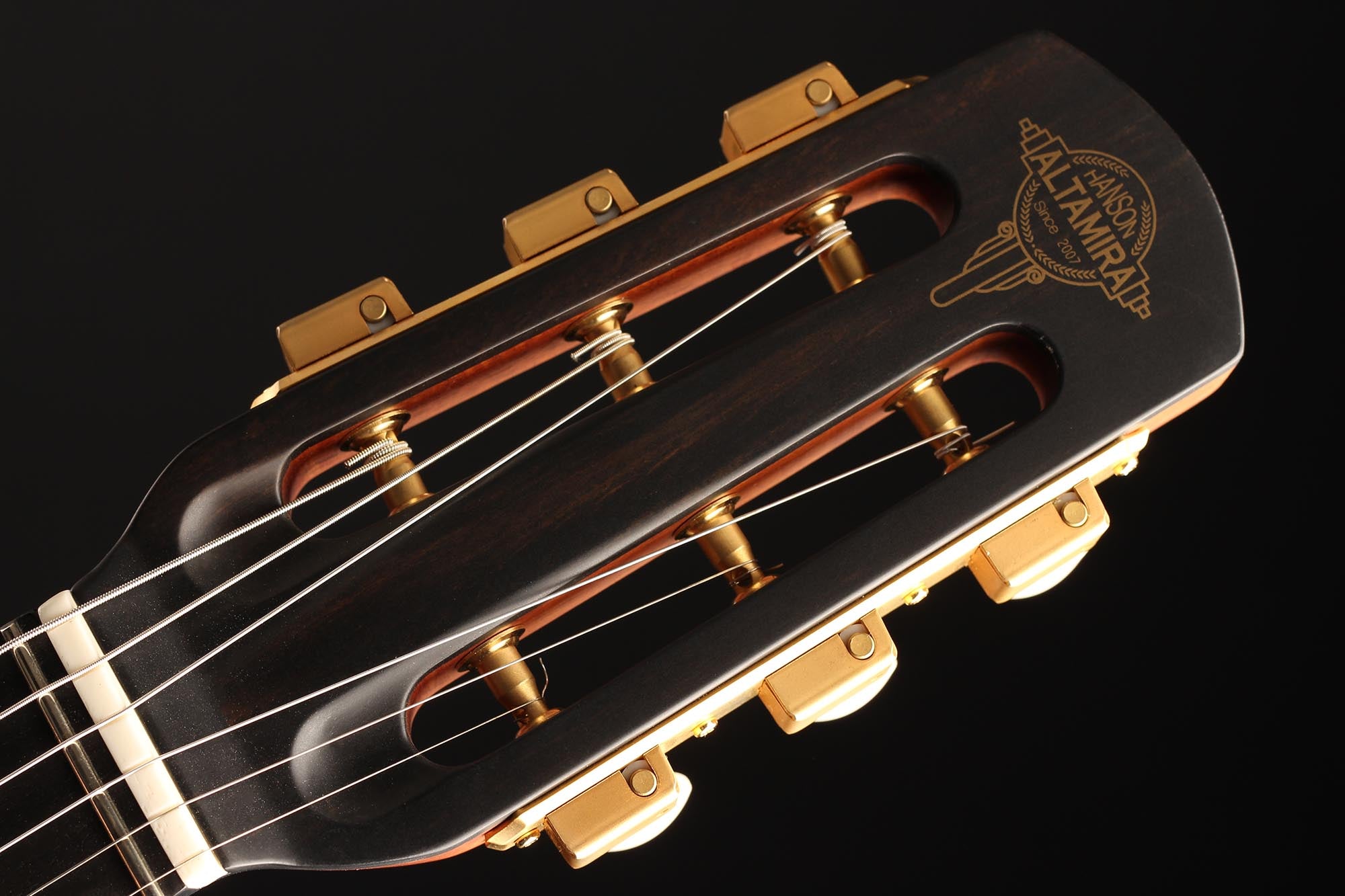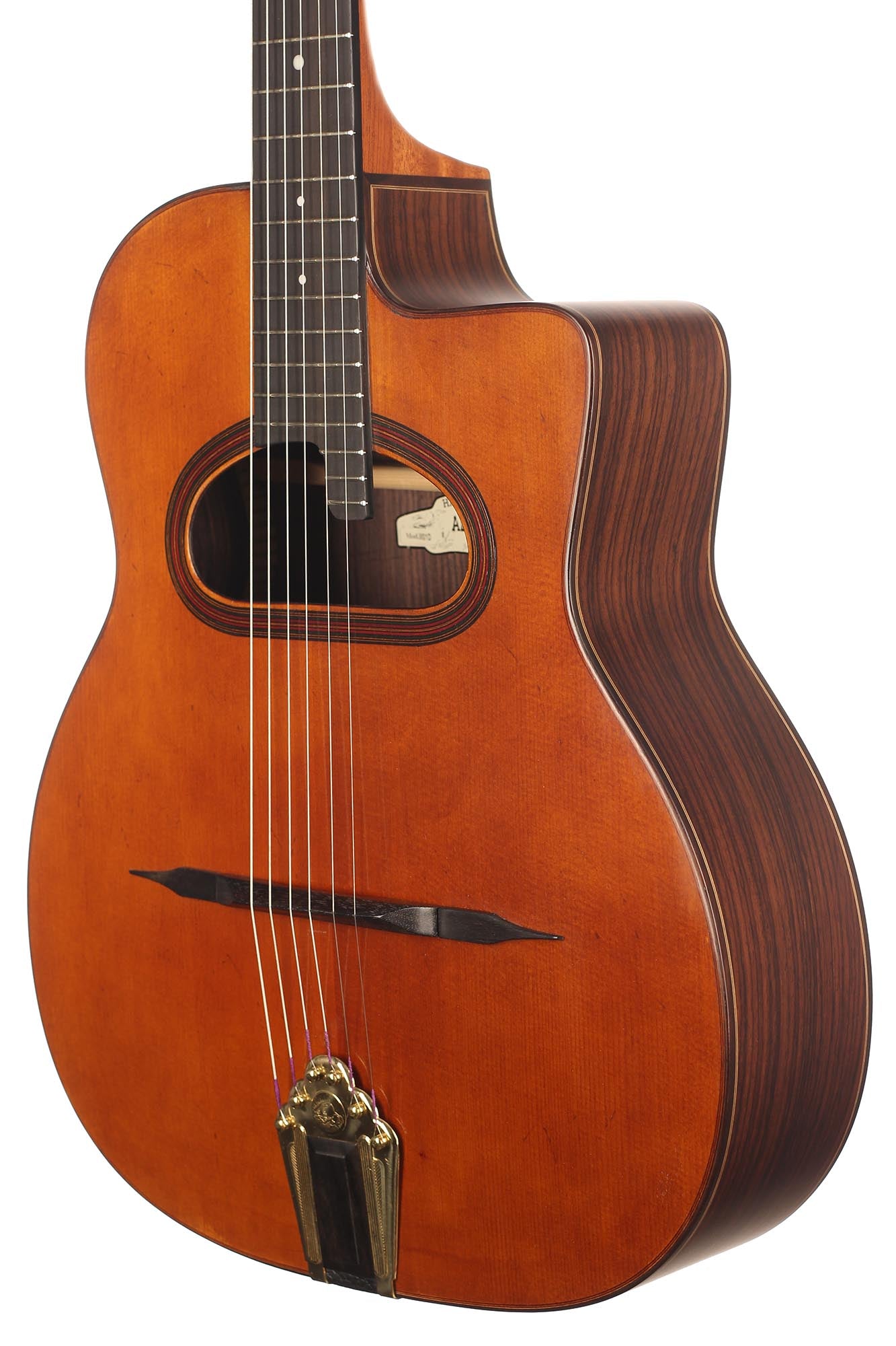 This M01D Antique Maccaferri style D-hole gypsy jazz guitar built by Altamira has a solid spruce top with an antique finish. It is very fine guitar that sounds outstandingly good, with a nice old fashionned look and a great value for money. Beautiful woods were choosen to make this guitar: the finest German Spruce top and very fine laminated Indian rosewood back and sides. Hardshell case is included.