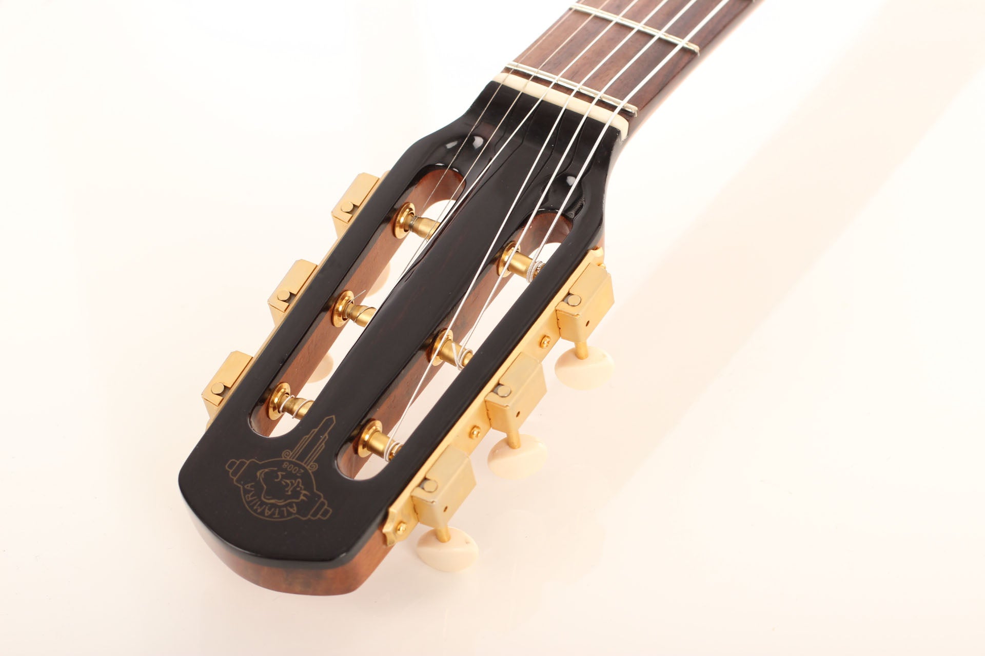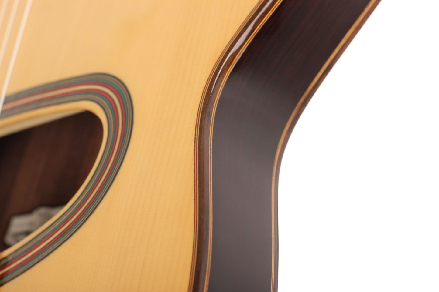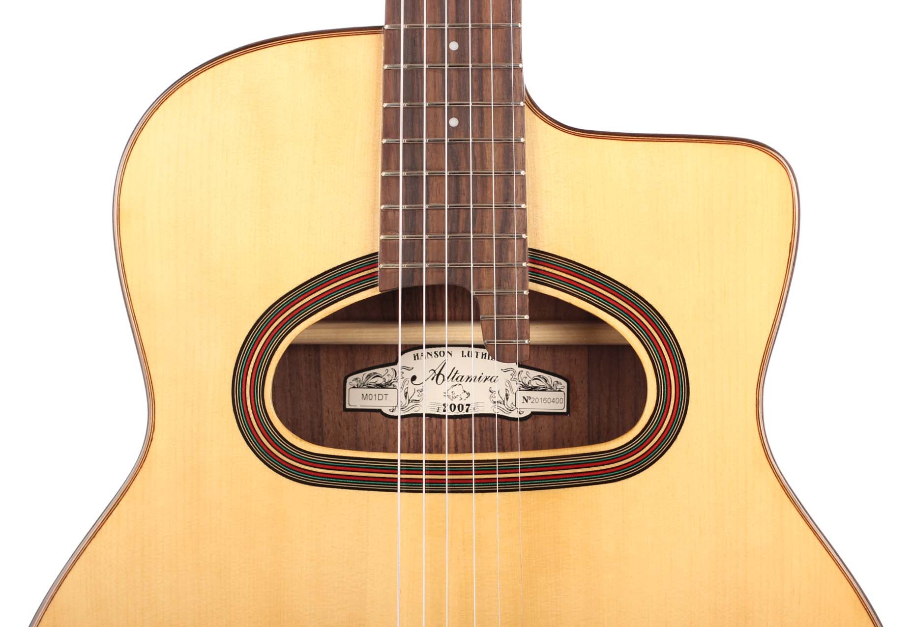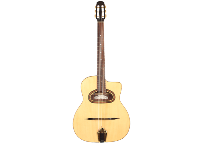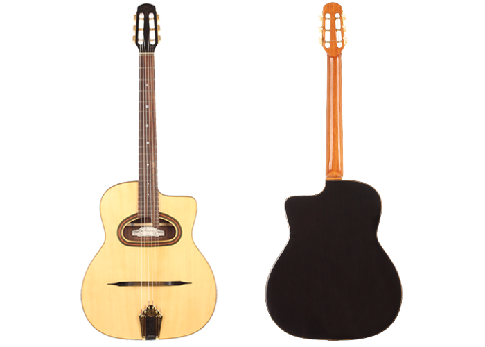 The Selmer-Style guitars by Altamira are fine instruments with an authentic sound and a great value for money. Due to their modern C-Shape neck they are also very comfortable to play. This Altamira M01DT Maccaferri style gypsy jazz guitar has a d-sound-hole and a high gloss finish. Quite traditional in sound with a rich and hearty tone. Due to its thinner body this model is very ergonomic without losing power or sound. Only the best woods were chosen to make this guitar: Finest German spruce and finer laminated Indian rosewood for back and sides. A Gewa Prestige hardshell case is included.