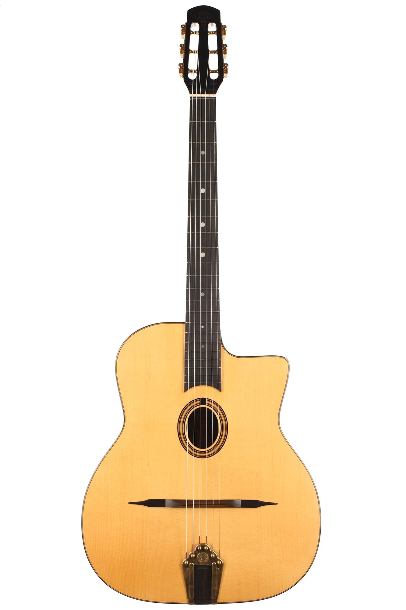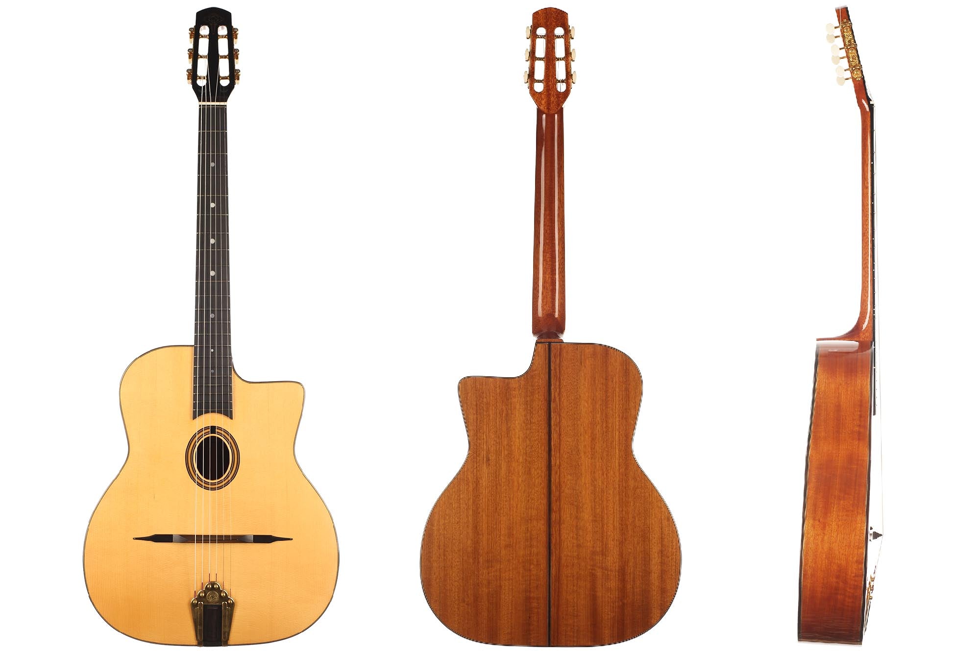 The "M" stands for the initials of the legendary guitar maker Mario Maccaferri, who developed this type of guitar and built it in collaboration with the French manufacturer Selmer from 1932 to about 1952. Although Maccaferri's collaboration with Selmer ended in 1934, the company continued to produce several models of this guitar until 1952. It was Django Reinhard who made the Selmer Maccaferri guitars popular and his playing style. Thus, the Selmer Maccaferri model with its relatively large body and either oval "Petite Bouche" or D-shaped "Grande Bouche" sound hole is an indispensable element for any guitarist who wants to explore the inspiring and fascinating repertoire of Gypsy Jazz.