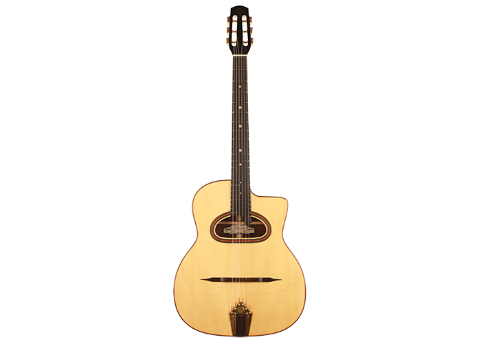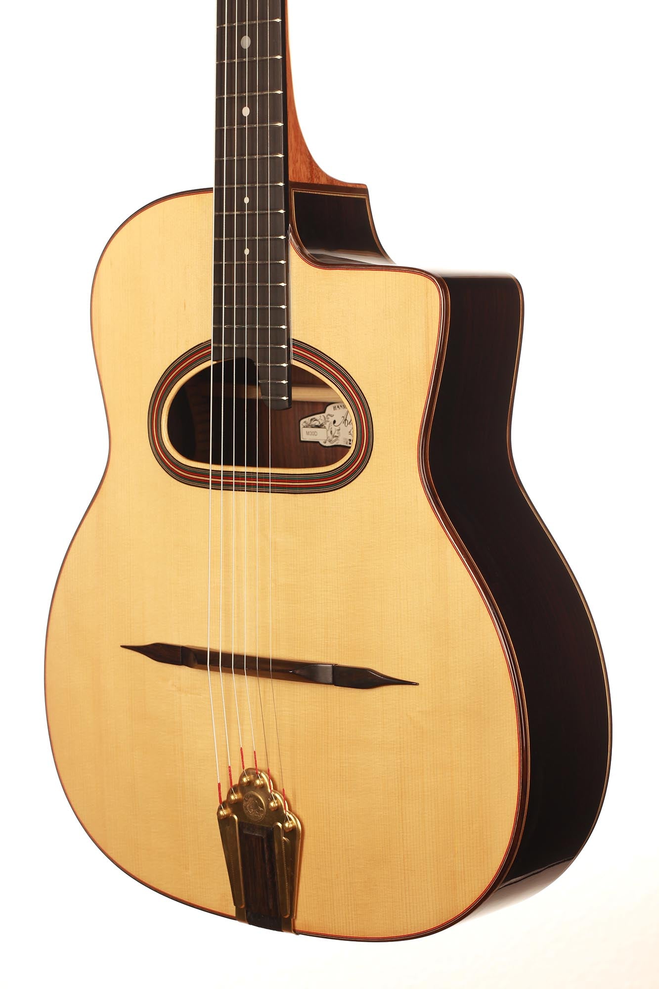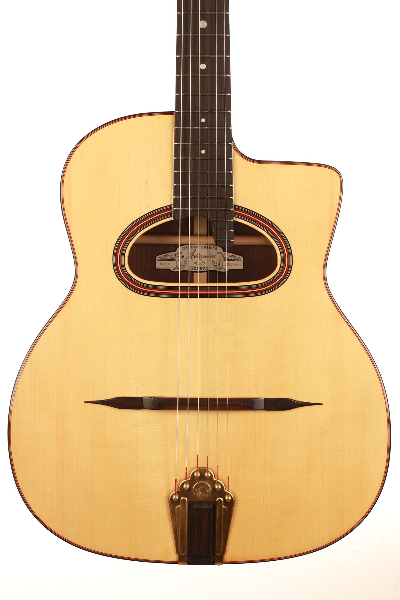 The M30D is a fine quality Selmer copy from Altamira with the typical oval soundhole (grande bouche). Due to high quality materials of this solid wood model, this guitar has an authentic dry and crisp tone. Also the Altamiras have a more modern, ergonomic C shaped neck, that makes playing nice and comfortable. The top is made of solid spruce. Back and sides are made of solid indian rosewood. The neck is crafted of walnut and the fretboard of ebony.