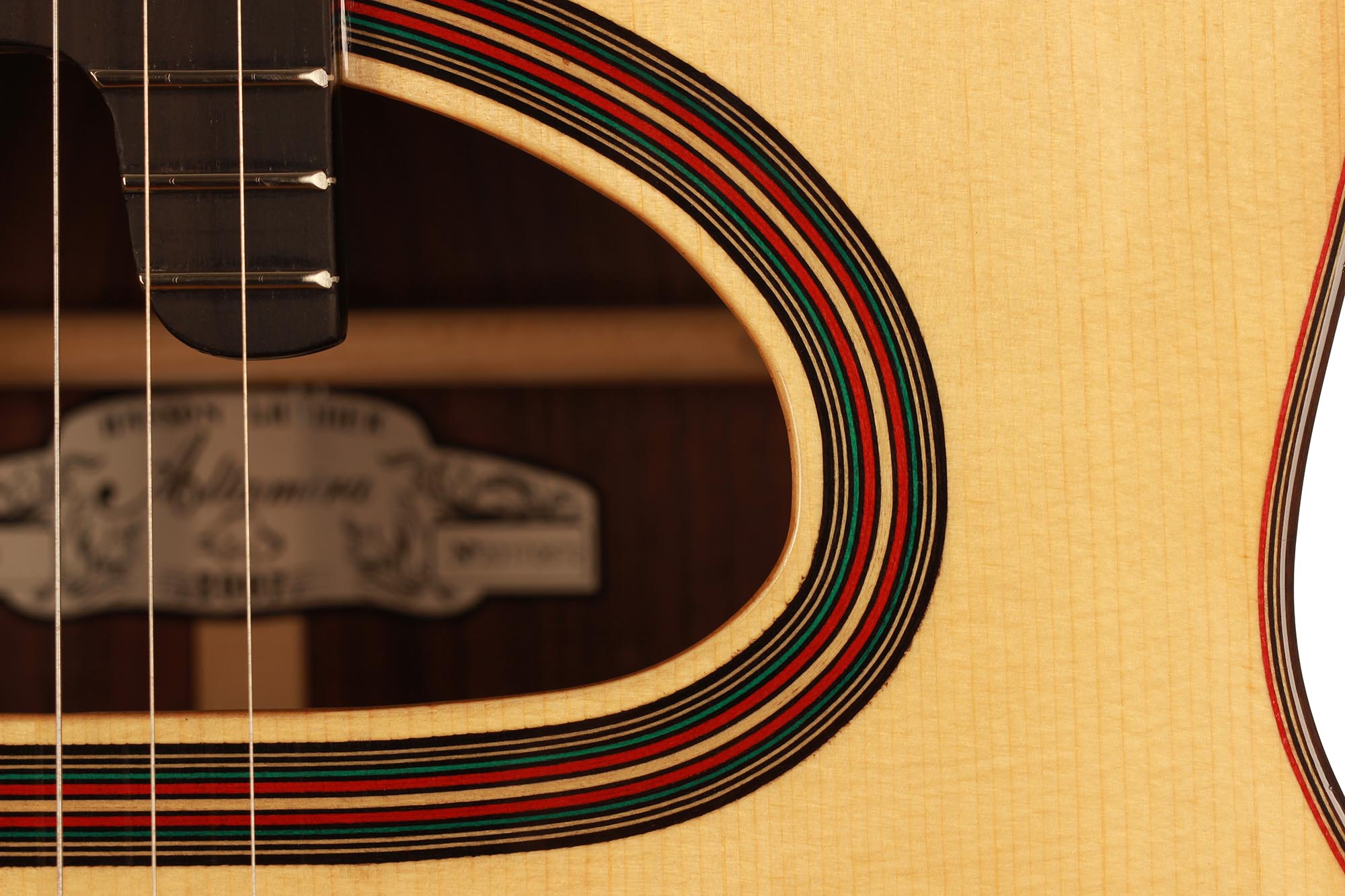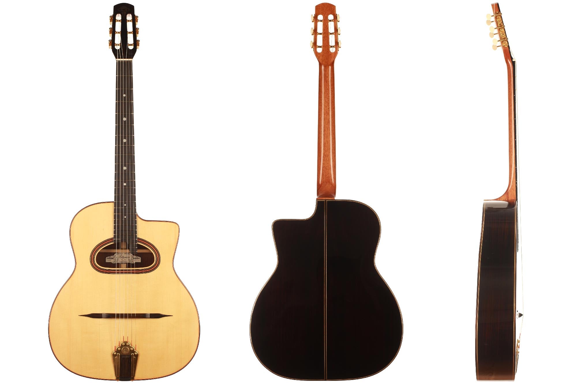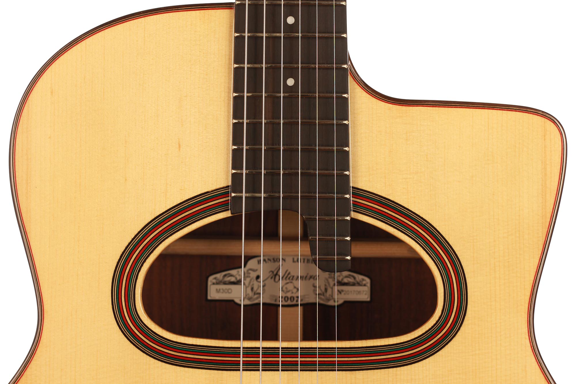 The M30D is a fine quality Selmer copy from Altamira with the typical oval soundhole (grande bouche). Due to high quality materials of this solid wood model, this guitar has an authentic dry and crisp tone. Also the Altamiras have a more modern, ergonomic C shaped neck, that makes playing nice and comfortable. The top is made of solid spruce. Back and sides are made of solid indian rosewood. The neck is crafted of walnut and the fretboard of ebony.