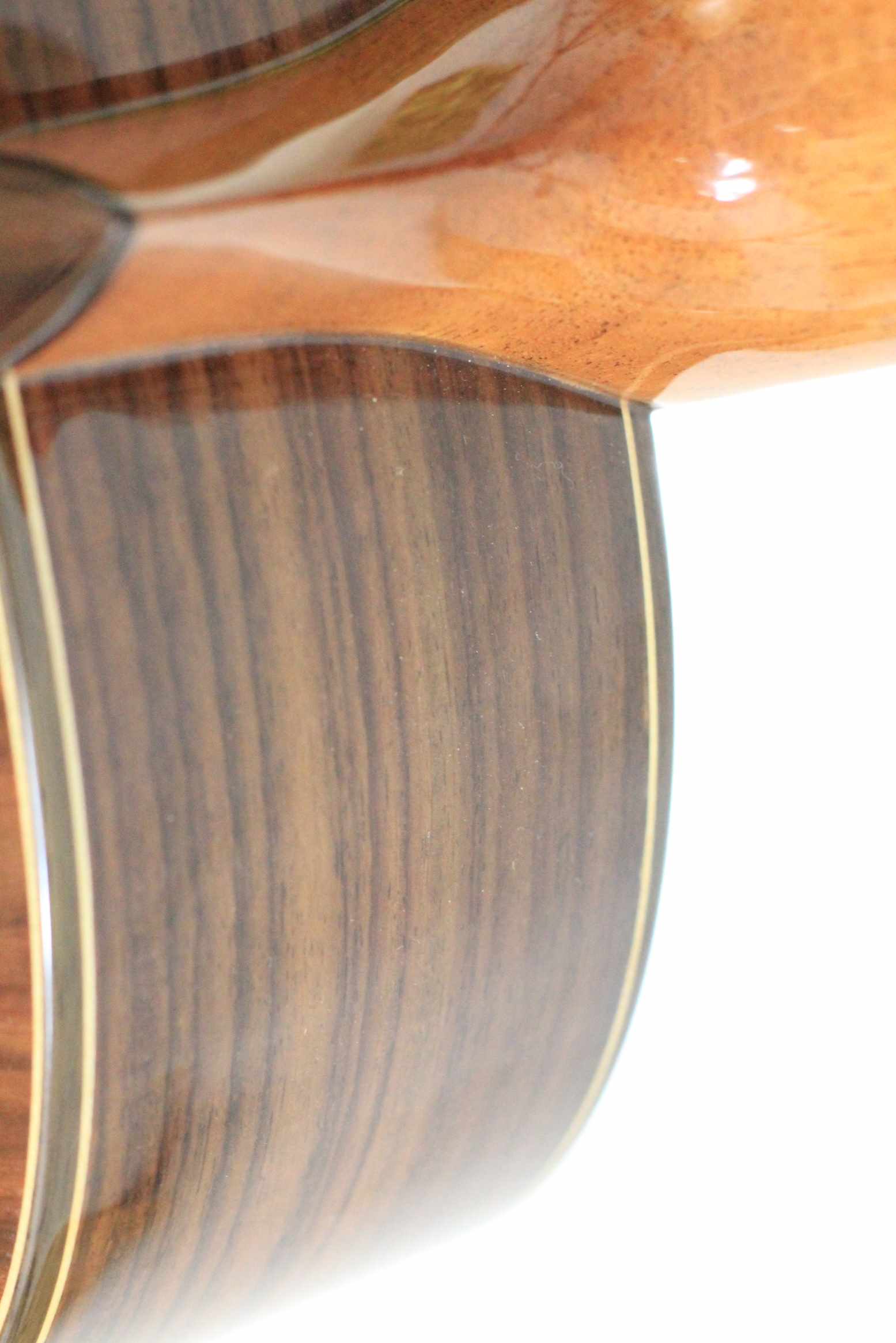 Decke: Fichte massiv Zargen: Palisander furniert Boden: Palisander furniert Hals: Mahagoni Griffbrett & Steg: Palisander Bindings: Holz Mensur: 65 cm Mechaniken: Nickel Finish: Hochglanz