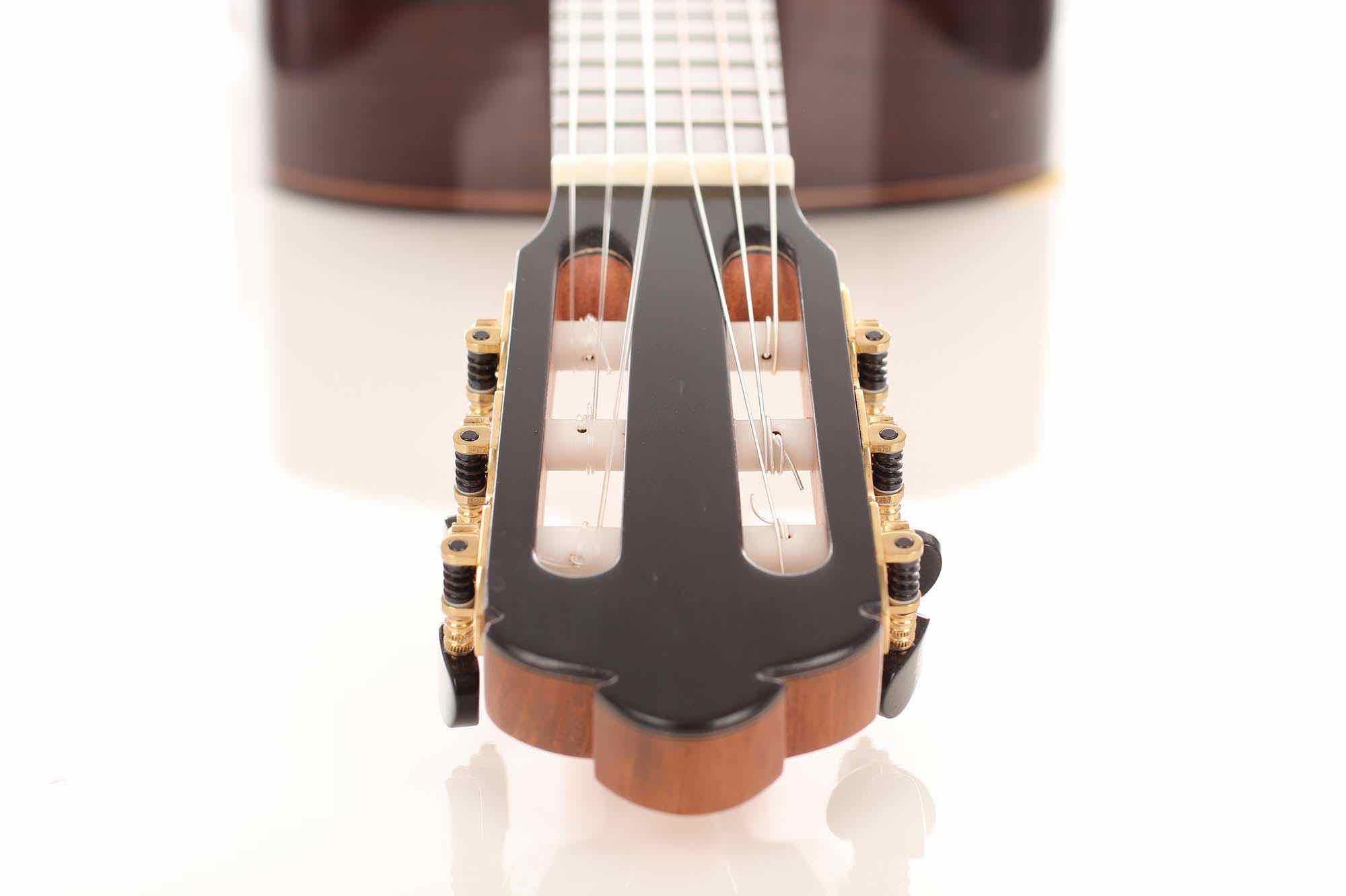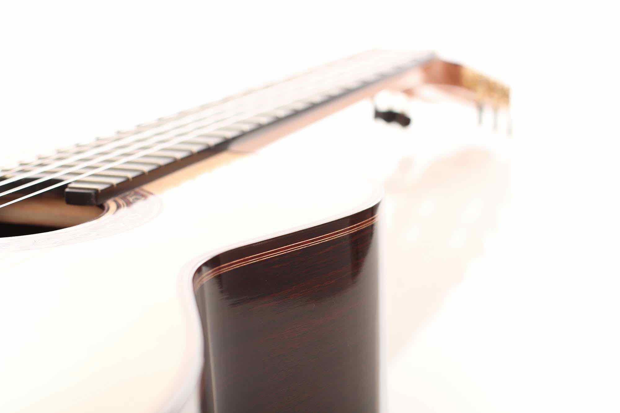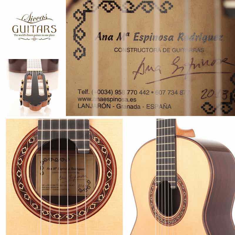 Ana Maria Espinosa Rodríguez learned the art of luthiery from René Baarslag. Her guitar constructions are mainly inspired by the instruments of Antonio de Torres, so that these elements of these guitars can be found in her guitars. Ana Espinosa’s guitars are characterized by a powerful sound volume and rich tone. This guitar was built in 2013 and is in very good condition. The top is made of spruce and back and sides are made of beautiful Indian Rosewood. The tuners are made by Rubner.