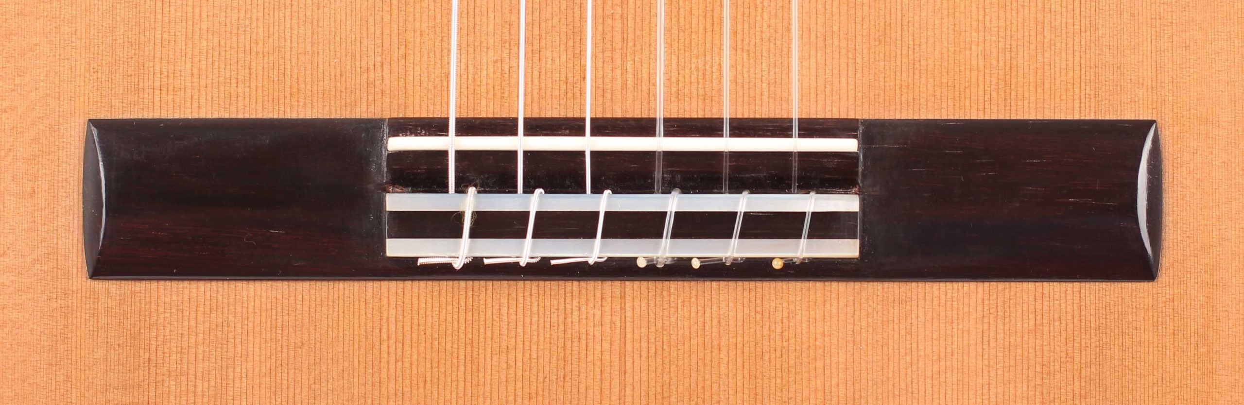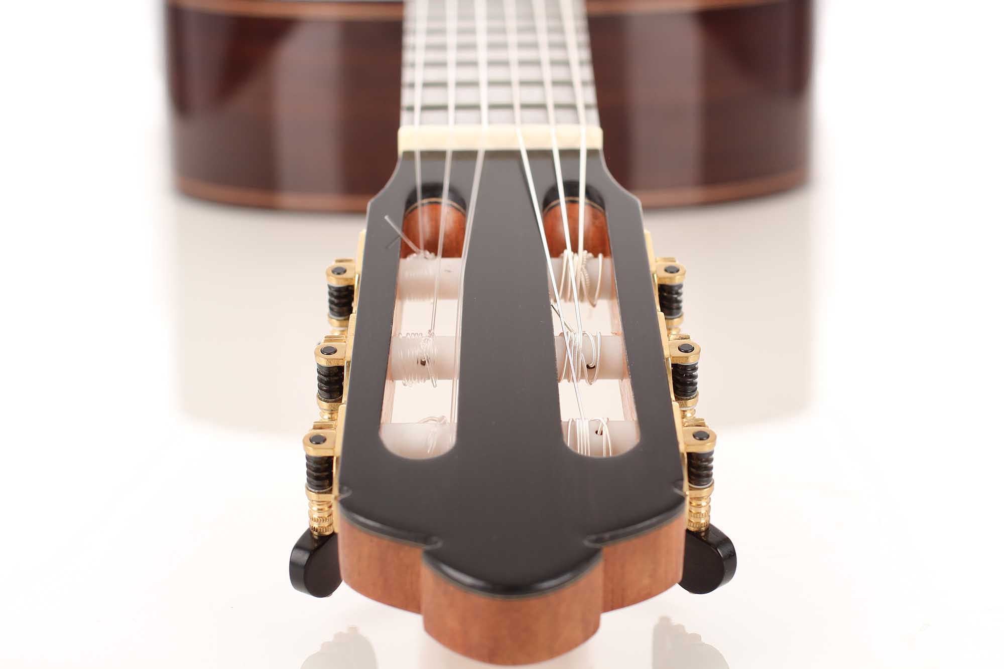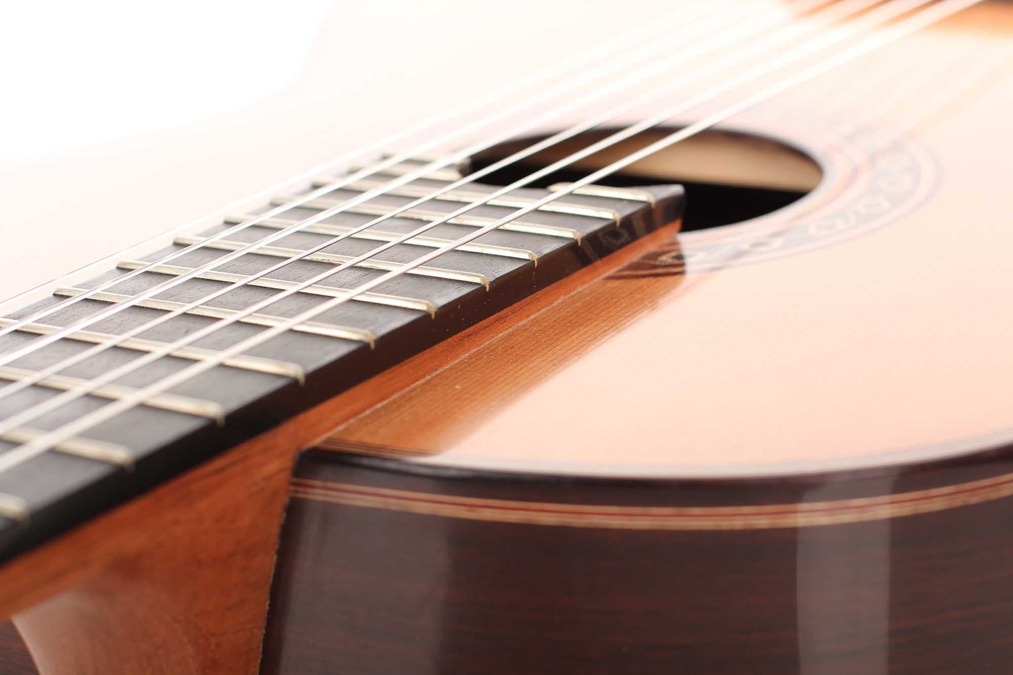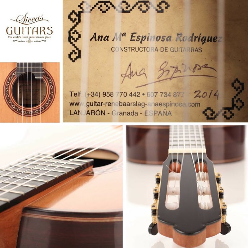 Ana Maria Espinosa Rodríguez learned the art of luthiery from René Baarslag. Her guitar constructions are mainly inspired by the instruments of Antonio de Torres, so that these elements of these guitars can be found in her guitars. Ana Espinosa’s guitars are characterized by a powerful sound volume and rich tone. This guitar was built in 2014 and is in very good condition. The top is made of cedar, the back and sides consist of East Indian rosewood. The fretboard is modestly elevated to improve the playability of higher notes. The tuners are made by Rubner.