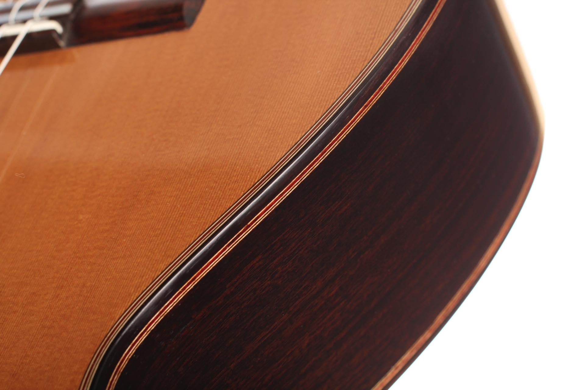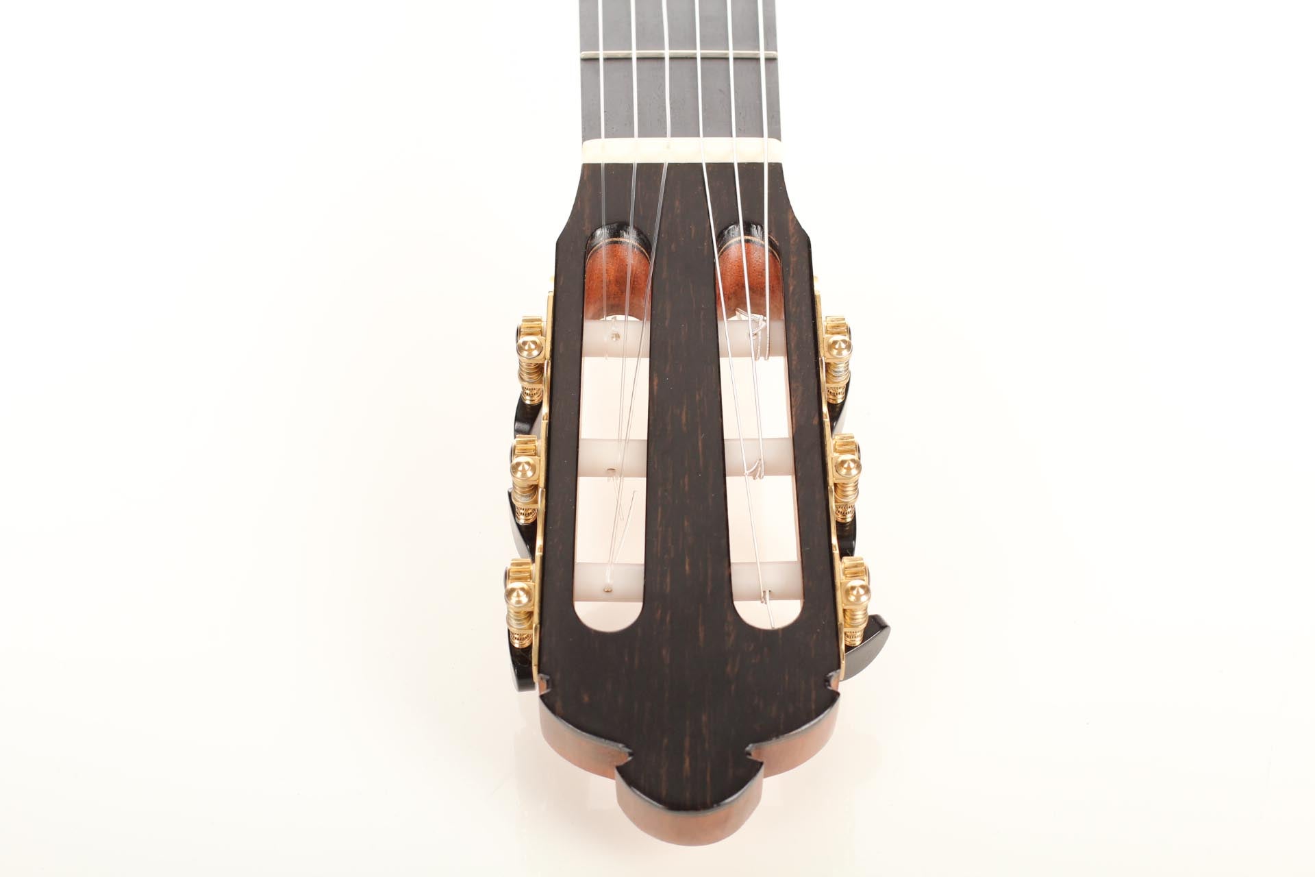 Ana Maria Espinosa Rodríguez learned the art of luthiery from René Baarslag. Her construction philosophy is mainly inspired by the instruments of Antonio de Torres and elements of these guitars can be found in hers. Ana Espinosa’s guitars are characterized by a powerful sound volume and rich tone. This guitar was built in 2015 and is in very good condition. The top is made of cedar and back and sides are made of beautiful Madagascar rosewood. This particular guitar has a warm and profound tone and is very tender to play. The accessible elevated fingerboard is a real plus for the playing comfort. This is overall an accomplished instrument with a textured sound and pleasing playability. The tuners are made by Rubner. A Hiscox Pro II hard-shell case is included.