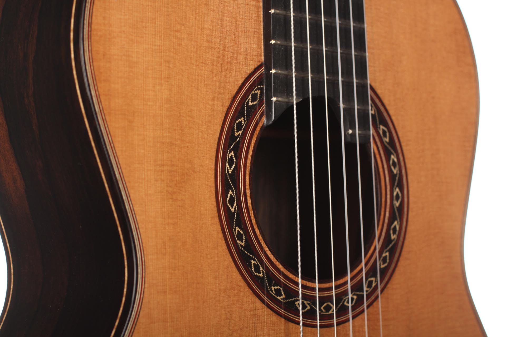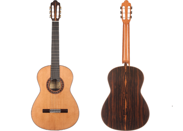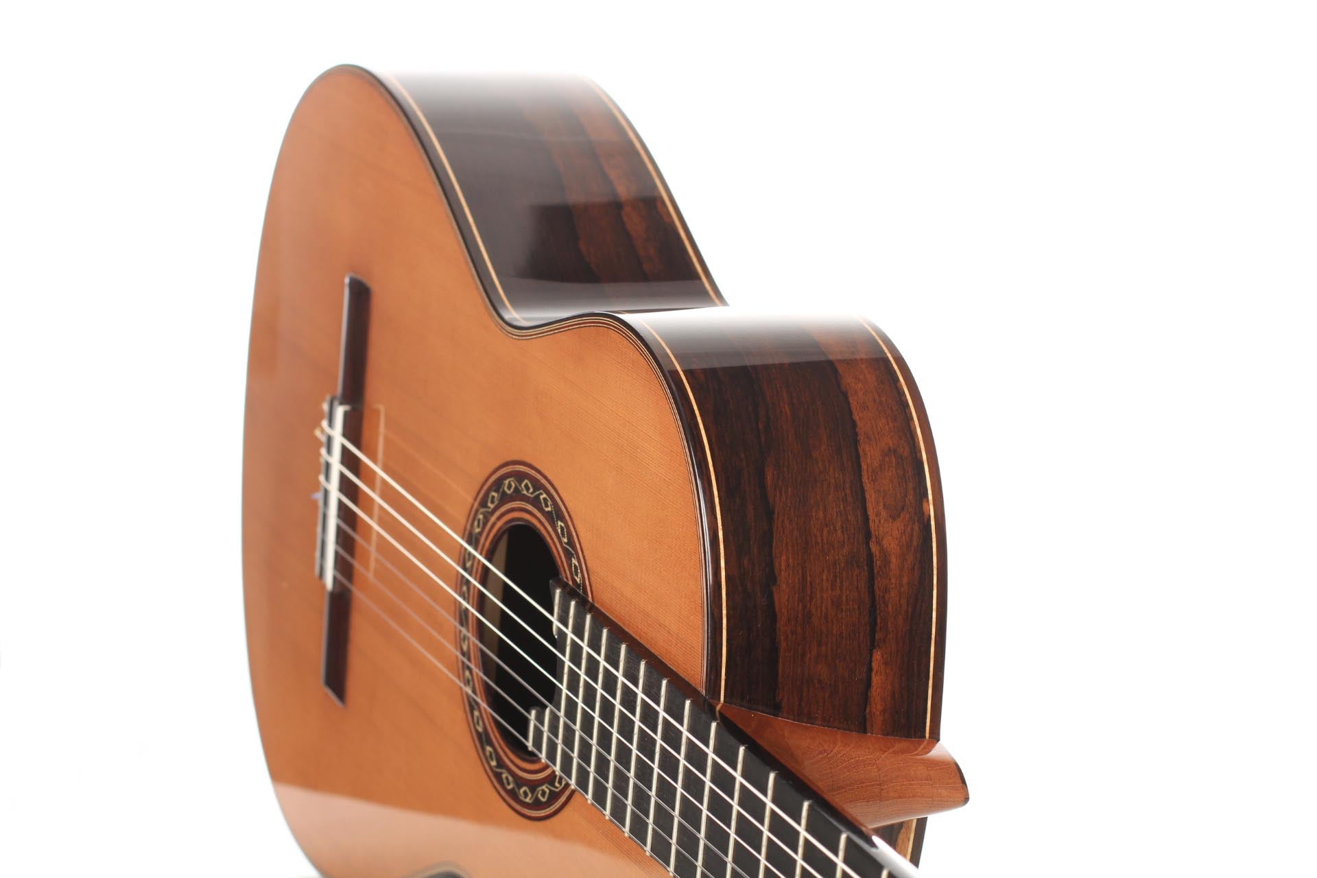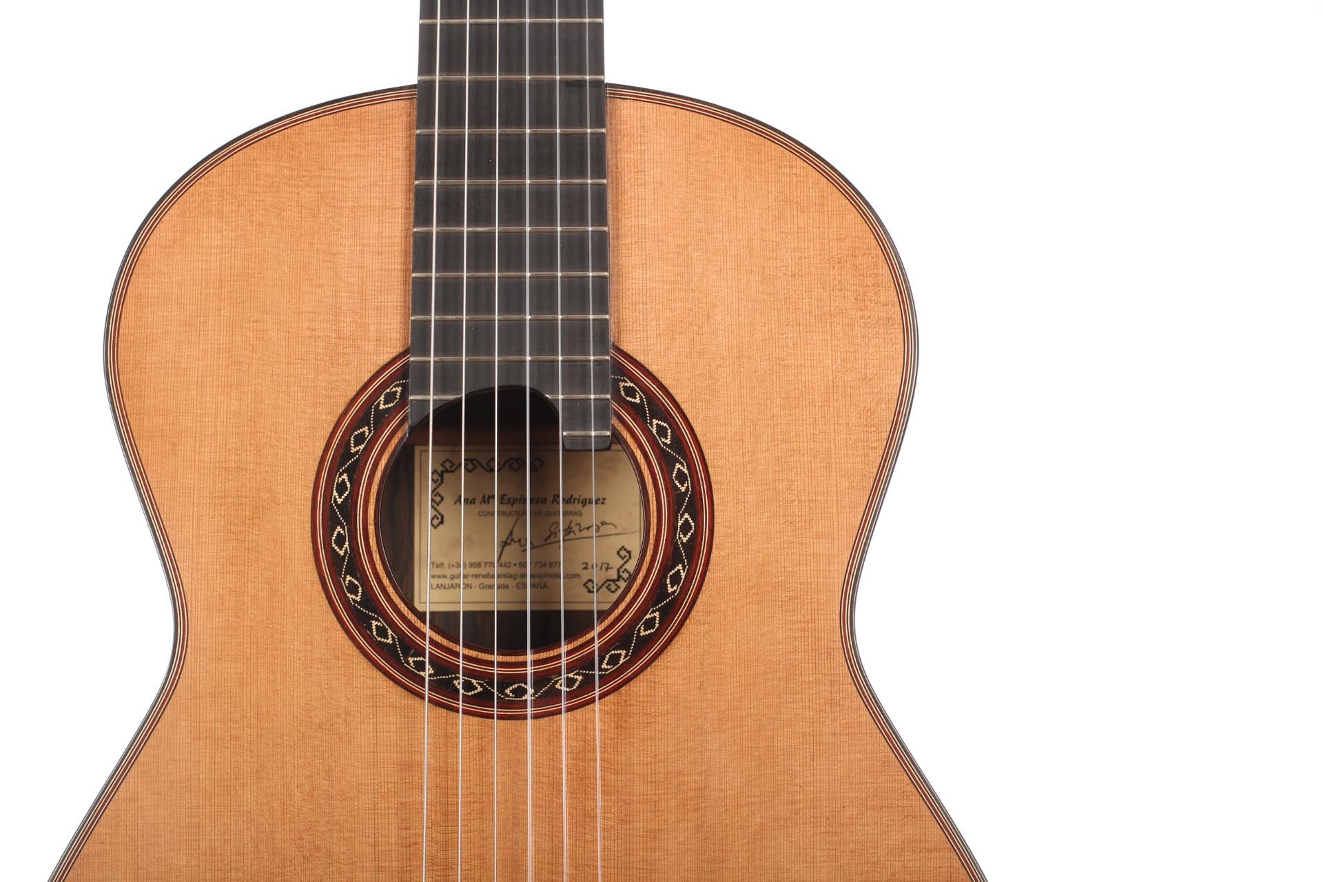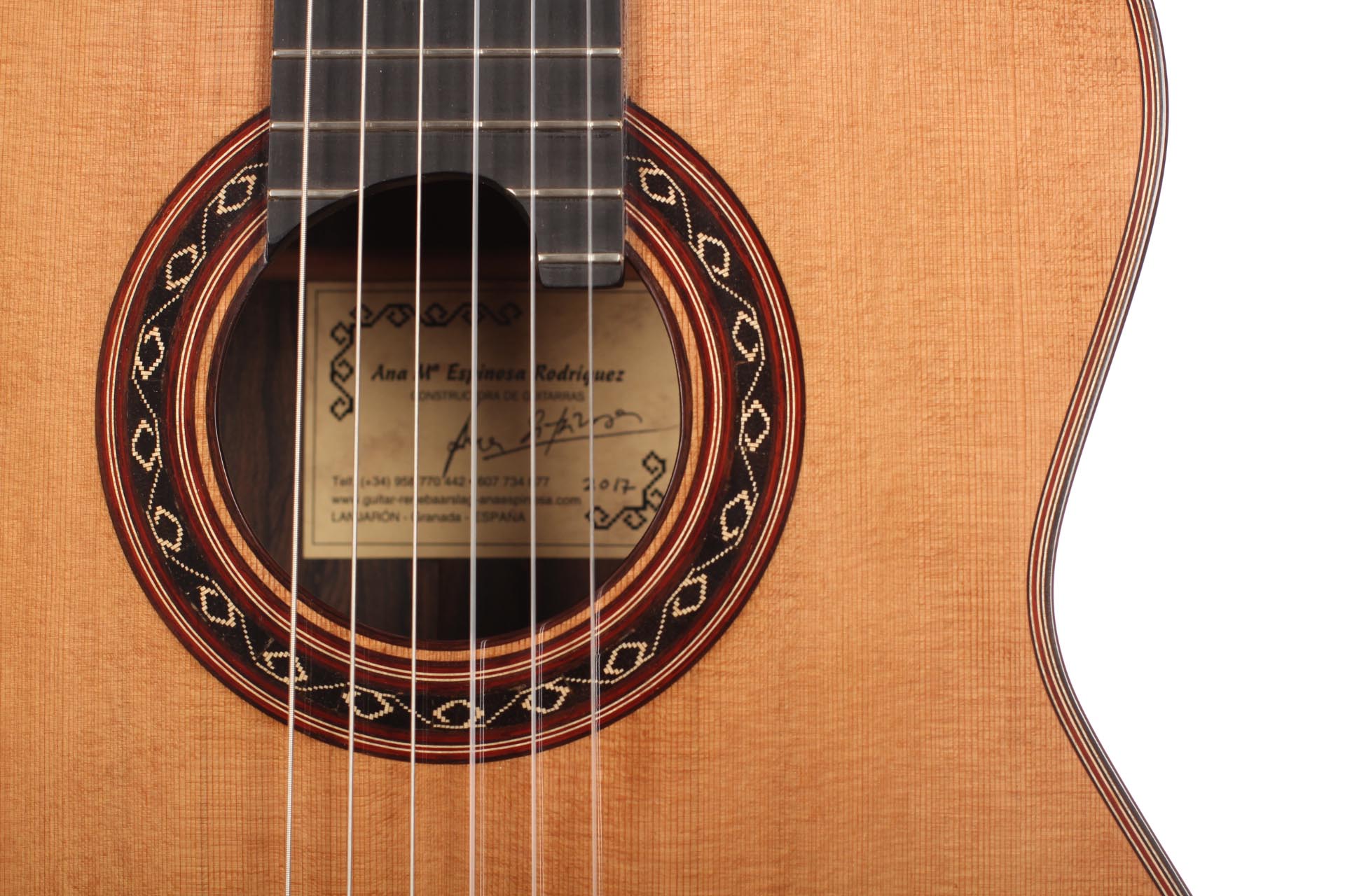 Ana Maria Espinosa Rodríguez learned the art of luthiery from René Baarslag. Her construction philosophy is mainly inspired by the instruments of Antonio de Torres and elements of these guitars can be found in hers. Ana Espinosa’s guitars are characterized by a powerful sound volume and rich tone. This new guitar was built in 2017. The top is made of cedar and back and sides are made of beautiful Ziricote. This particular guitar has a warm and profound tone and is very tender to play. This is overall an accomplished instrument with a textured sound and pleasing playability. The tuners are made by Rubner. A Hiscox Pro II hard-shell case is included. This guitar is Cites-free (CF)