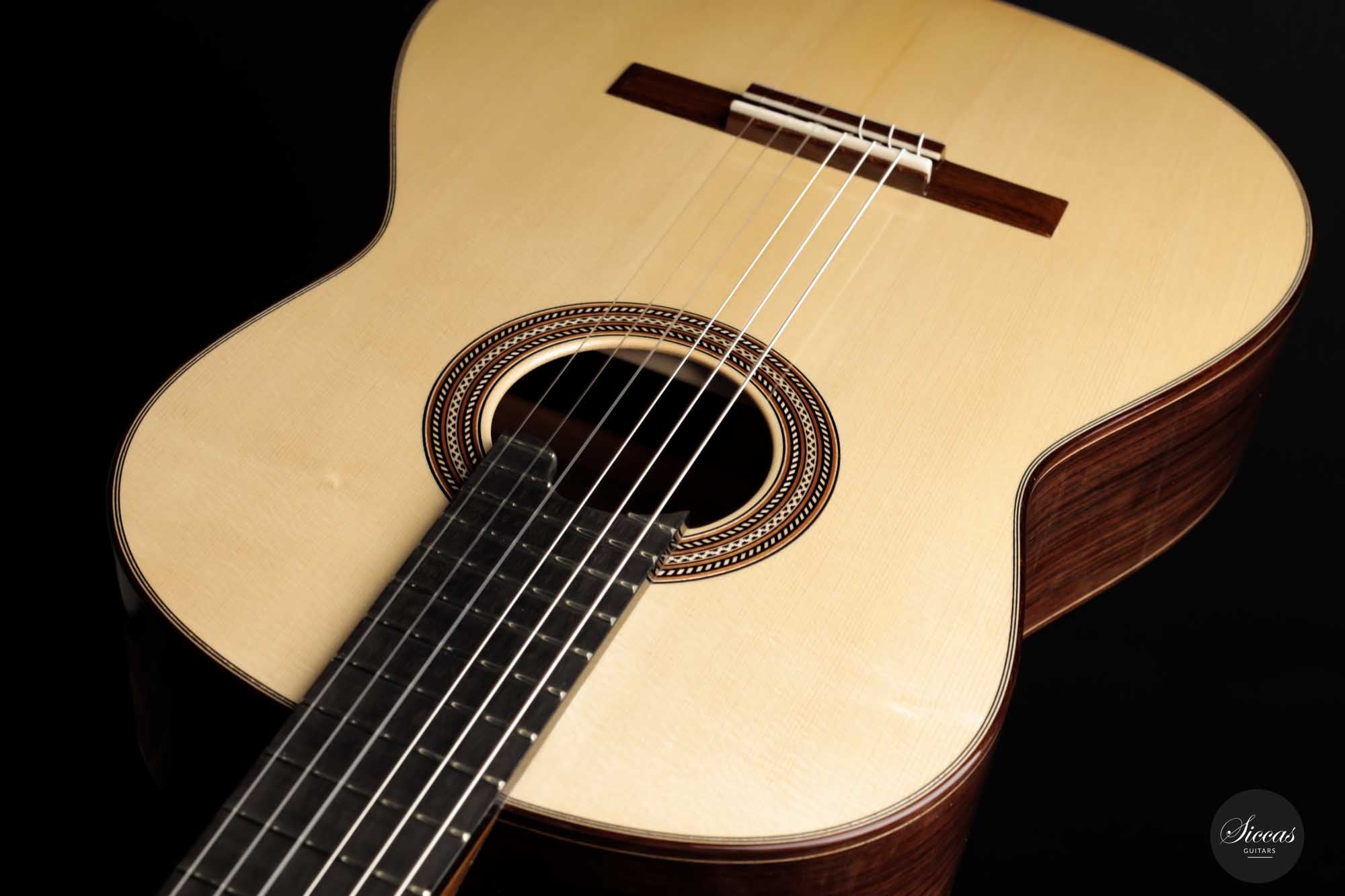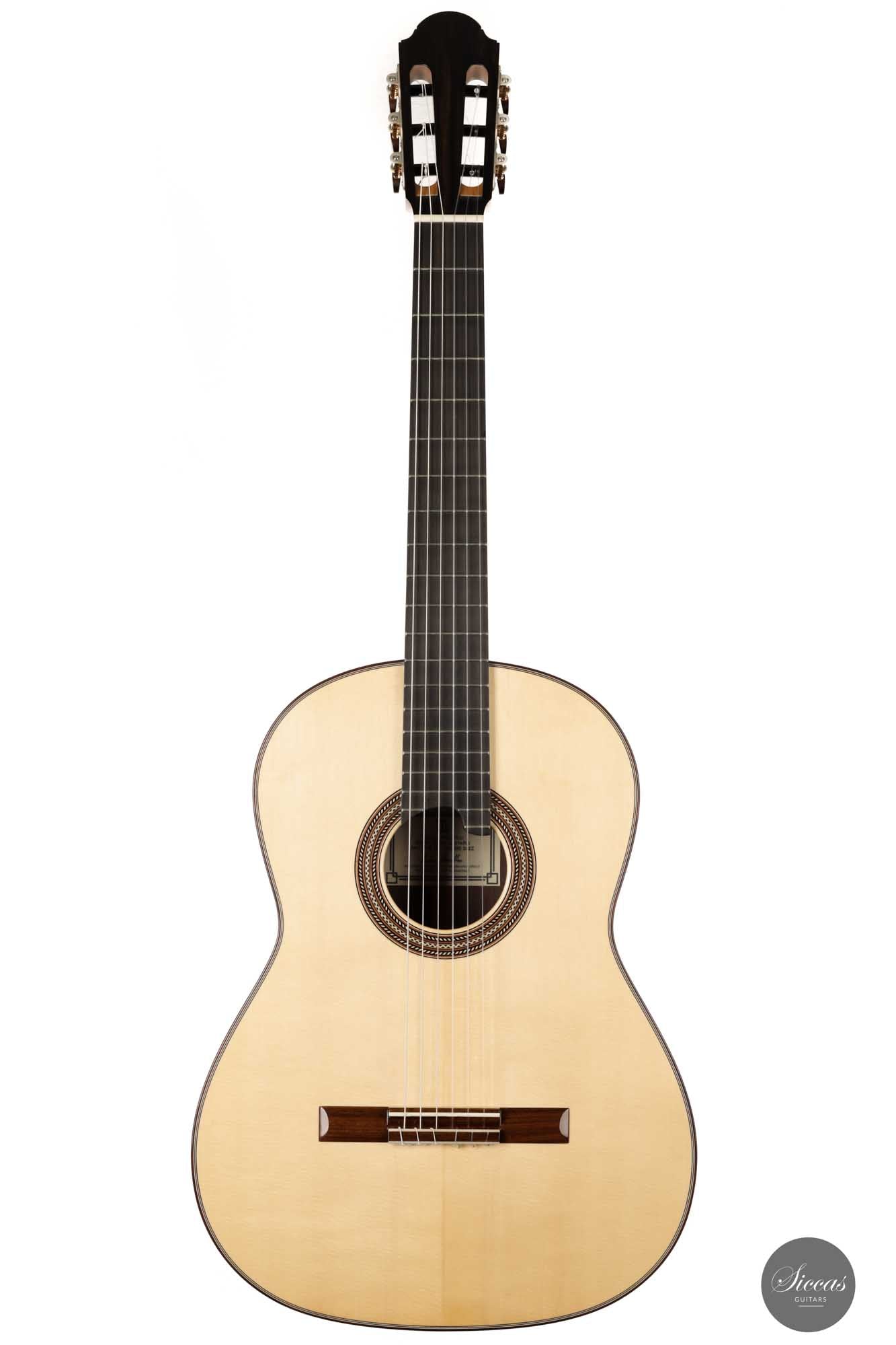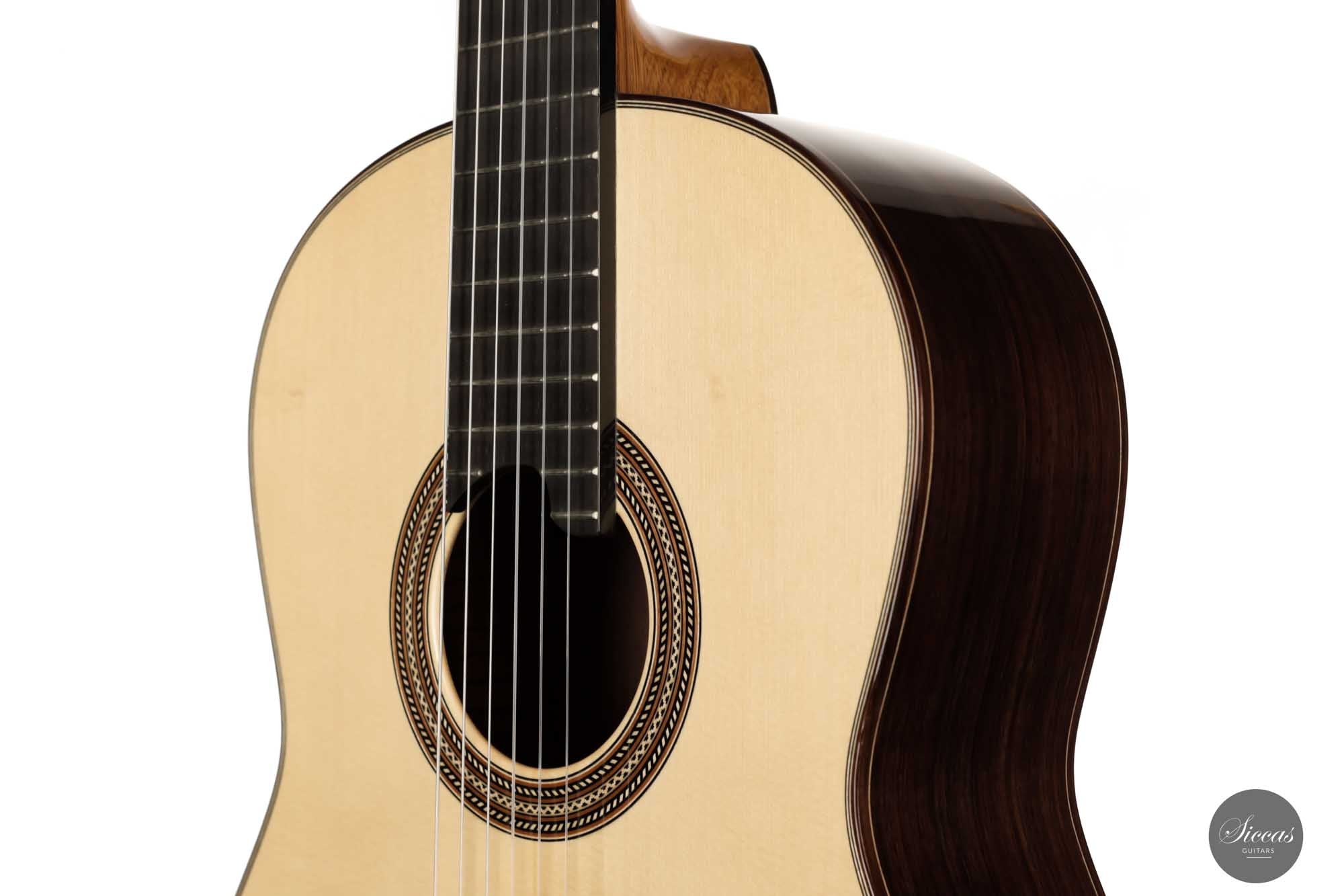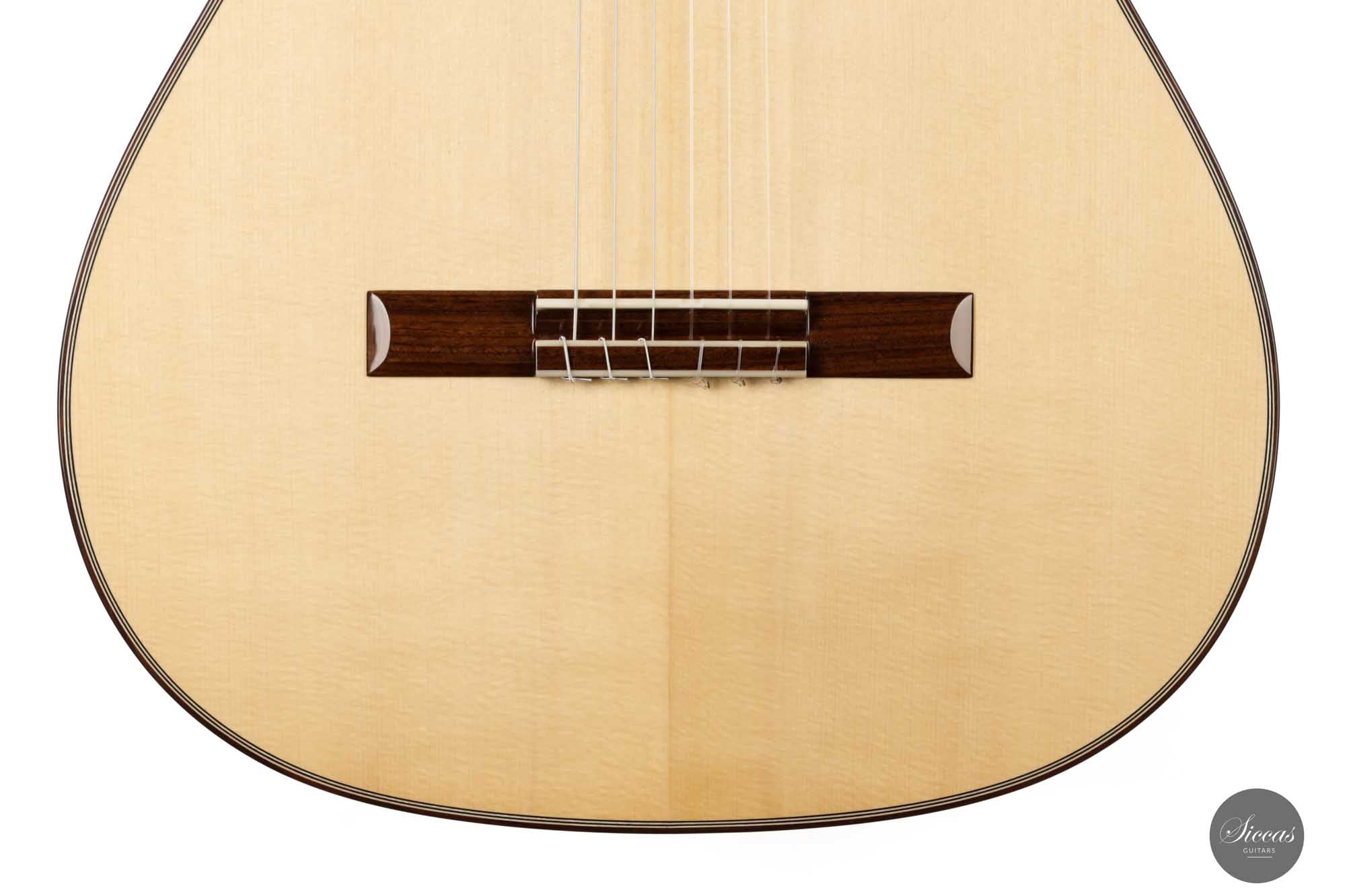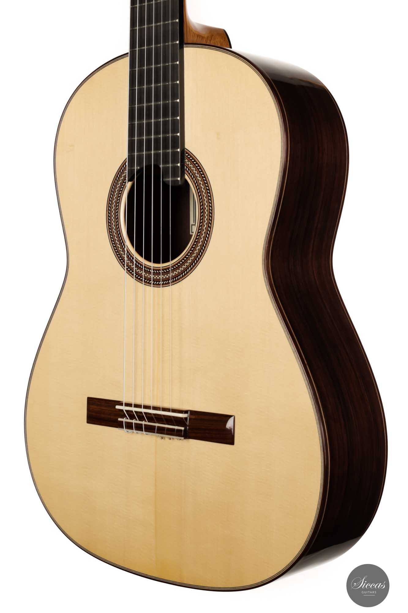 This particular guitar, number 69, has a spruce soundboard combined with Indian rosewood back and sides. Due to its setup and excellent design, this guitar responds beautifully to the player's hand, making it easy to play and maintaining total control of the instrument. Although it is a brand new guitar, it features a mature tonal quality, with warm, well-rounded trebles and deep, punchy, elegant basses.
