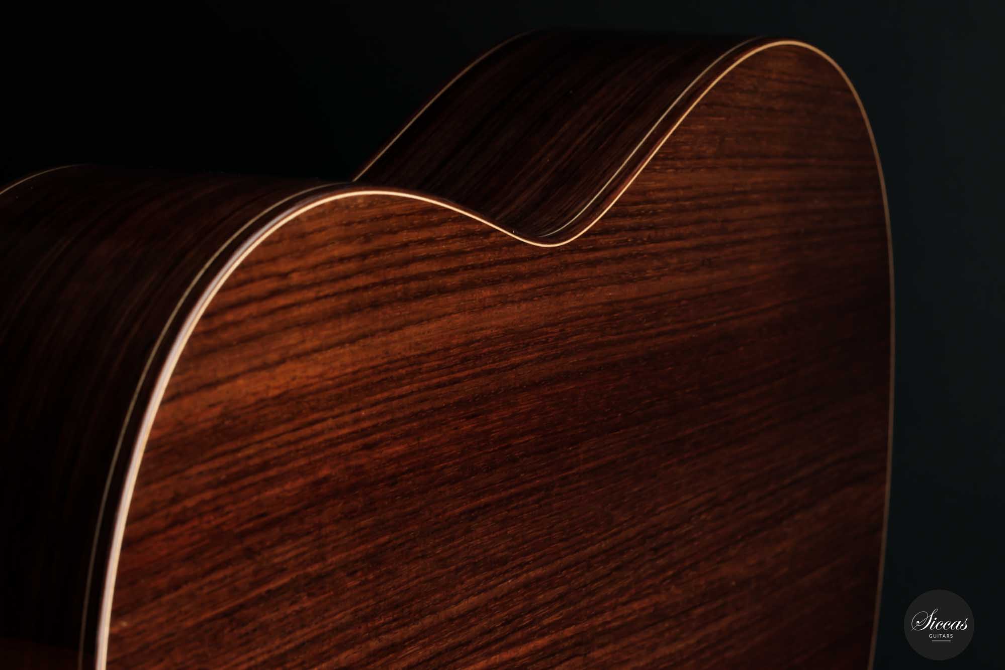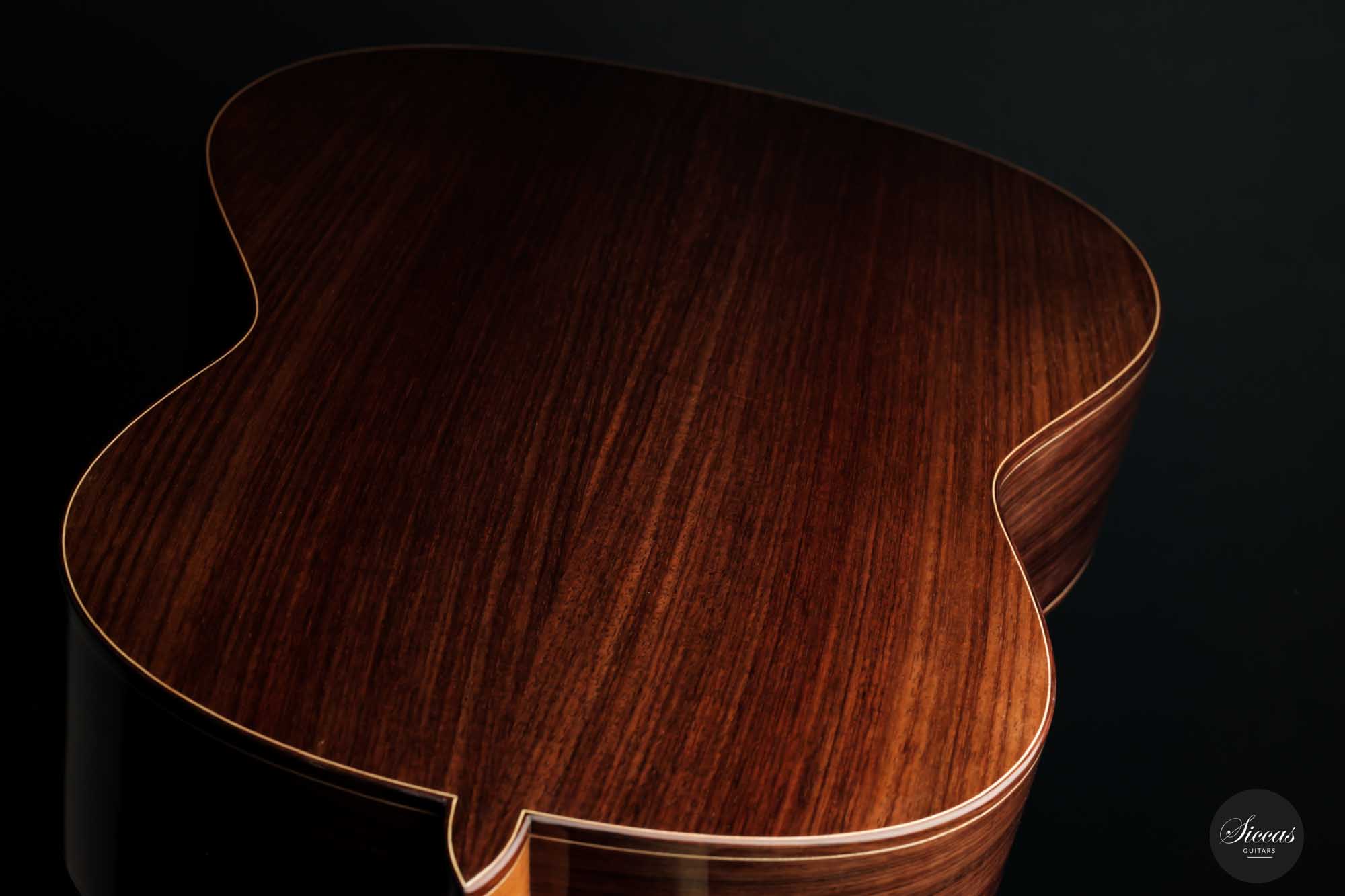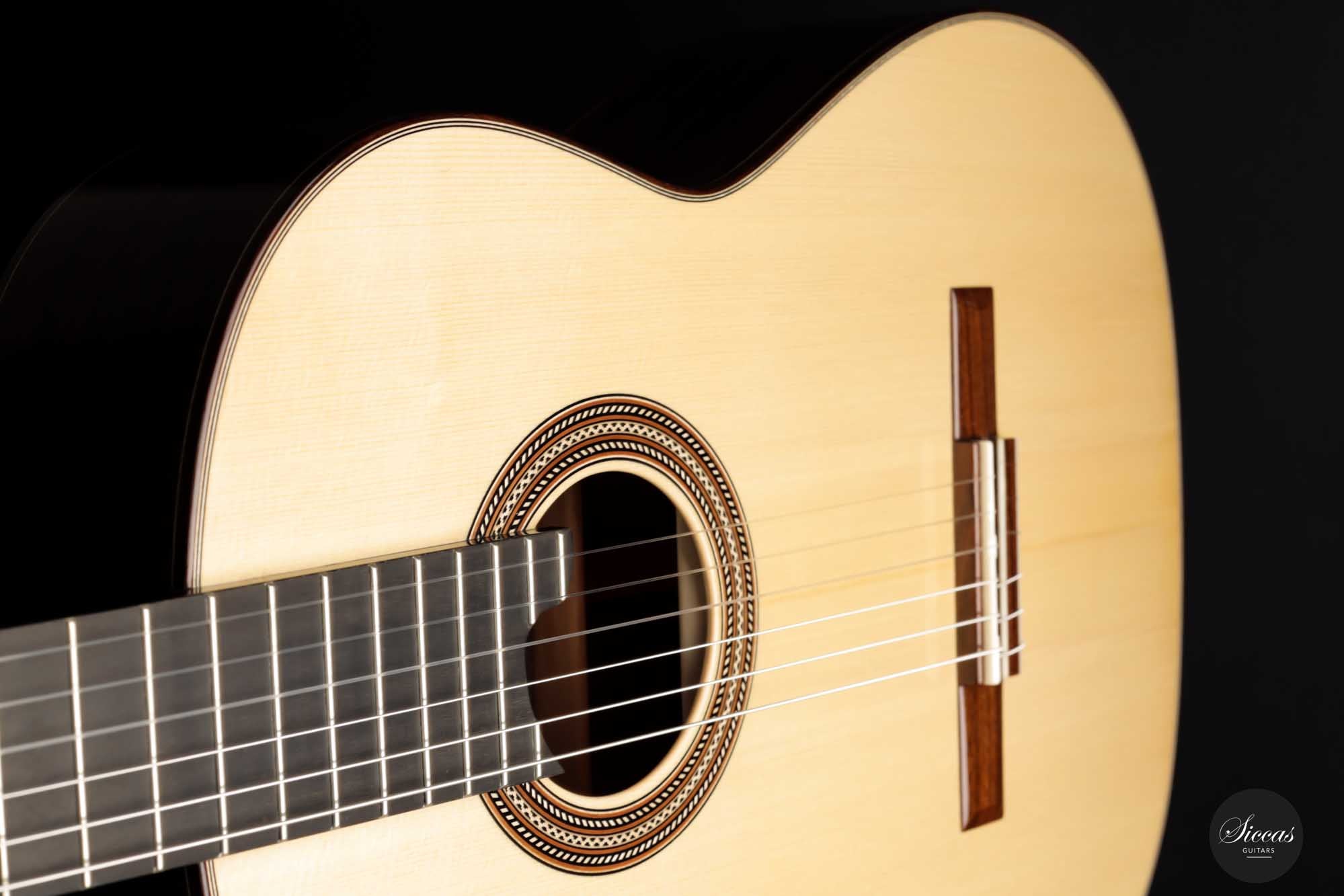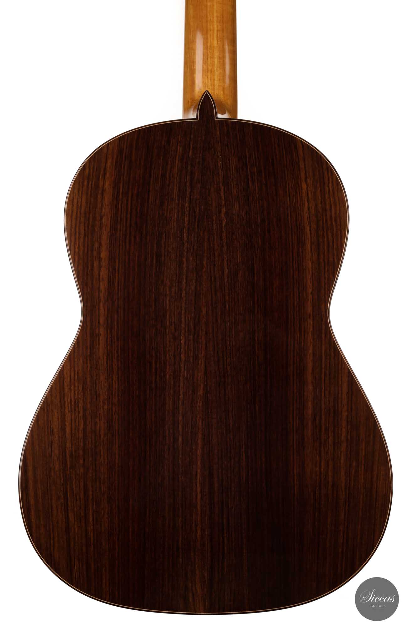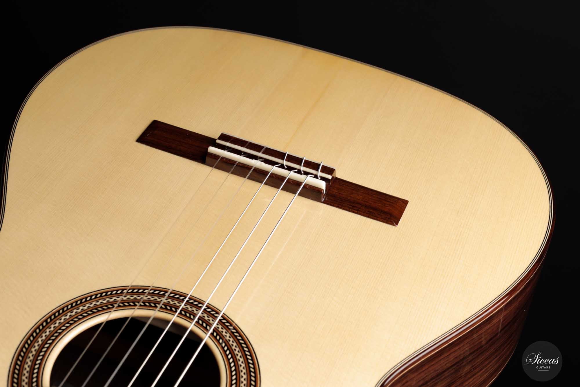 This particular guitar, number 69, has a spruce soundboard combined with Indian rosewood back and sides. Due to its setup and excellent design, this guitar responds beautifully to the player's hand, making it easy to play and maintaining total control of the instrument. Although it is a brand new guitar, it features a mature tonal quality, with warm, well-rounded trebles and deep, punchy, elegant basses.
