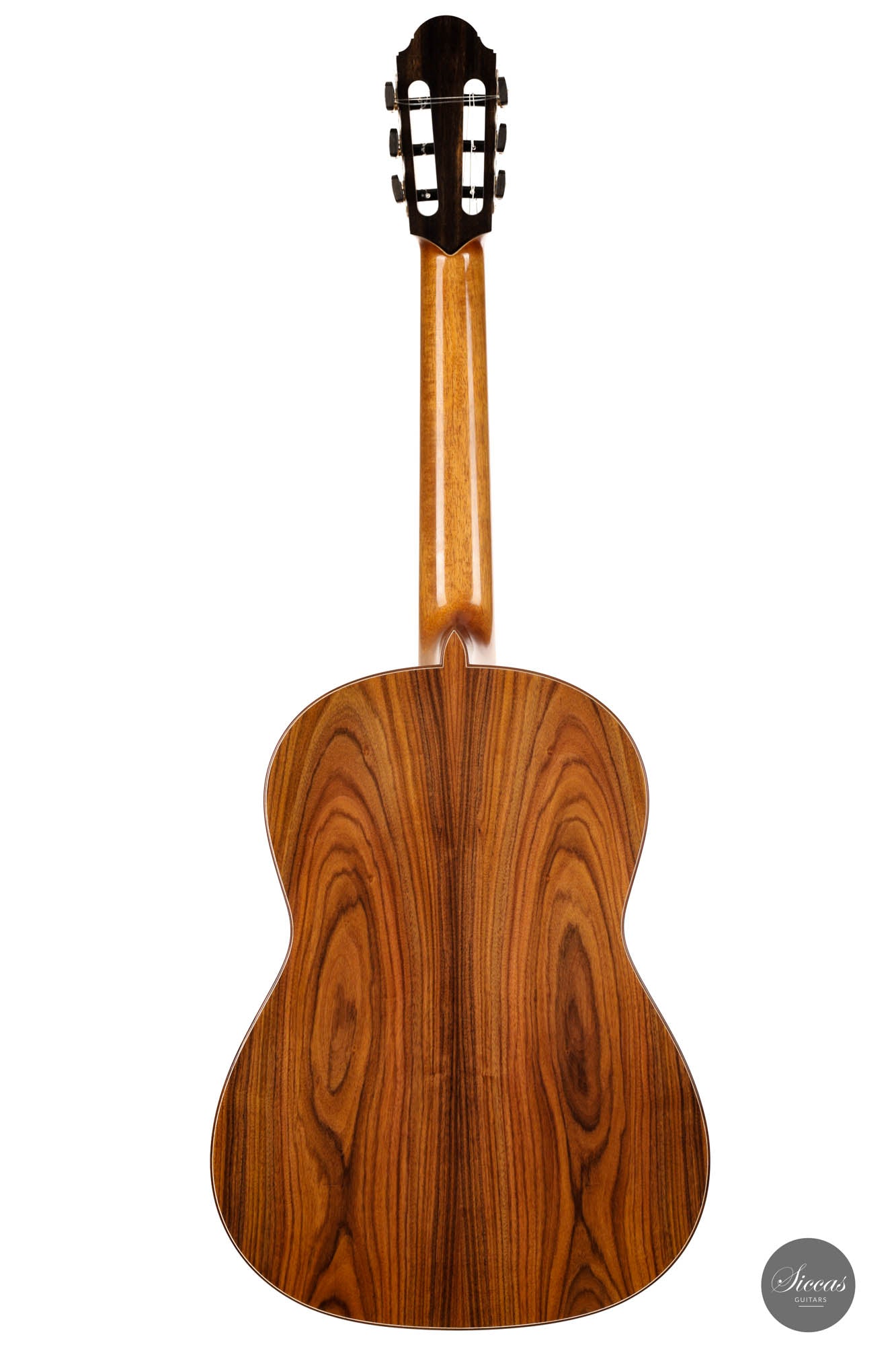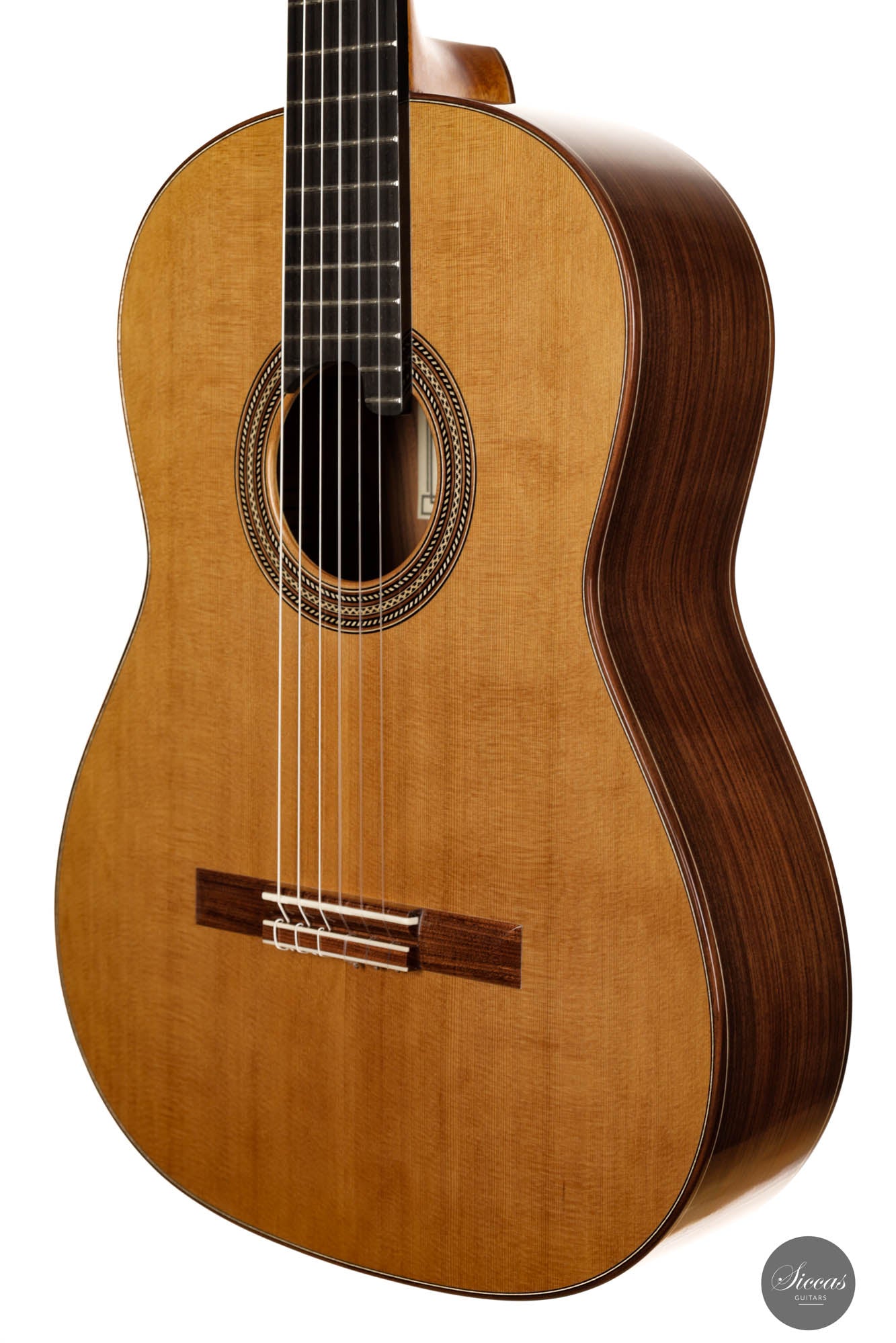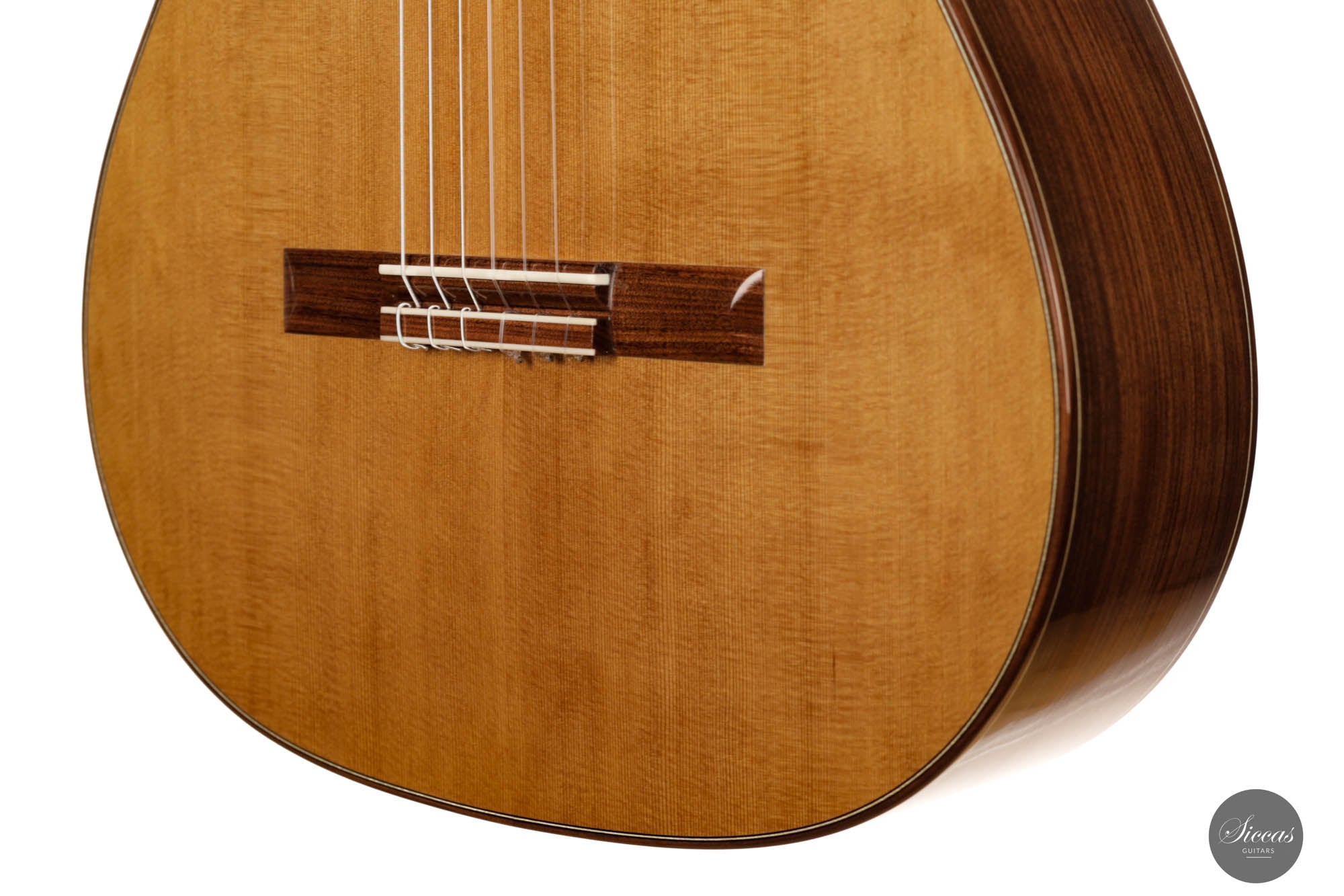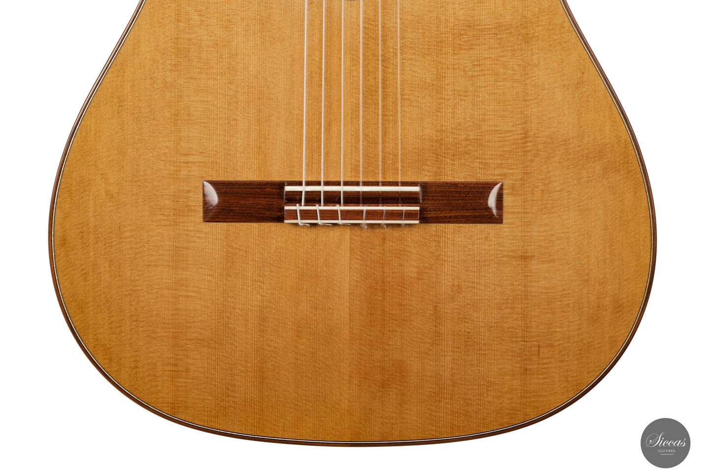 The 2023 Andrea Marcellan "Bombarda" No. 73 guitar, a remarkable instrument crafted with meticulous attention to detail and a passion for exceptional sound. This particular guitar showcases a perfect blend of traditional craftsmanship and modern innovation, resulting in a stunning piece that both beginners and seasoned players can appreciate. The No. 73 guitar boasts a soundboard constructed from high-quality cedar. This choice of wood contributes to the instrument's warm and expressive character, allowing every note to be imbued with a distinct sense of depth and soulfulness. Complementing the cedar soundboard are the Indian rosewood back and sides, known for their stability and rich tonal complexity. One of the most notable aspects of this guitar is its superb playability. The instrument has been expertly set up to ensure an effortless playing experience, allowing the guitarist to effortlessly navigate the fretboard and execute intricate techniques. The ergonomic design and meticulous craftsmanship enable the player to maintain complete control over the instrument, fostering a strong connection between the musician and their art. Despite being a brand new guitar, the No. 73 exhibits a mature tonal quality that belies its age. Its trebles possess a warmth and well-rounded nature that lend themselves to melodic passages, while the basses deliver a deep, punchy resonance that adds a layer of elegance to every performance. The guitar's tonal balance is carefully calibrated to offer a harmonious blend across the entire frequency range, ensuring that each note rings out with clarity and precision. Another standout feature of the No. 73 is its impressive volume. Whether playing in an intimate setting or on a grand stage, this guitar possesses the ability to fill any space with its resonant sound. From delicate nuances to powerful chords, the instrument accommodates a wide range of playing styles and musical genres, catering to the needs of guitarists across the spectrum. The 2023 Andrea Marcellan "Bombarda" No. 73 guitar represents a pinnacle of craftsmanship and tonal excellence. With its cedar soundboard, Indian rosewood back and sides, superb playability, and a mature tonal quality, this instrument promises an unforgettable playing experience. Whether you are a professional seeking a versatile and expressive companion or an aspiring guitarist in search of a high-quality instrument to fuel your musical journey, the No. 73 guitar is poised to meet and exceed your expectations.