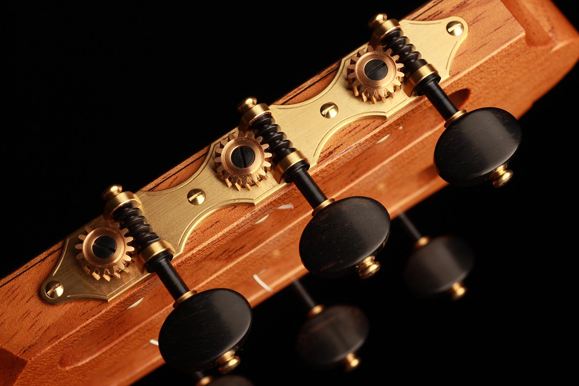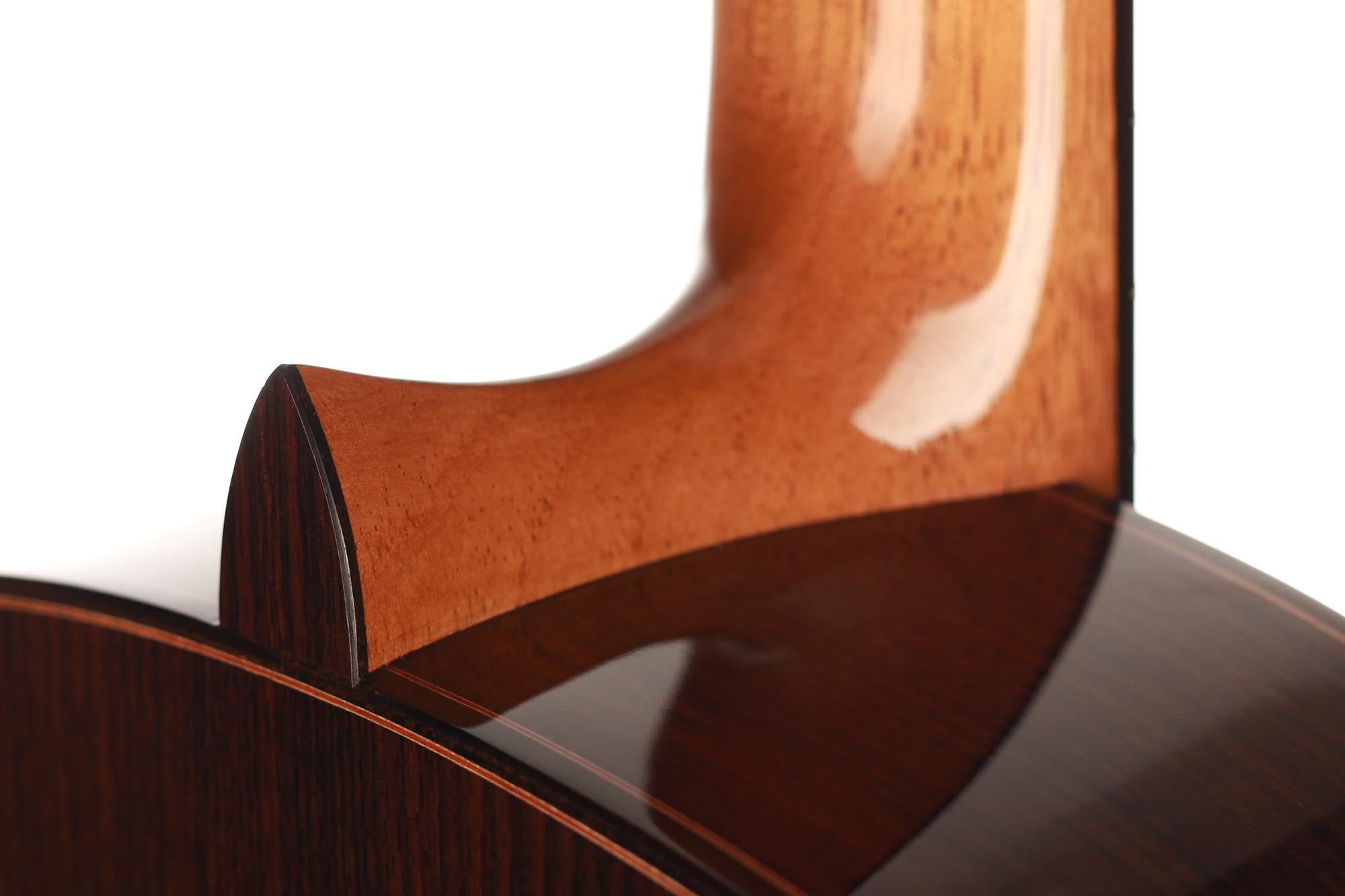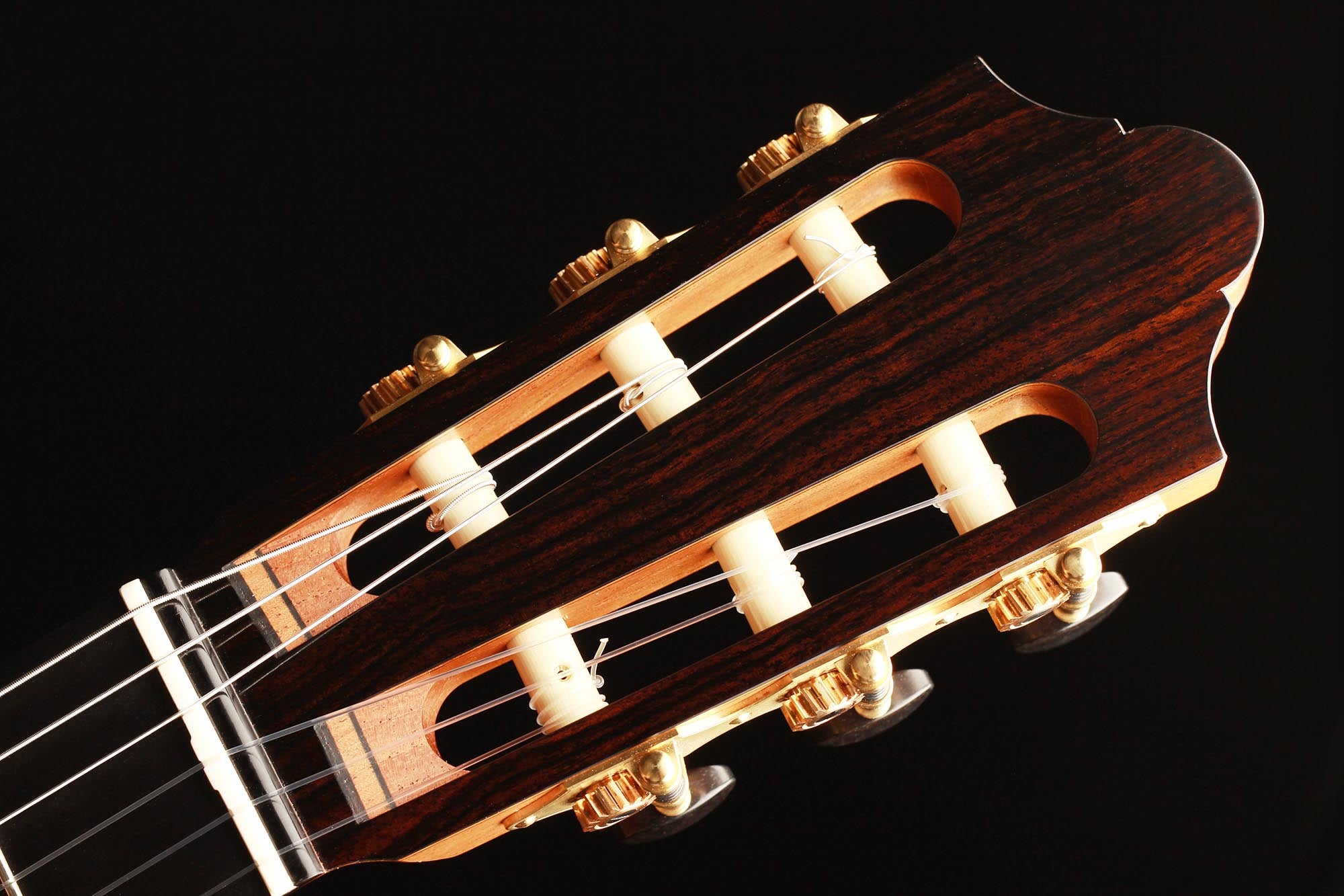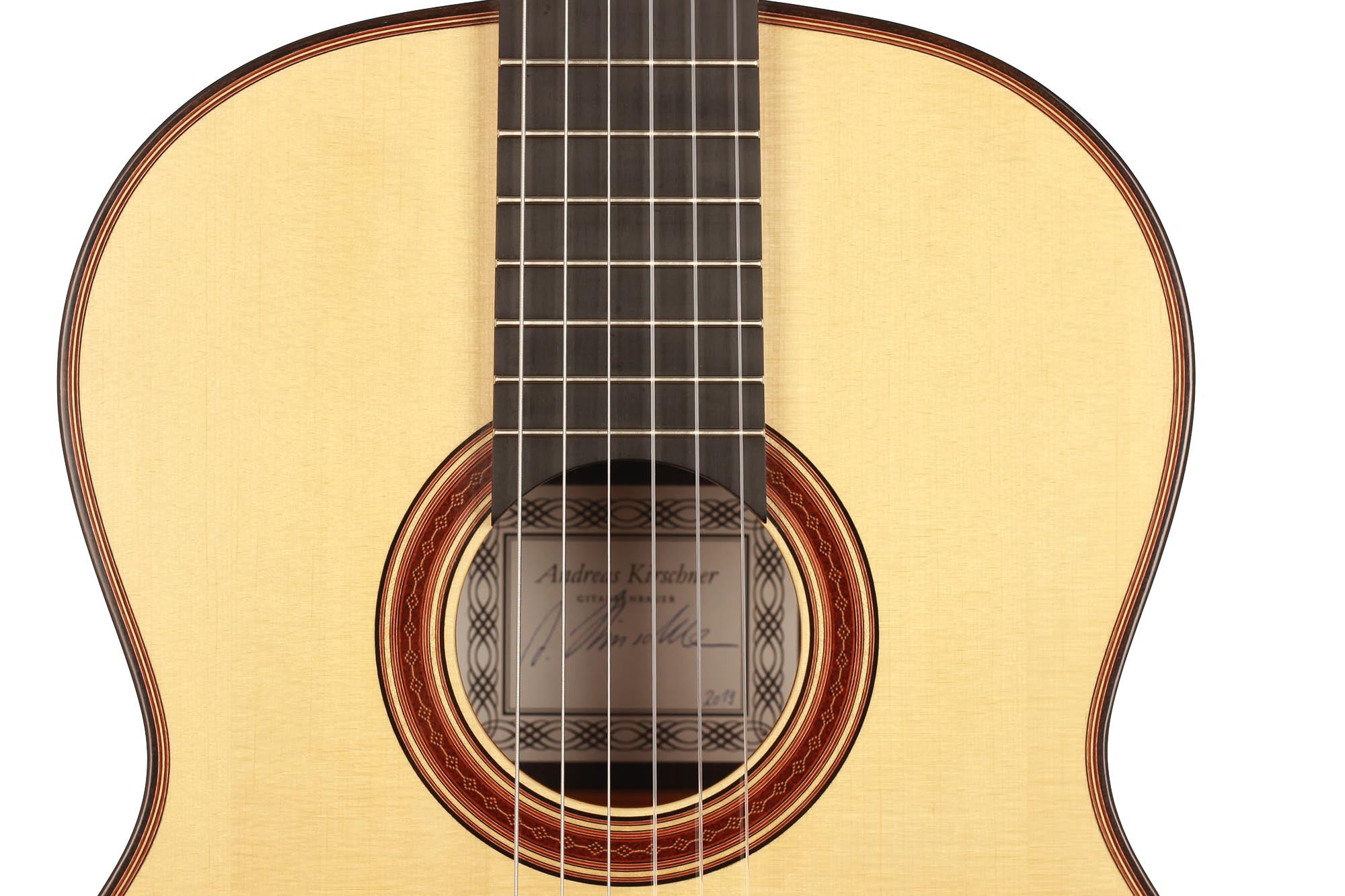 This 2019 spruce double-top guitar came directly from A. Kirschner’s workshop. It is astonishing how little effort one needs to put into the right hand when playing this guitar, in order to produce a room-filling tone. The player has the feeling to be surrounded by the sound of this instrument. It also has a nice and consistent sustain over the registers, making this guitar a very balanced instrument. The richness of sound-colours is very impressive and minimal right-hand motion open whole new sound-possibilities. The high-quality Scheller tuners fit perfectly to this guitar and round off the overall picture of this outstanding instrument very nicely.