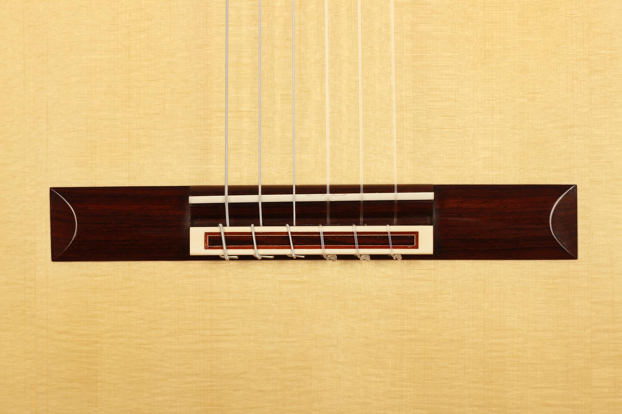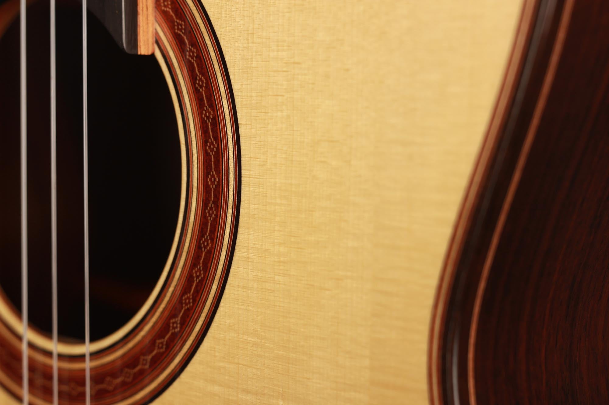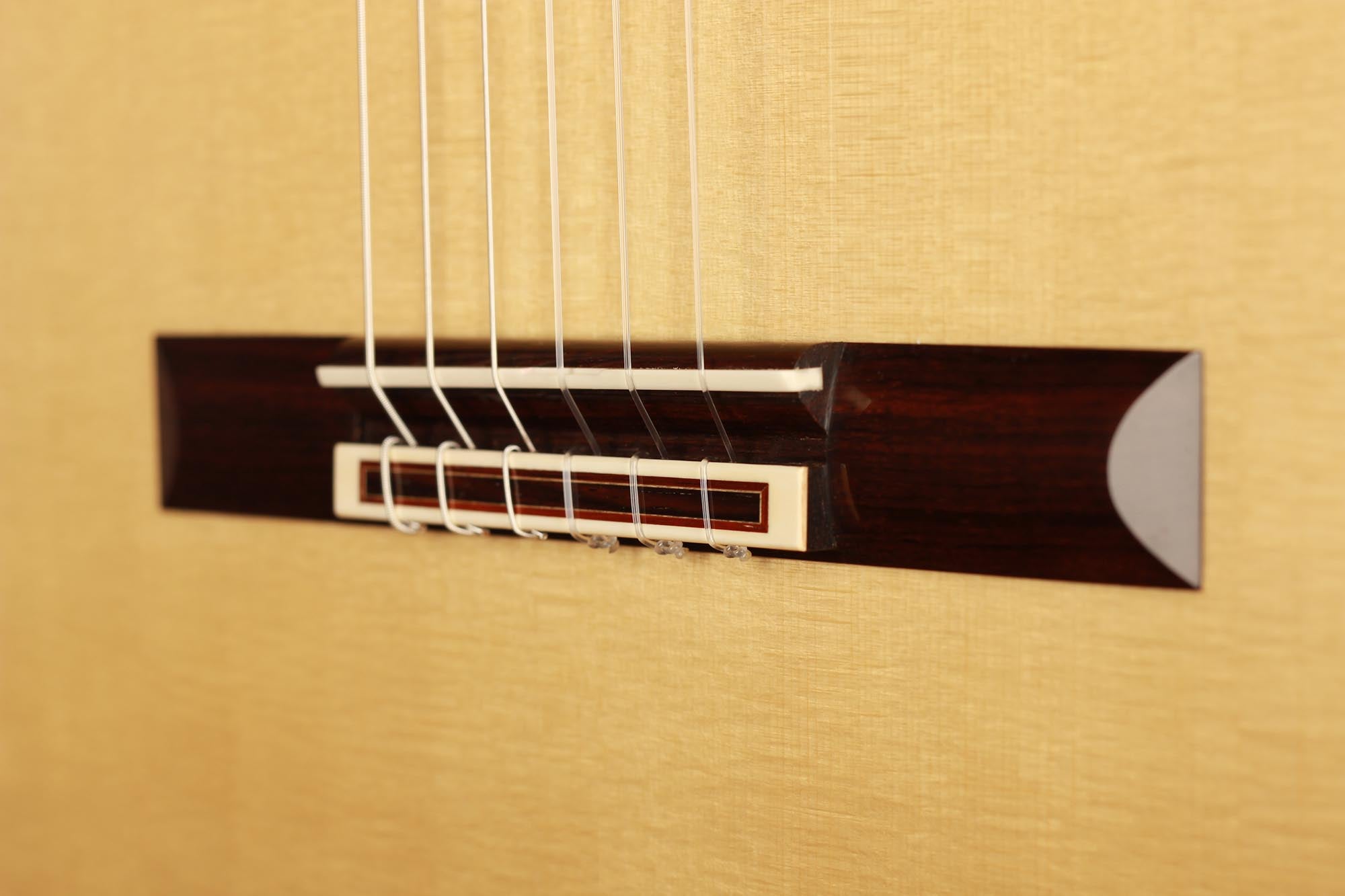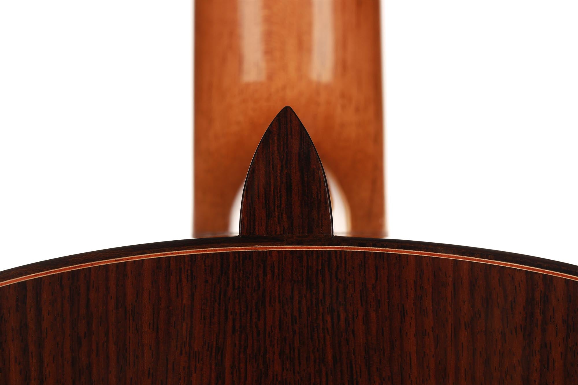This 2019 spruce double-top guitar came directly from A. Kirschner’s workshop. It is astonishing how little effort one needs to put into the right hand when playing this guitar, in order to produce a room-filling tone. The player has the feeling to be surrounded by the sound of this instrument. It also has a nice and consistent sustain over the registers, making this guitar a very balanced instrument. The richness of sound-colours is very impressive and minimal right-hand motion open whole new sound-possibilities. The high-quality Scheller tuners fit perfectly to this guitar and round off the overall picture of this outstanding instrument very nicely.