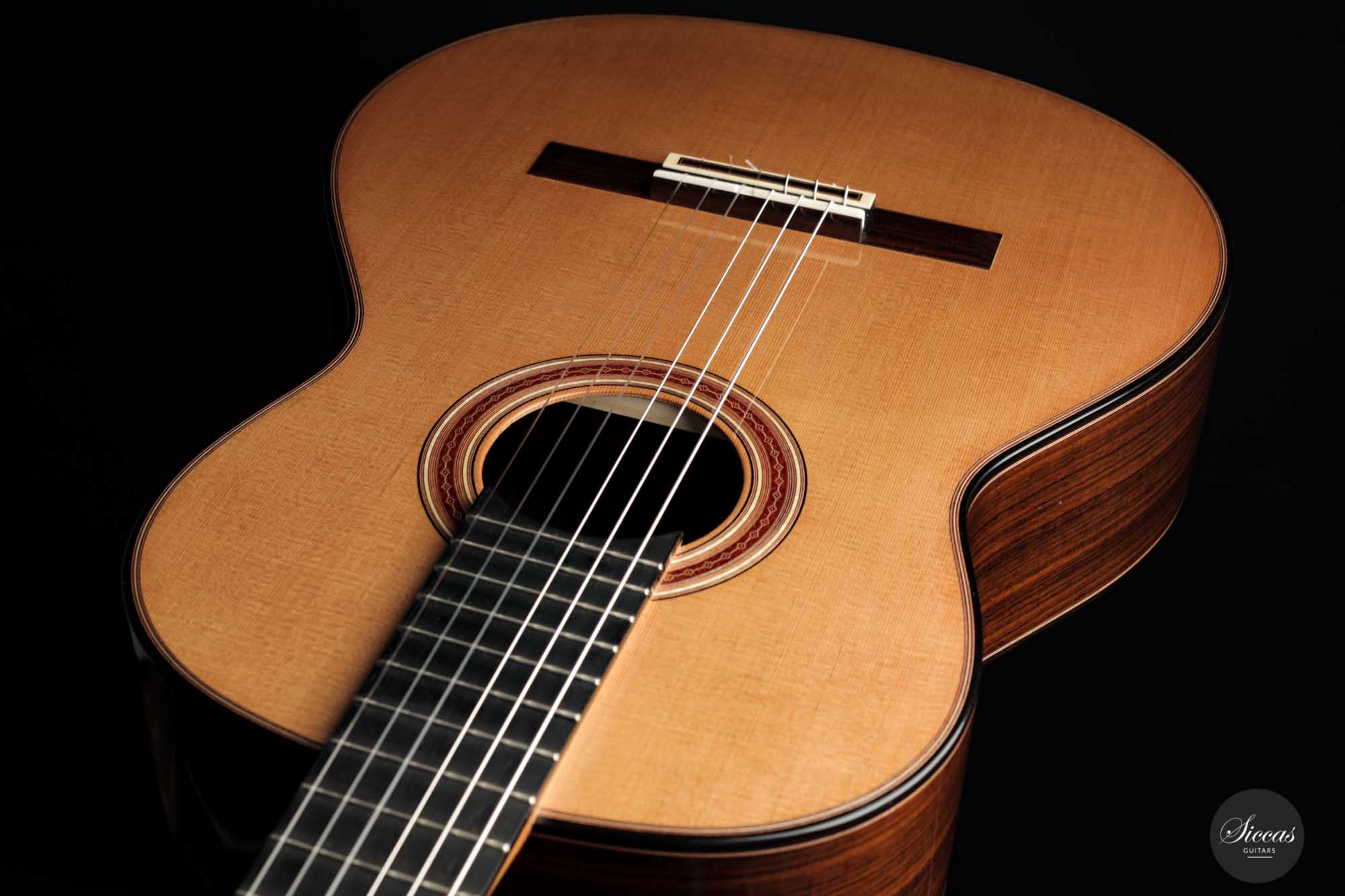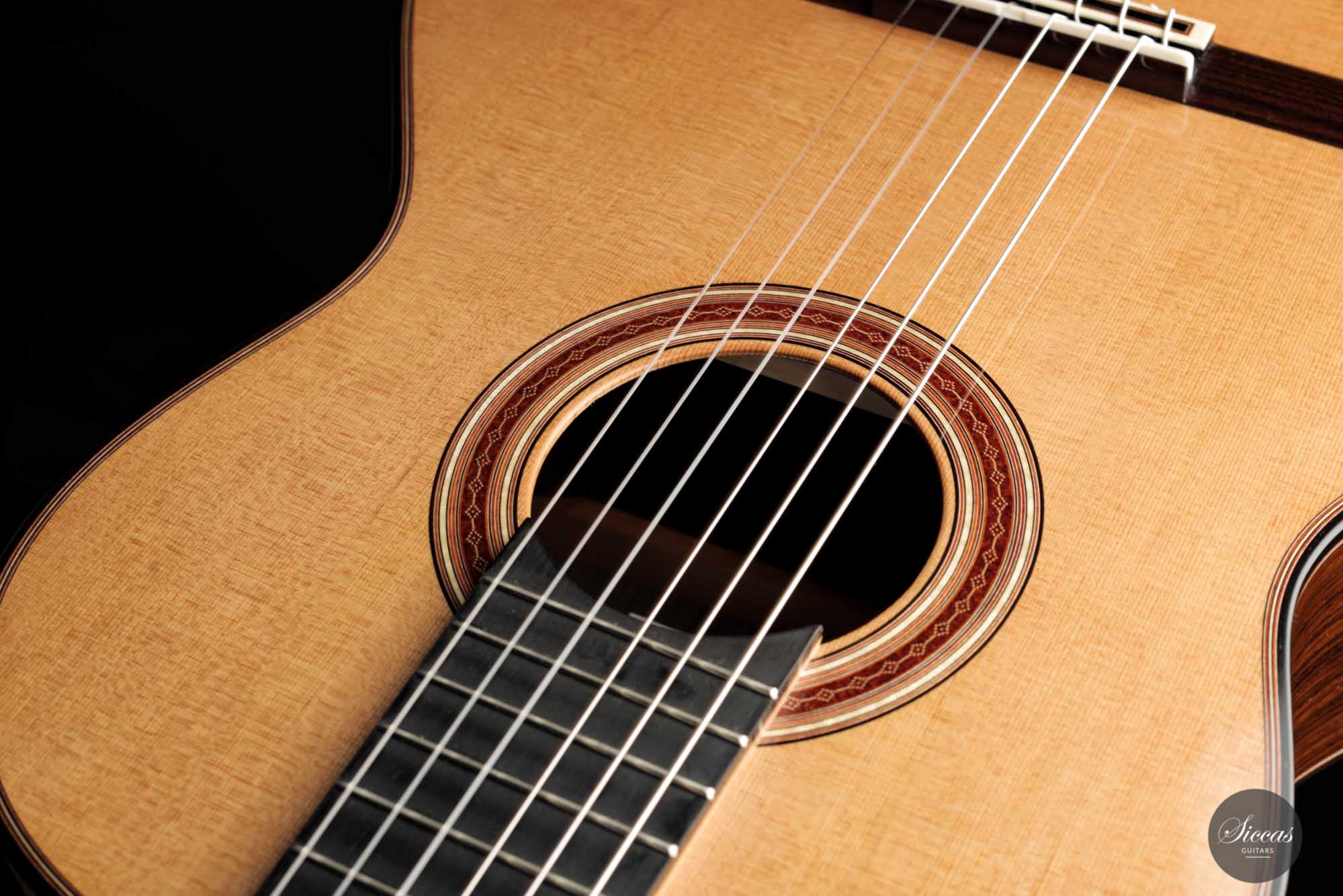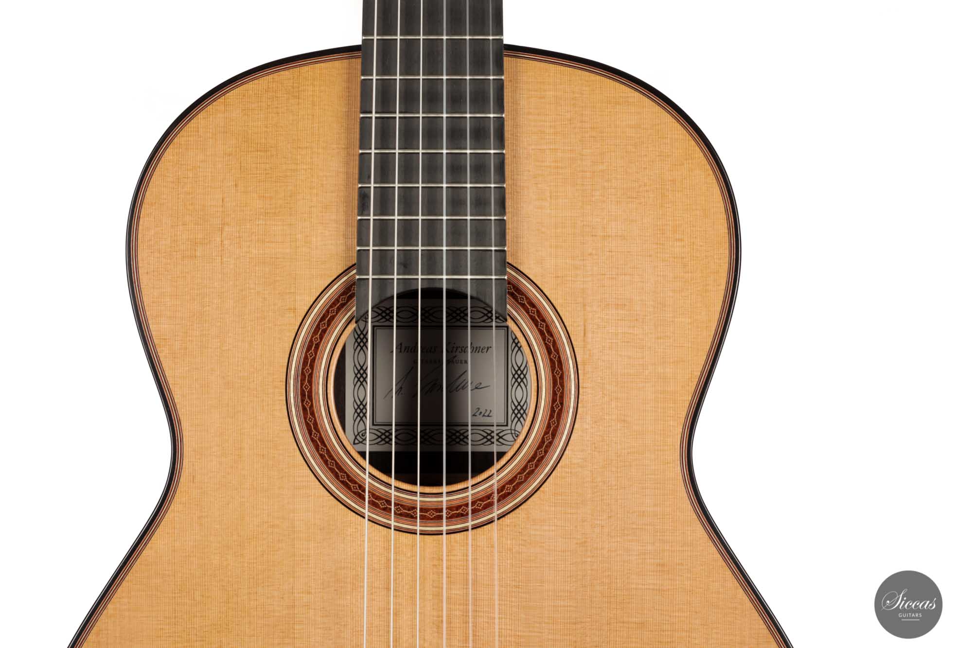 Andreas Kirschner’s guitars are easily recognizable by their beautiful red rosette, the authentic shade of the spruce top, and the Daniel Friederich-like head shape. Also noteworthy are the fine and well-rounded neck and the slightly raised fingerboard, which provide excellent playability.