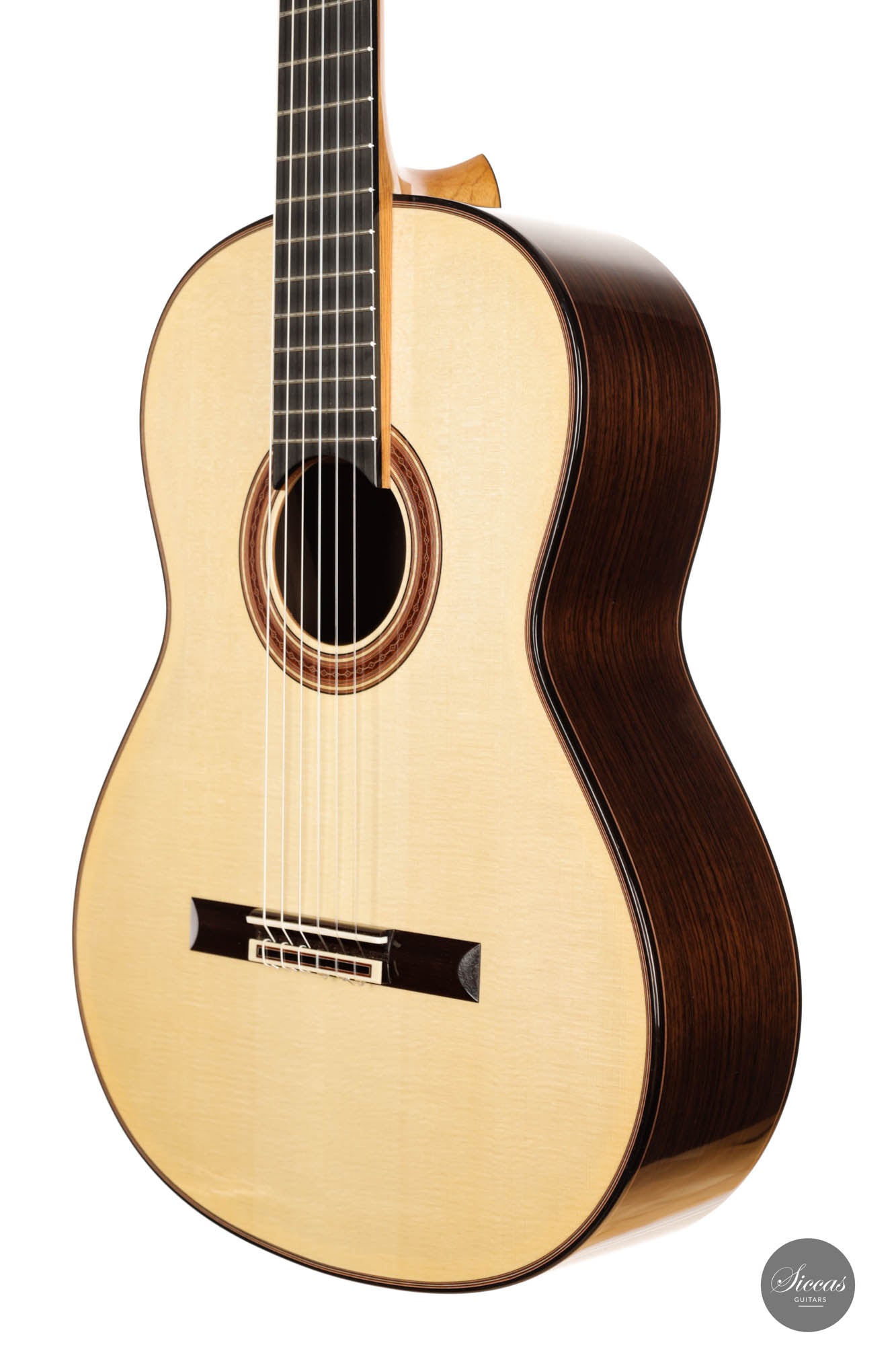 The guitar's external soundboard, made of highest quality of spruce, is paired with an inner layer of rich cedar, resulting in an enchanting tonal balance. This double-top configuration not only ensures a powerful sound projection but also contributes to the instrument's vibrant tonal nuances.