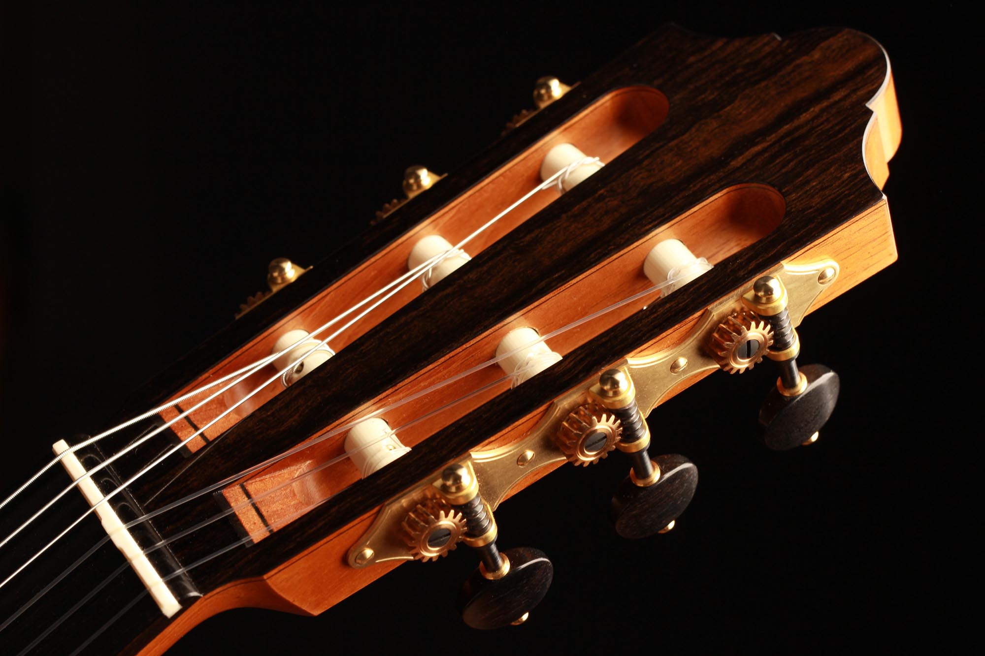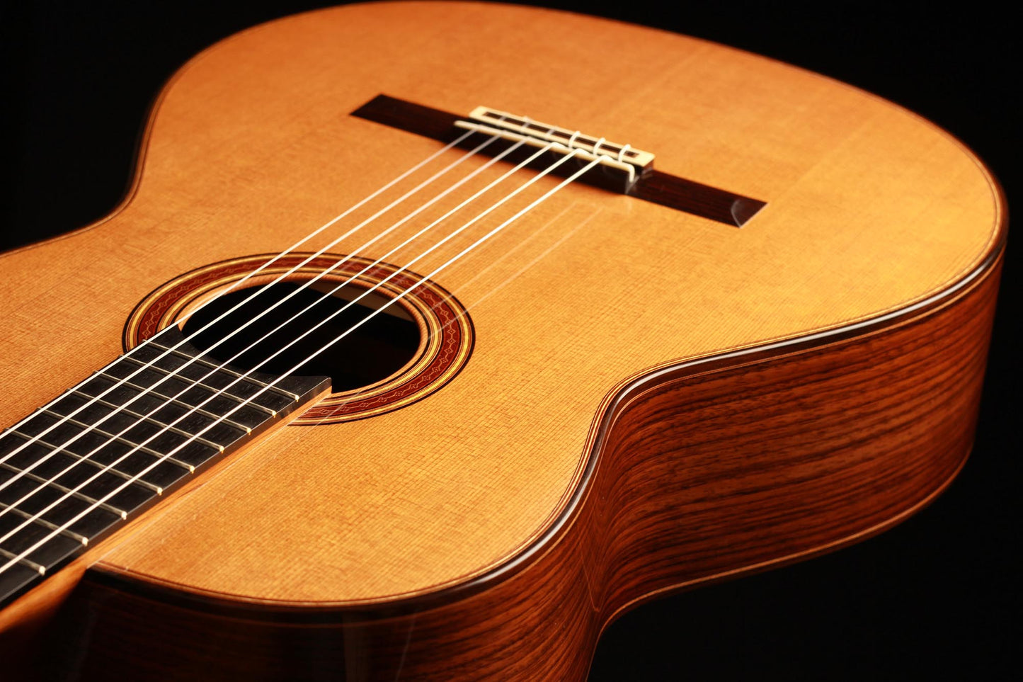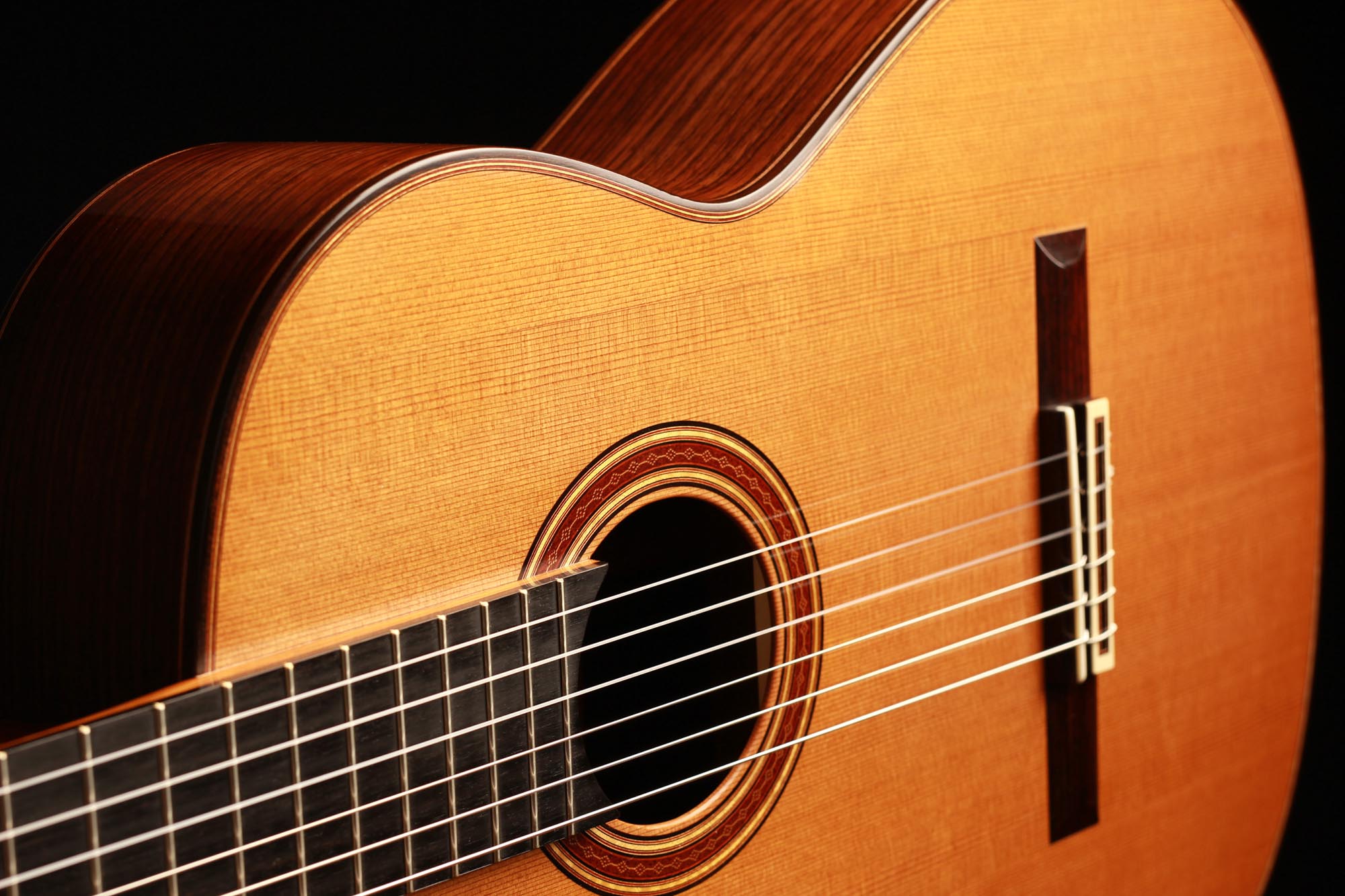 This 2018 cedar double-top guitar came directly from A. Kirschner’s workshop. Only a few notes are enough to identify the incredible tone qualities of this guitar. It has rich developing overtones and great volume. The sustain is nice and consistent all over the registers, making this guitar a very balanced instrument. The richness of colour is very impressive and minimal right-hand motion open whole new possibilities. Scheller tuners are insuring a very stable tune and show that all the details of this guitar were really brought to the best level.