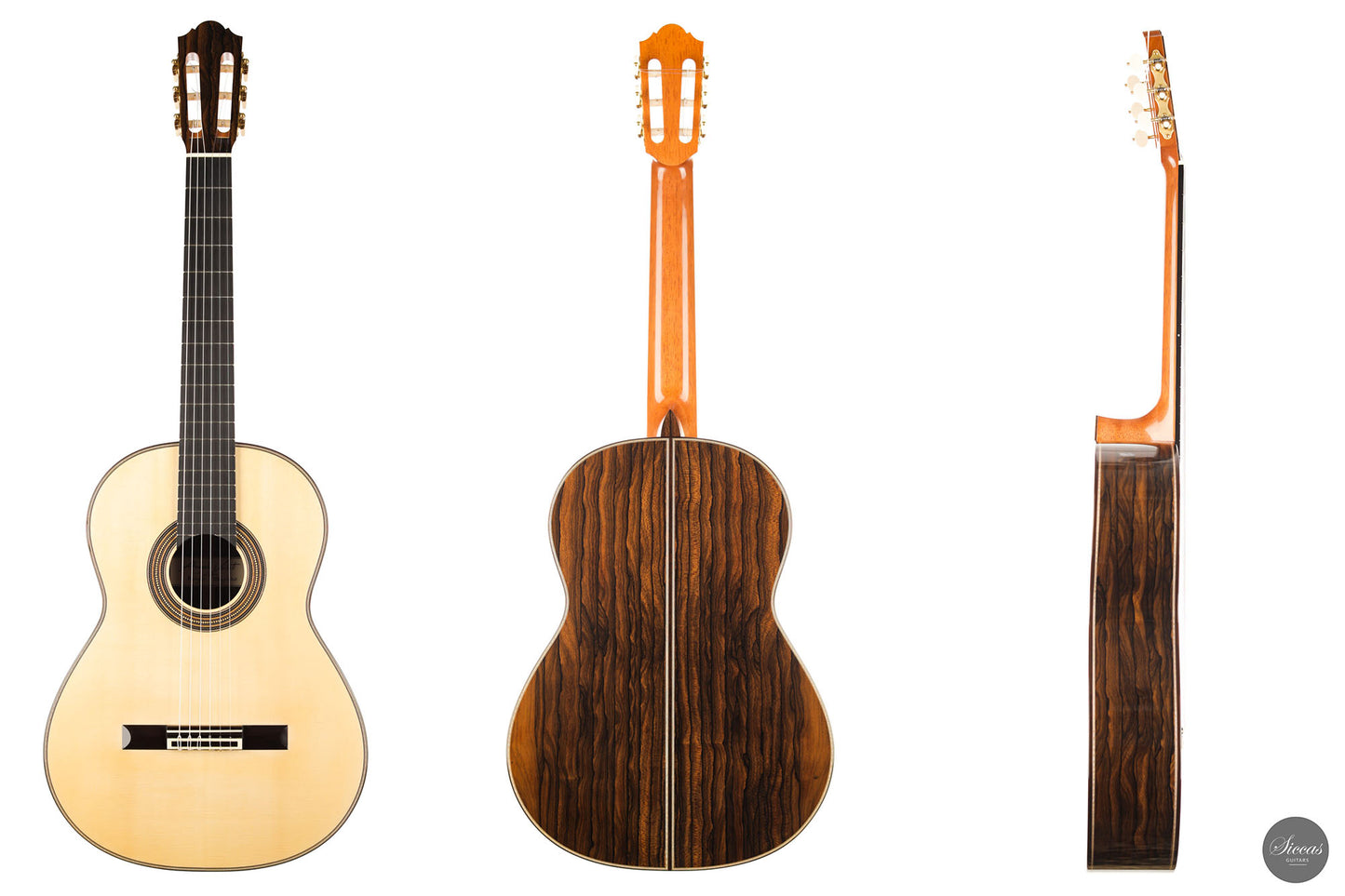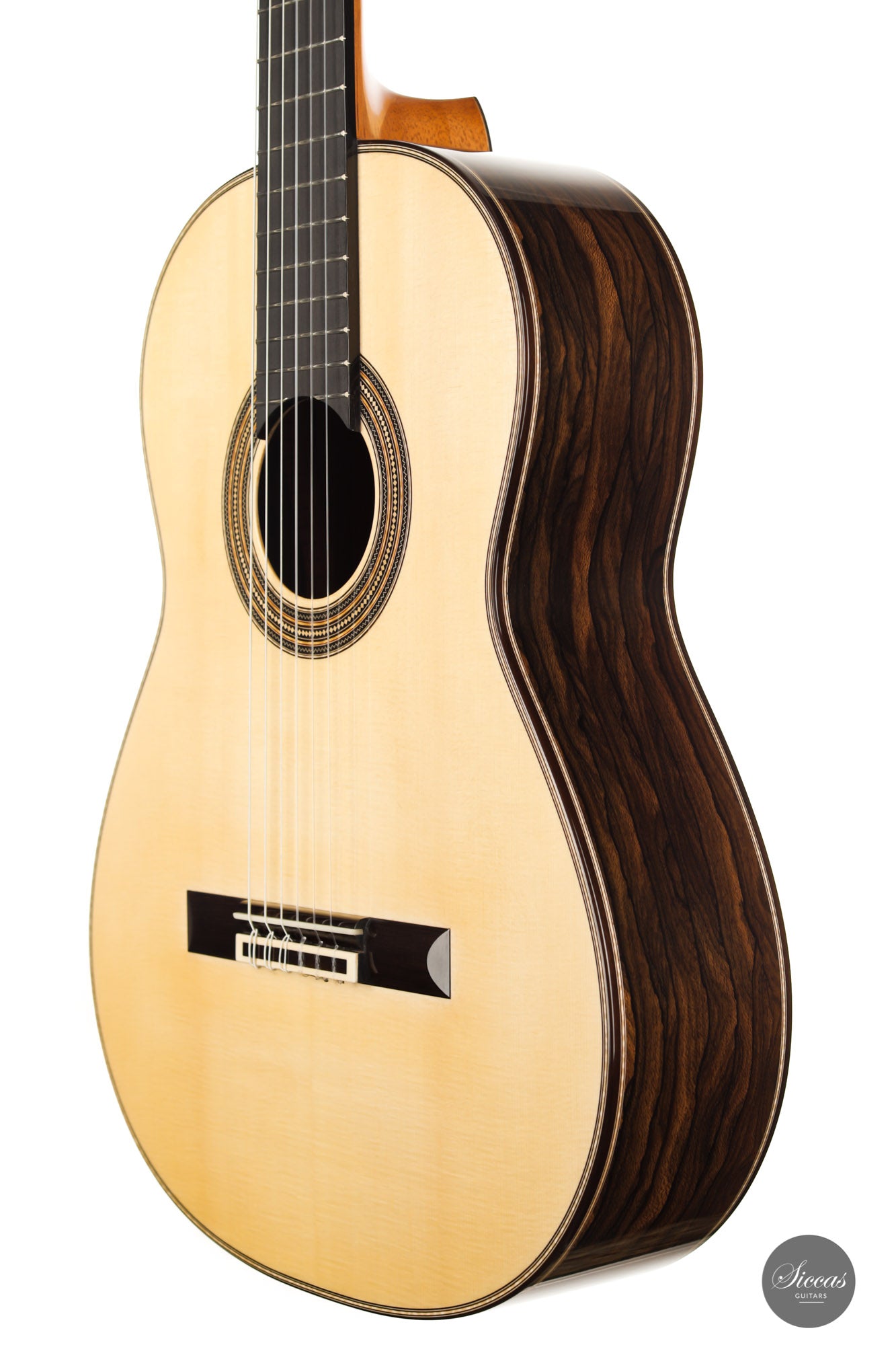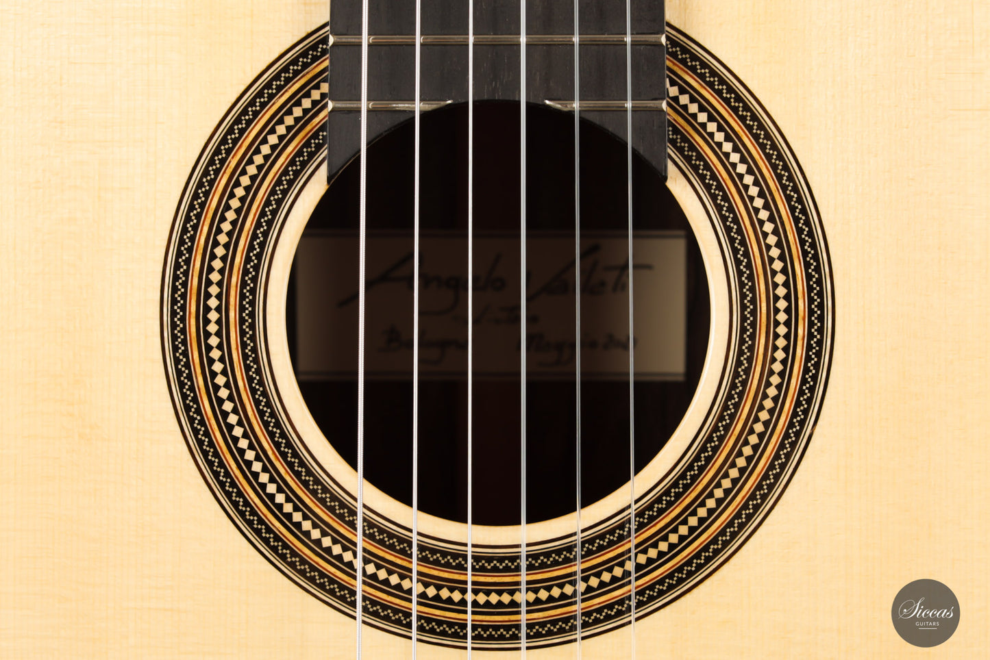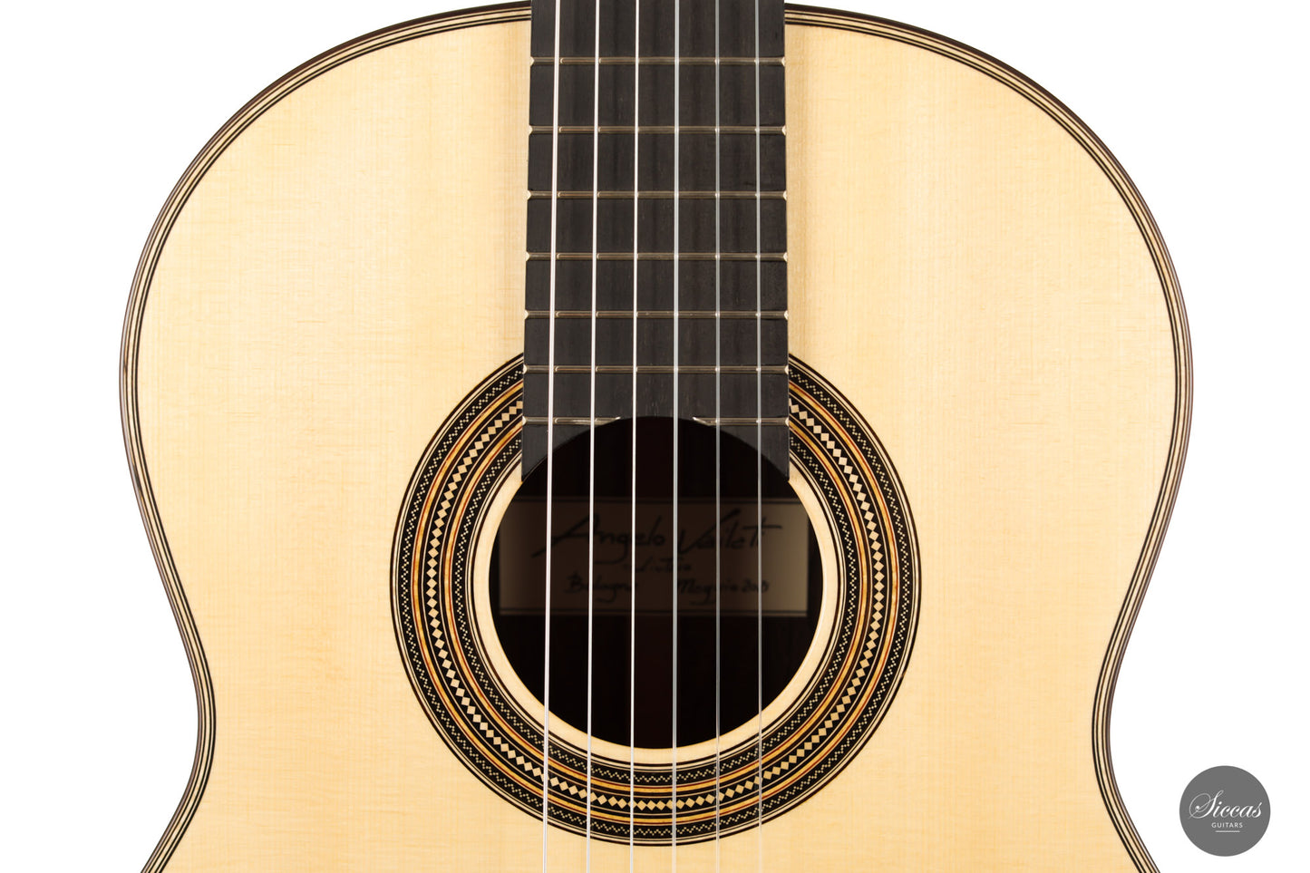 What a brilliant guitar, certainly one of the most refined instruments we've seen from Angelo. With its captivating Ziricote back and sides and natural coloured spruce top, its elegance is just stunning. Angelo Vailati chose a lightweight Italian "Val di Fiemme" spruce top for this instrument, which he fitted with a traditional five-fan bracing. The result is a glass-clear, pure and dynamic sound. Overtone-rich and eelegant sympathetic resonances bring additional tonal richness to the trebles, and powerful basses perfectly round up the sound of this guitar.