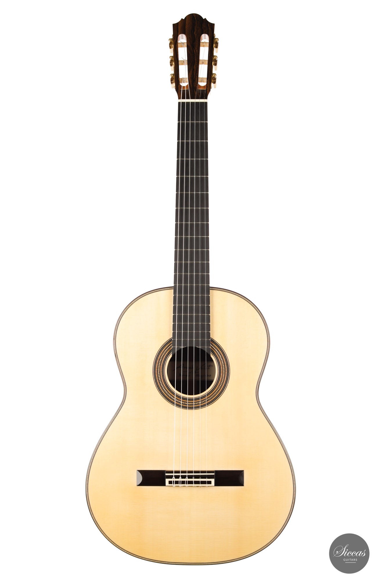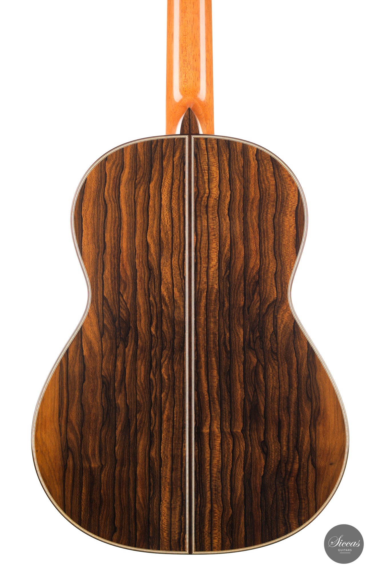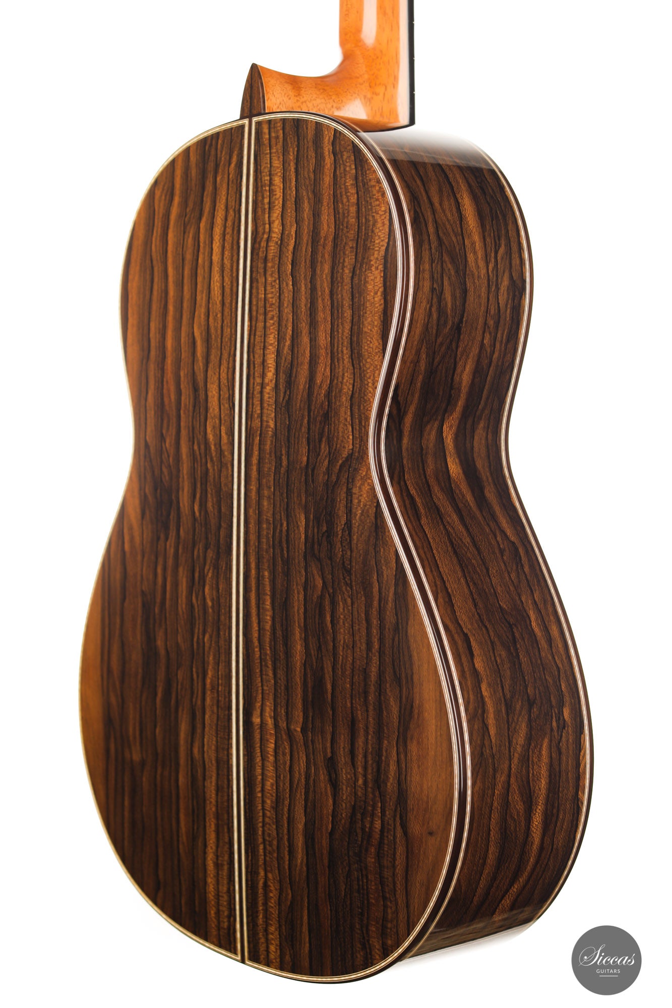 What a brilliant guitar, certainly one of the most refined instruments we've seen from Angelo. With its captivating Ziricote back and sides and natural coloured spruce top, its elegance is just stunning. Angelo Vailati chose a lightweight Italian "Val di Fiemme" spruce top for this instrument, which he fitted with a traditional five-fan bracing. The result is a glass-clear, pure and dynamic sound. Overtone-rich and eelegant sympathetic resonances bring additional tonal richness to the trebles, and powerful basses perfectly round up the sound of this guitar.