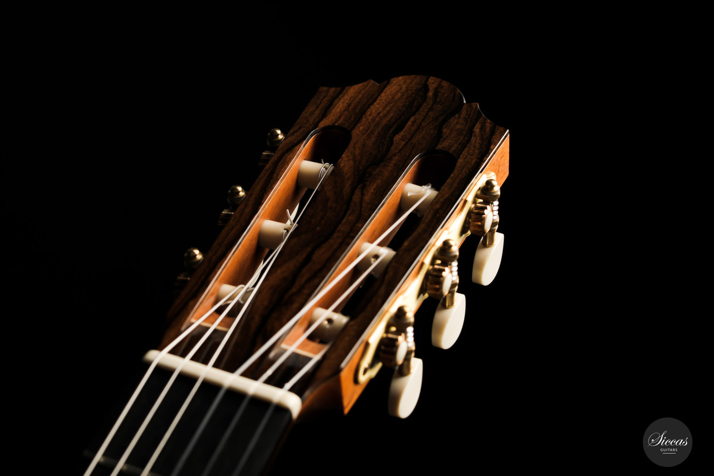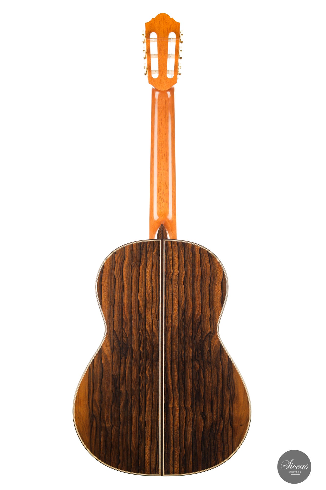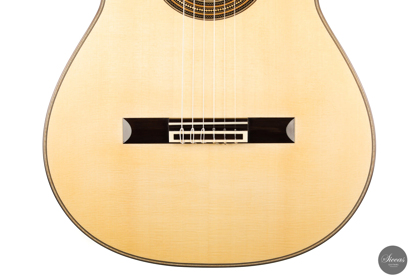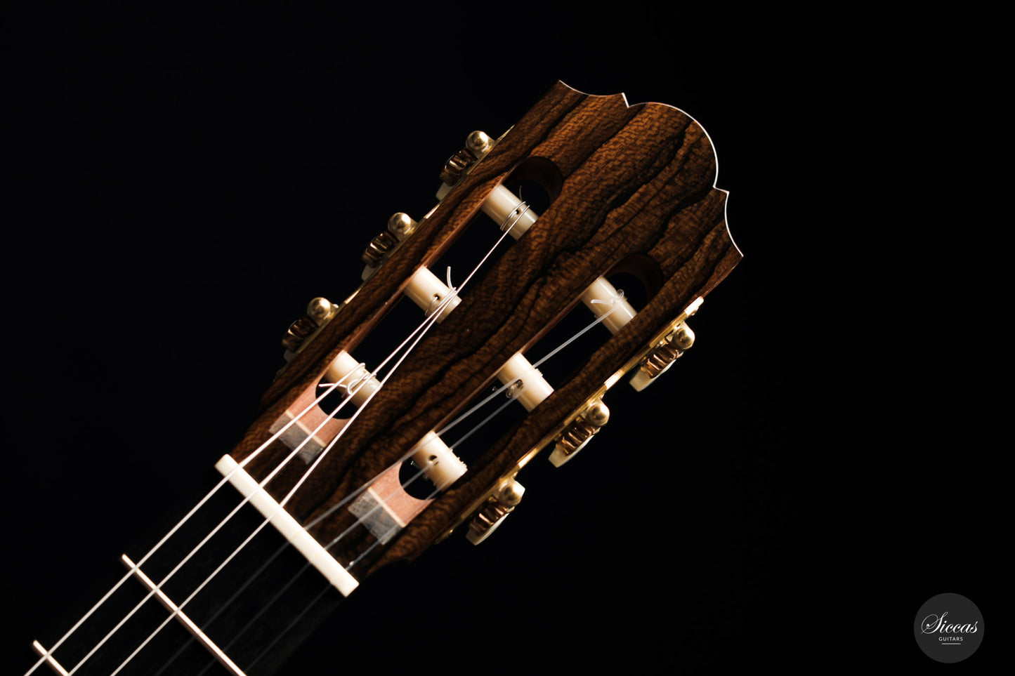 What a brilliant guitar, certainly one of the most refined instruments we've seen from Angelo. With its captivating Ziricote back and sides and natural coloured spruce top, its elegance is just stunning. Angelo Vailati chose a lightweight Italian "Val di Fiemme" spruce top for this instrument, which he fitted with a traditional five-fan bracing. The result is a glass-clear, pure and dynamic sound. Overtone-rich and eelegant sympathetic resonances bring additional tonal richness to the trebles, and powerful basses perfectly round up the sound of this guitar.