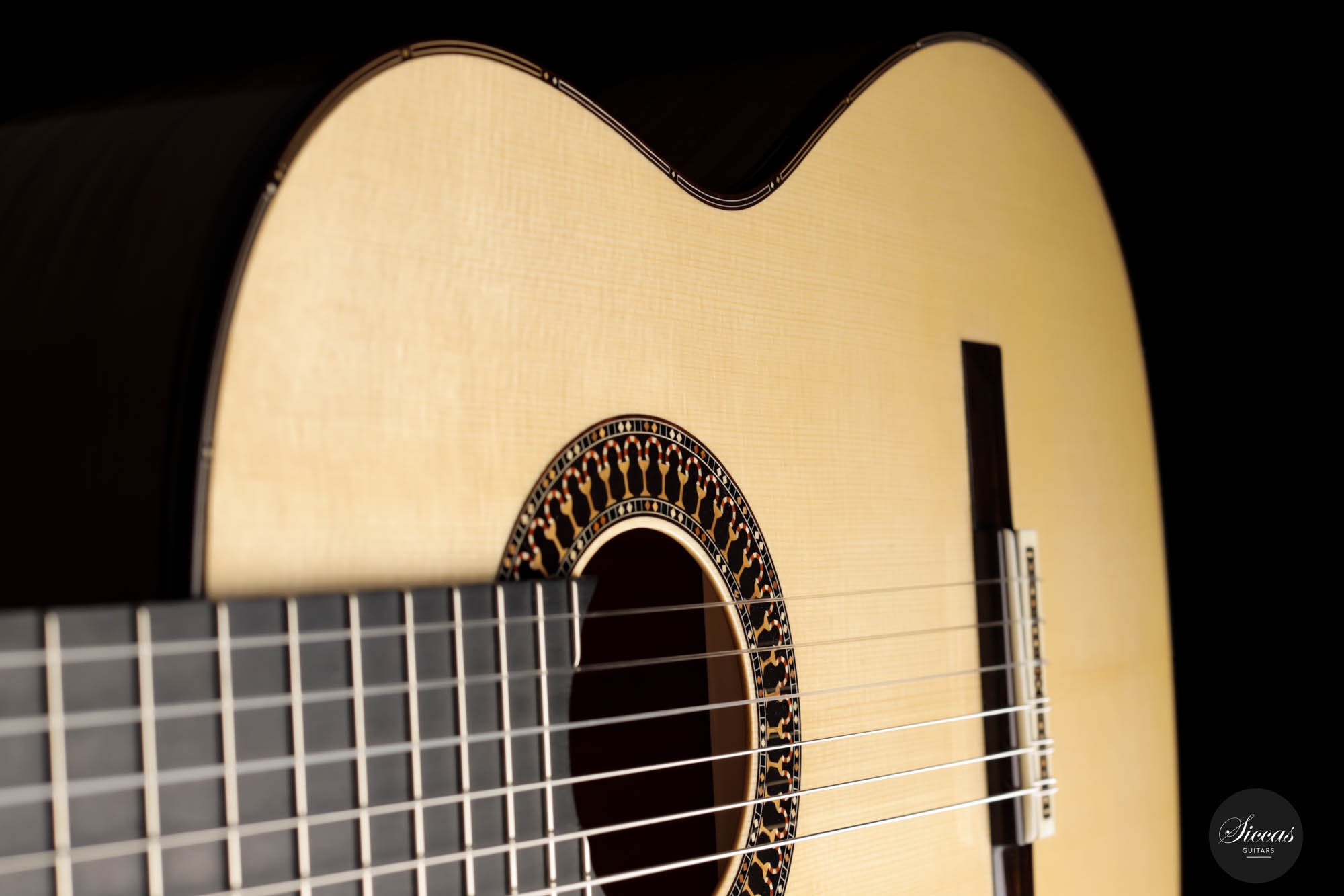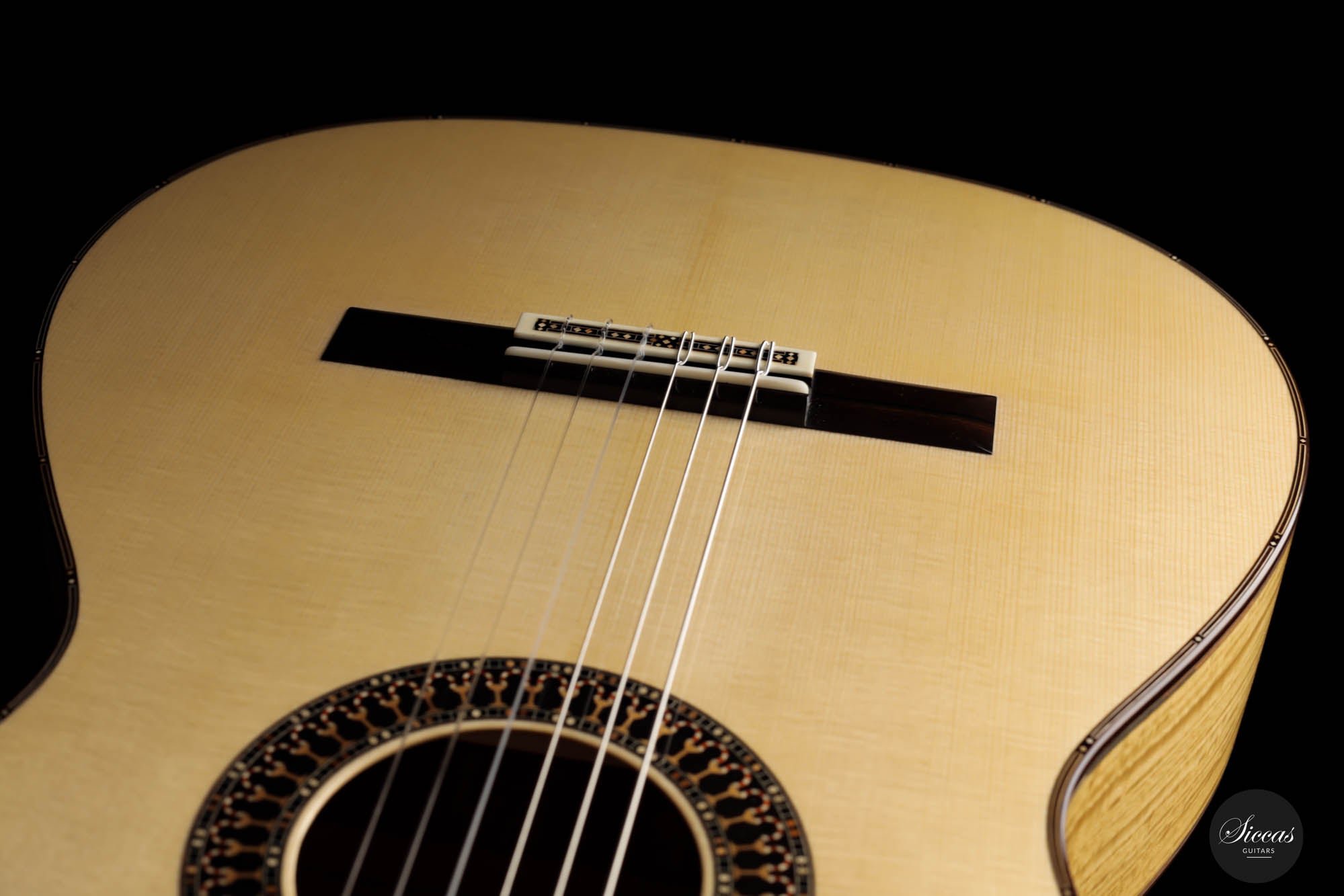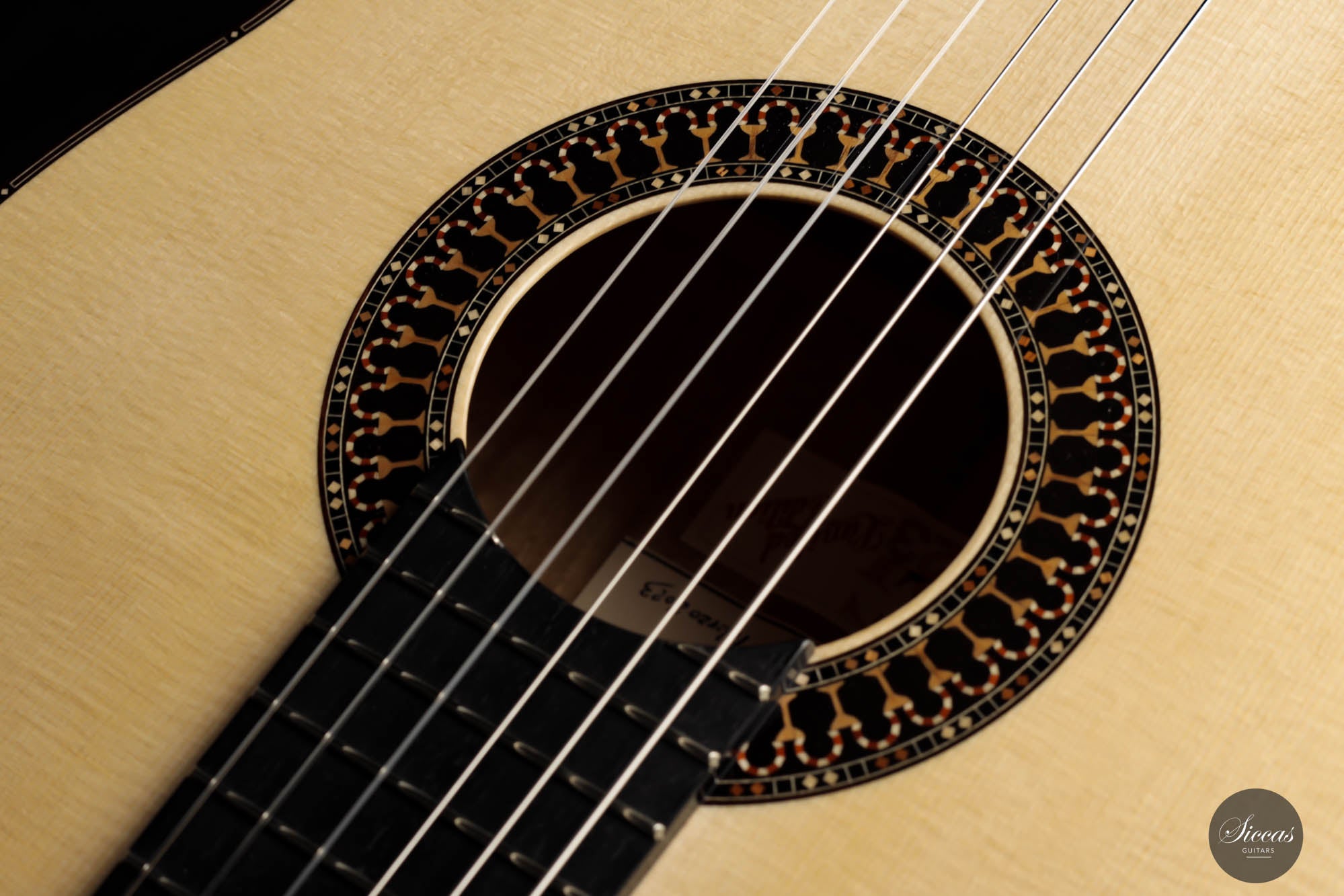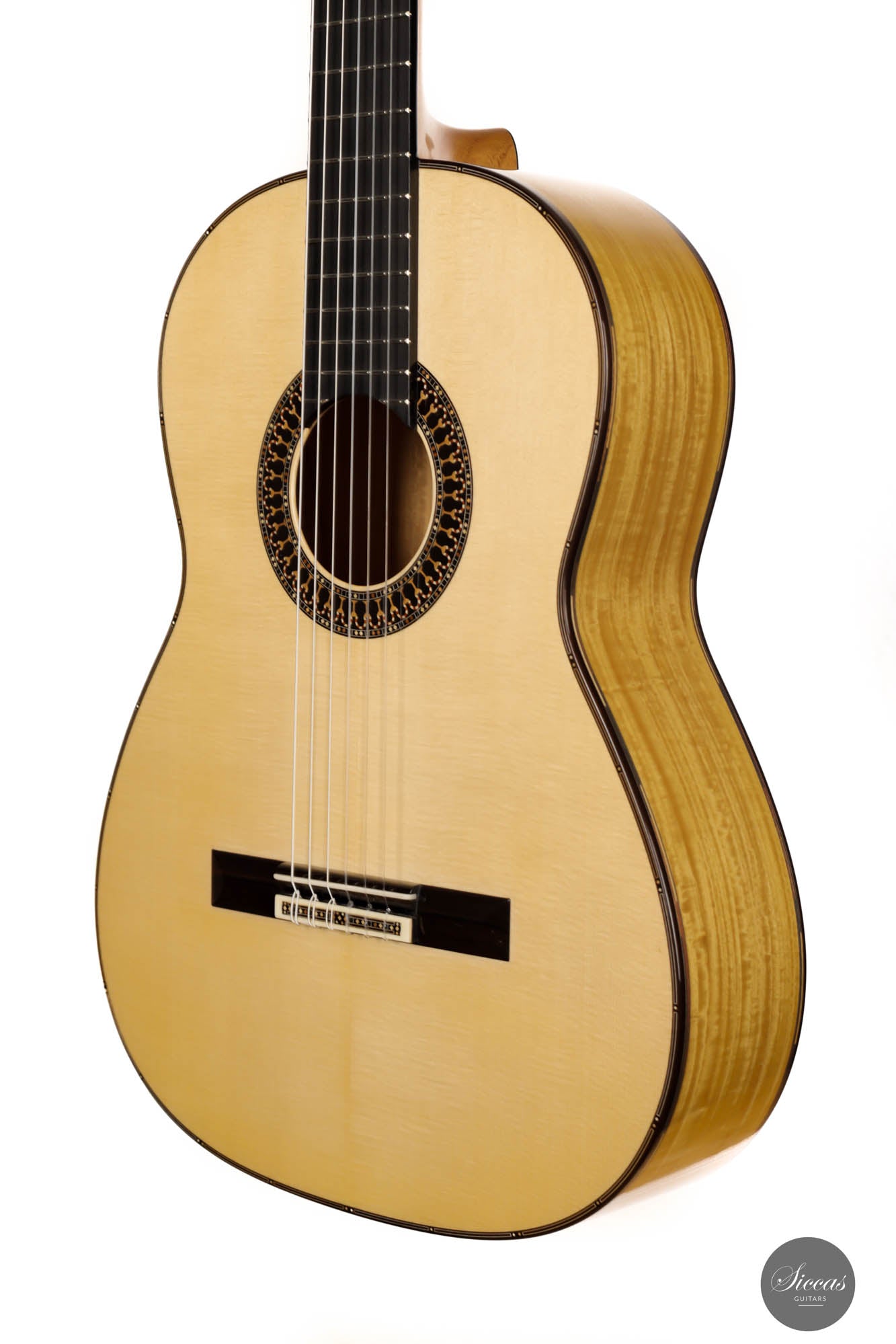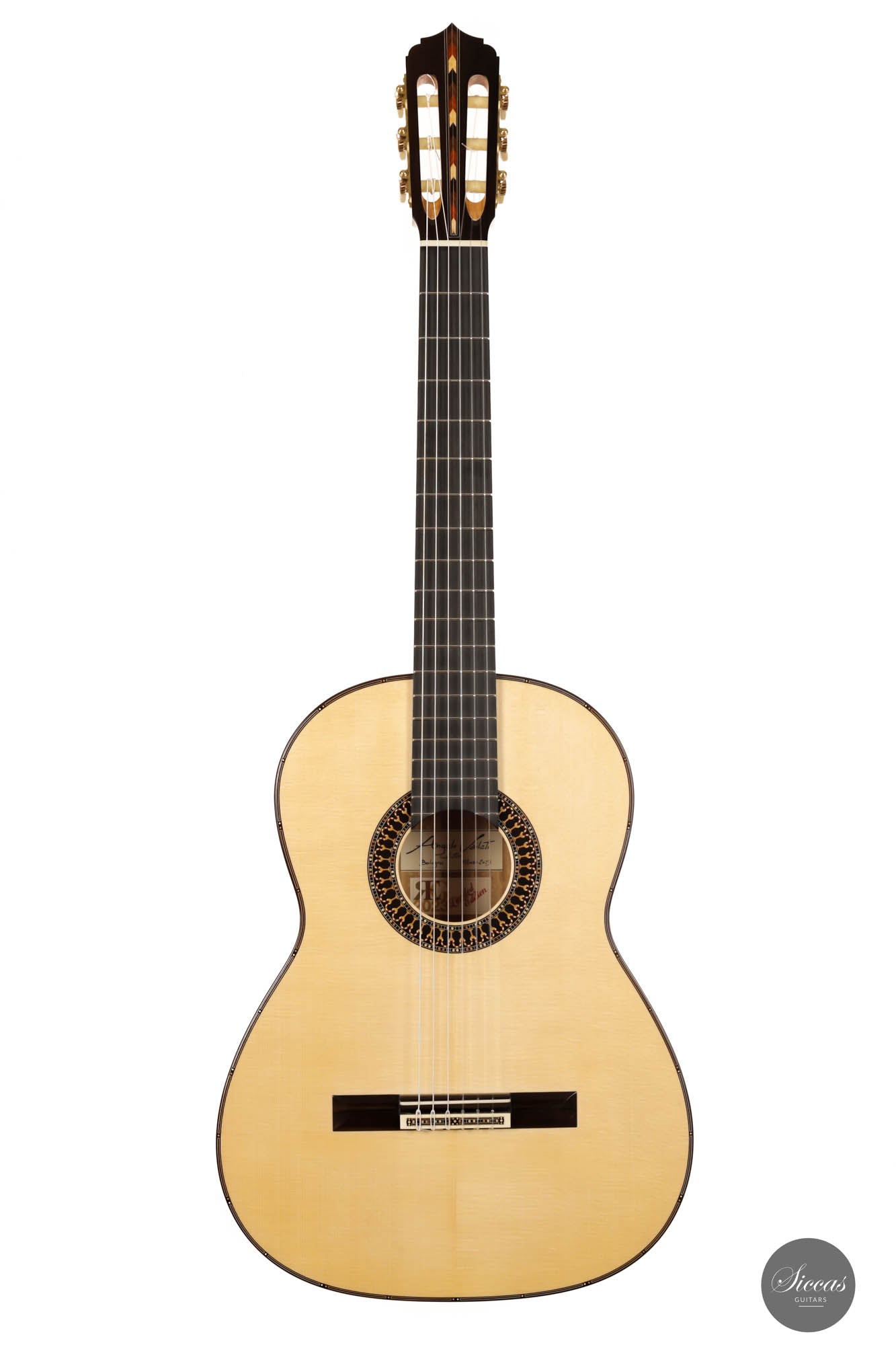 Unravel the unique characteristics of this guitar; a resonant Austrian spruce soundboard, striking Satinwood back, and sides, plus an enchanting flamed cedar neck. Its intricate headstock decoration takes inspiration from the 2005 Jose L. Romanillos masterpiece, "La Amistad". Adding a touch of opulence, the golden satinwood back is adorned with a replica of the Romanillos "La Adelita 1997" design.