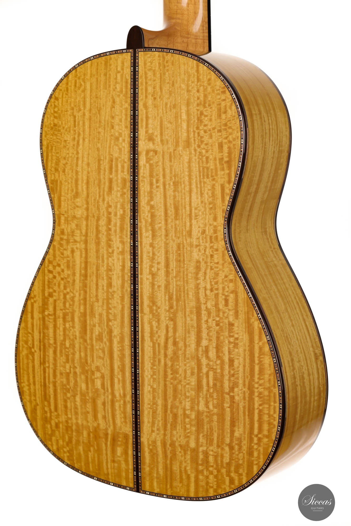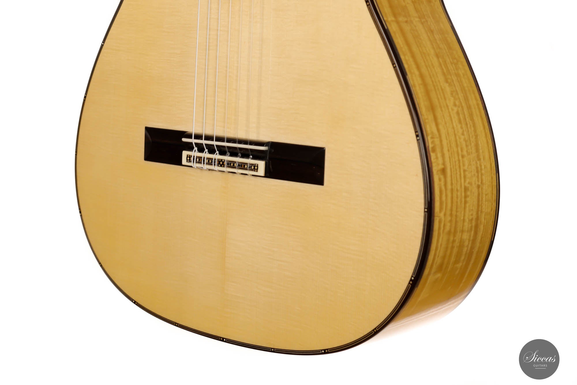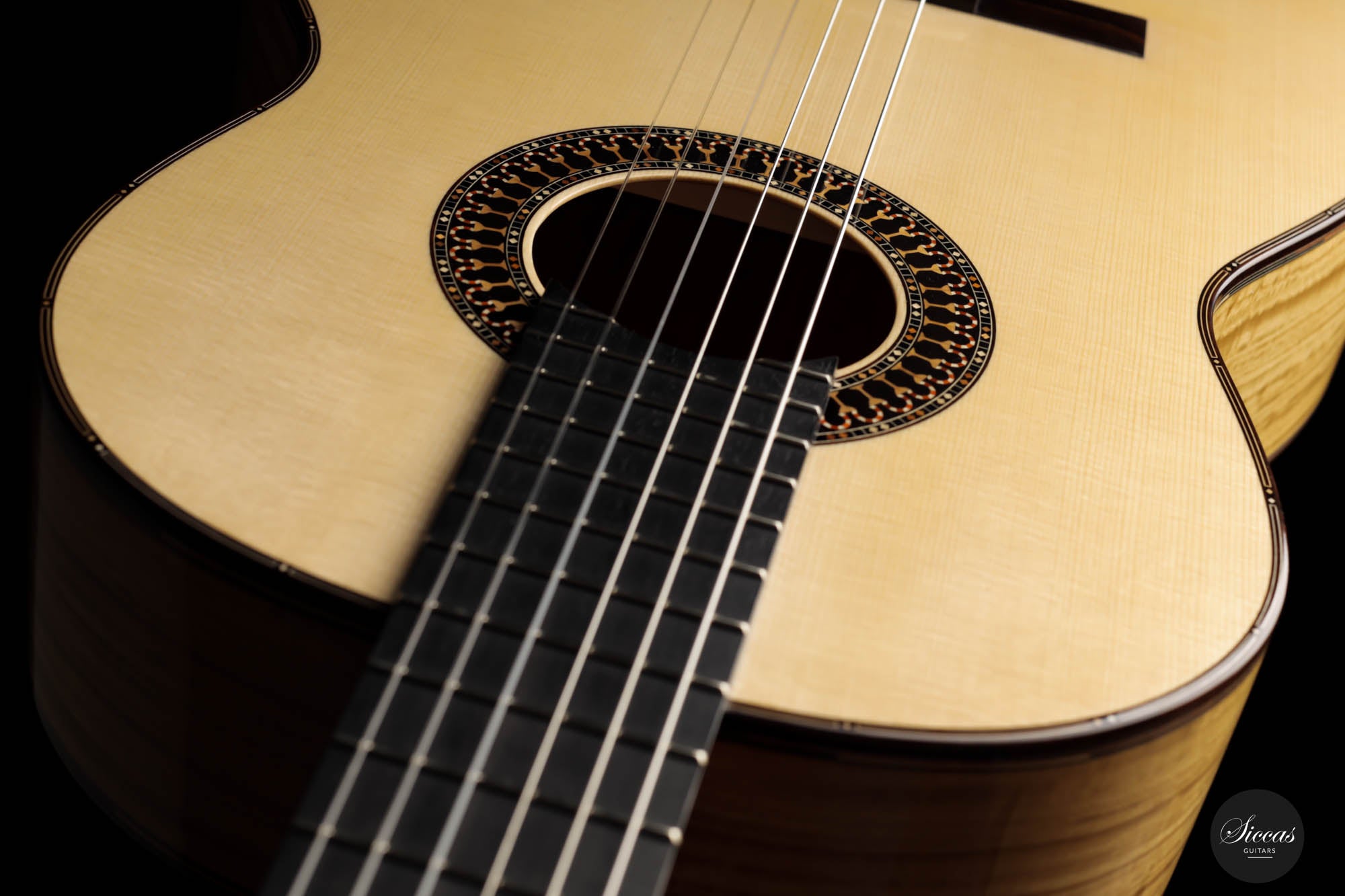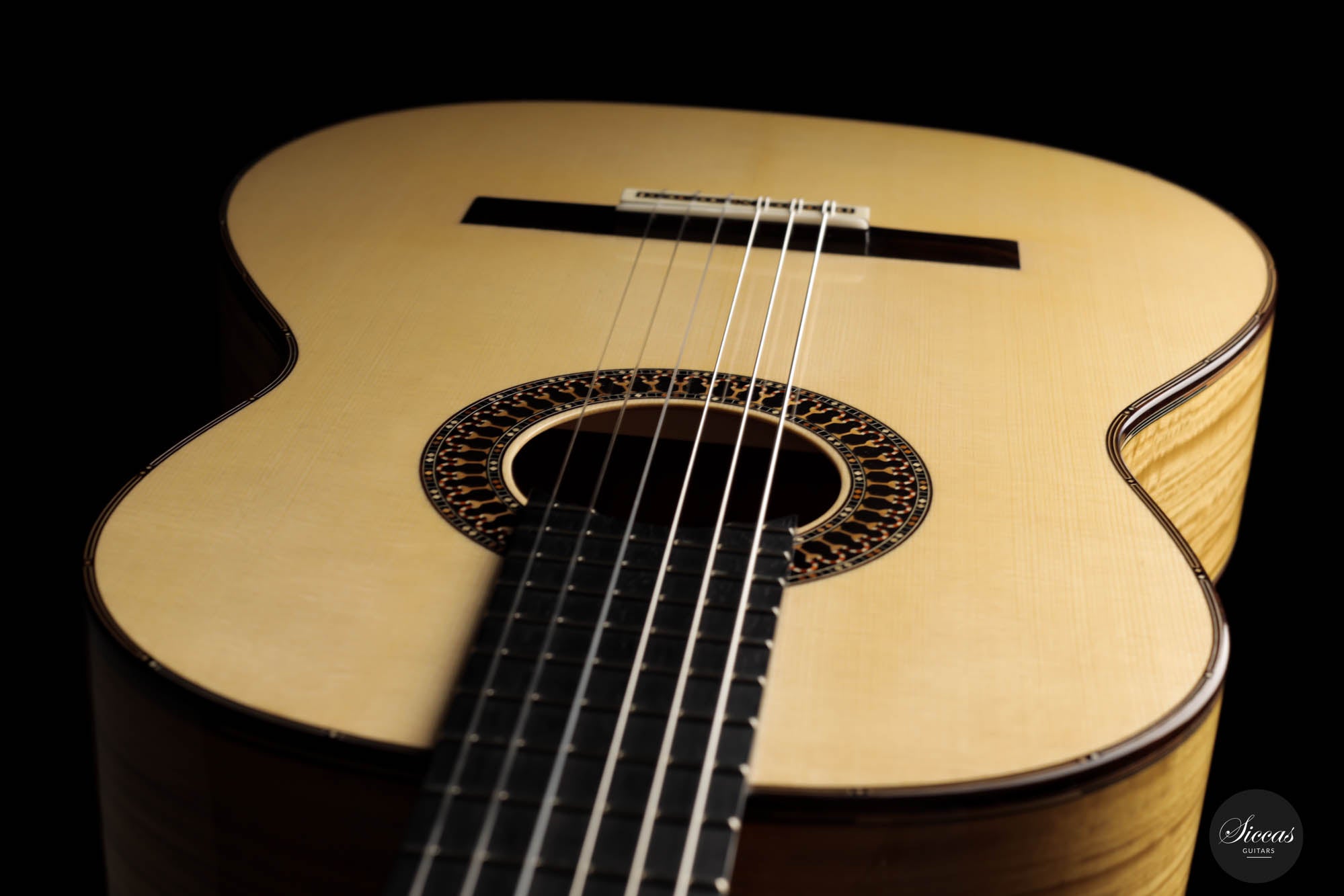 Unravel the unique characteristics of this guitar; a resonant Austrian spruce soundboard, striking Satinwood back, and sides, plus an enchanting flamed cedar neck. Its intricate headstock decoration takes inspiration from the 2005 Jose L. Romanillos masterpiece, "La Amistad". Adding a touch of opulence, the golden satinwood back is adorned with a replica of the Romanillos "La Adelita 1997" design.