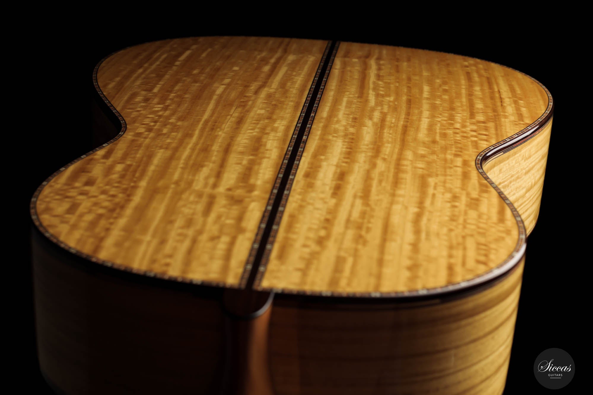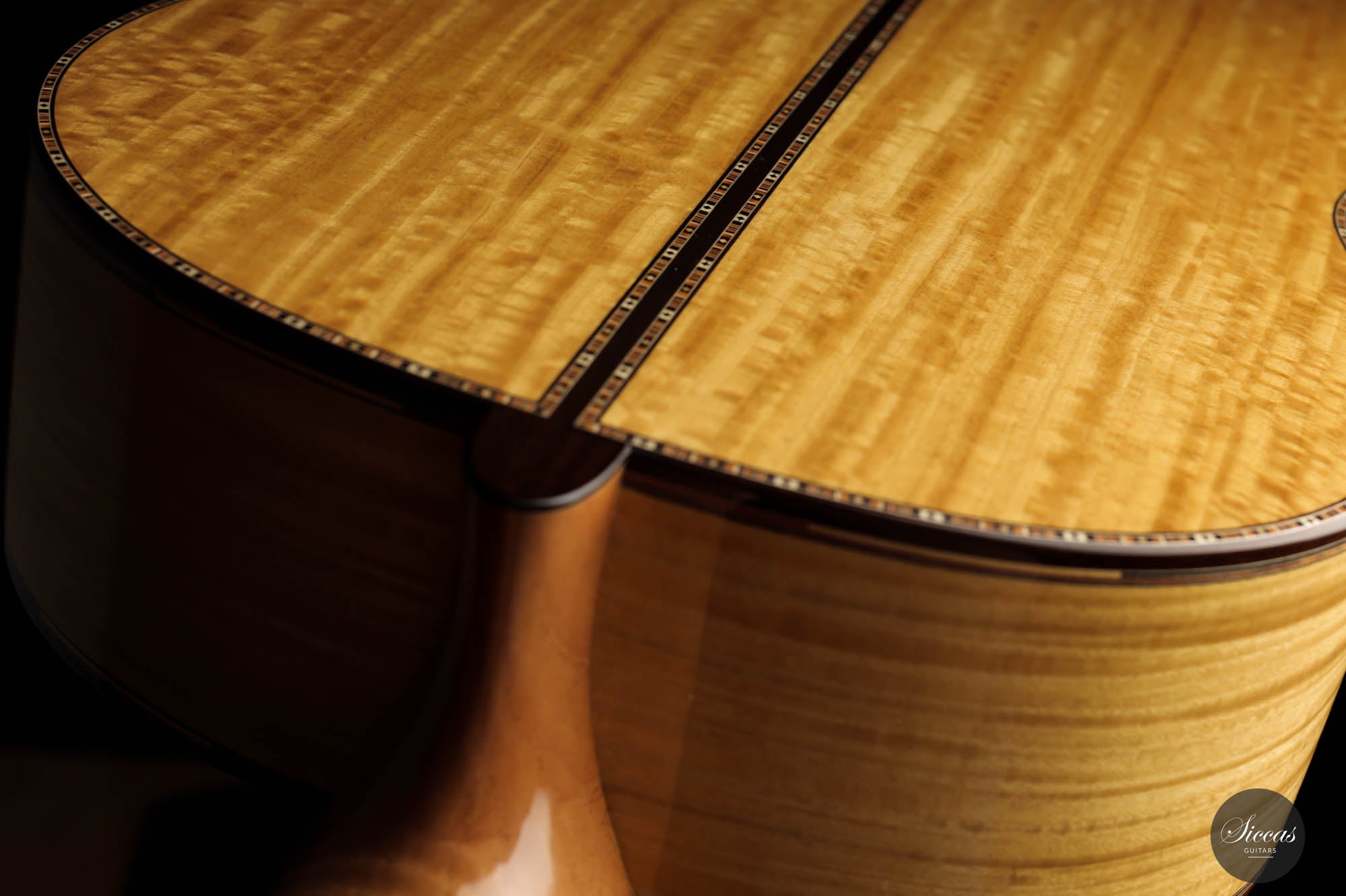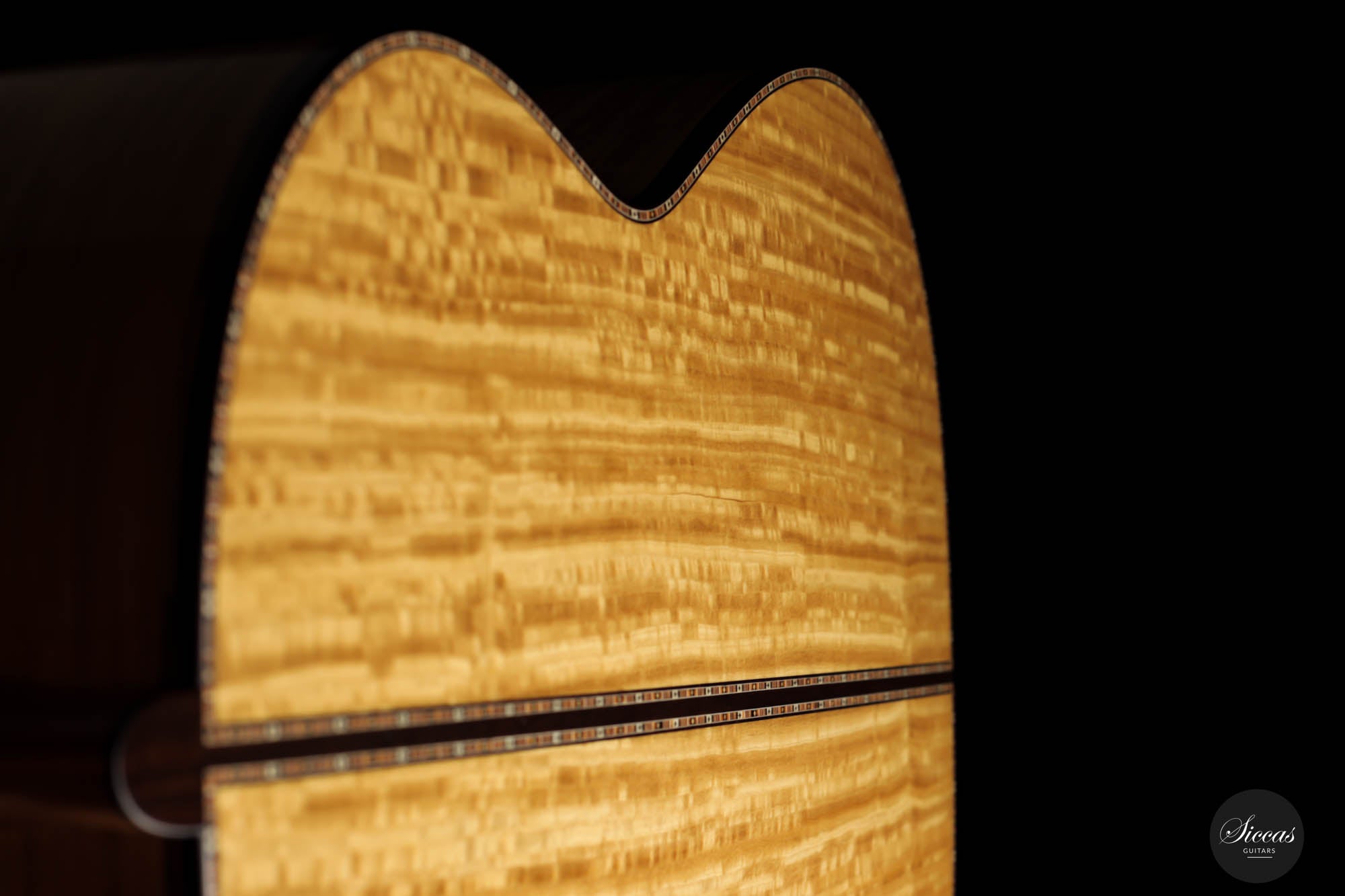 The sides of this magnificent guitar feature a border with a double band of colored threads, showcasing natural wood hues in a staggered, random arrangement. This detail mirrors the meticulous precision of Vailati's handiwork, highlighting the macro and micro elements of the guitar's structure and design.