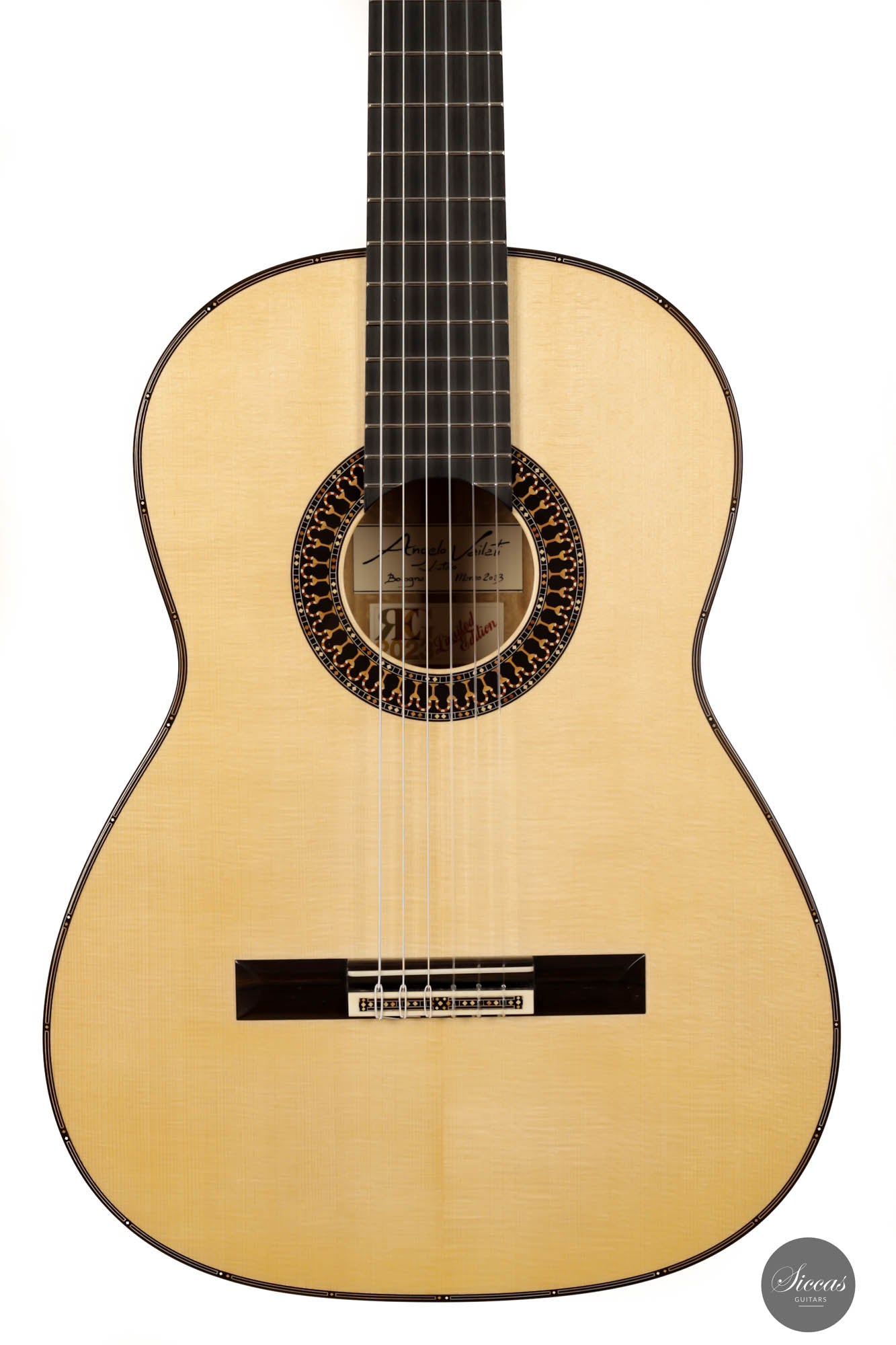This 2023 Roma Guitar Expo Special Edition Angelo Vailati Guitar is the pinnacle of guitar craftsmanship. This remarkable instrument, standing out amidst the guitar pantheon, is a tribute to the iconic work of Jose L. Romanillos. Painstakingly handcrafted by Angelo Vailati using the finest wood selection at his disposal, it represents an exquisite fusion of artistry and sound engineering.
