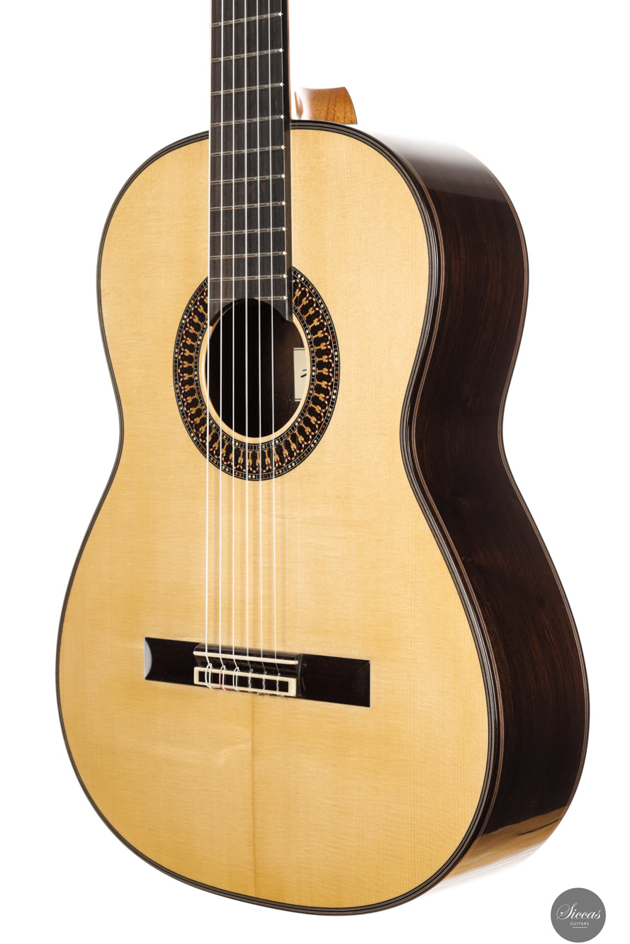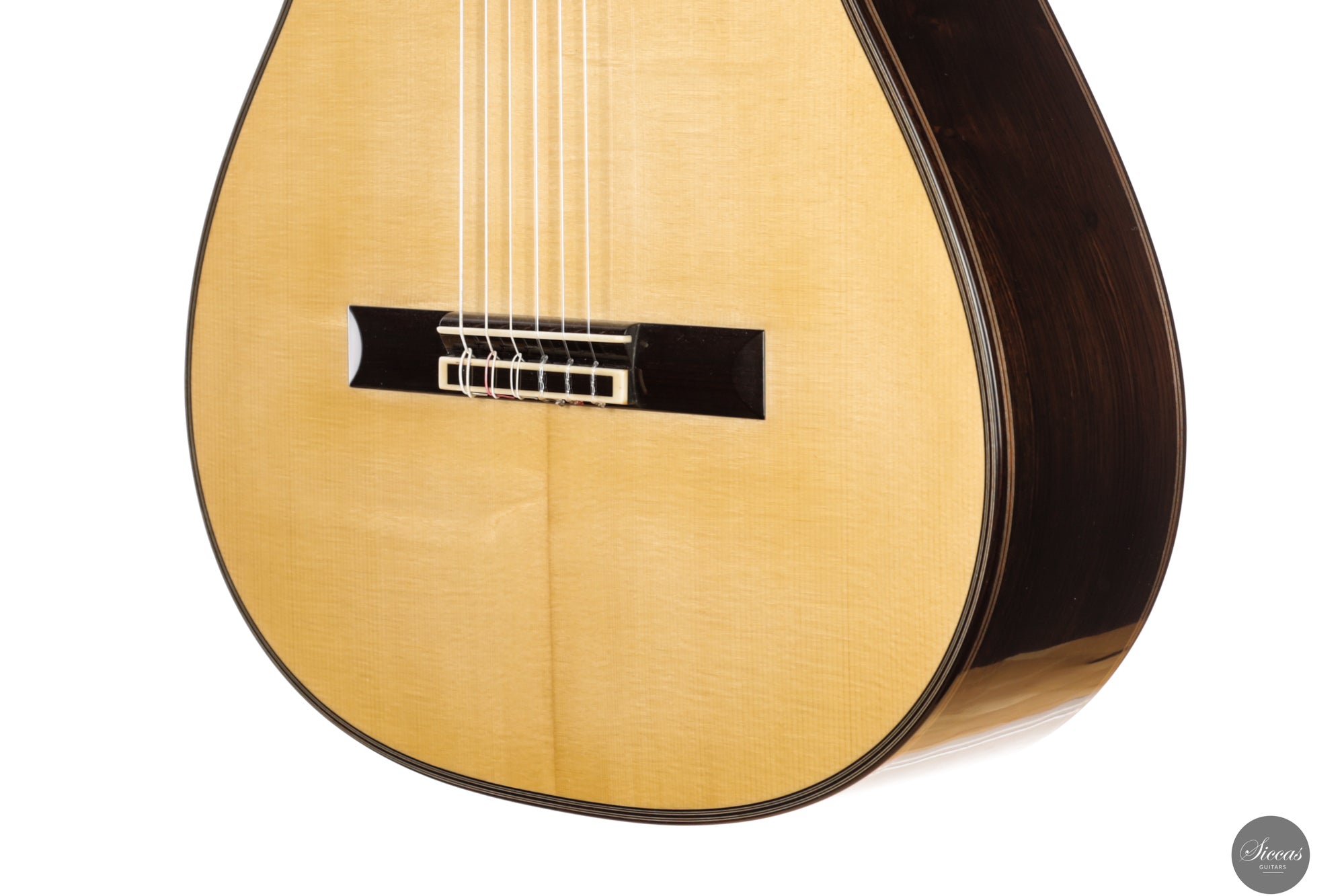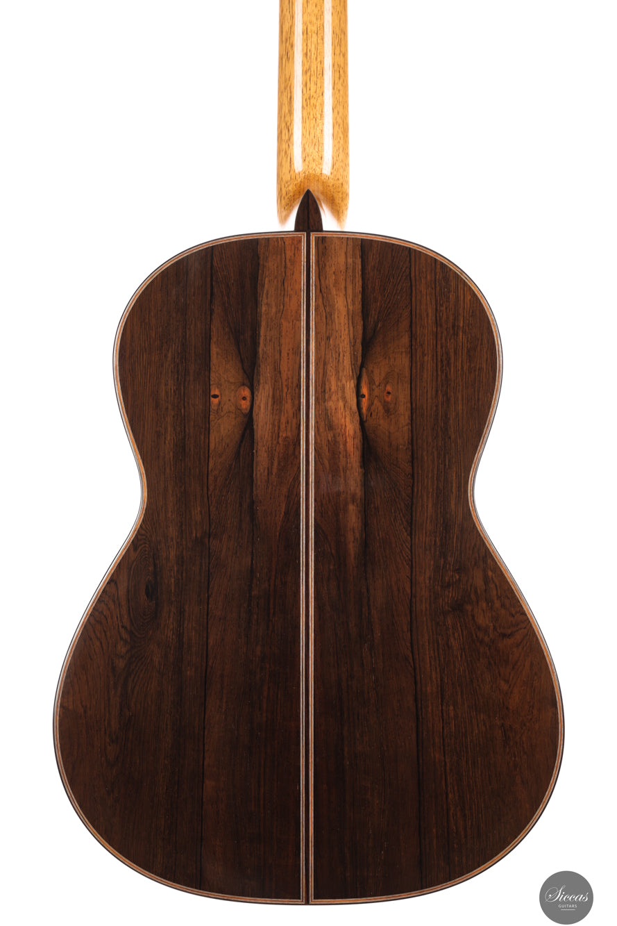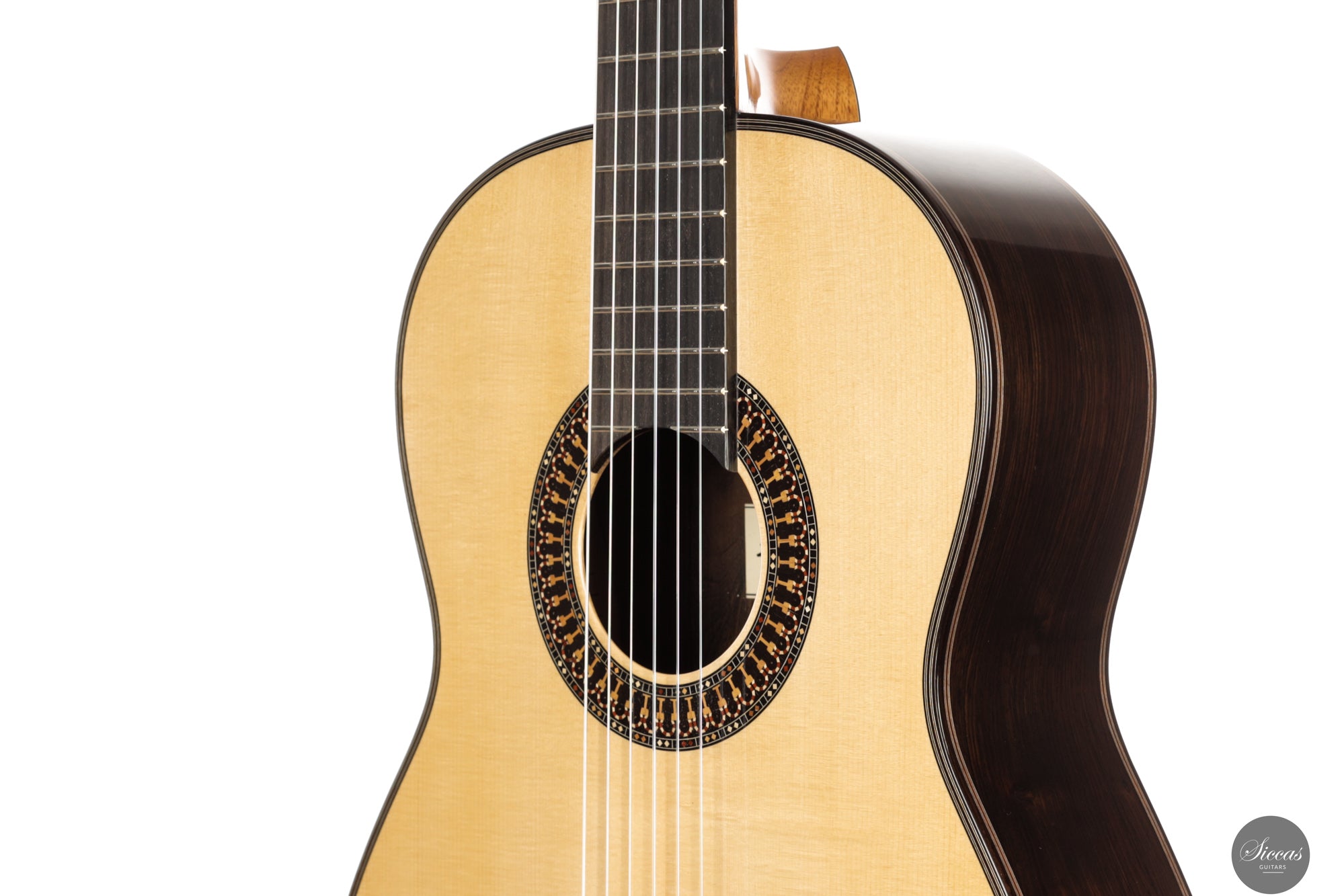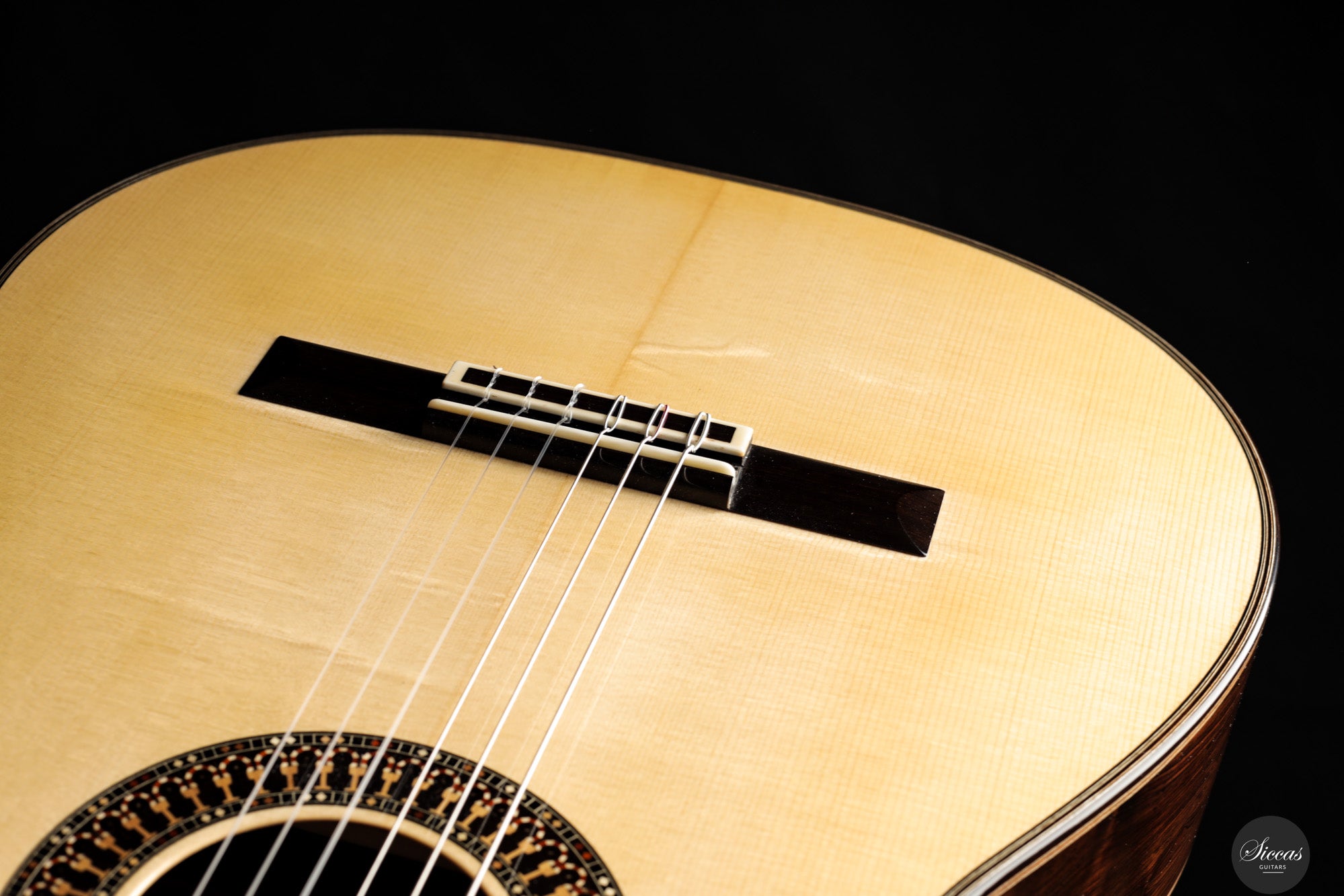 The tone reveals itself with clarity and ease. Each note emerges cleanly and carries a gentle bloom of soft overtones that lends the guitar a lyrical and expressive presence. The instrument breathes openly and reacts to the smallest variation of touch which allows vivid colour changes with minimal movement of the right hand. The Brazilian rosewood adds depth to the basses and a luminous quality to the trebles giving the guitar considerable range for shaping musical lines. The sustain is long and stable which allows melodies to unfold in a calm and unhurried way. Despite its generous projection the guitar preserves warmth, balance and refinement. It is a highly responsive concert instrument that rewards nuance and encourages expressive interpretation.