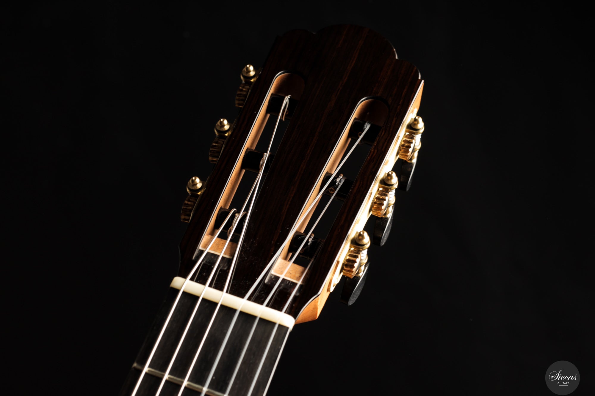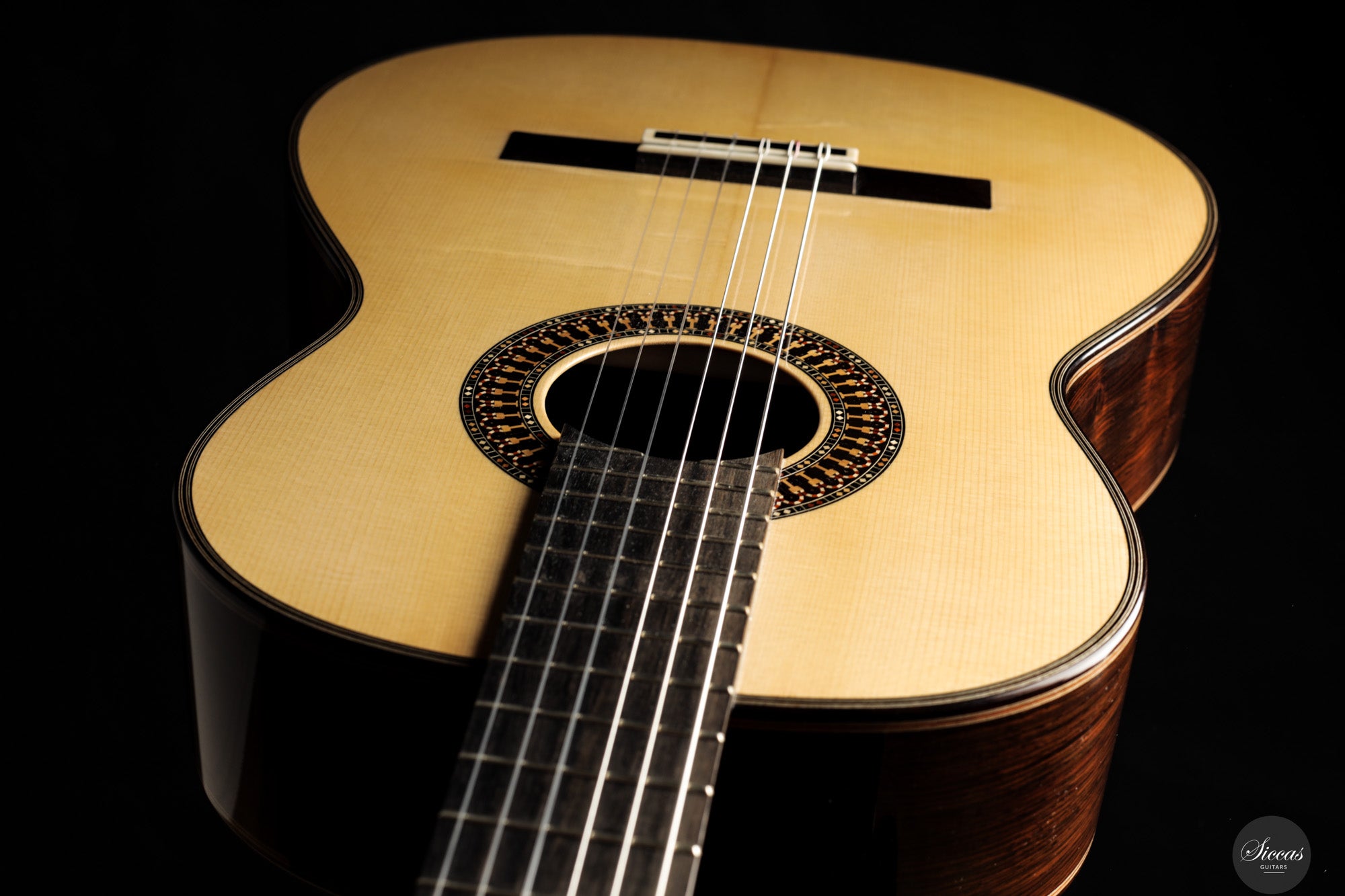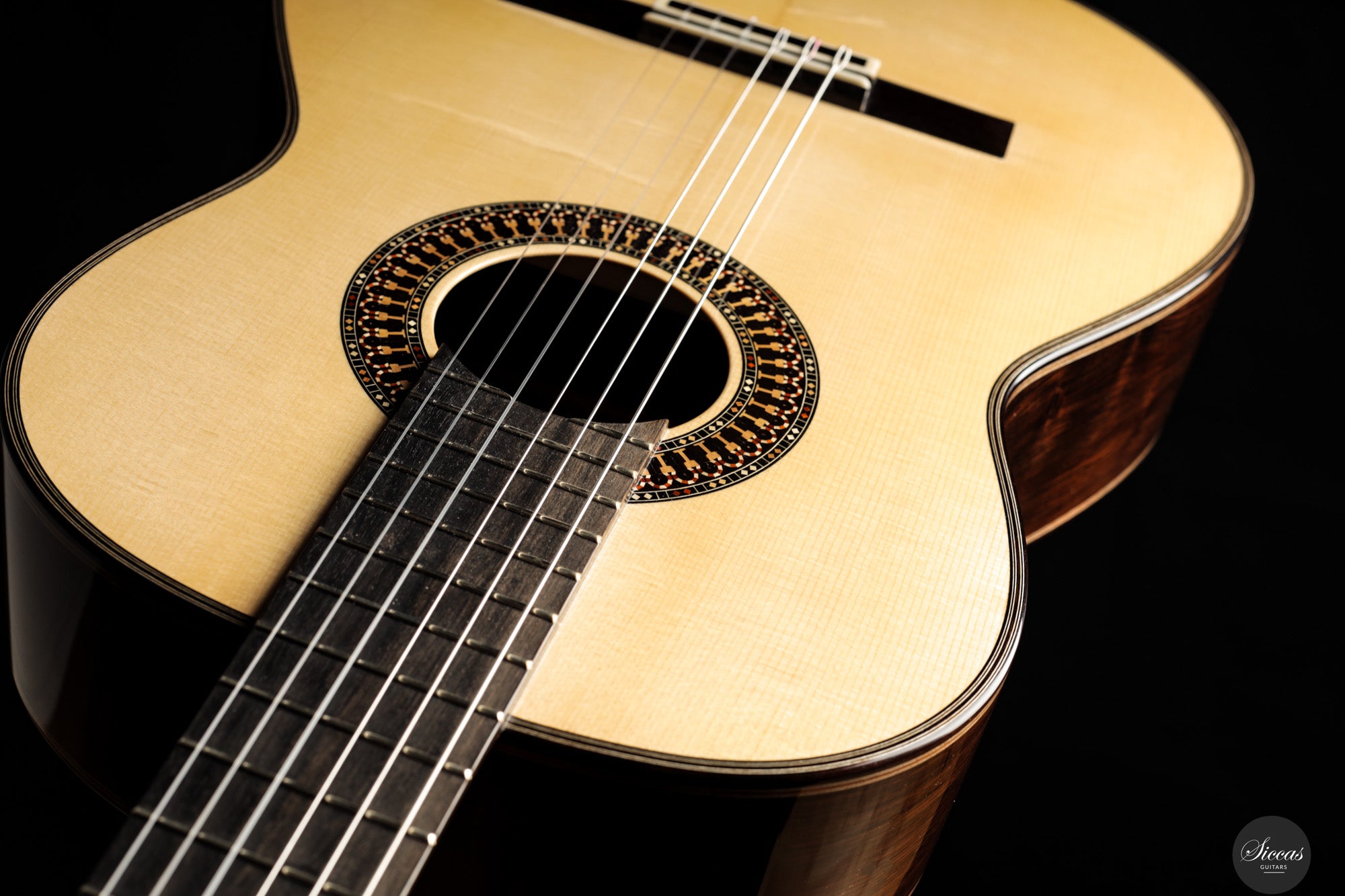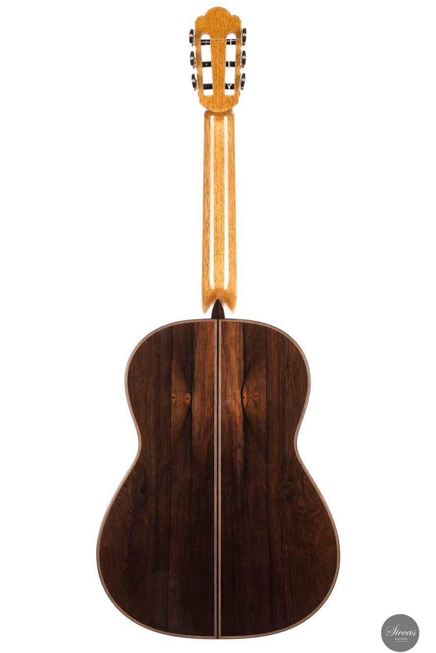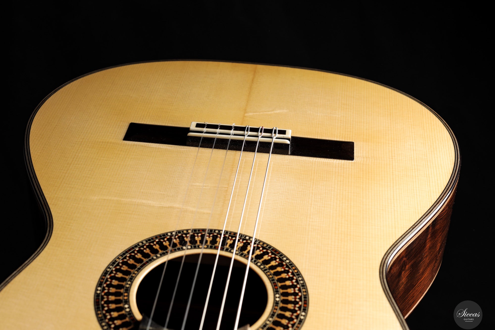 The tone reveals itself with clarity and ease. Each note emerges cleanly and carries a gentle bloom of soft overtones that lends the guitar a lyrical and expressive presence. The instrument breathes openly and reacts to the smallest variation of touch which allows vivid colour changes with minimal movement of the right hand. The Brazilian rosewood adds depth to the basses and a luminous quality to the trebles giving the guitar considerable range for shaping musical lines. The sustain is long and stable which allows melodies to unfold in a calm and unhurried way. Despite its generous projection the guitar preserves warmth, balance and refinement. It is a highly responsive concert instrument that rewards nuance and encourages expressive interpretation.