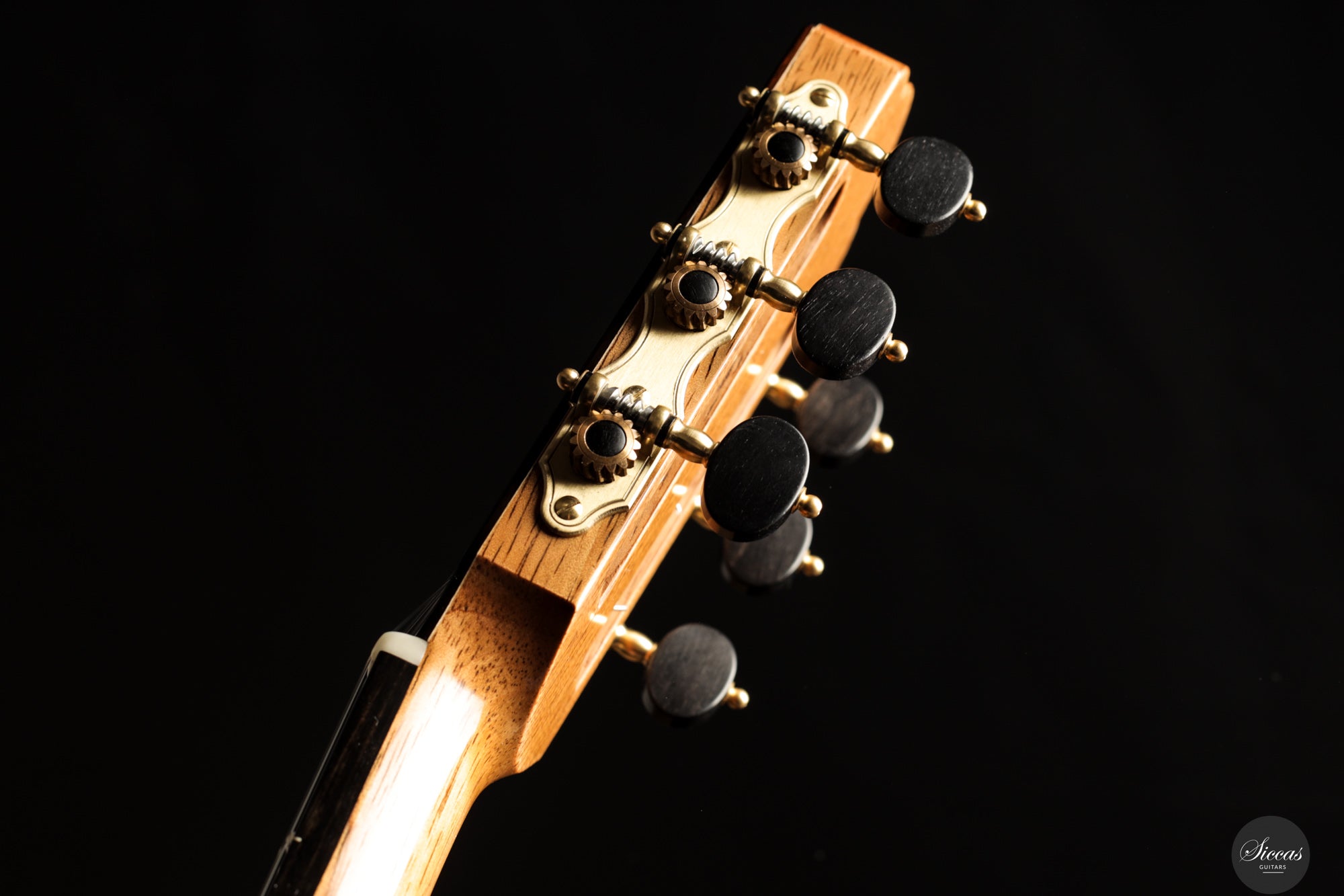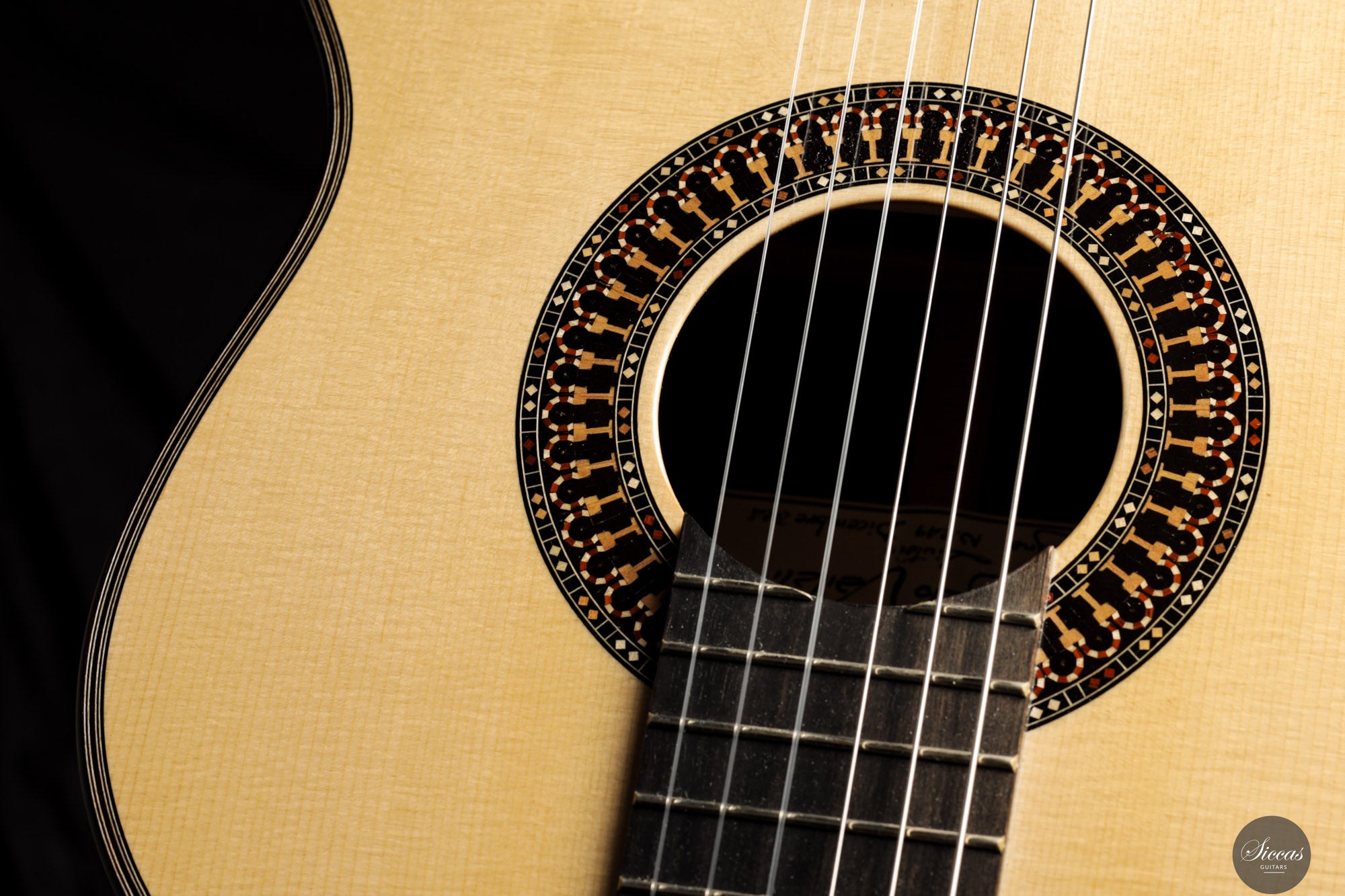 This mint 2024 instrument is built in the Romanillos tradition and features a high quality spruce top together with CITES certified Brazilian rosewood for the back and sides. The entire guitar is finished with French polish which enhances resonance and preserves the delicacy of the structure. The rosette and the elegant headstock decoration echo the expressive language of the Spanish master while still reflecting Vailati’s own artistic identity. At 1470 grams the guitar remains light and highly responsive. Alessi tuning machines complete the instrument with reliable precision.